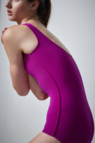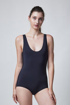 By lowering the front cut, this one-piece swimsuit creates a graceful aesthetic that frames the neckline and highlights the natural curves in a restrained style. Accentuating the front cut with its basic graphic form, the Round Neckline represents a subtle yet powerful expression of chic modesty. Precisely crafted with our four-way stretch Italian fabric, the full-coverage bottom design of this item embodies a complete, sculpted fit of your hip.