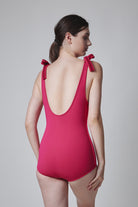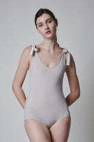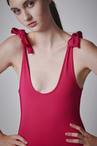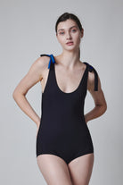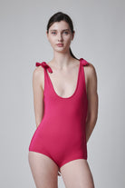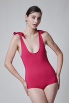 One-Piece Swimsuit with Low Exposed Cut. Front Silhouette Embrace.