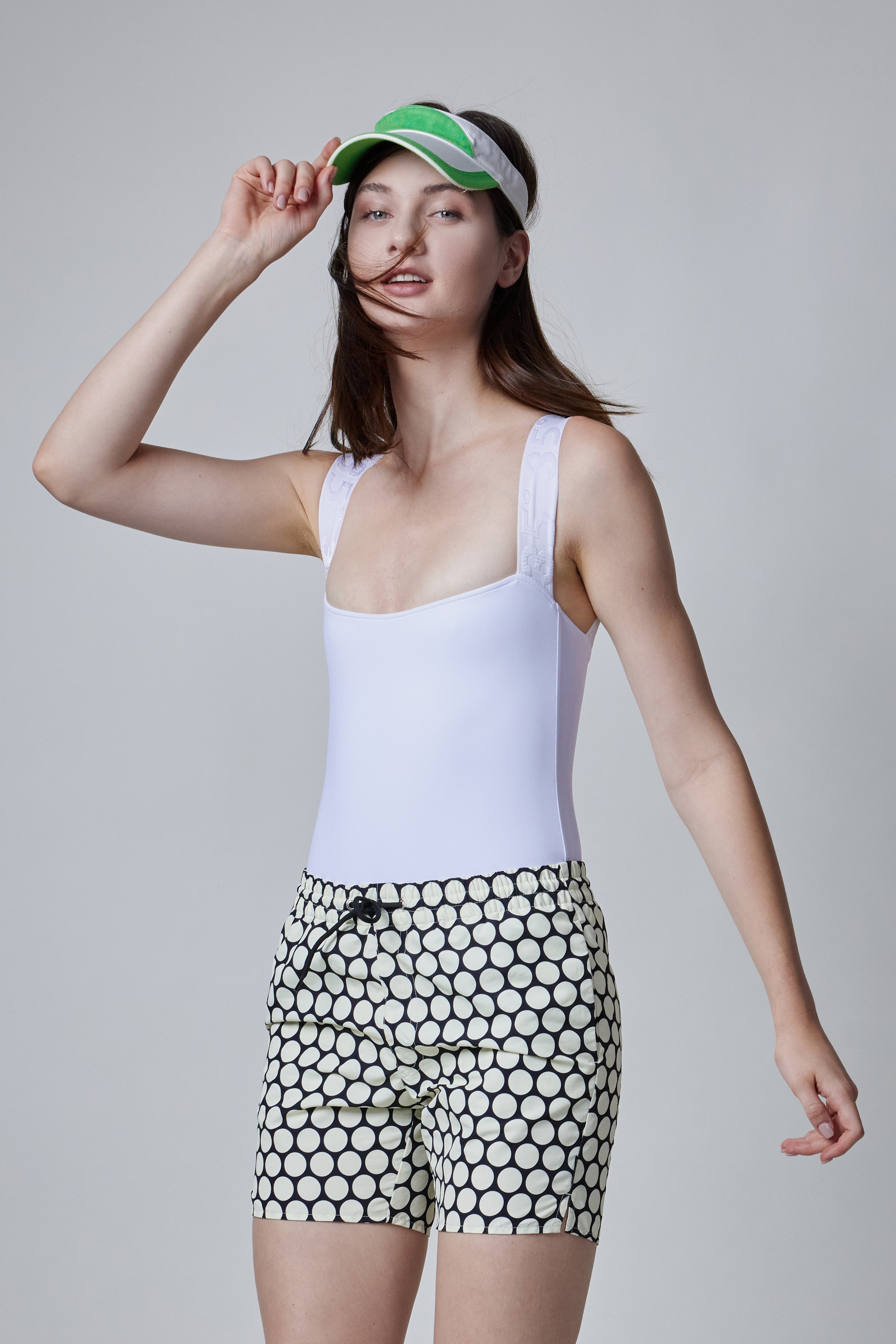 By lowering the front cut, this one-piece swimsuit creates a graceful aesthetic that frames the neckline and highlights the natural curves in a restrained style. Accentuating the front cut with its basic graphic form, the Square Neckline representsa subtle yet powerful expression of chic modesty.Precisely crafted with our four-way stretch Italian fabric, this item features a pair of shoulder straps adorned with our logo monogram pattern, as well as a cheeky coverage bottom design that highlights curves with a trendy appeal.