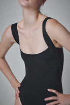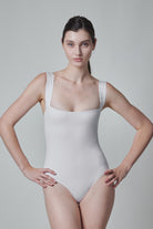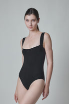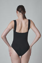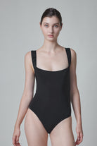 One-Piece Swimsuit with Low Exposed Cut. Front Silhouette Embrace.