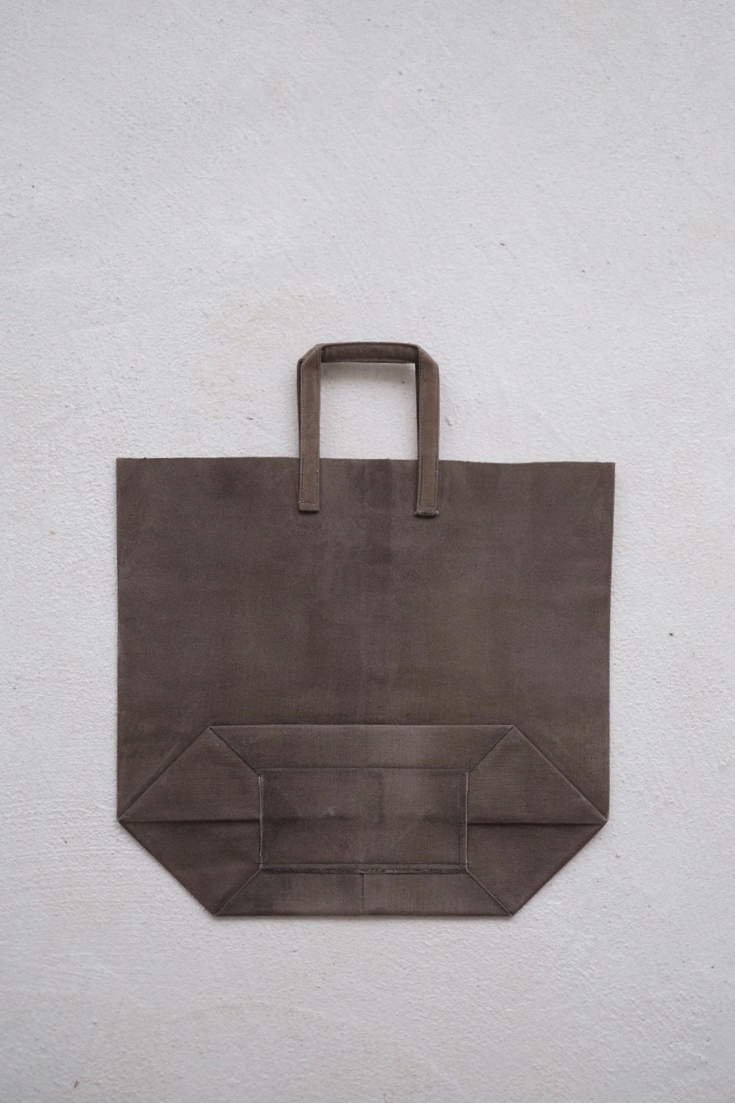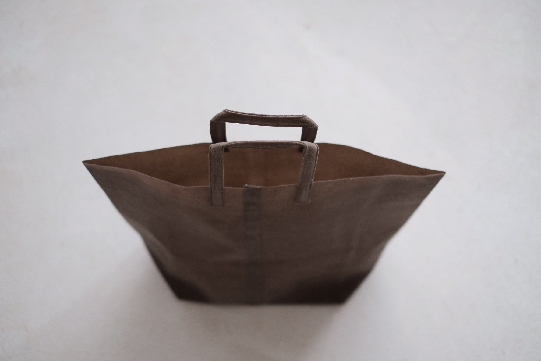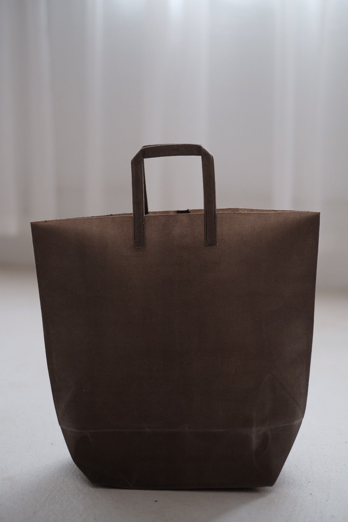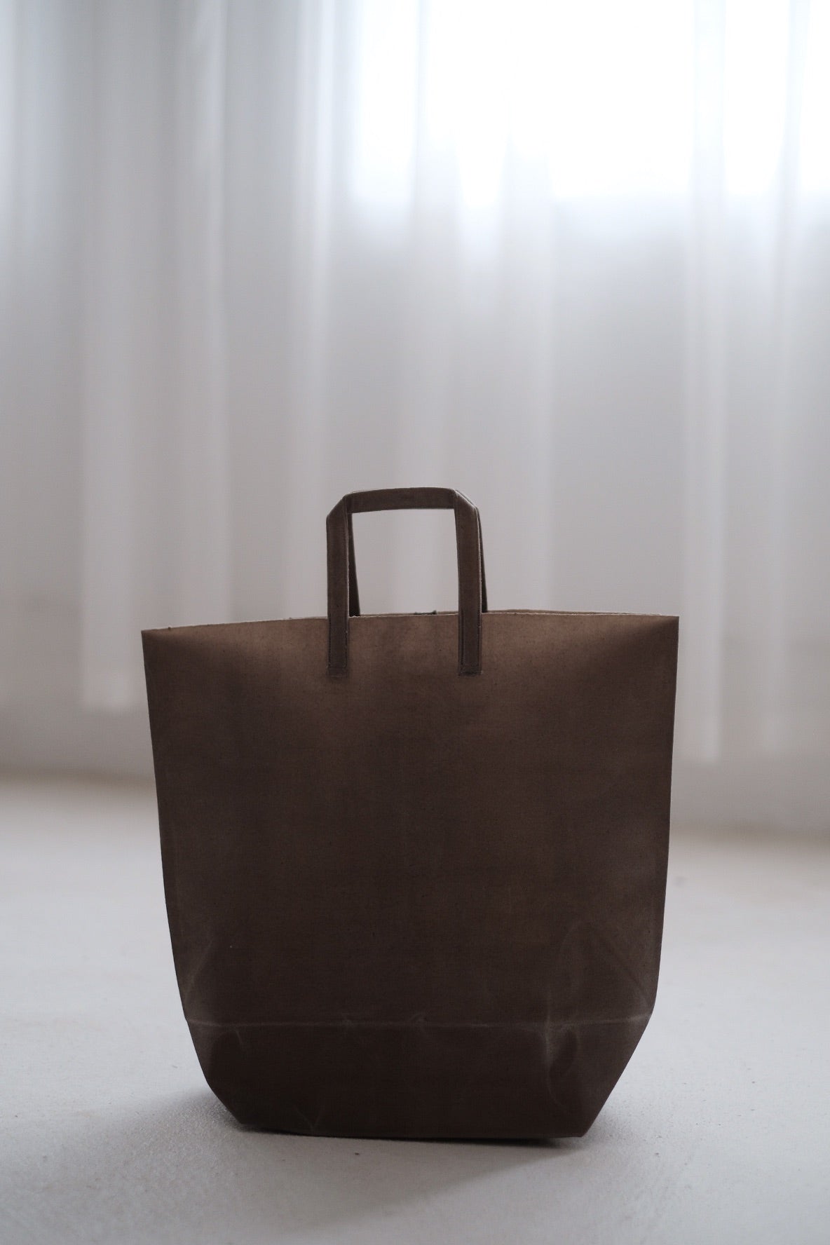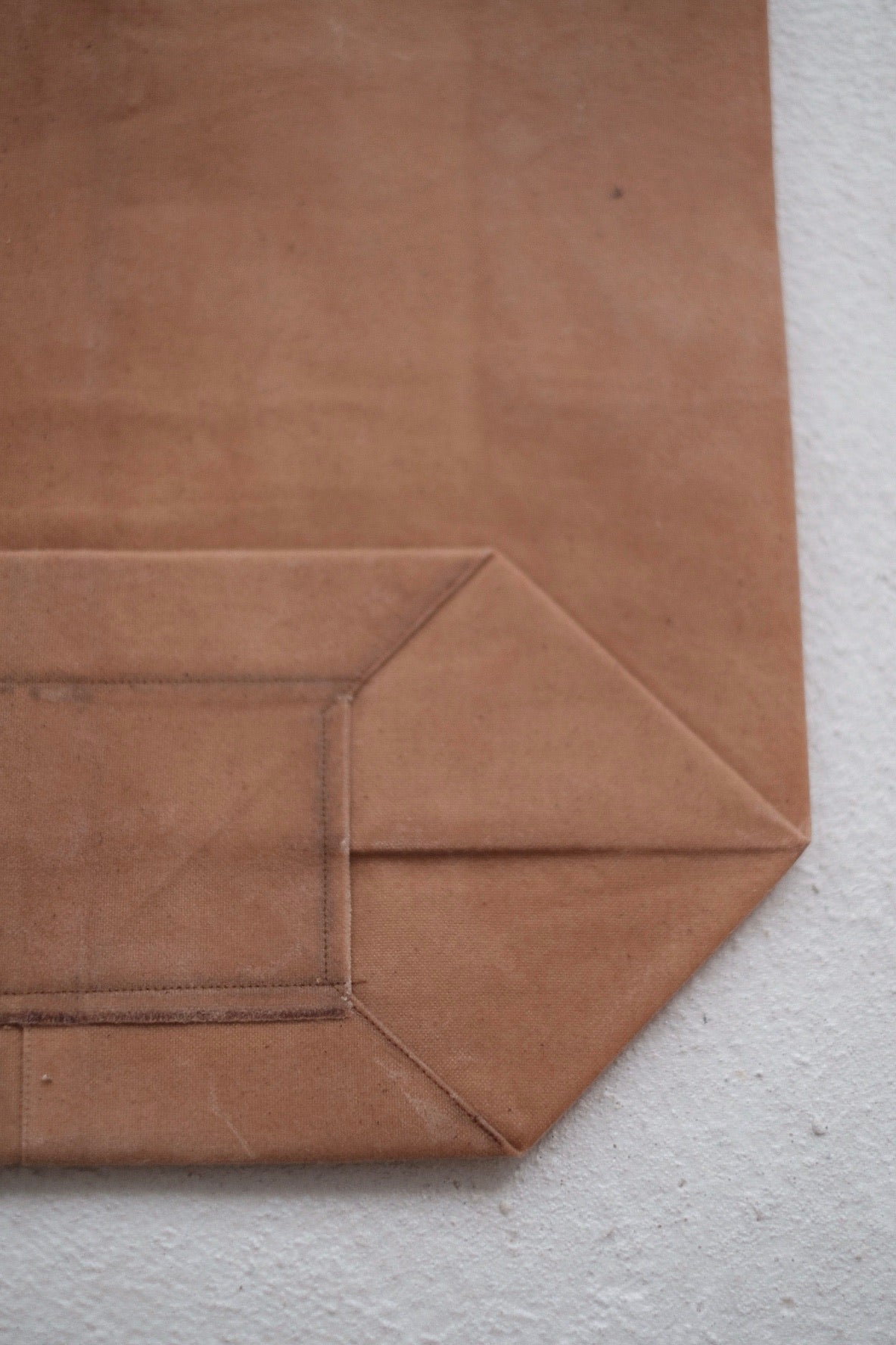 Kazumi Takigawa's line of dyed and waxed canvas bags take their inspiration from the plain brown paper bag. Wanting to mimic the look of ordinary brown paper bag while creating something re-usable and long lasting Takigawa's experiments led her to a process that includes a traditional dyeing technique and the use of tea and coffee as dyes. She produces each bag by hand in variety of shapes and sizes. The dyes are not completely colorfast and the color will fade to a softer light tone over time.