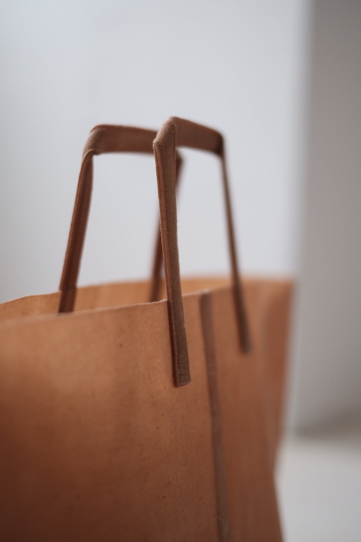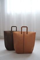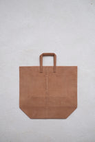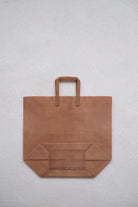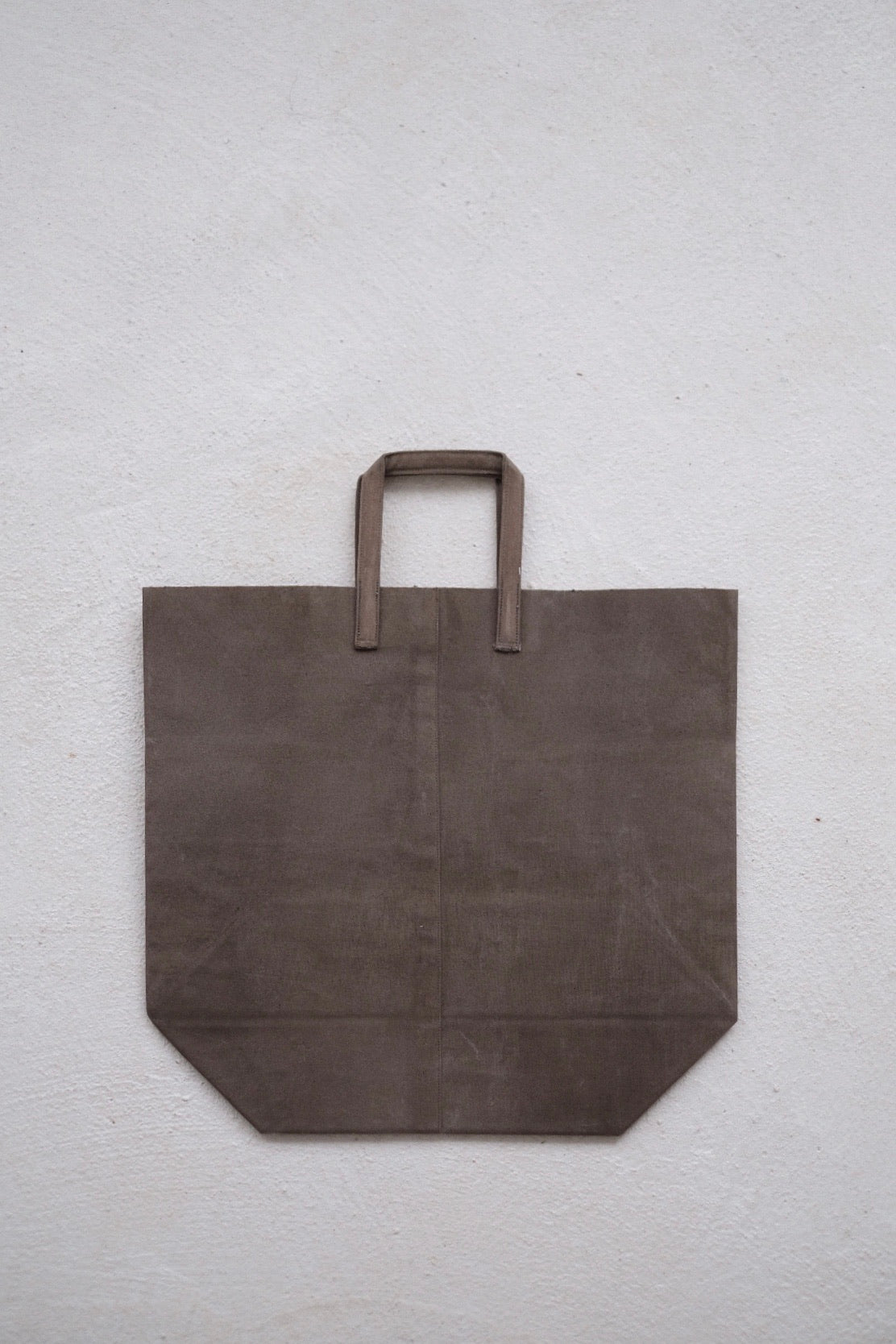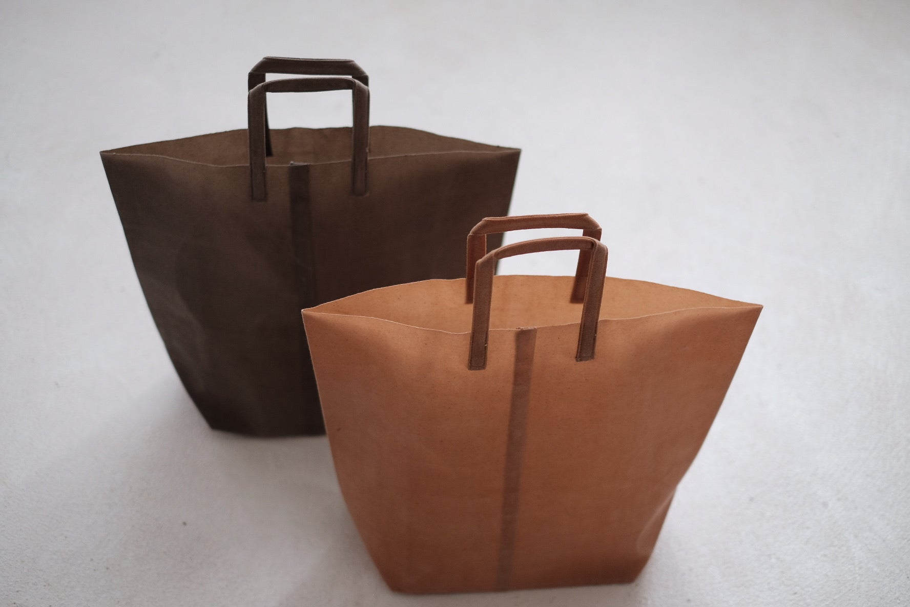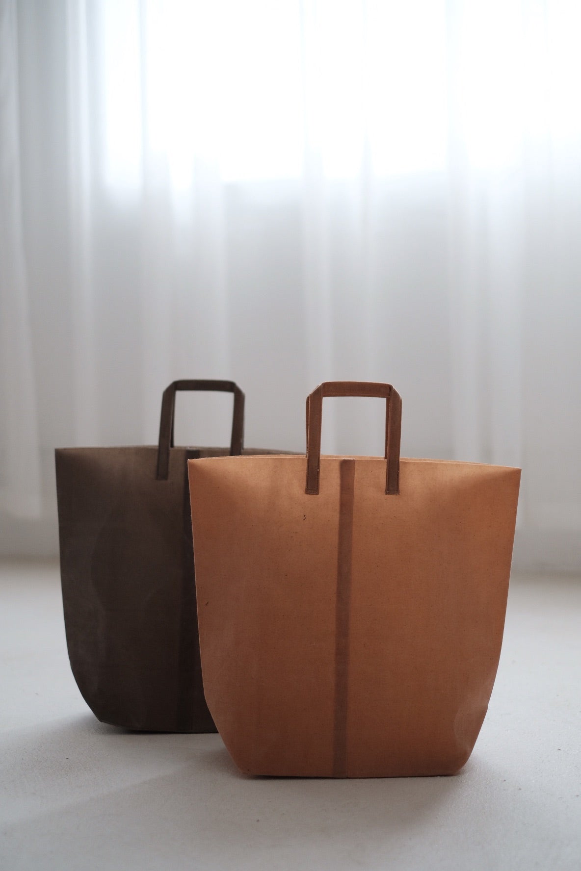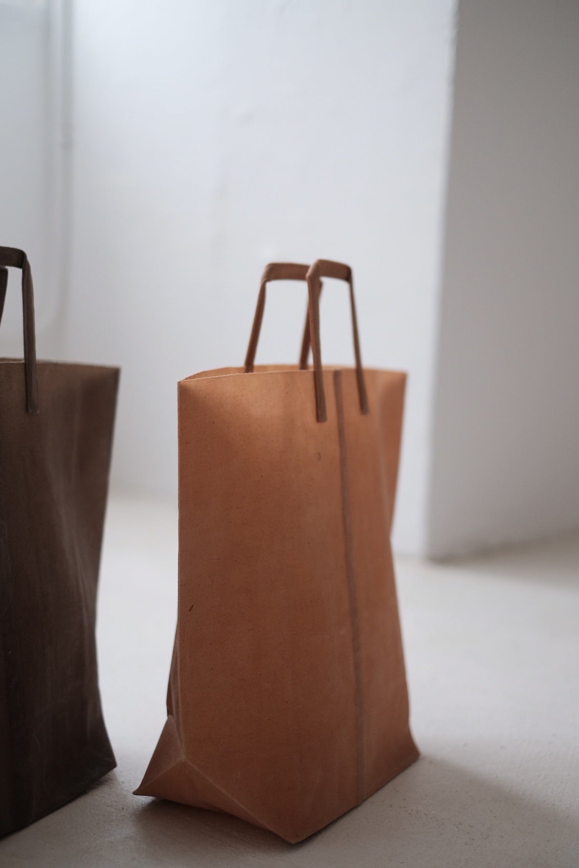 Kazumi Takigawa's line of dyed and waxed canvas bags take their inspiration from the plain brown paper bag. Wanting to mimic the look of ordinary brown paper bag while creating something re-usable and long lasting Takigawa's experiments led her to a process that includes a traditional dyeing technique and the use of tea and coffee as dyes. She produces each bag by hand in variety of shapes and sizes. The dyes are not completely colorfast and the color will fade to a softer light tone over time.