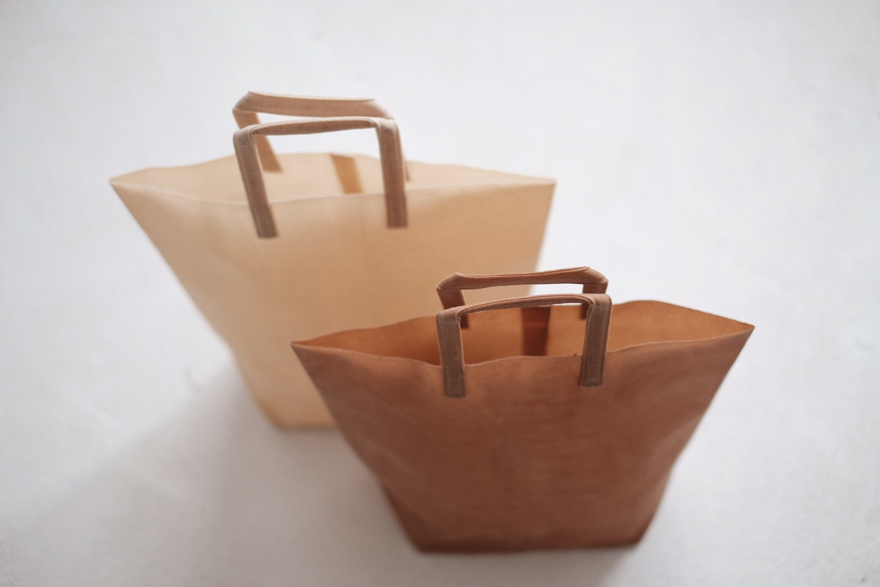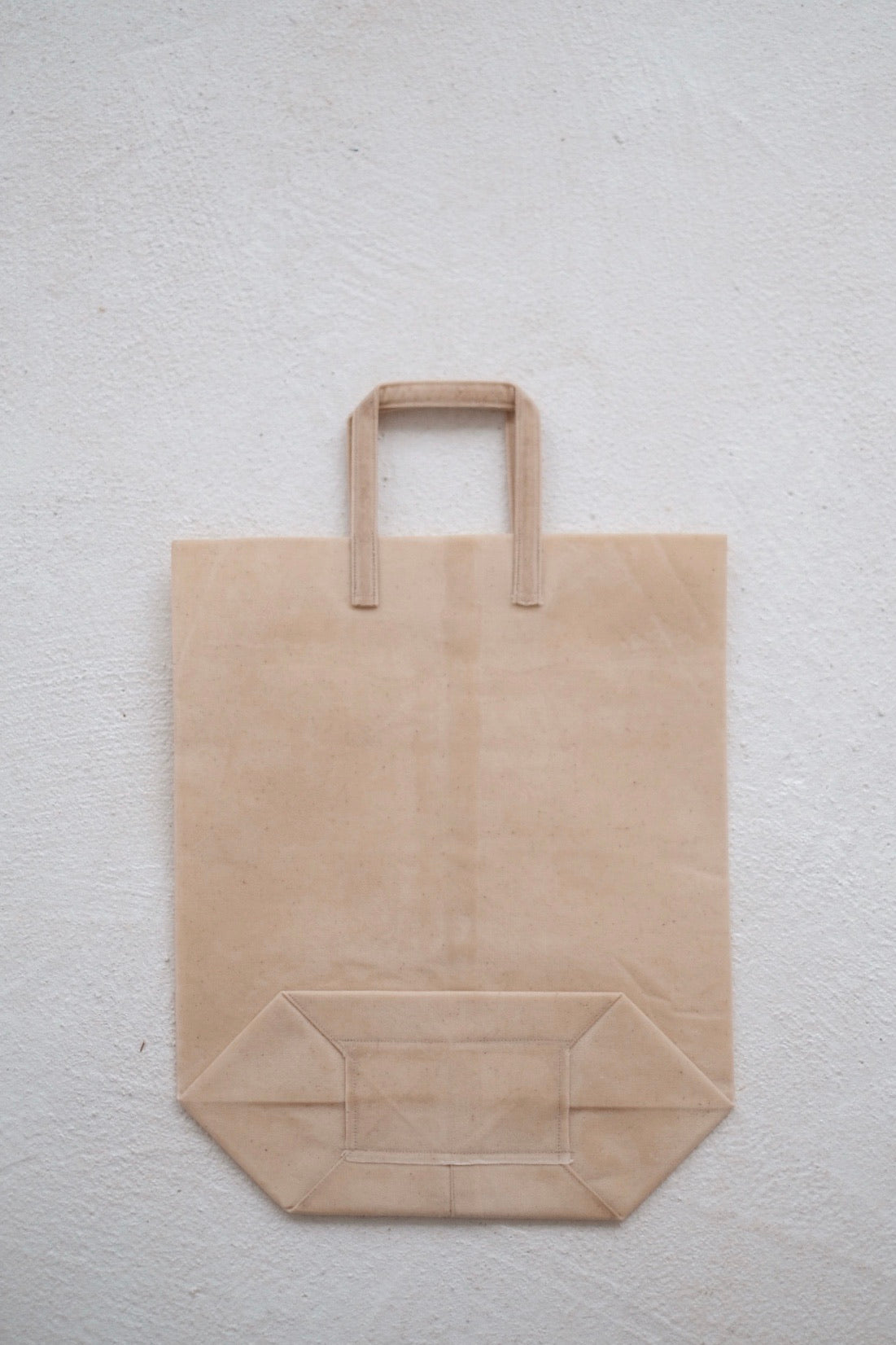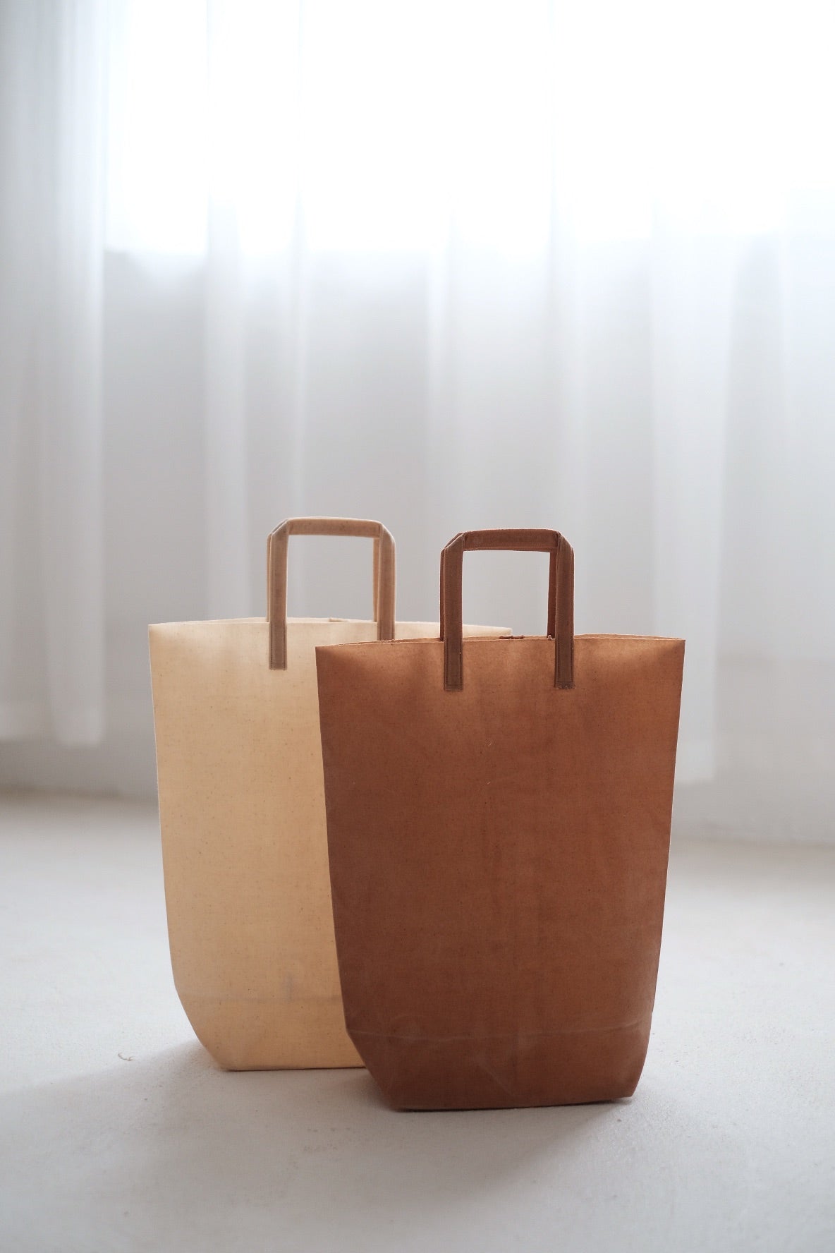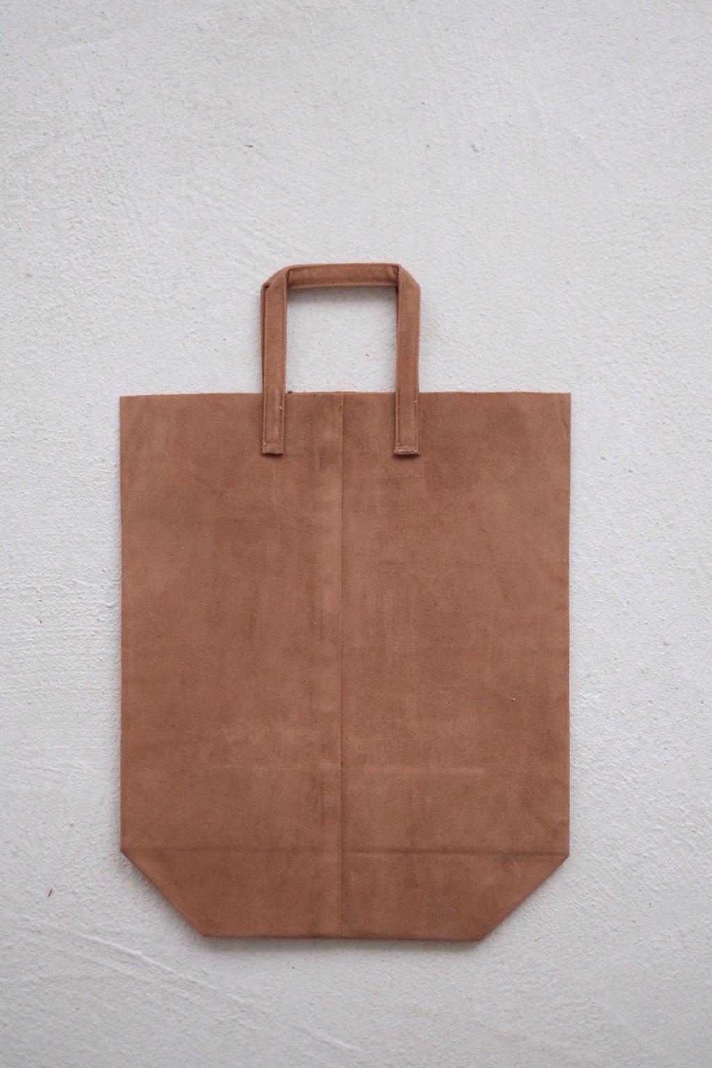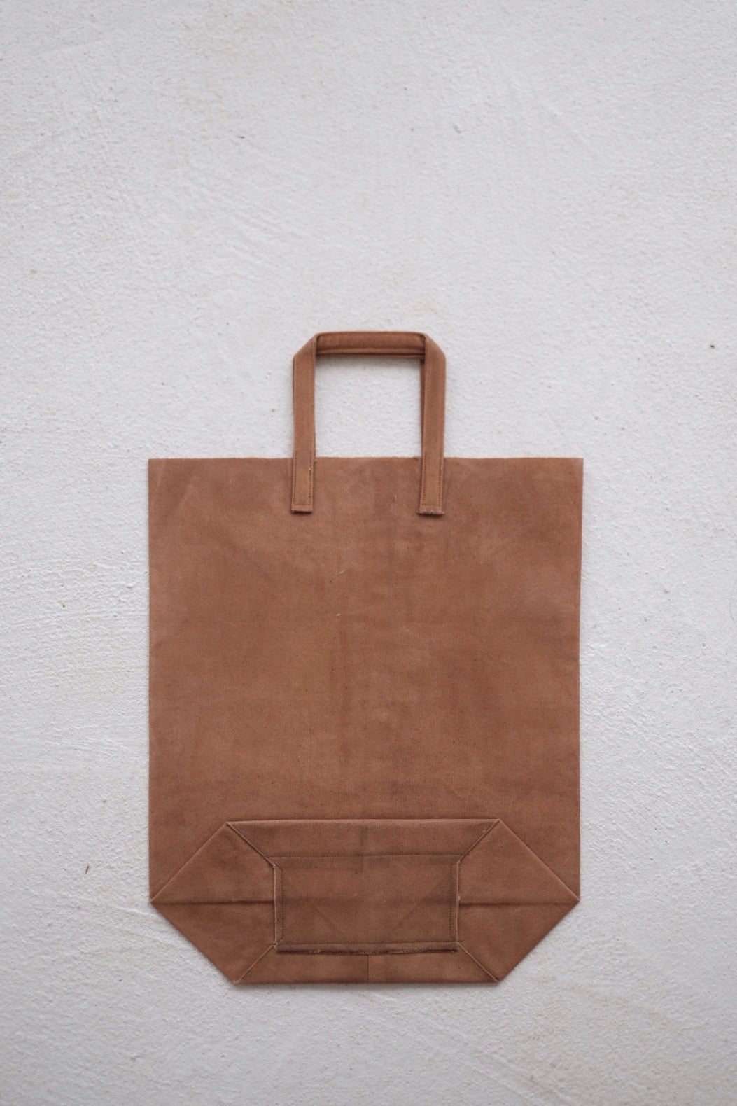 Kazumi Takigawa's line of dyed and waxed canvas bags take their inspiration from the plain brown paper bag. Wanting to mimic the look of ordinary brown paper bag while creating something re-usable and long lasting Takigawa's experiments led her to a process that includes a traditional dyeing technique and the use of tea and coffee as dyes. She produces each bag by hand in variety of shapes and sizes. The dyes are not completely colorfast and the color will fade to a softer light tone over time.