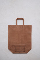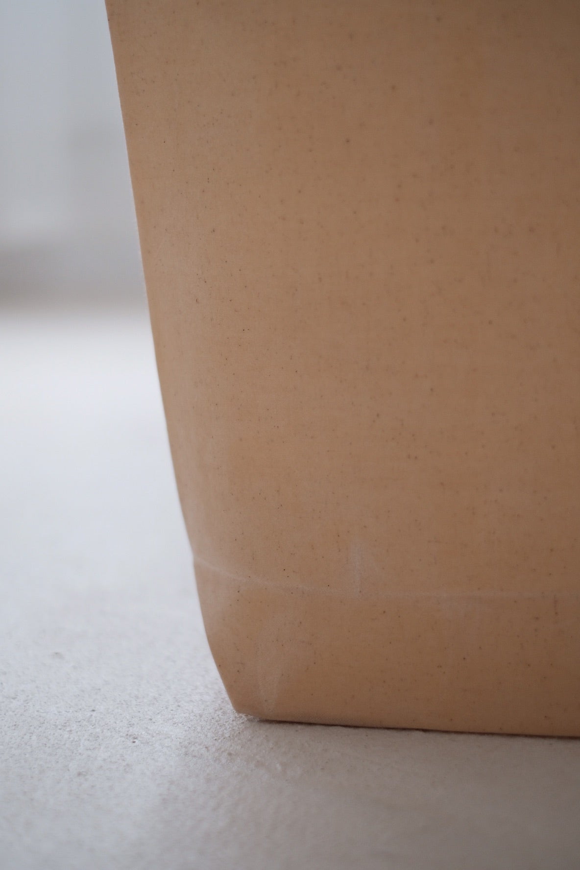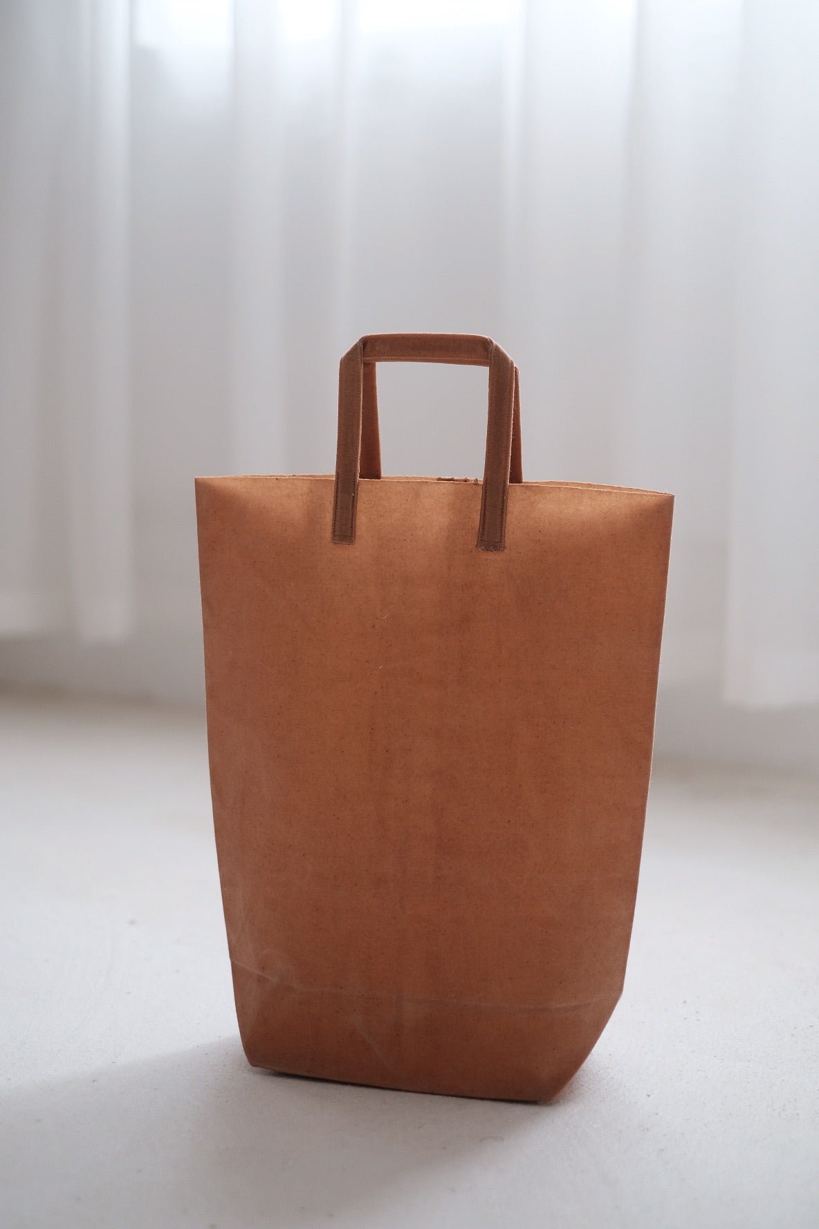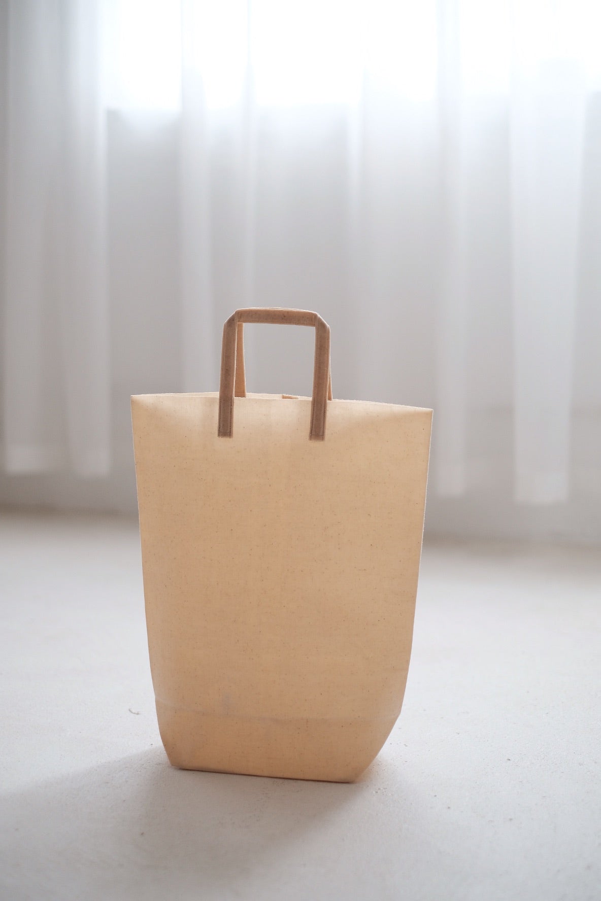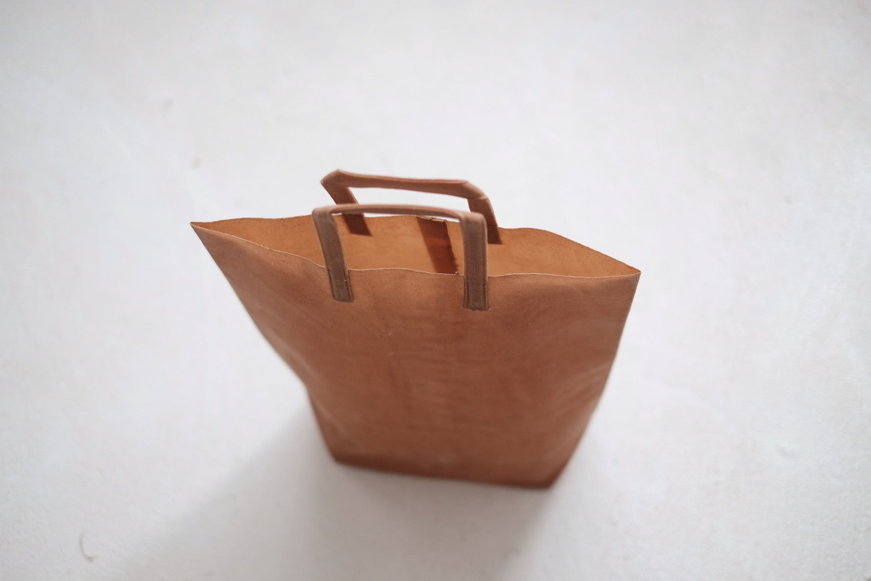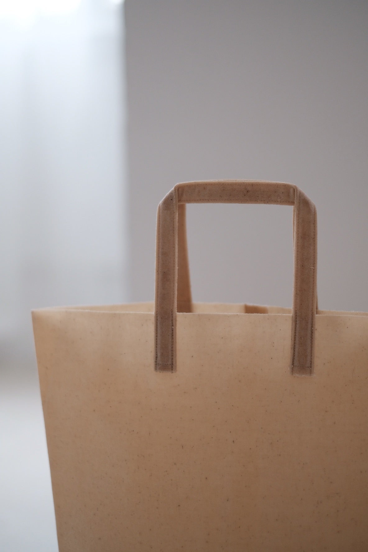 Kazumi Takigawa's line of dyed and waxed canvas bags take their inspiration from the plain brown paper bag. Wanting to mimic the look of ordinary brown paper bag while creating something re-usable and long lasting Takigawa's experiments led her to a process that includes a traditional dyeing technique and the use of tea and coffee as dyes. She produces each bag by hand in variety of shapes and sizes. The dyes are not completely colorfast and the color will fade to a softer light tone over time.