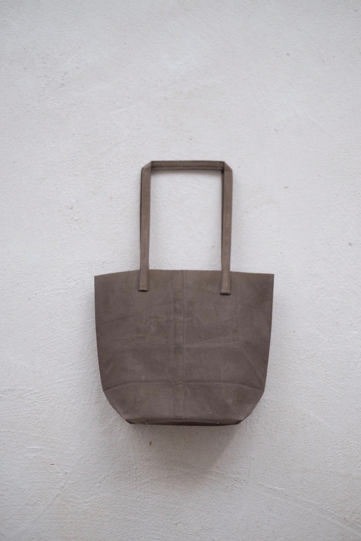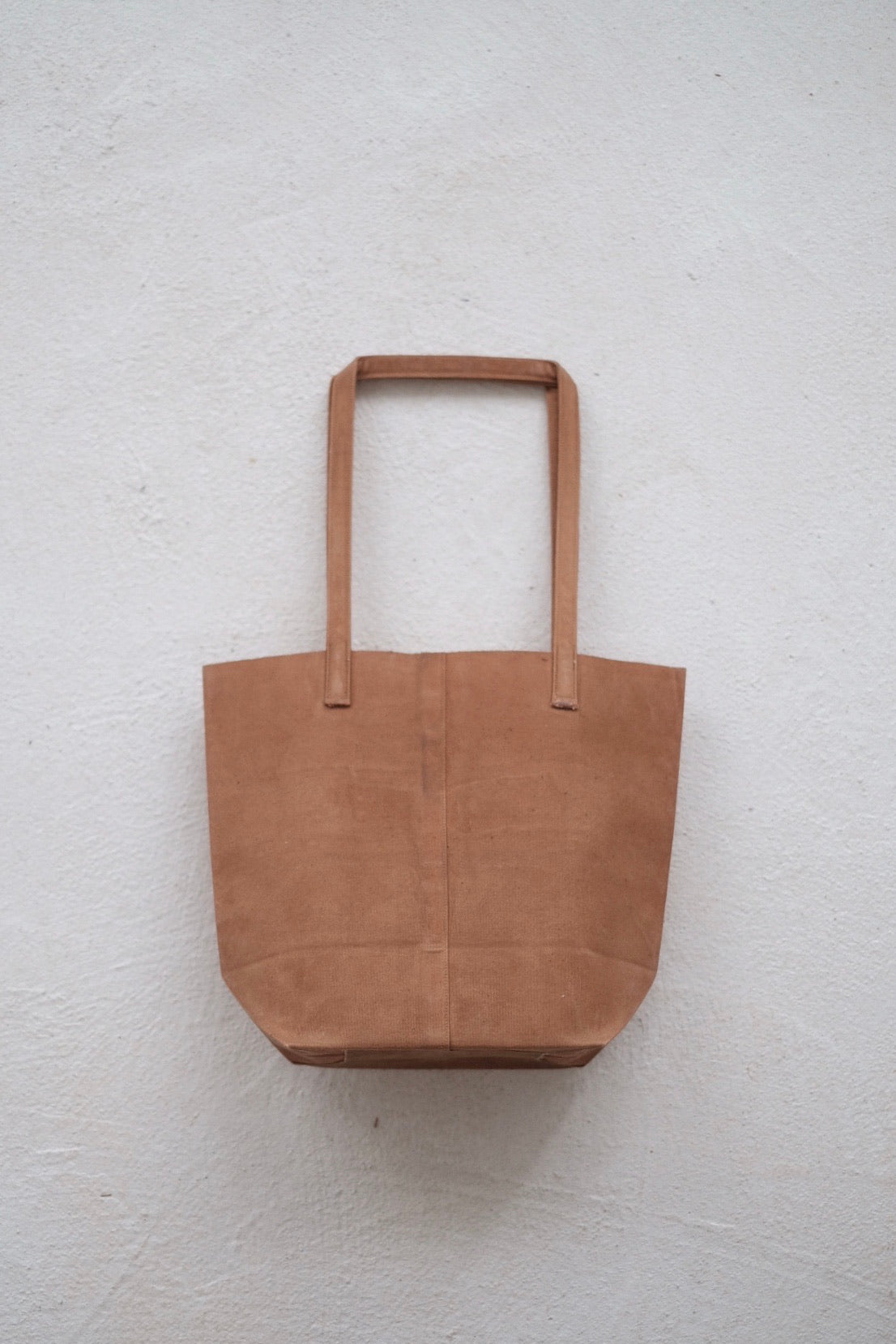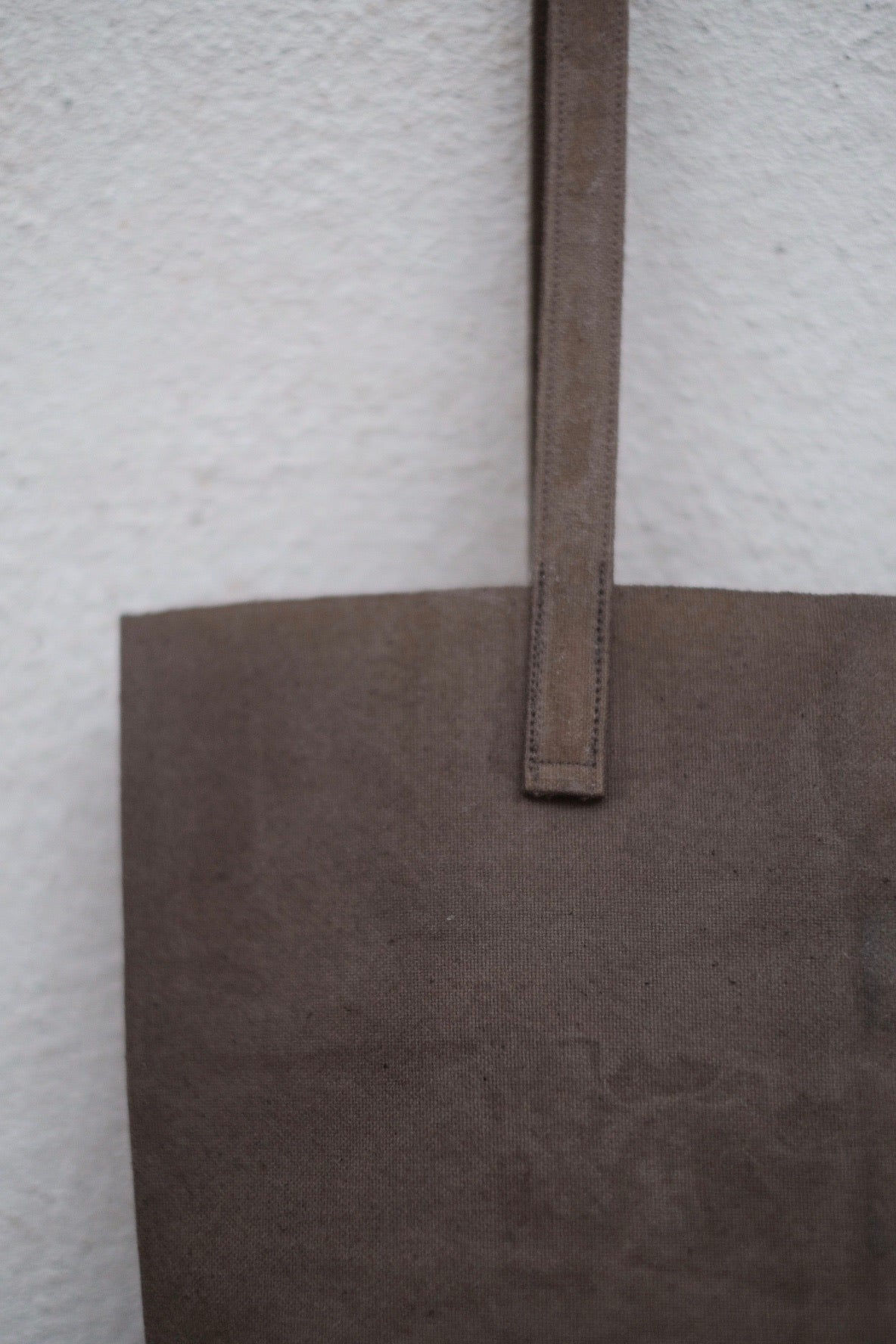 Kazumi Takigawa's line of dyed and waxed canvas bags take their inspiration from the plain brown paper bag. Wanting to mimic the look of ordinary brown paper bag while creating something re-usable and long lasting Takigawa's experiments led her to a process that includes a traditional dyeing technique and the use of tea and coffee as dyes. She produces each bag by hand in variety of shapes and sizes. The dyes are not completely colorfast and the color will fade to a softer light tone over time.