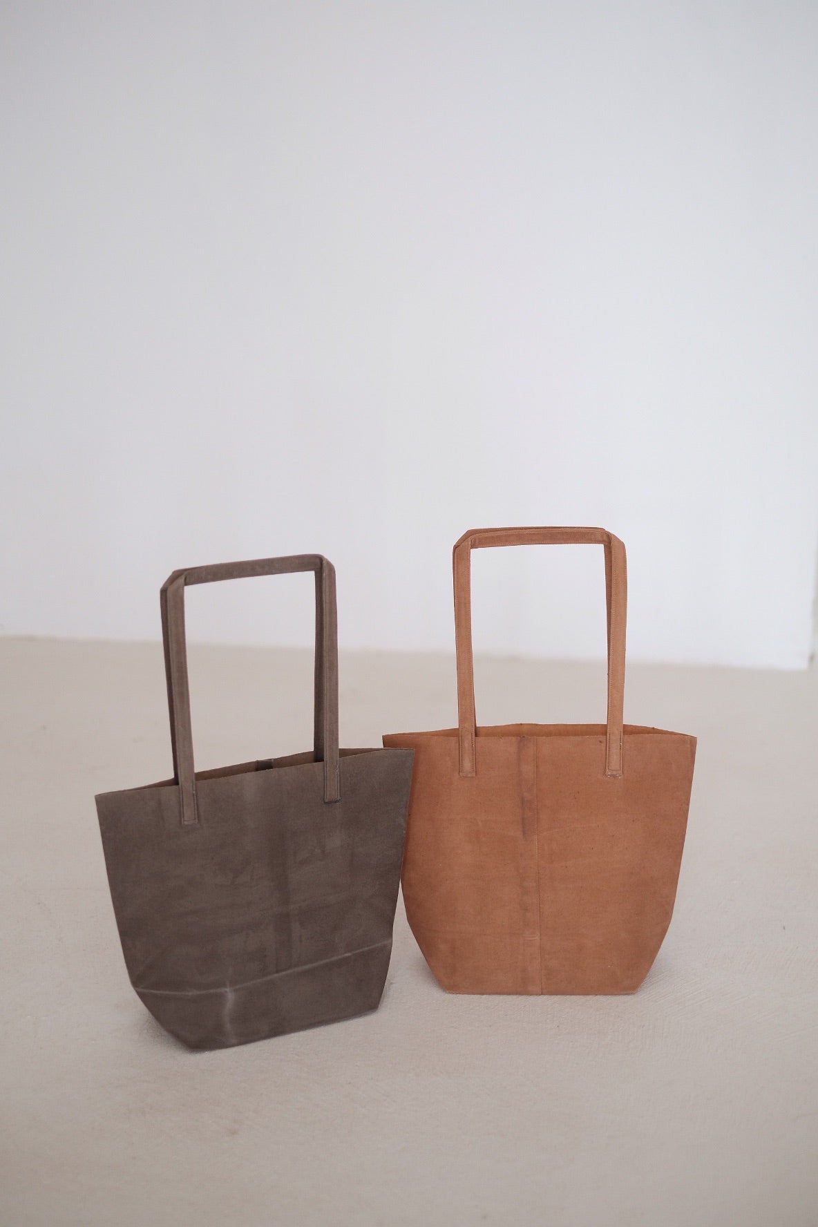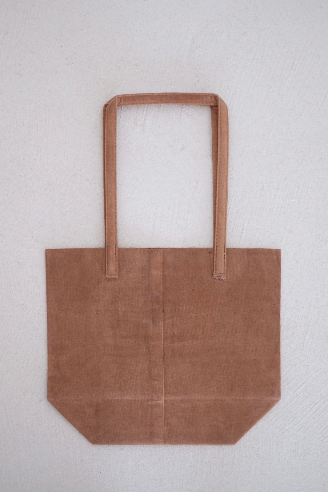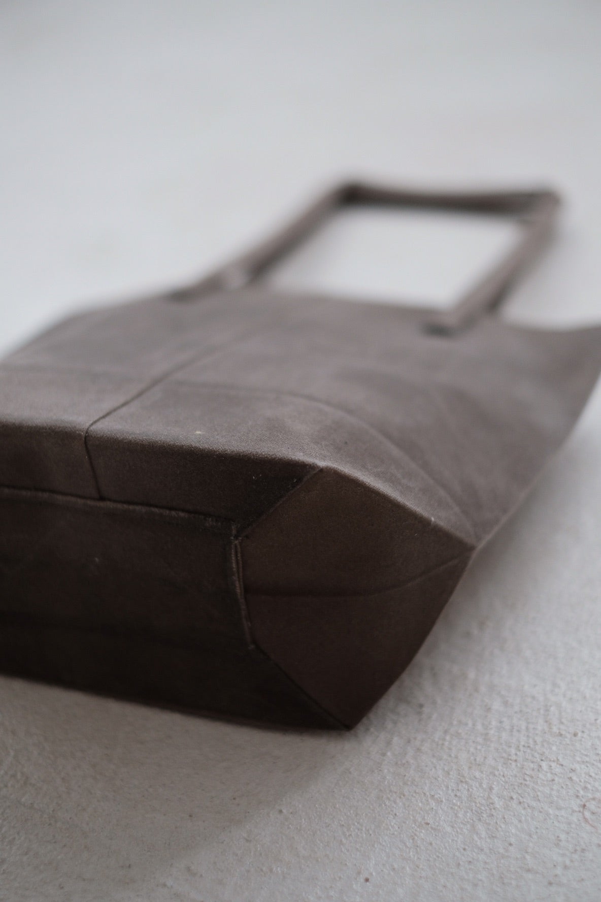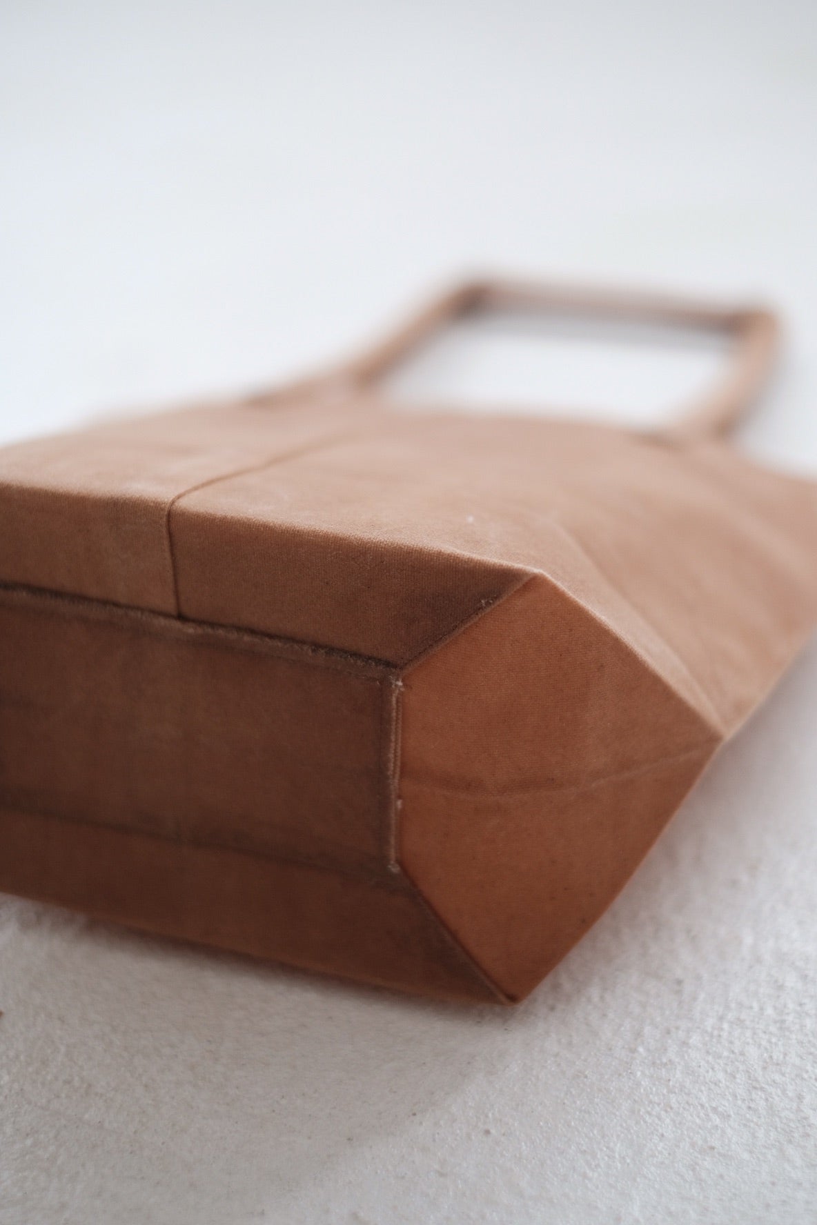 Kazumi Takigawa's line of dyed and waxed canvas bags take their inspiration from the plain brown paper bag. Wanting to mimic the look of ordinary brown paper bag while creating something re-usable and long lasting Takigawa's experiments led her to a process that includes a traditional dyeing technique and the use of tea and coffee as dyes. She produces each bag by hand in variety of shapes and sizes. The dyes are not completely colorfast and the color will fade to a softer light tone over time.