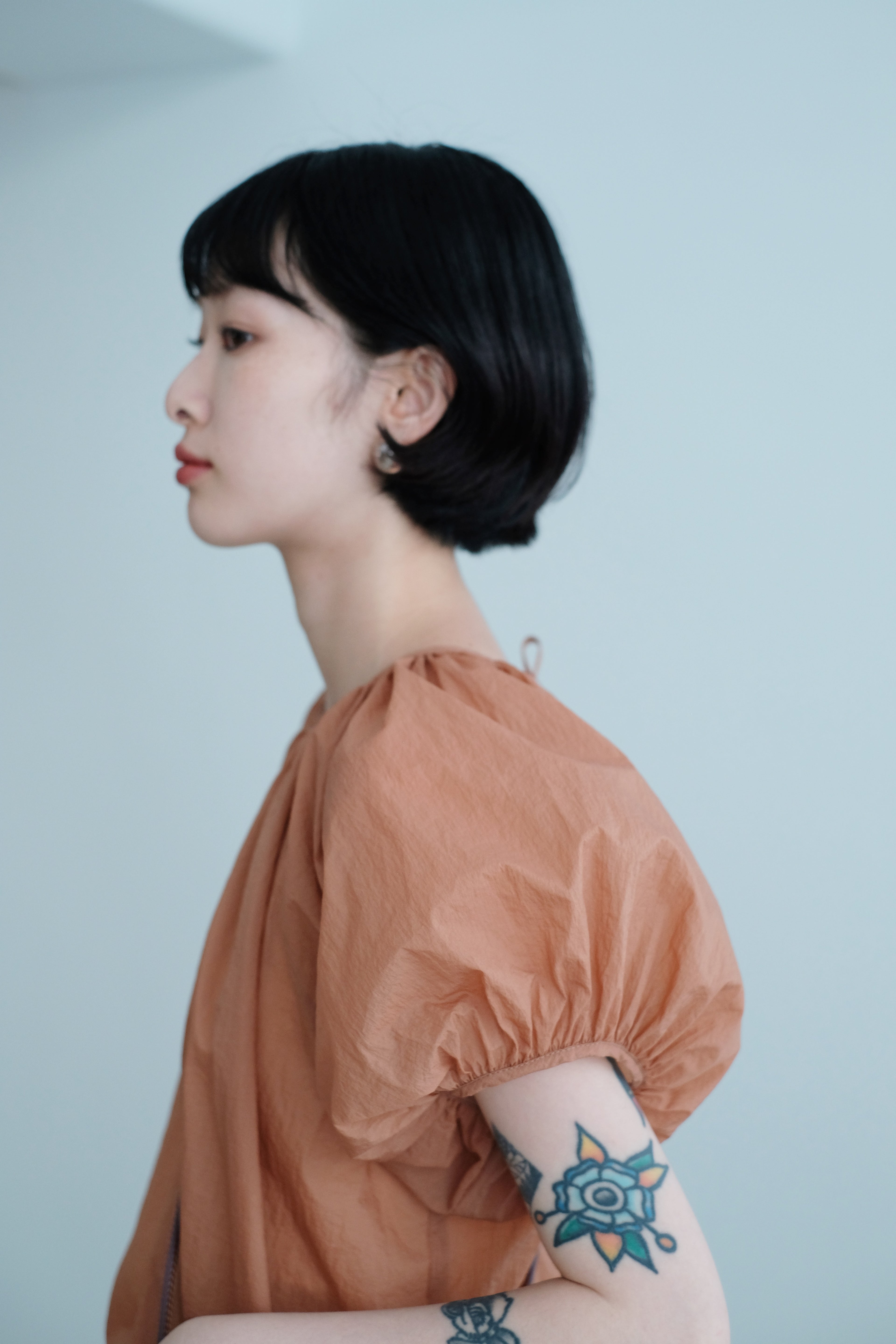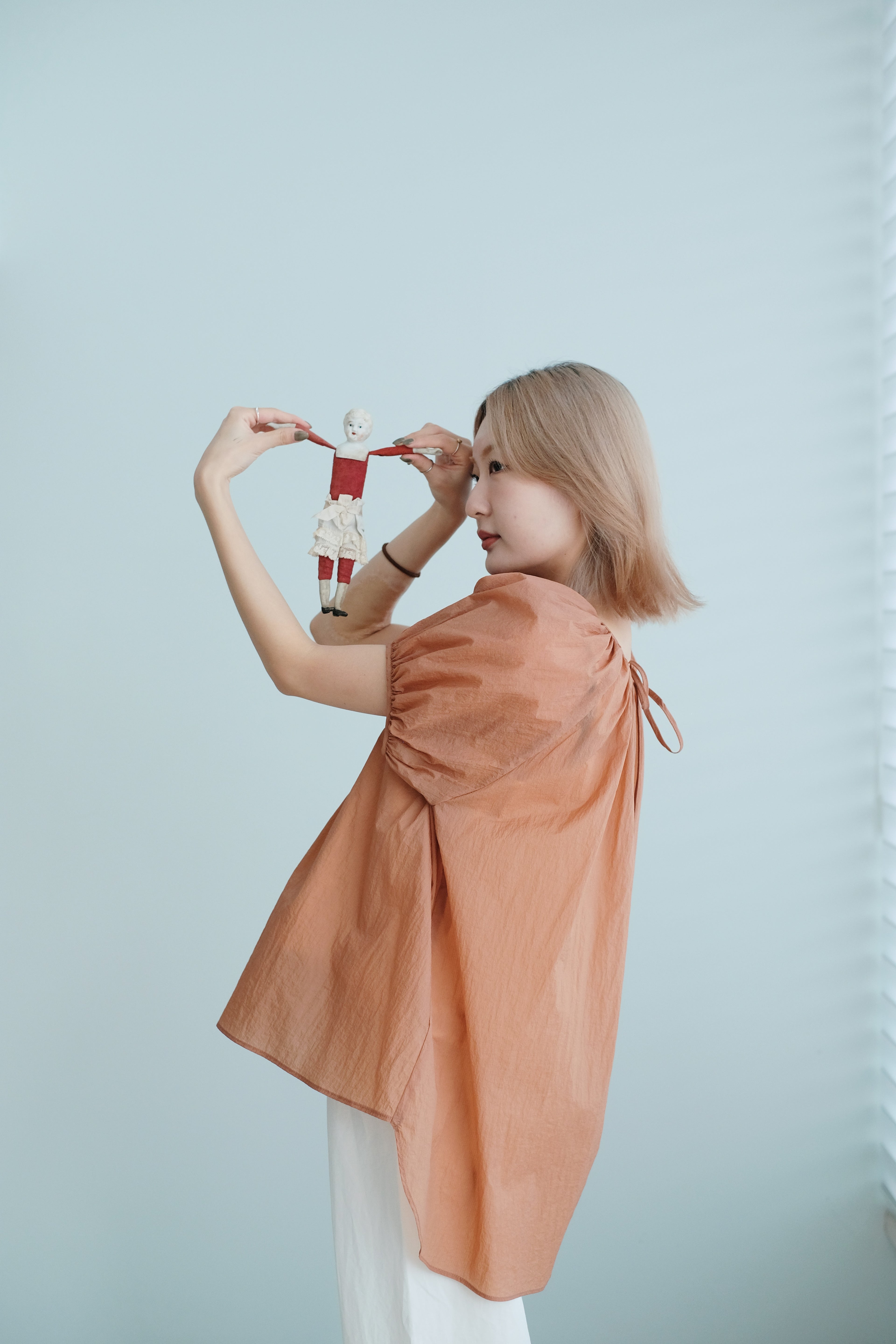 This rust-orange blouse is crafted from a lightweight fabric with puff sleeves at the shoulders, adding a soft volume to the silhouette. The back features a tie detail, giving flexibility and a relaxed fit. The fabric has a subtle sheen with a light drape, making it comfortable and breathable—perfect for summer wear on its own or styled in layers.
