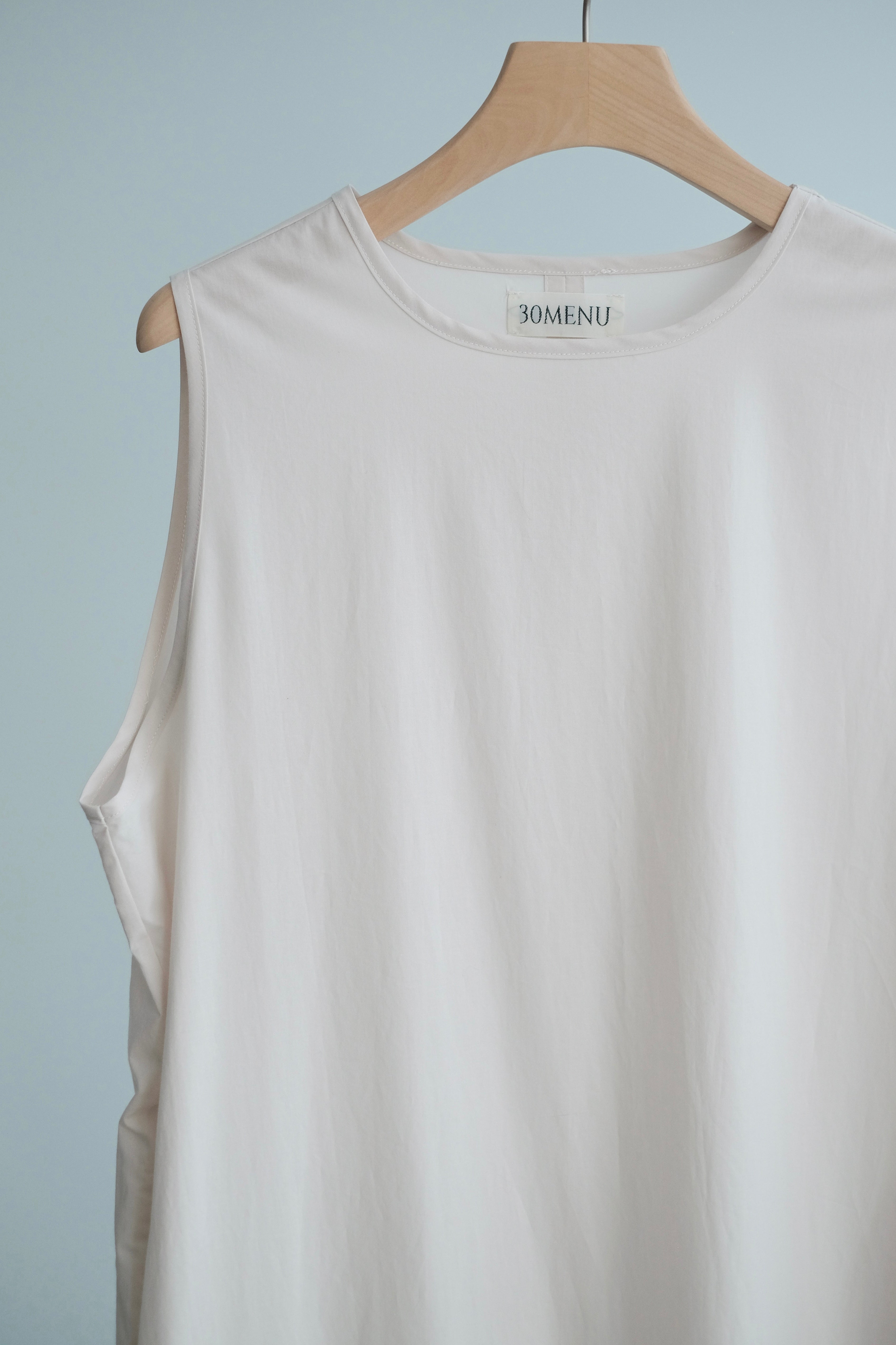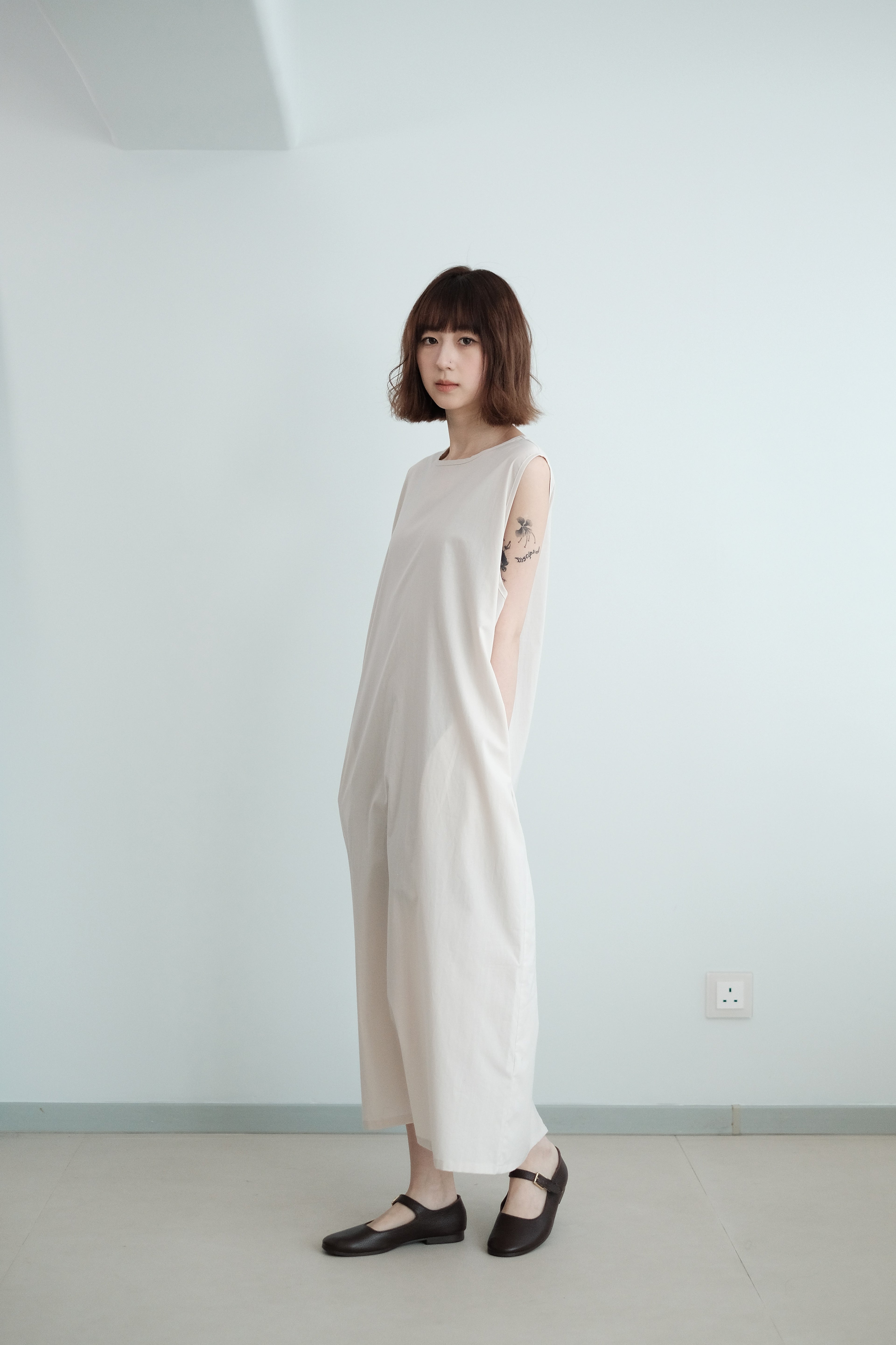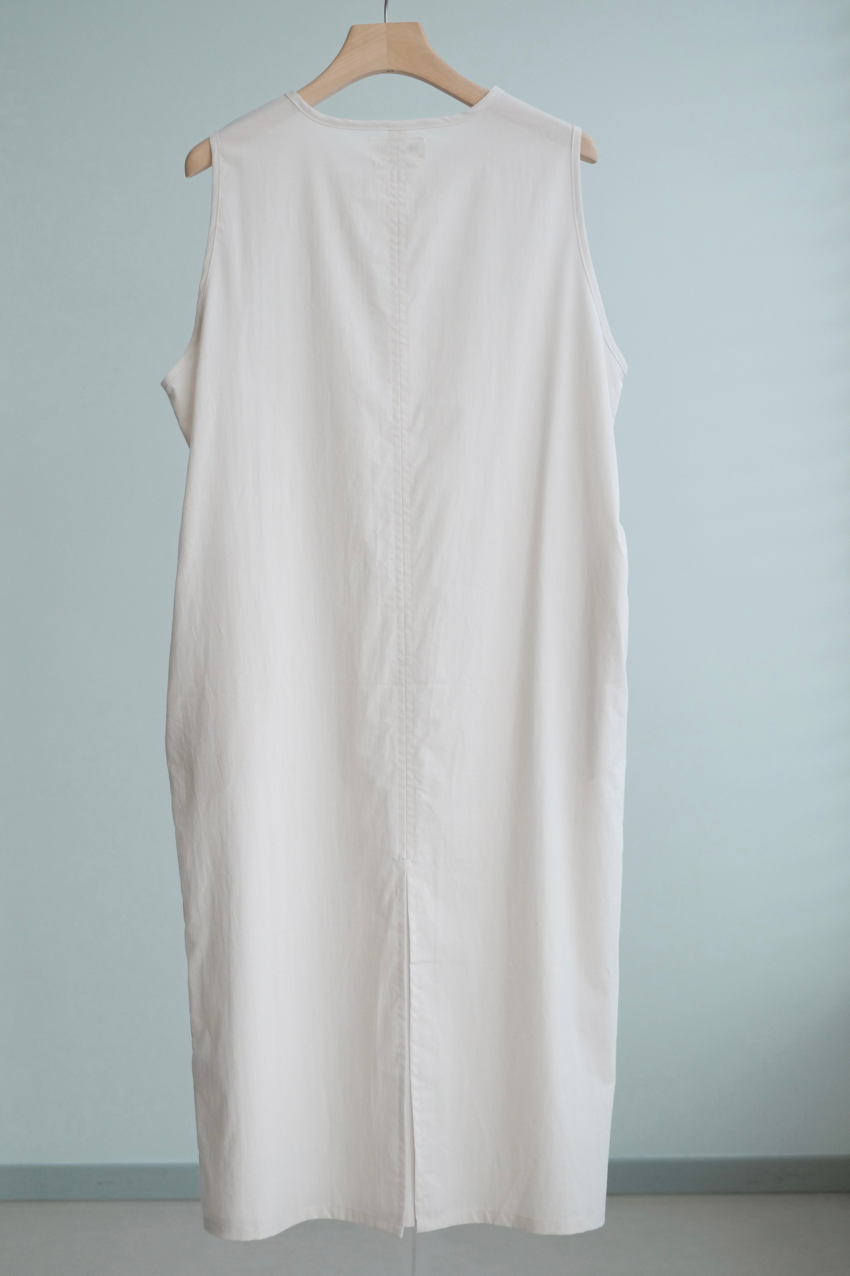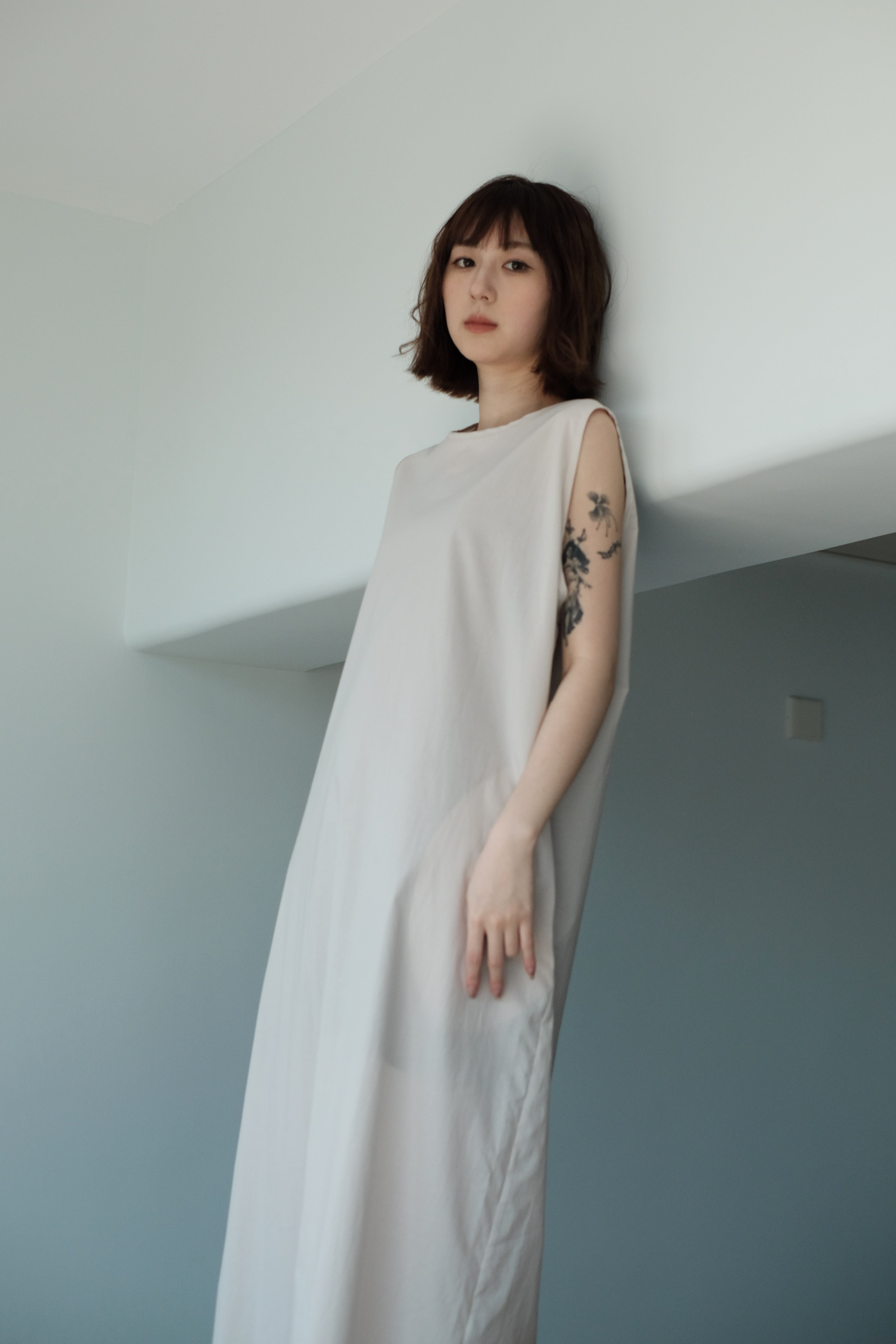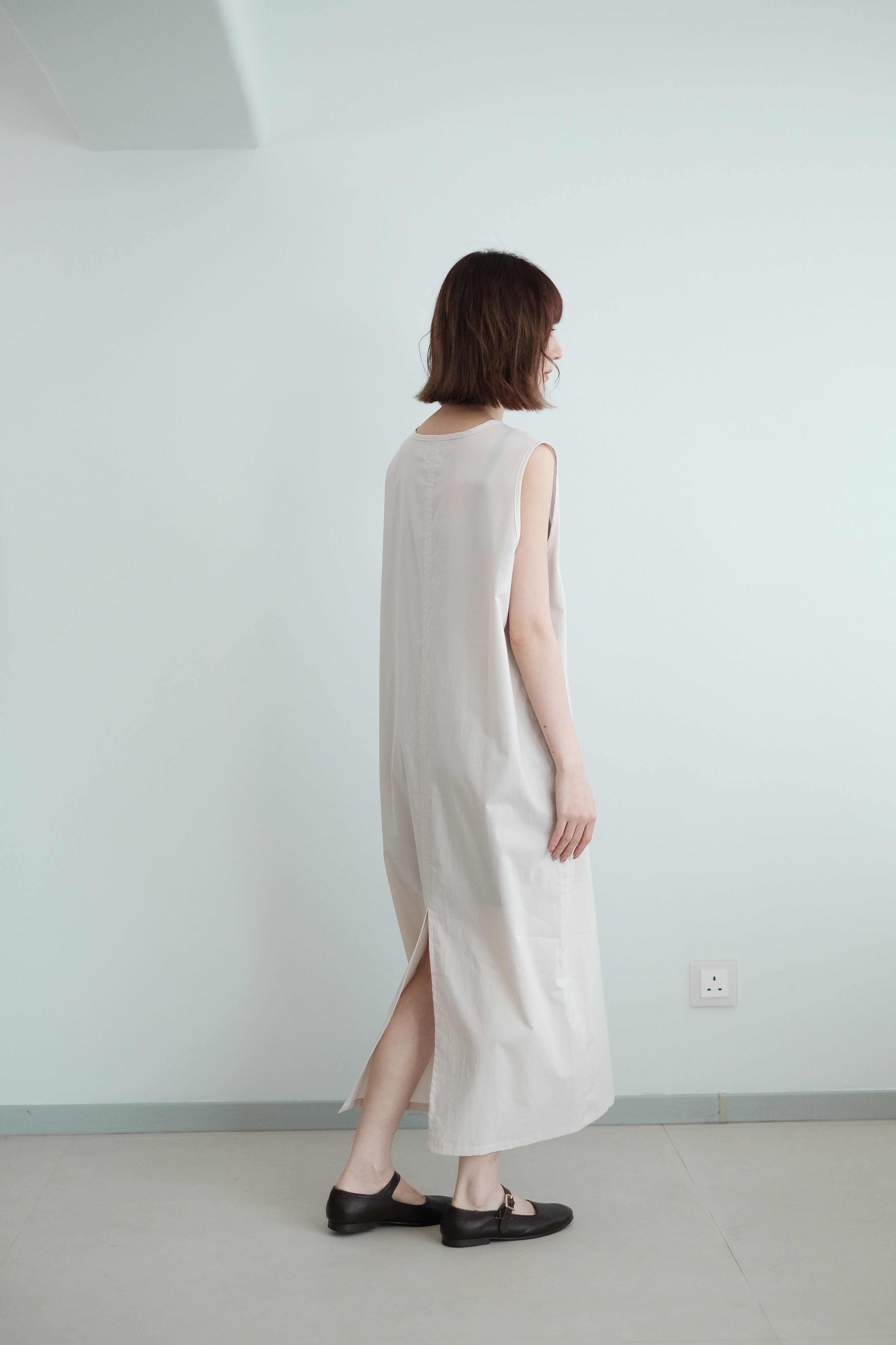 The sleeveless dress designed with minimalist lines, crafted from Japanese cotton fabric. The material is structured yet soft, offering a natural drape. A back slit enhances ease of movement. Perfect worn alone or layered — a practical piece for spring and summer wardrobes.