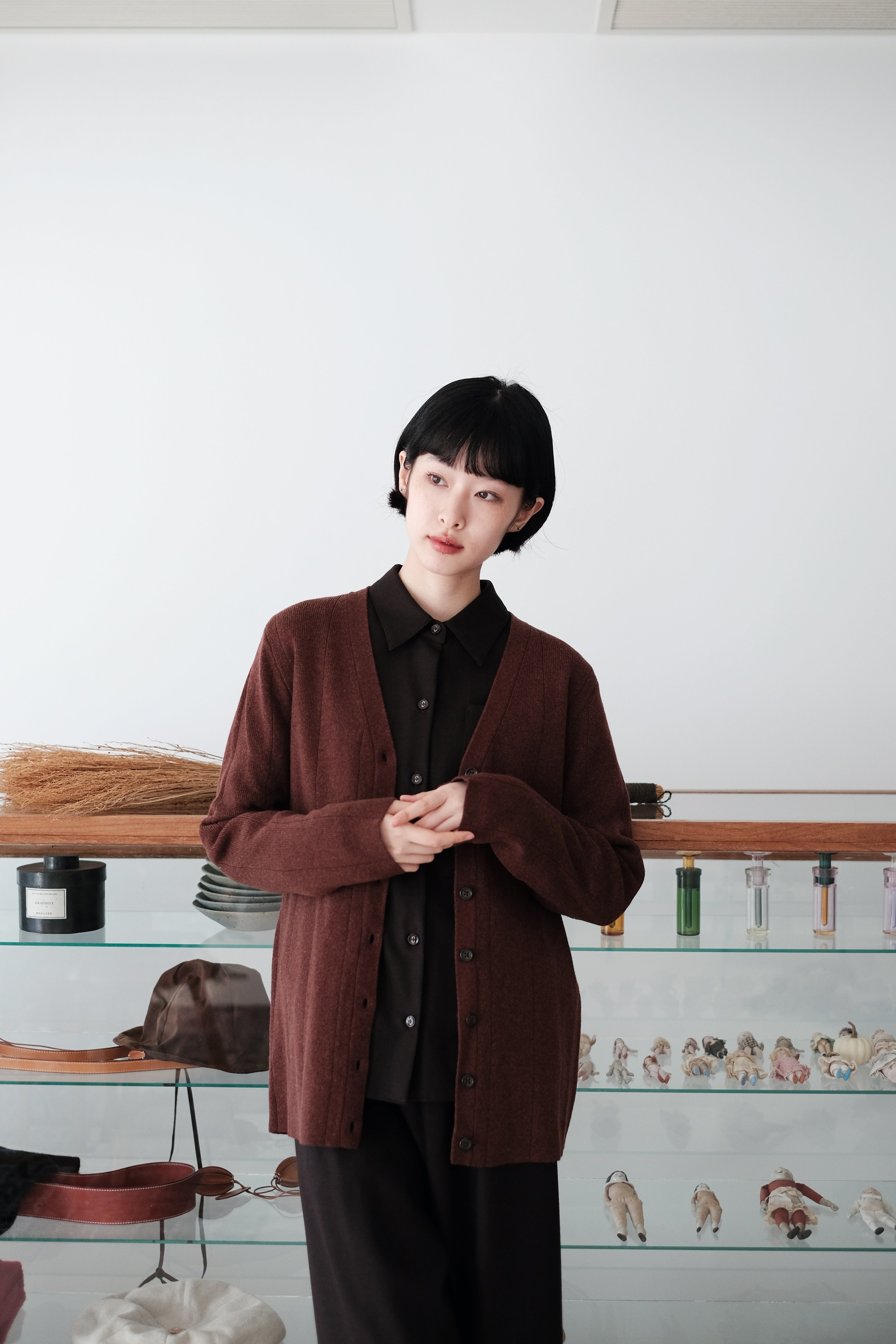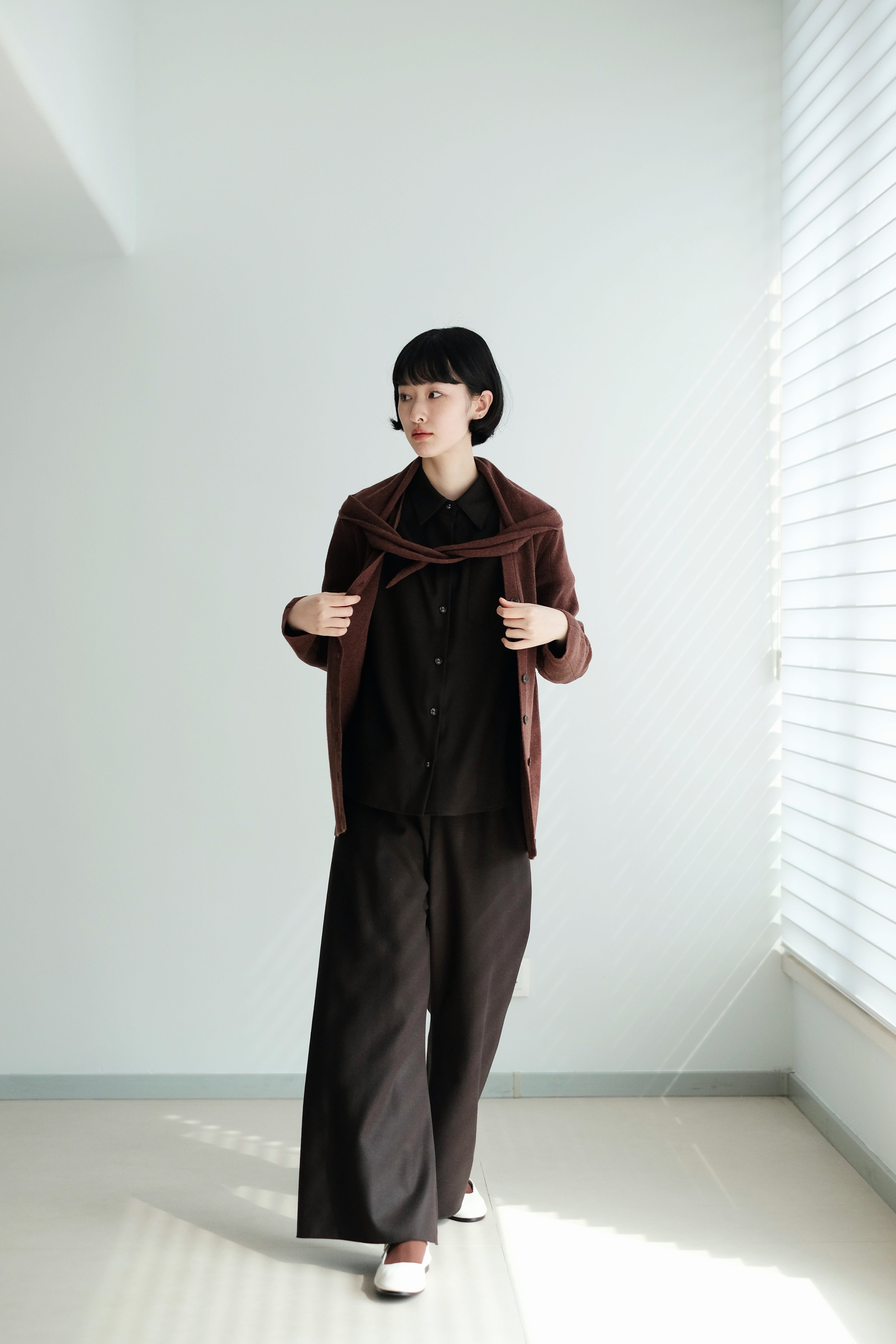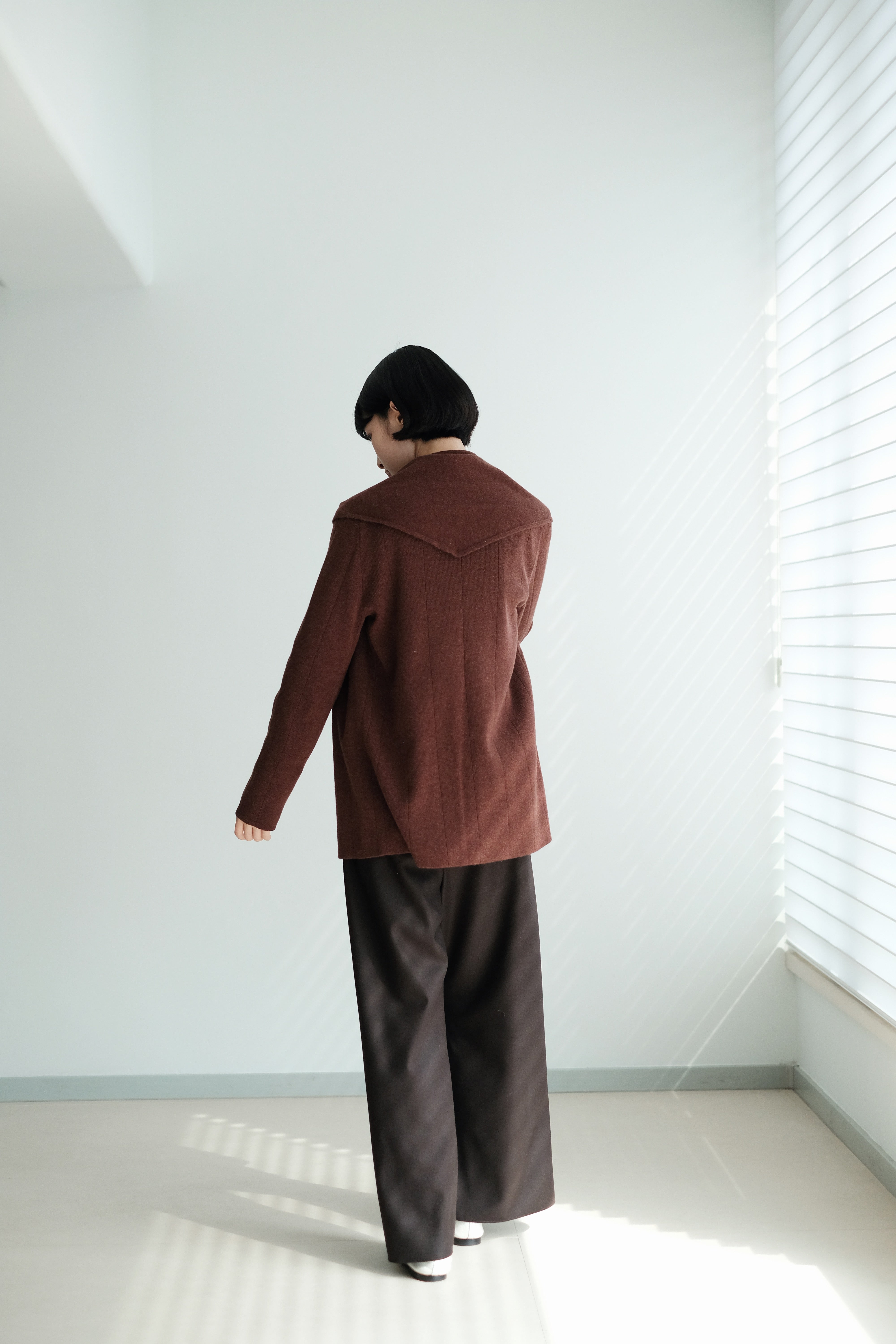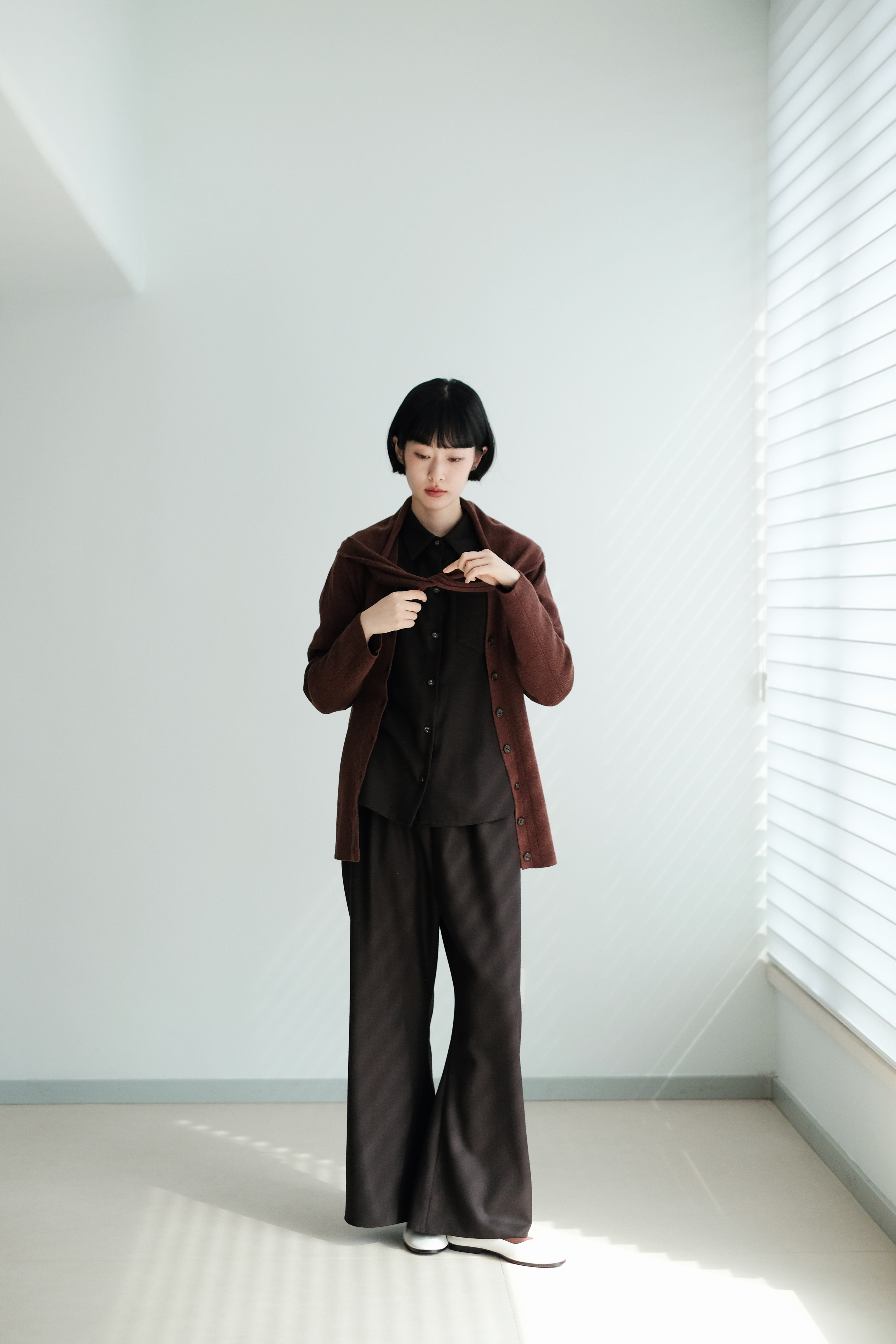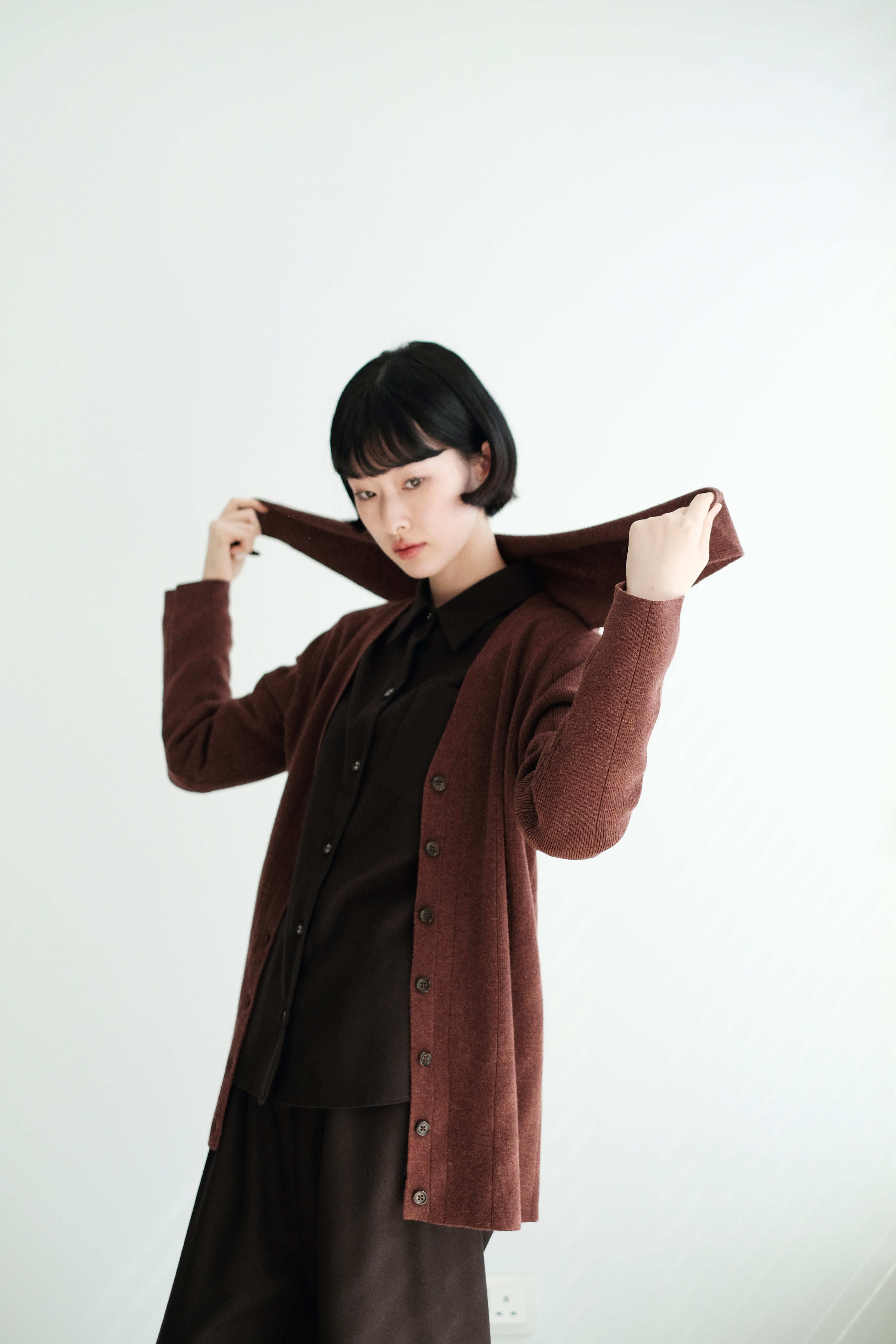 Designed with a relaxed straight silhouette, it features a natural dropped shoulder and refined back panel seams that create gentle structure. The multi-button front allows for versatile styling, perfect over shirts, vests, or turtlenecks. The warm reddish-brown tone adds a quiet sophistication to any autumn–winter look.
