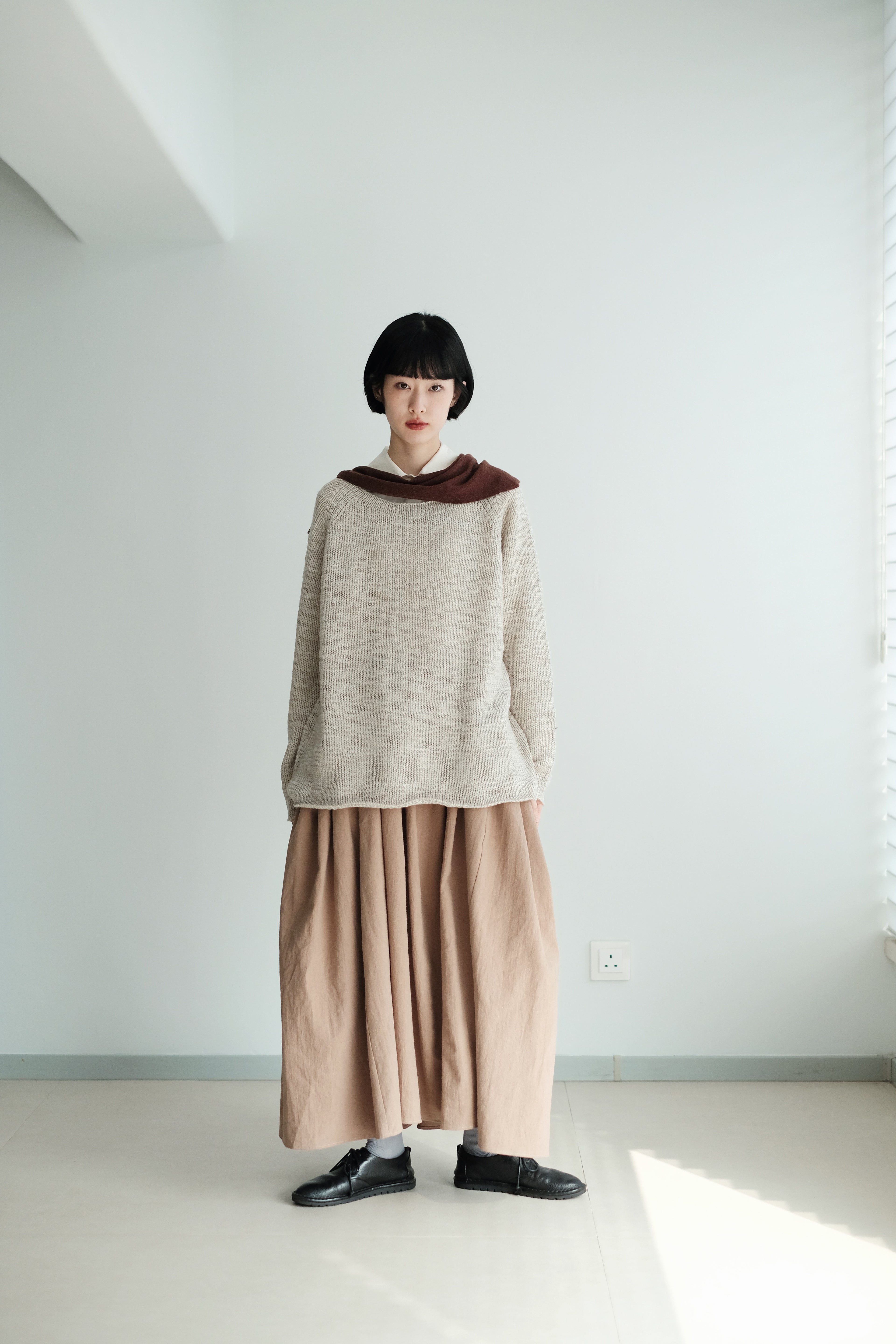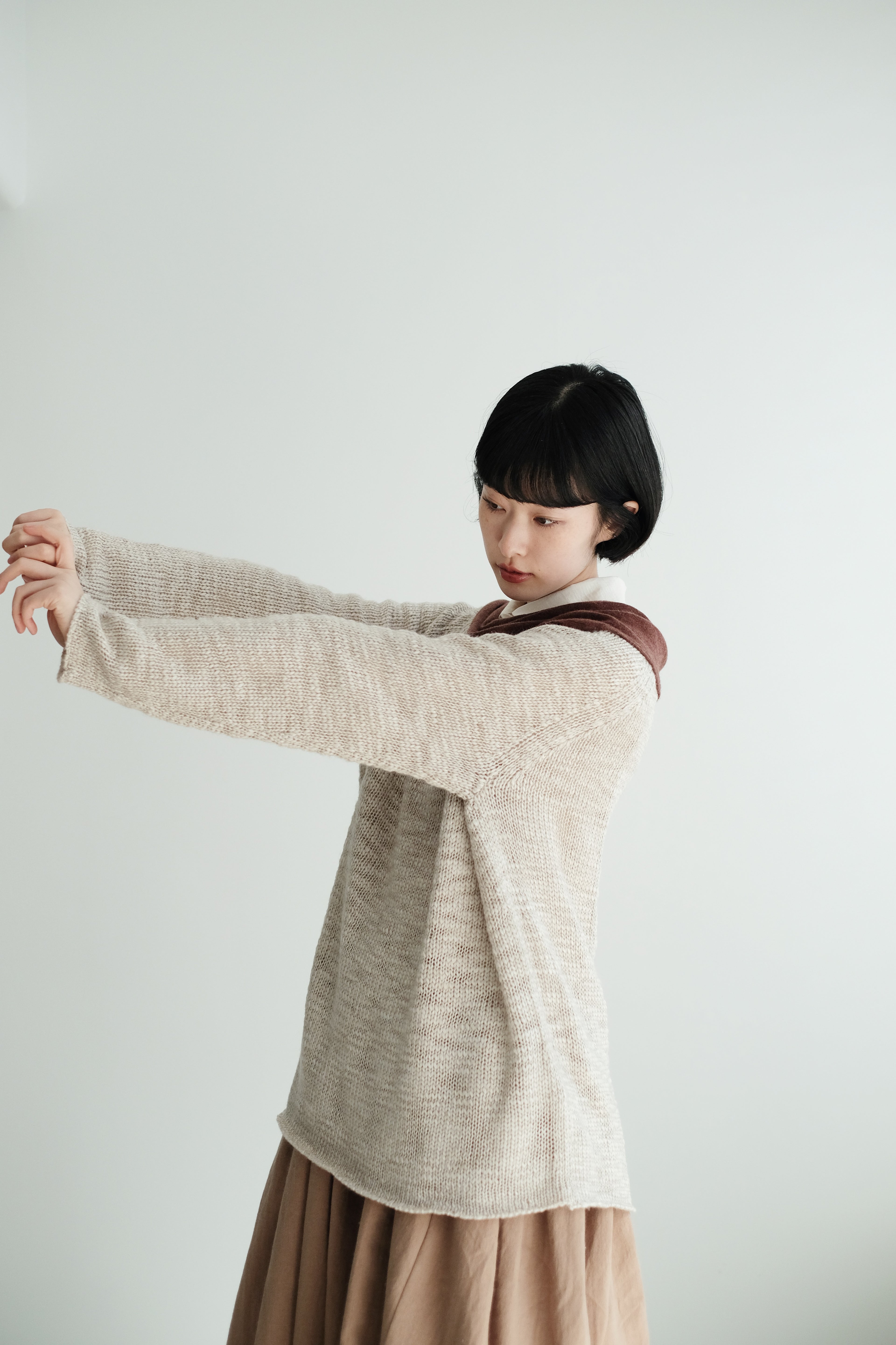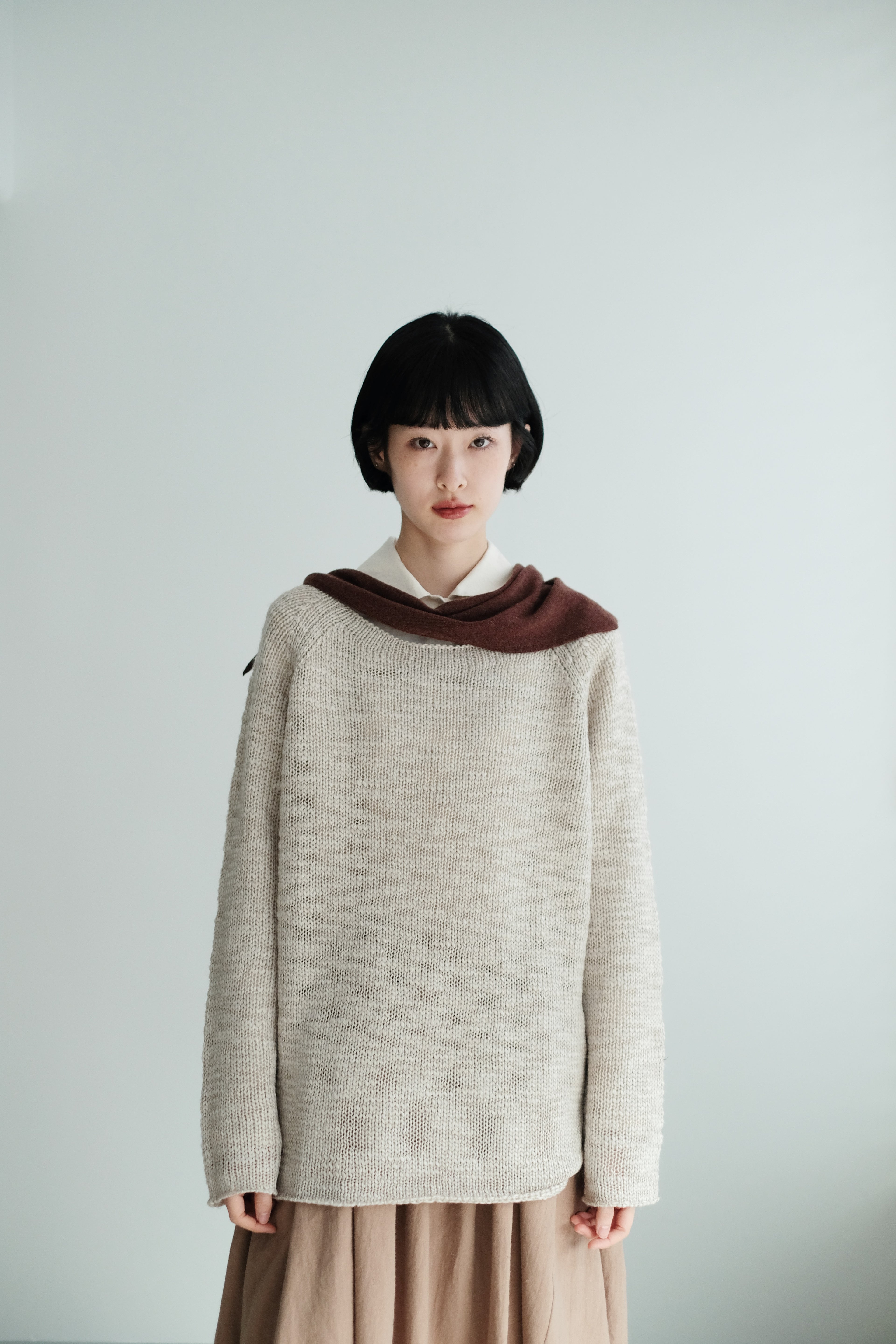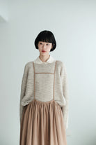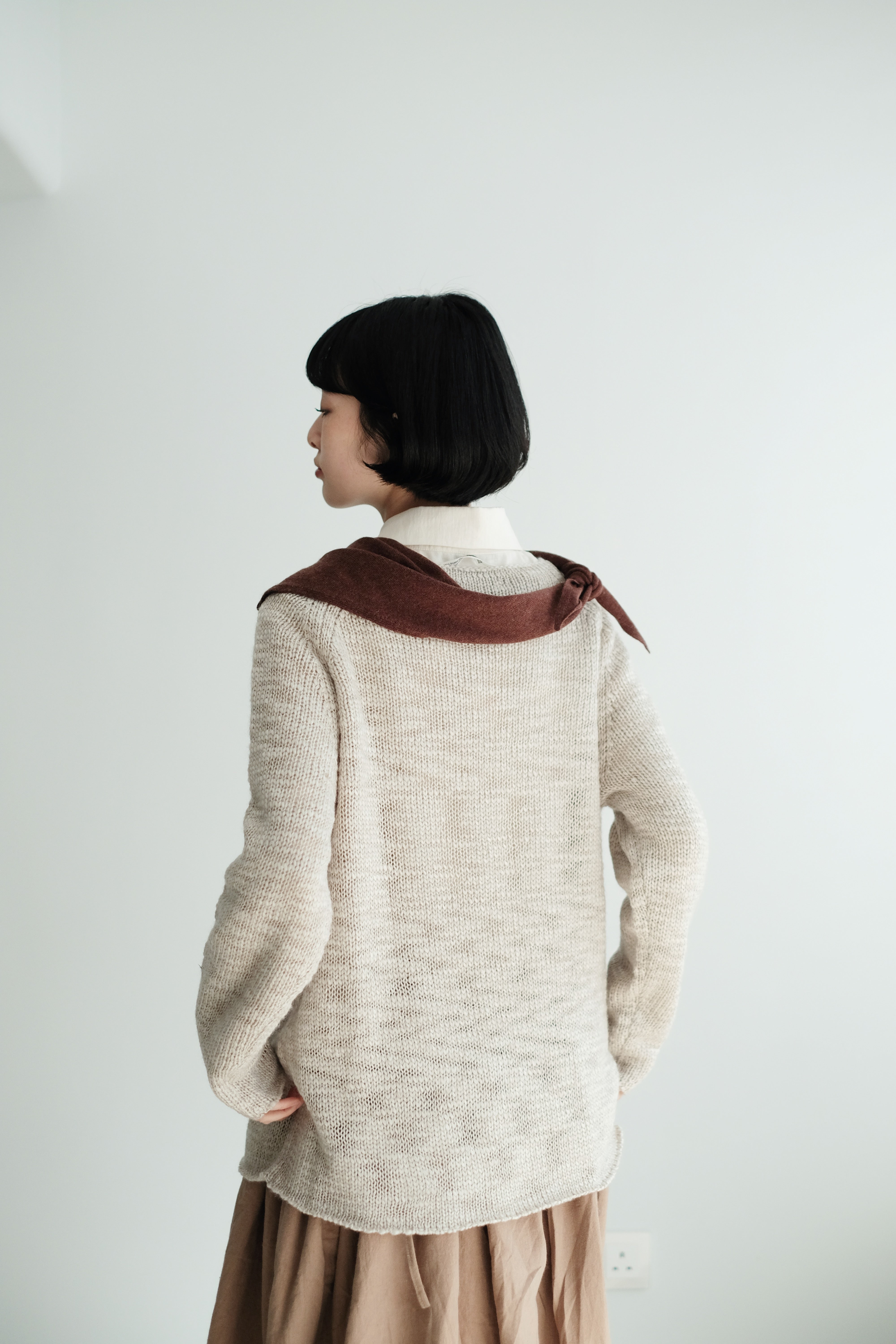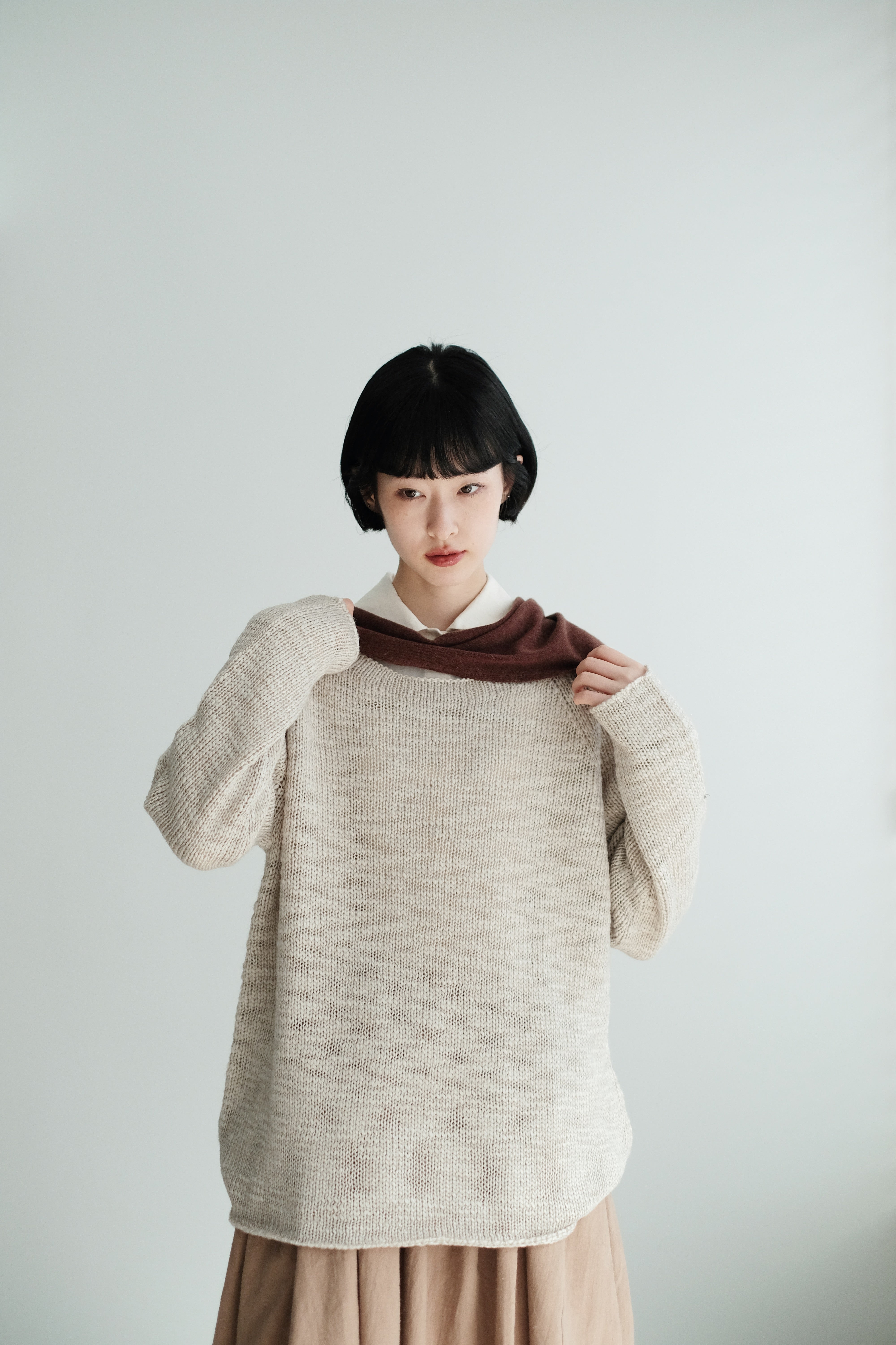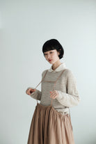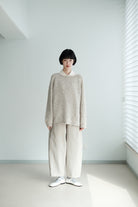 This light grey-beige knit comes in a relaxed silhouette with a soft, textured weave. Comfortable, airy, and non-clingy, it’s beautiful on its own and perfect for layering over shirts, skirts, or wide-leg pants.