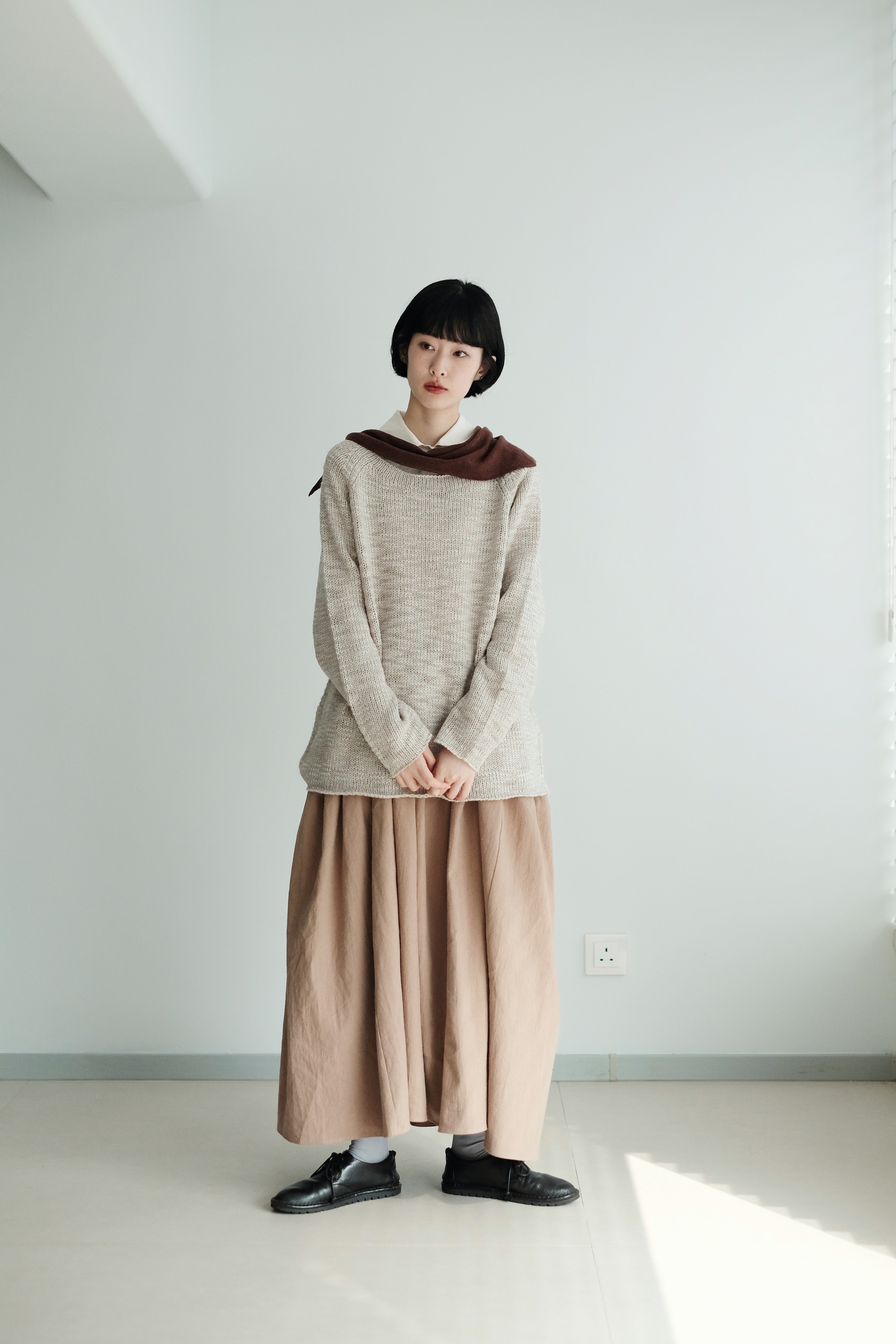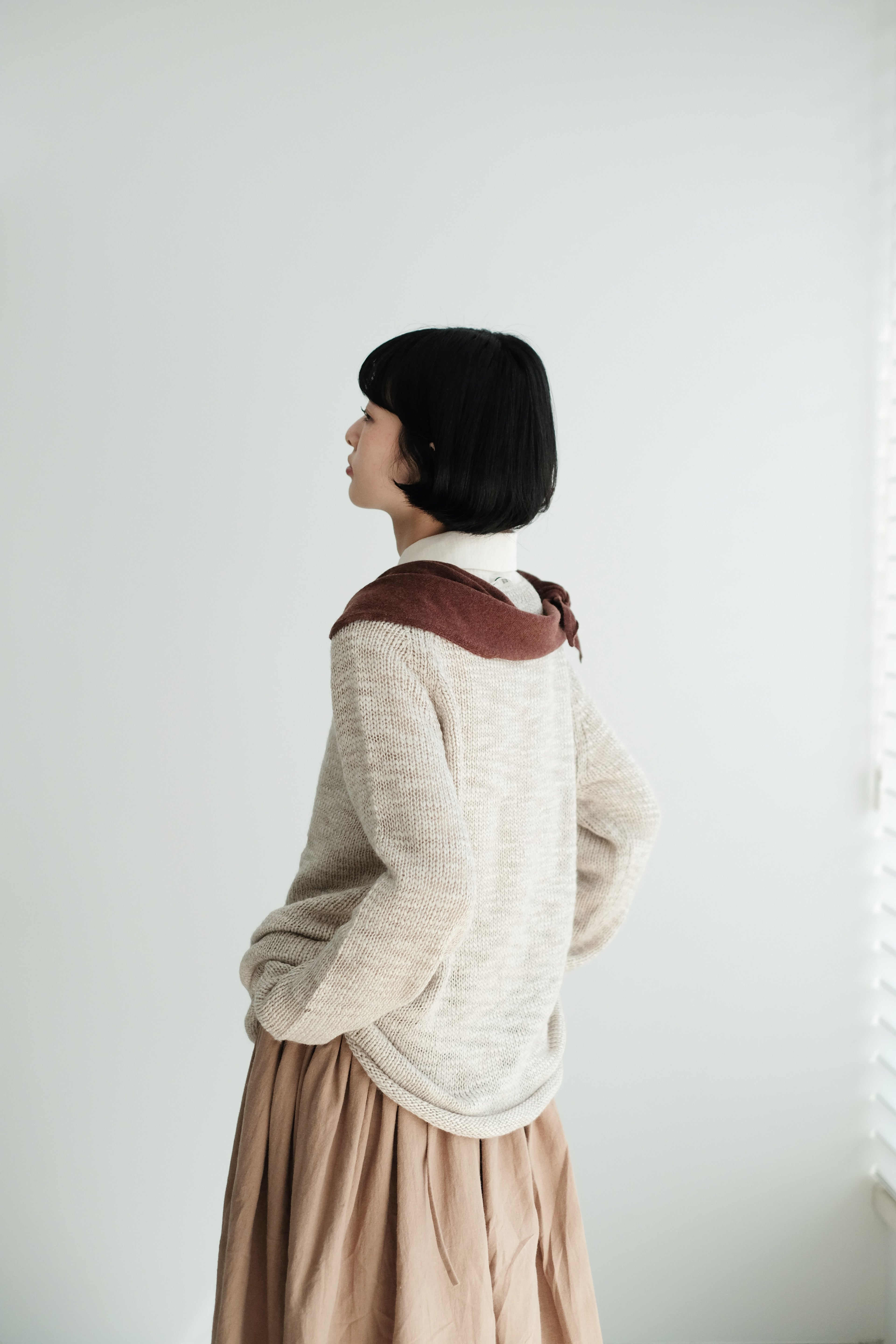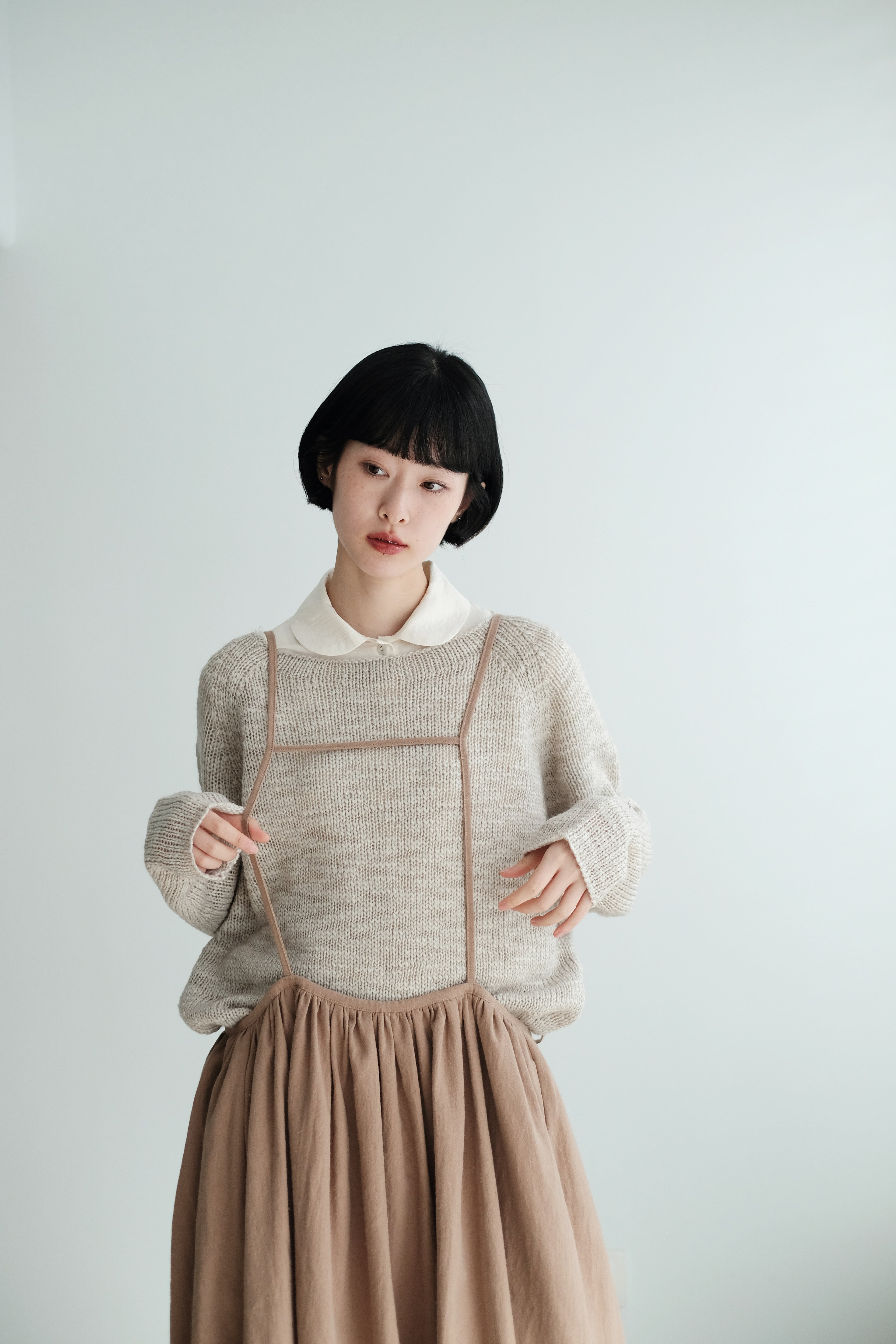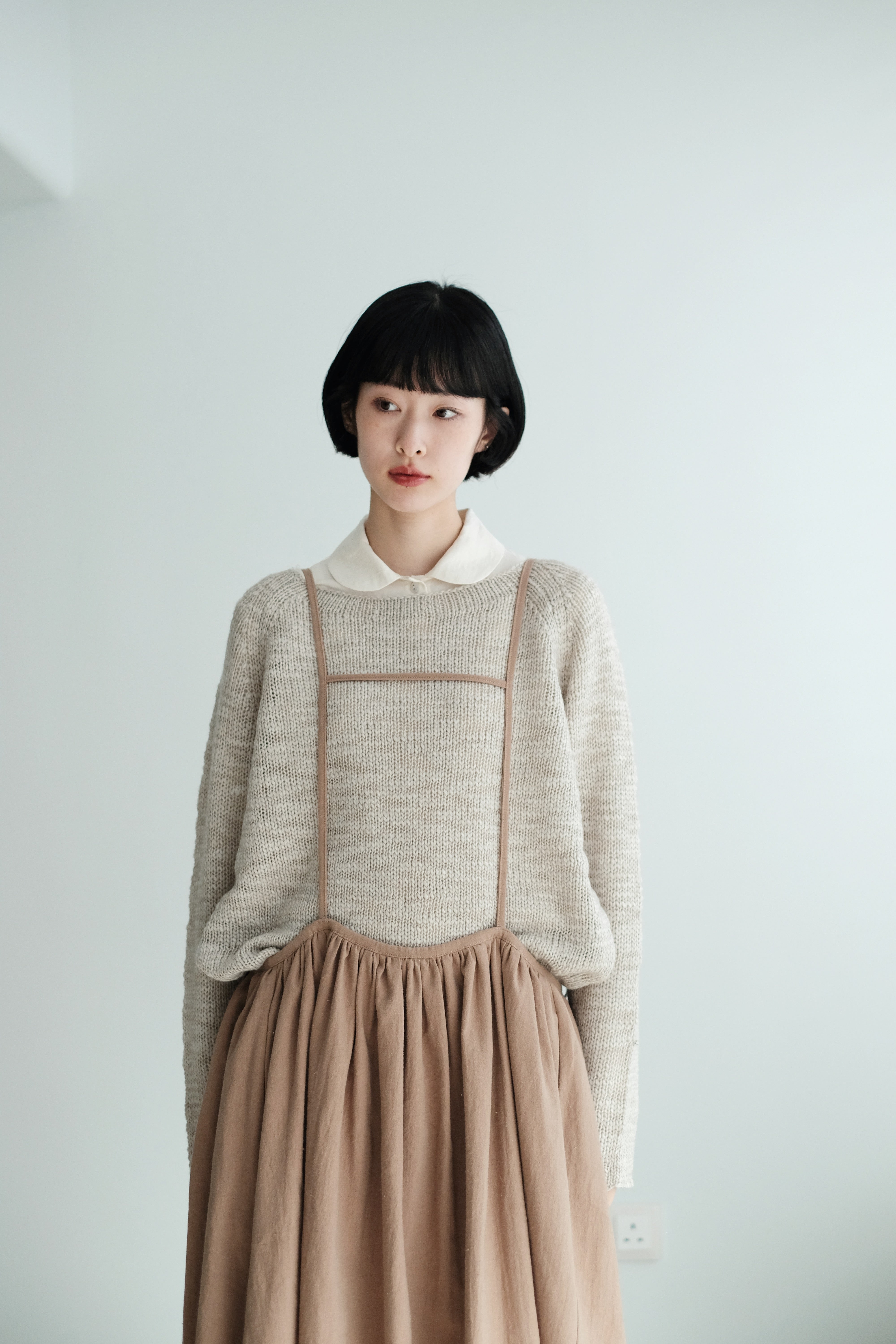 This light grey-beige knit comes in a relaxed silhouette with a soft, textured weave. Comfortable, airy, and non-clingy, it’s beautiful on its own and perfect for layering over shirts, skirts, or wide-leg pants.