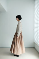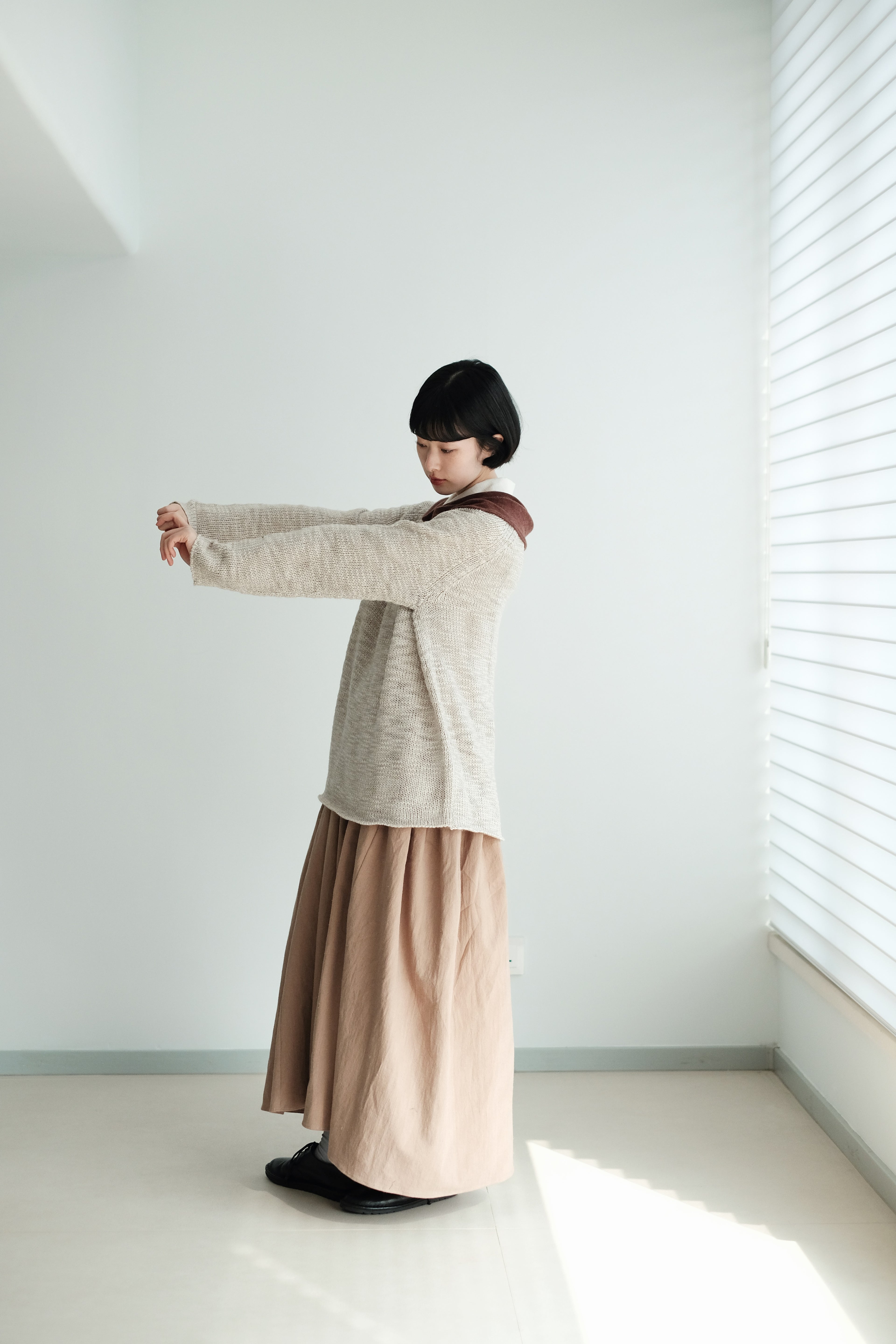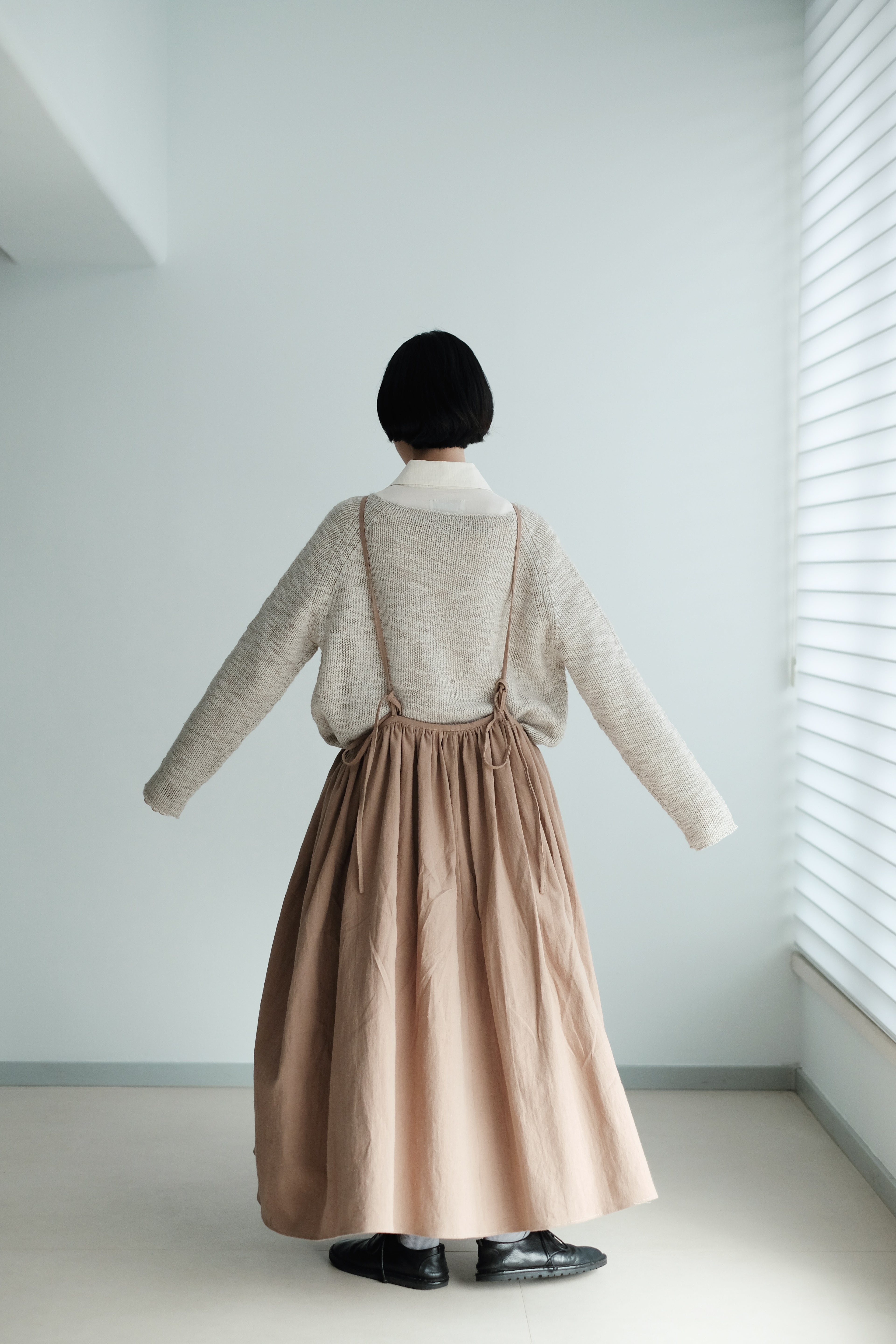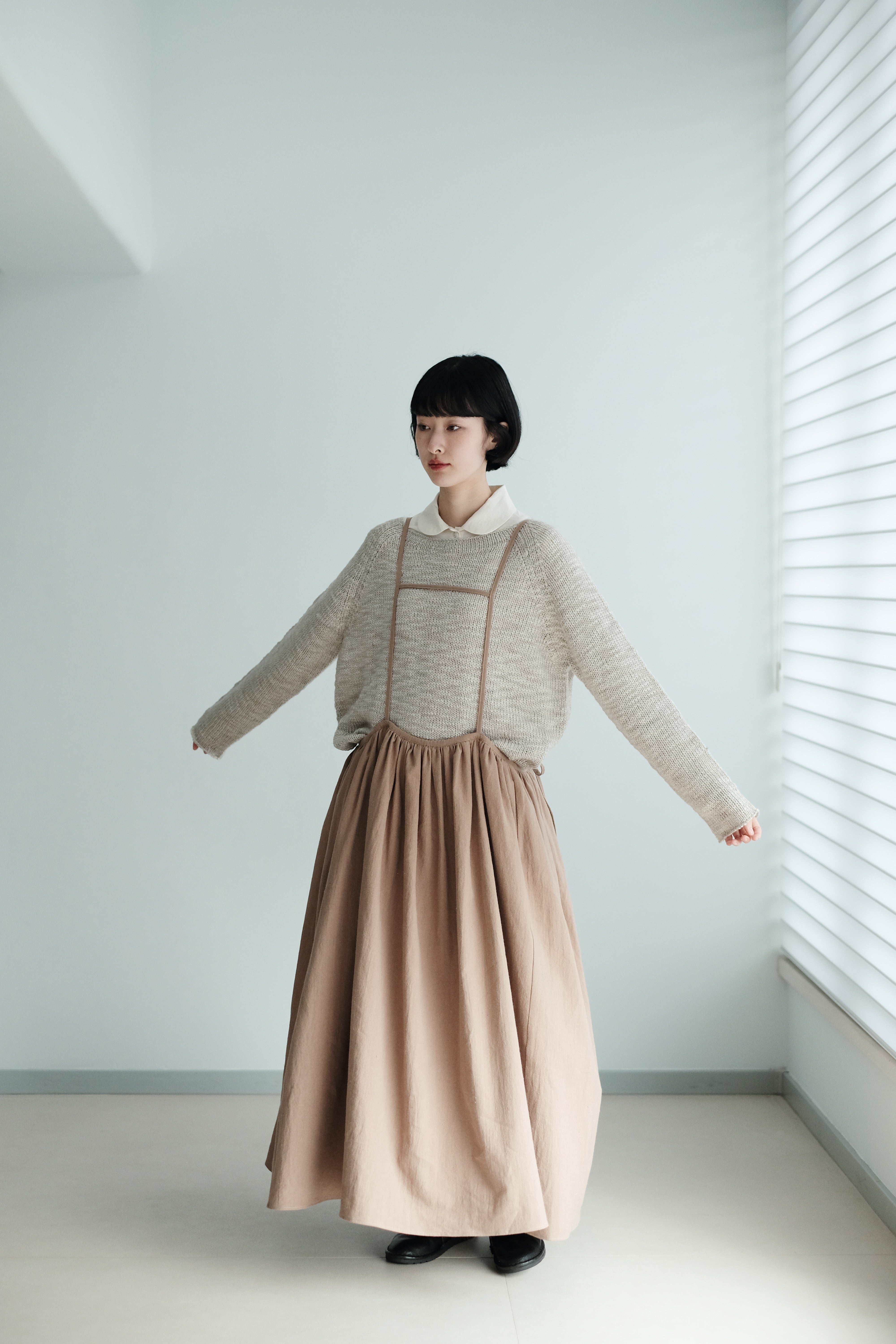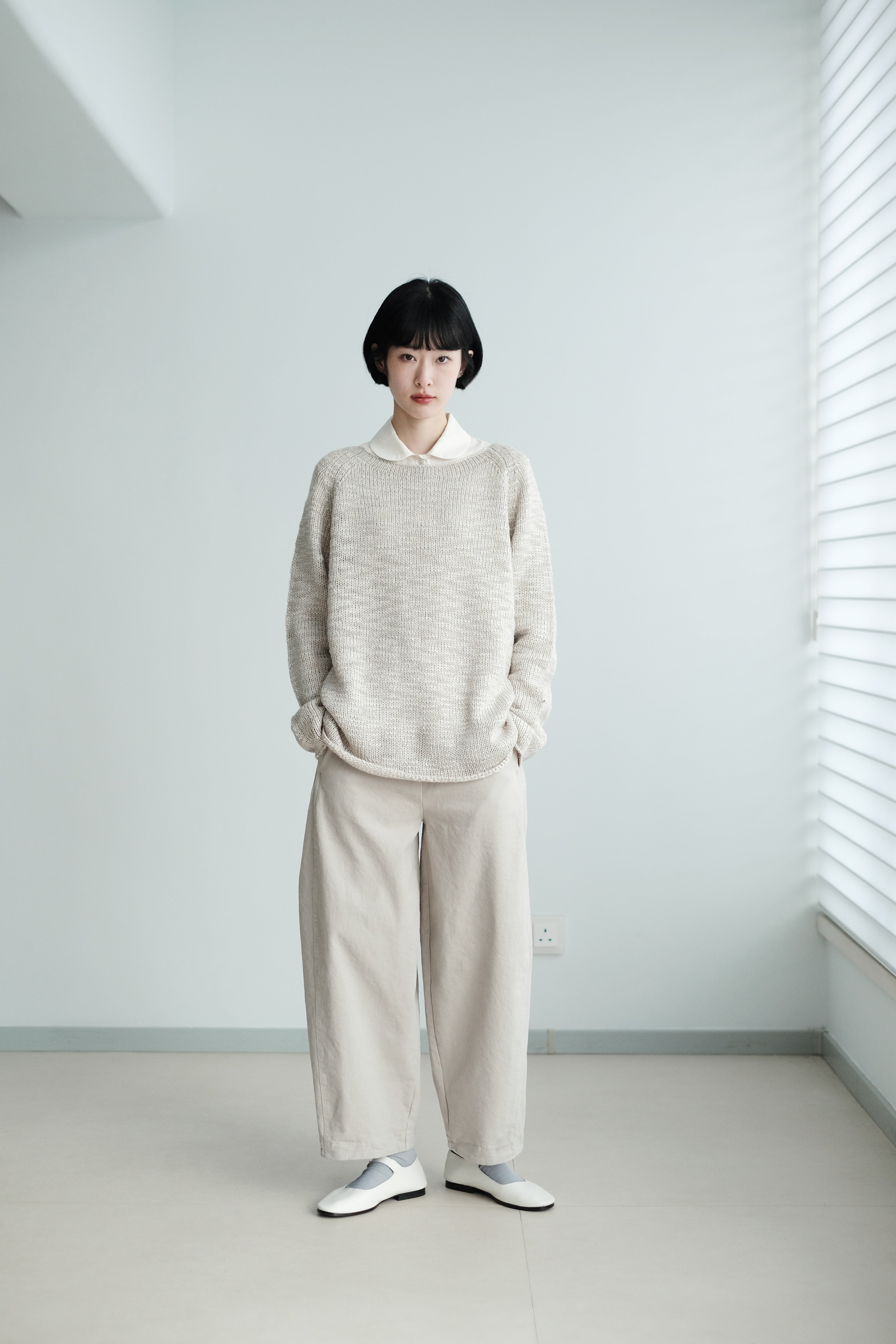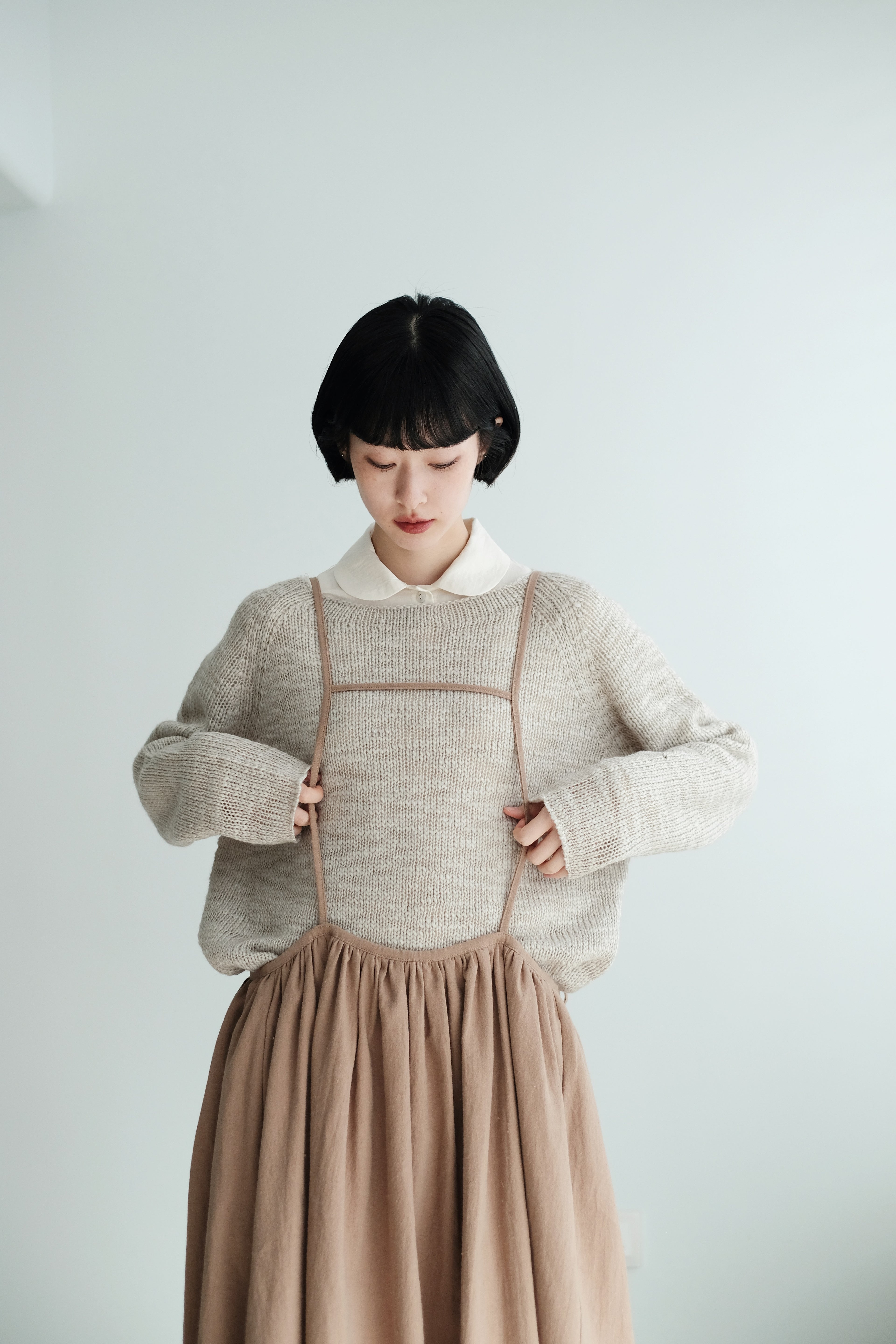 This light grey-beige knit comes in a relaxed silhouette with a soft, textured weave. Comfortable, airy, and non-clingy, it’s beautiful on its own and perfect for layering over shirts, skirts, or wide-leg pants.