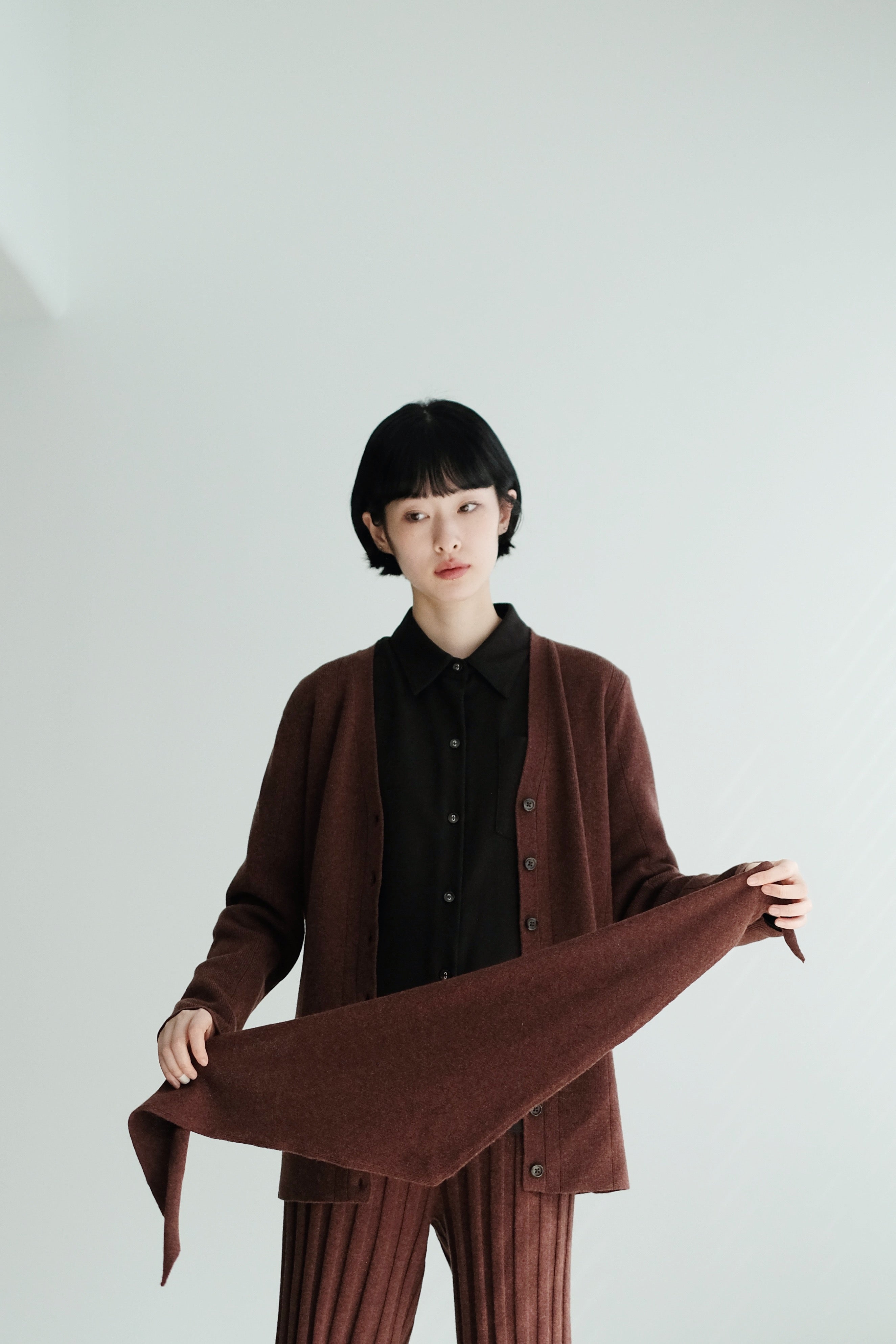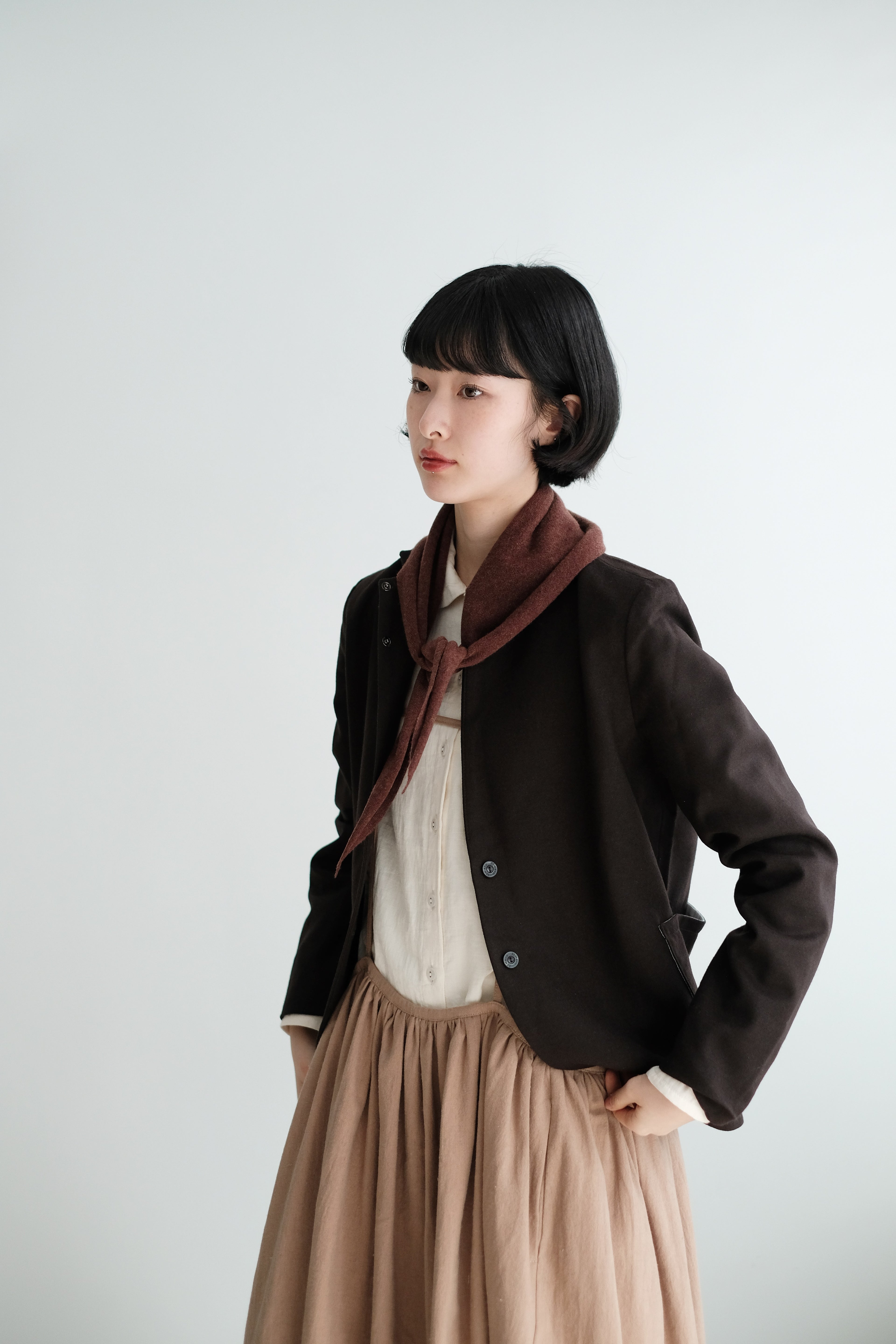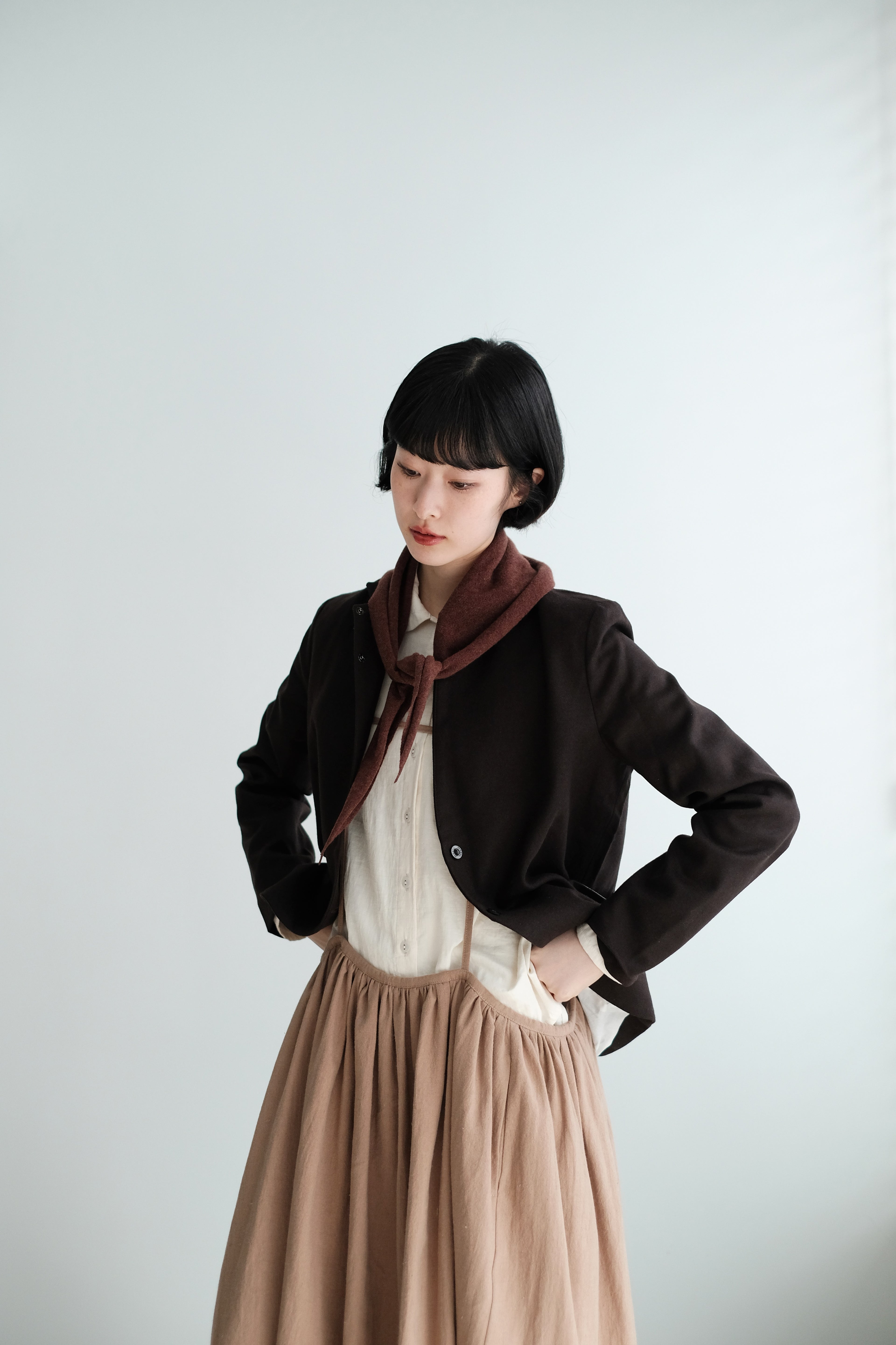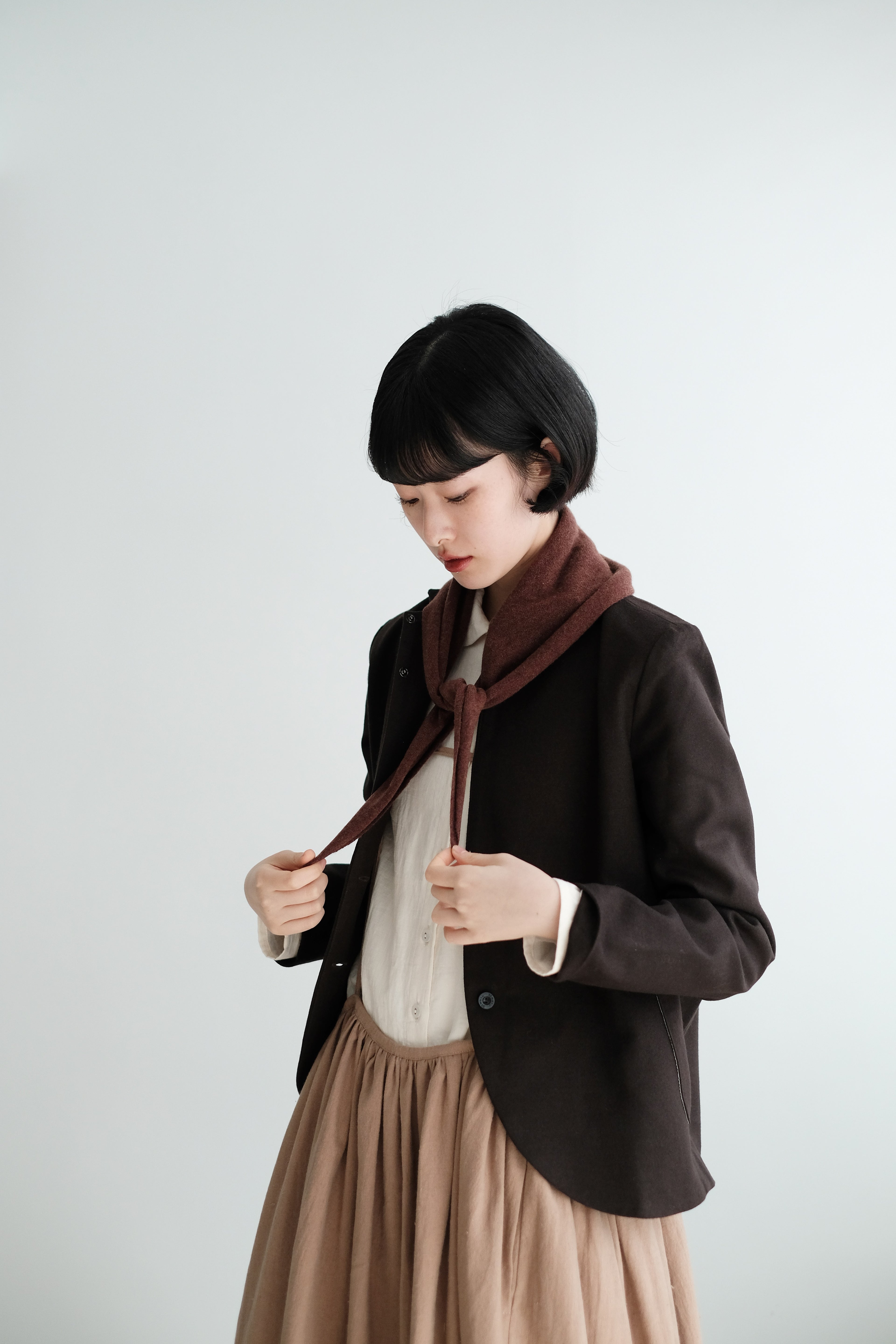 This mini scarf is crafted from a soft cashmere-blend yarn with a lightweight, refined touch. Its compact size makes it easy to style without feeling bulky. Perfect as a subtle neck accessory, a warm layer, or casually tied over the shoulders—simple, versatile, and ideal for everyday winter styling.