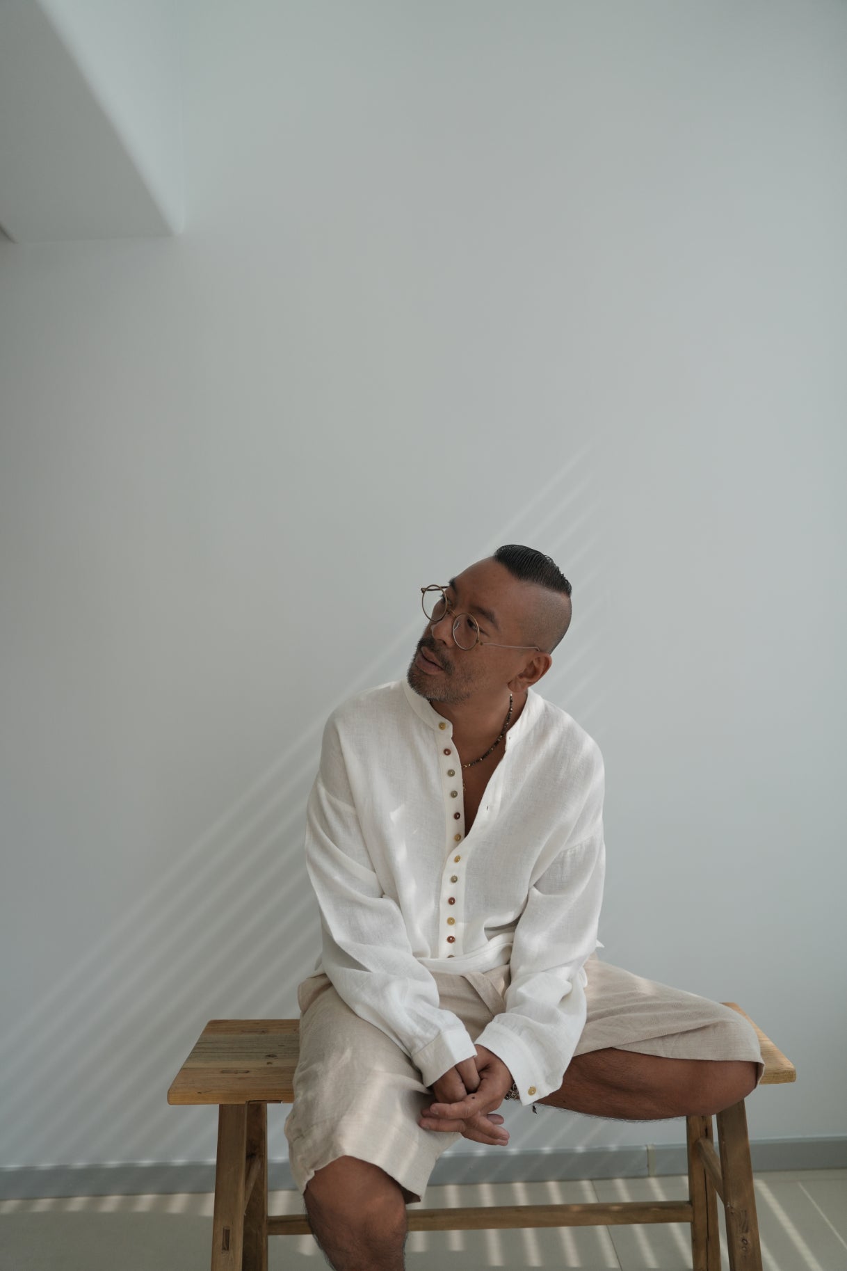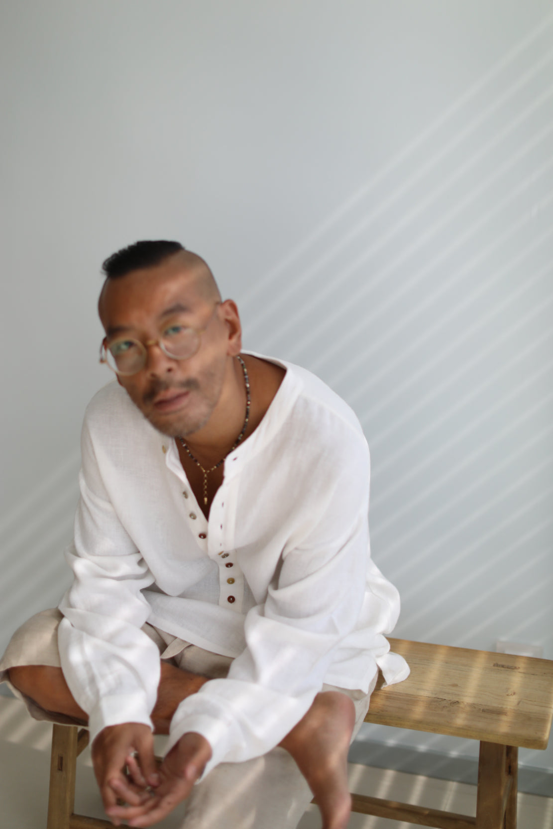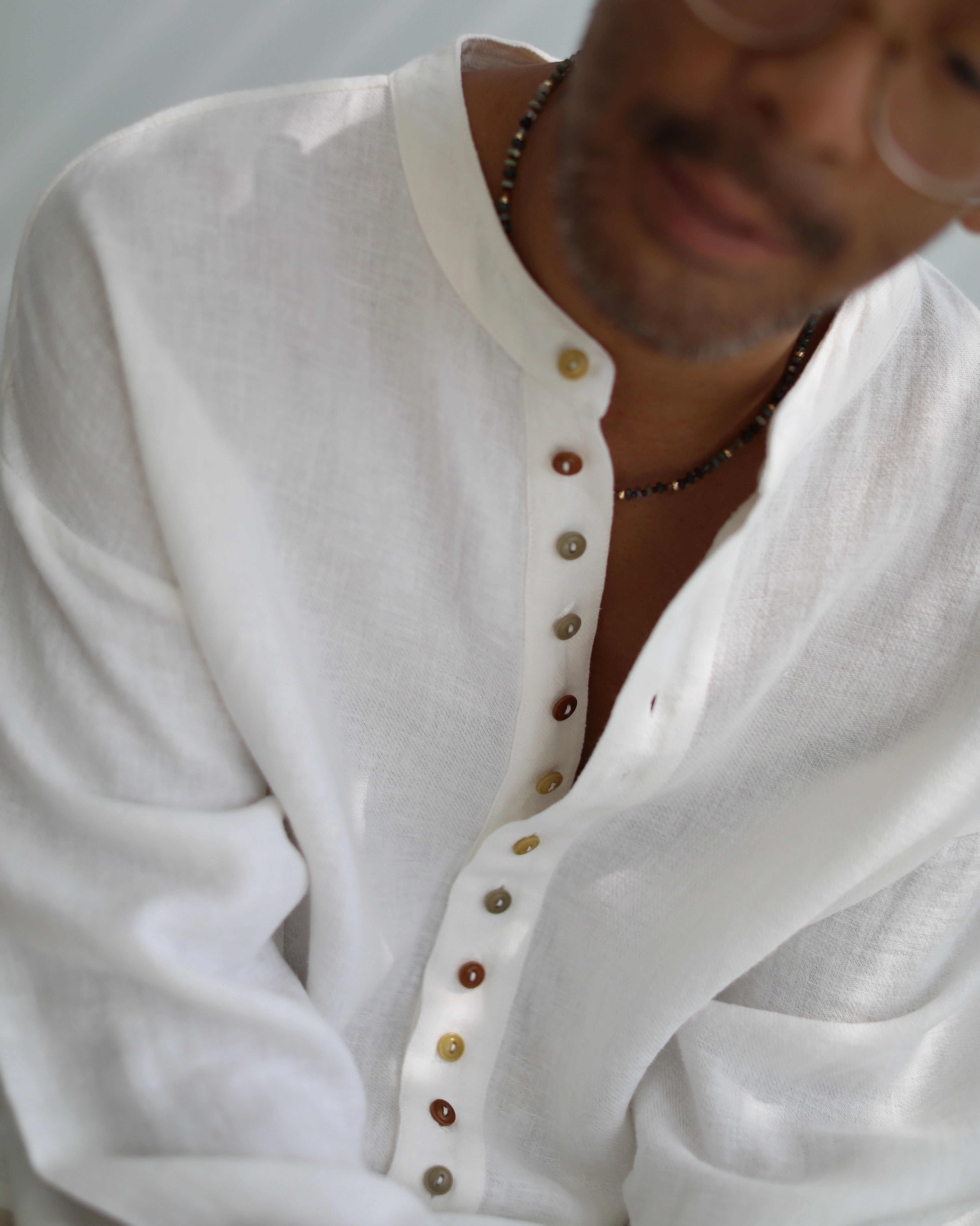 The Franklin Henley is a medium weight ramie linen blend oversized Henley shirt with a natural wrinkled look featuring a dropped shoulder with twelve tricolor corozo (a natural material derived from the seed of a palm tree) buttons at the front.