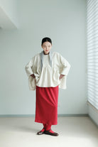 The clean upper bodice flows into a gathered hem, creating a gentle curved silhouette with subtle movement.