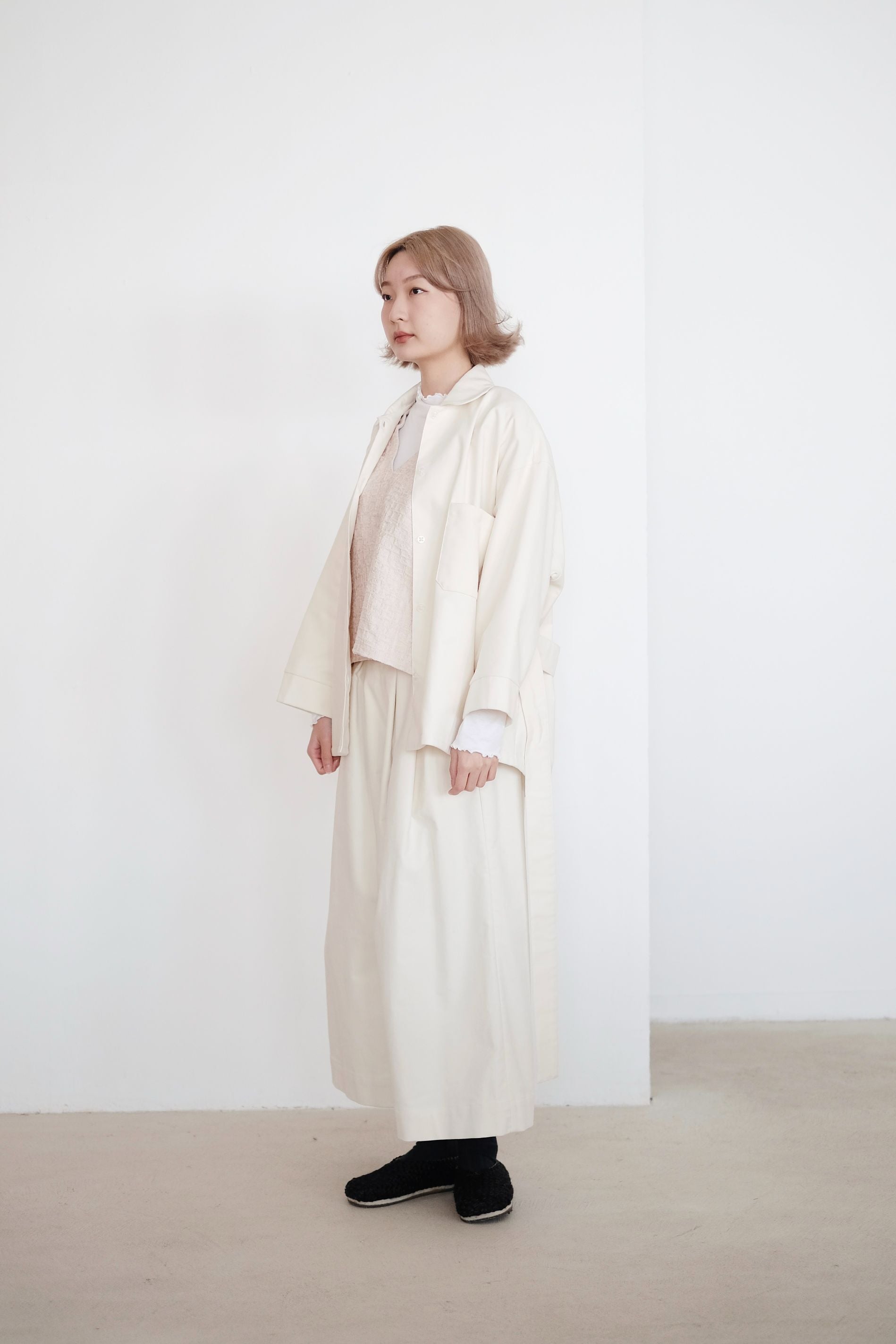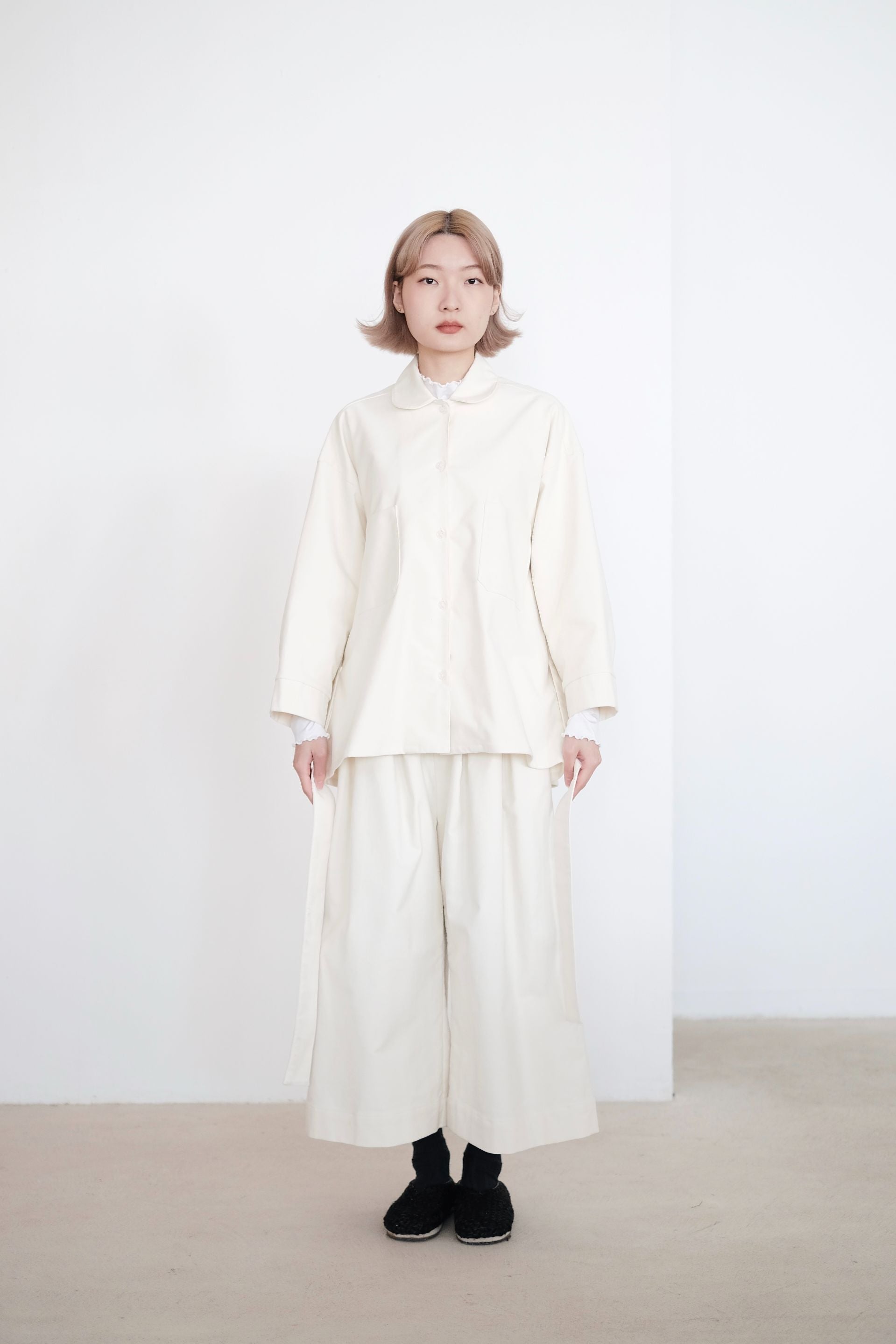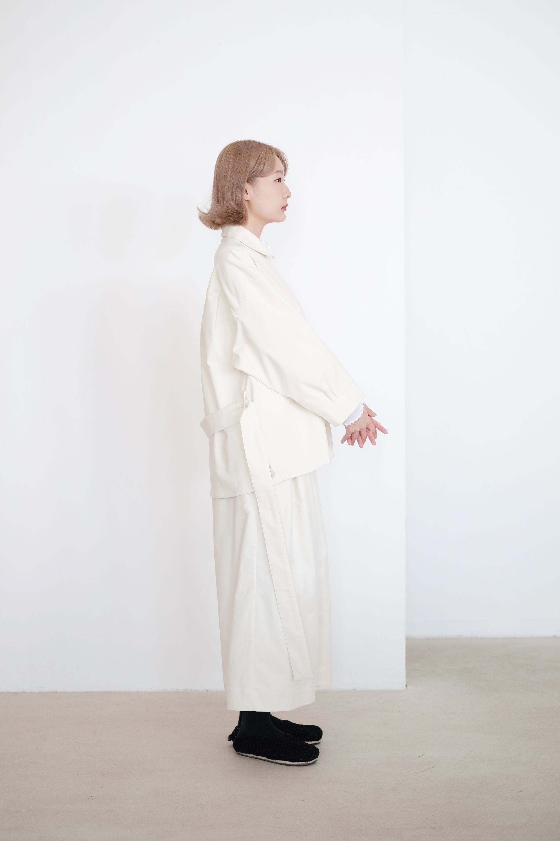 ・Features a belted waist and square pockets on the front