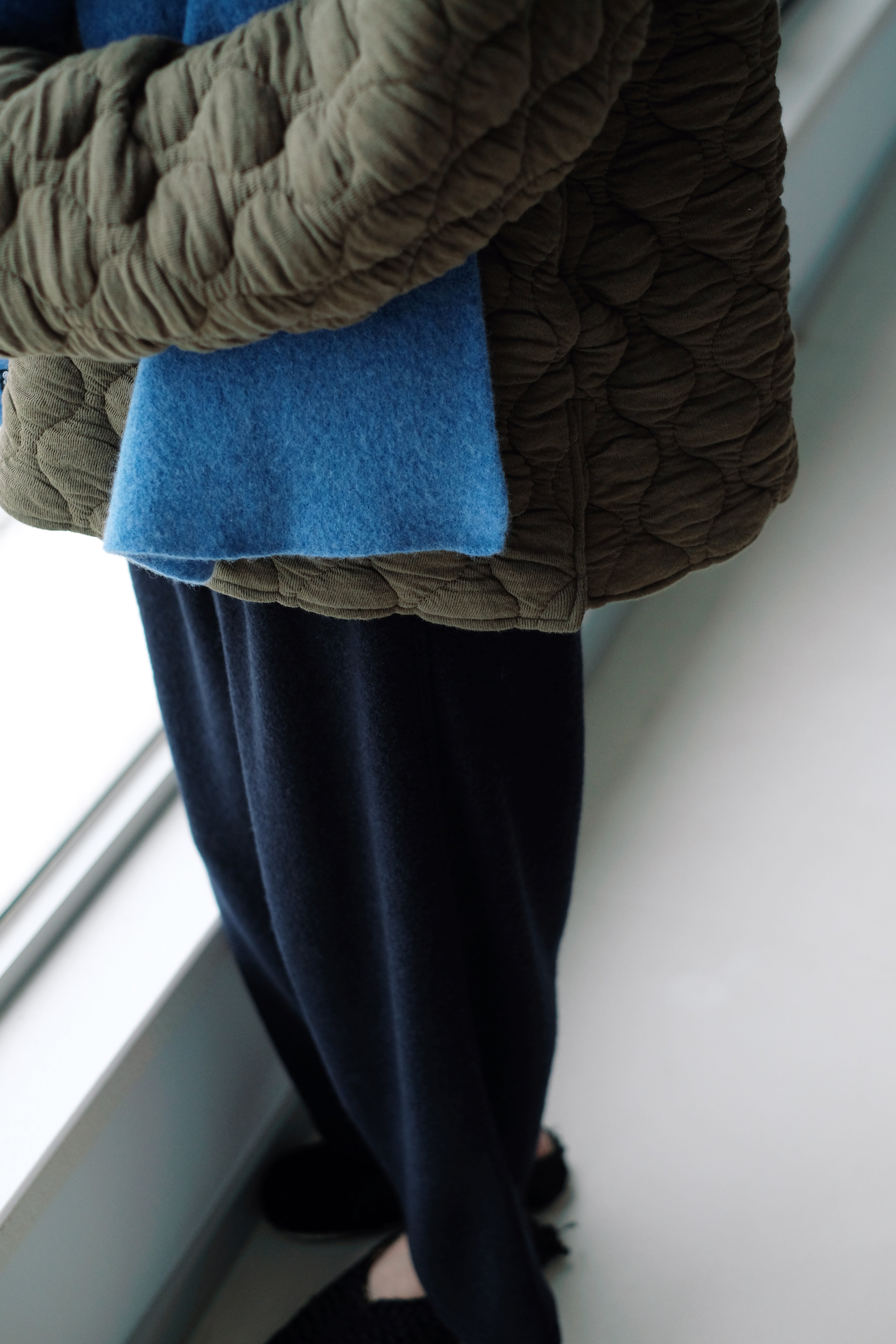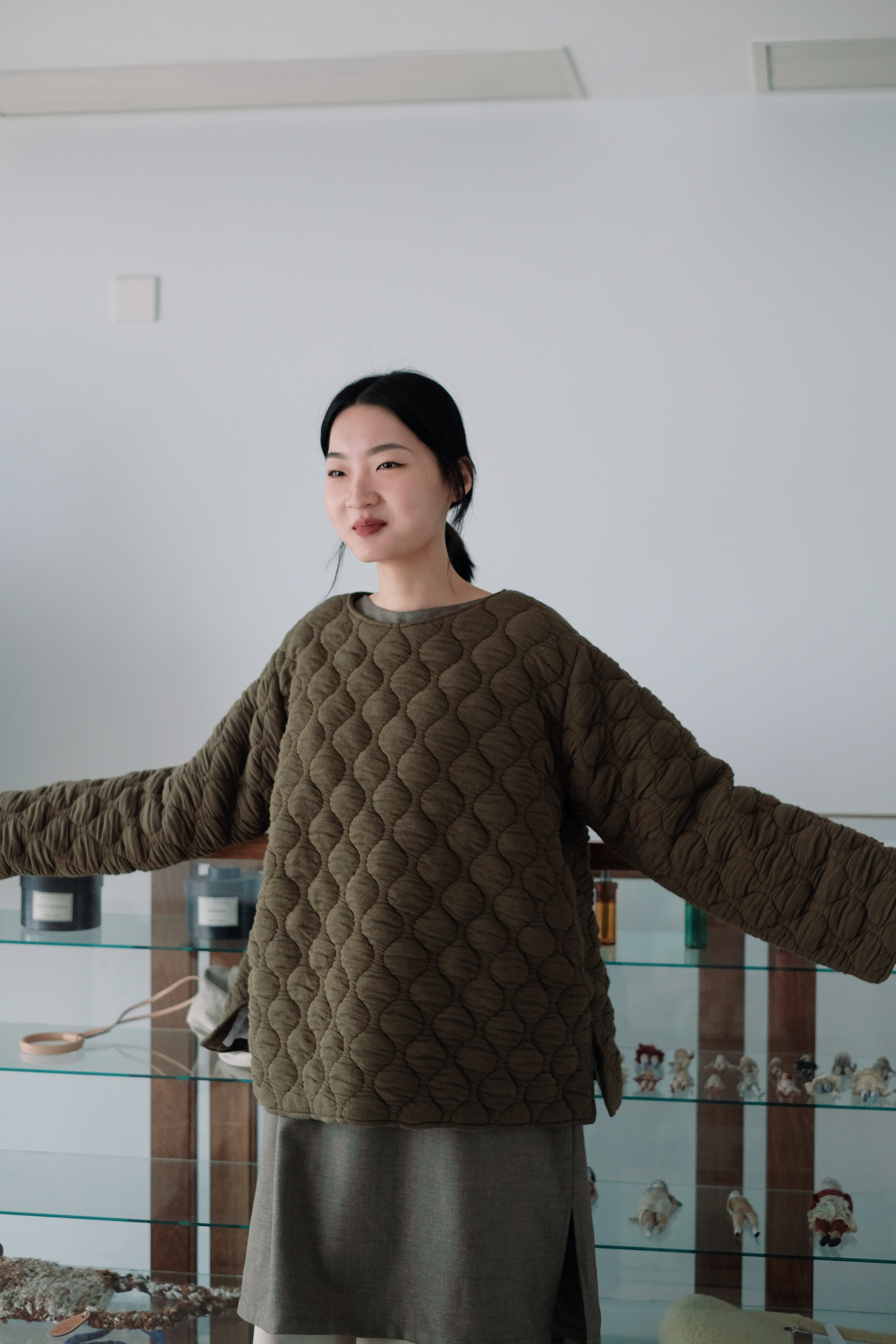 這件夾棉上衣採用溫暖的綠色,帶有獨特的蜂巢式車縫紋路,讓整體造型更顯立體感與層次。柔和而厚實的質感,不僅提供保暖效果,還增添了舒適的包覆感。兩側的小開叉設計增加了細節層次,另外亦有小暗袋,適合秋冬穿搭,輕鬆打造出簡約又不失個性的造型。