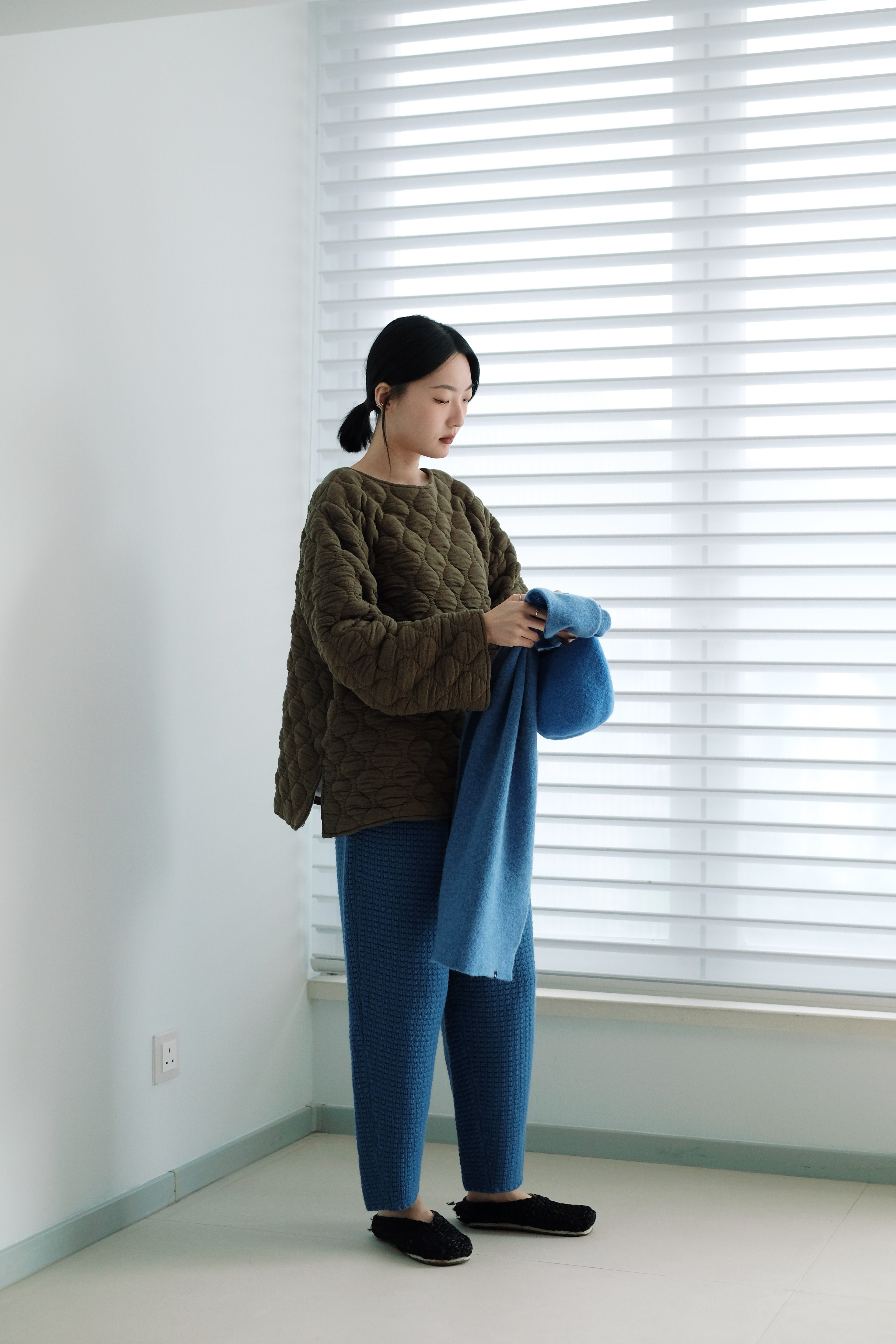 This quilted top in warm green features a unique honeycomb stitching pattern, adding depth and texture to the look. The soft and thick material provides excellent warmth and a comfortable, enveloping feel. The small two side opening detail adds an extra layer of style, making it a perfect choice for autumn and winter outfits, easily creating a simple yet distinctive look.