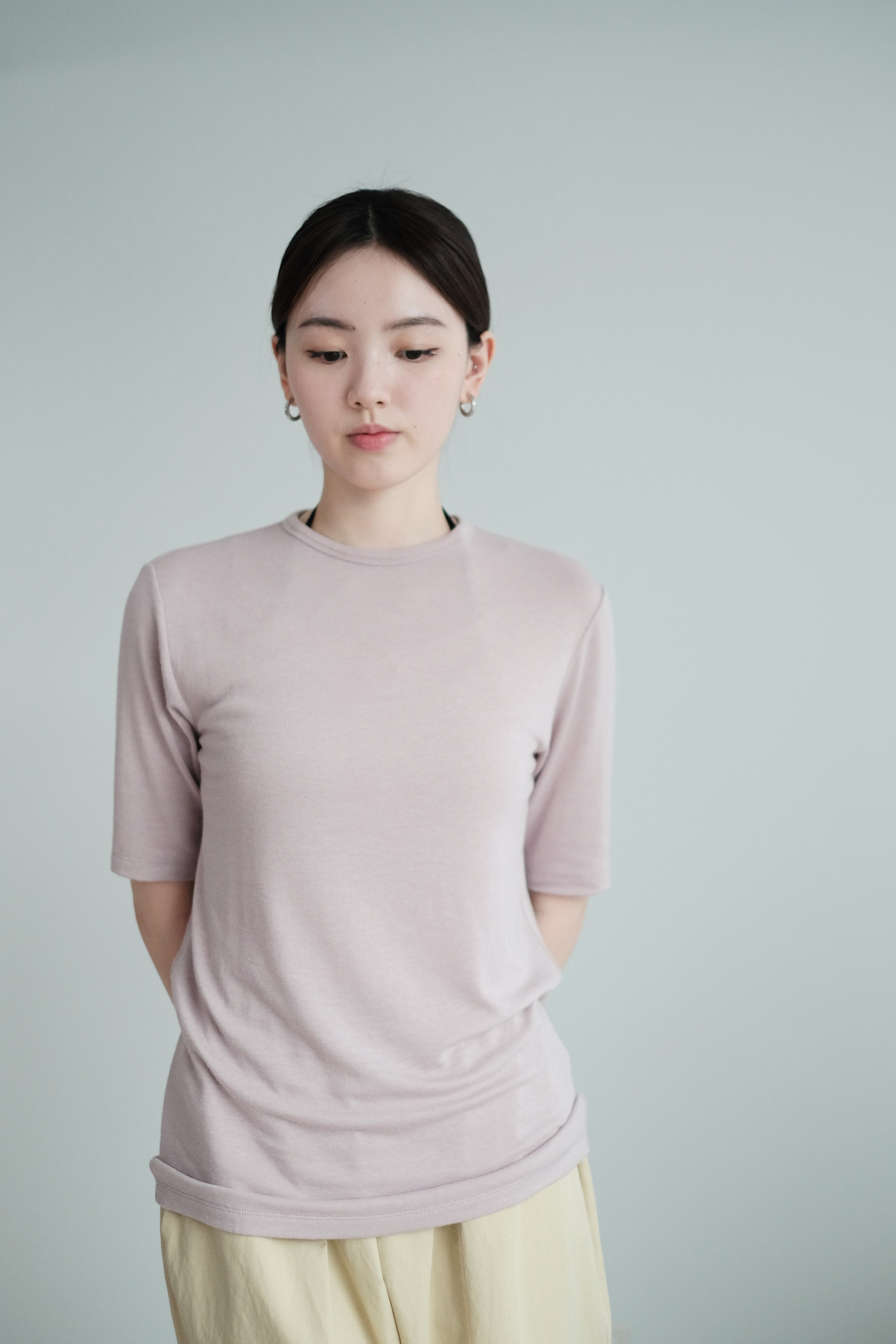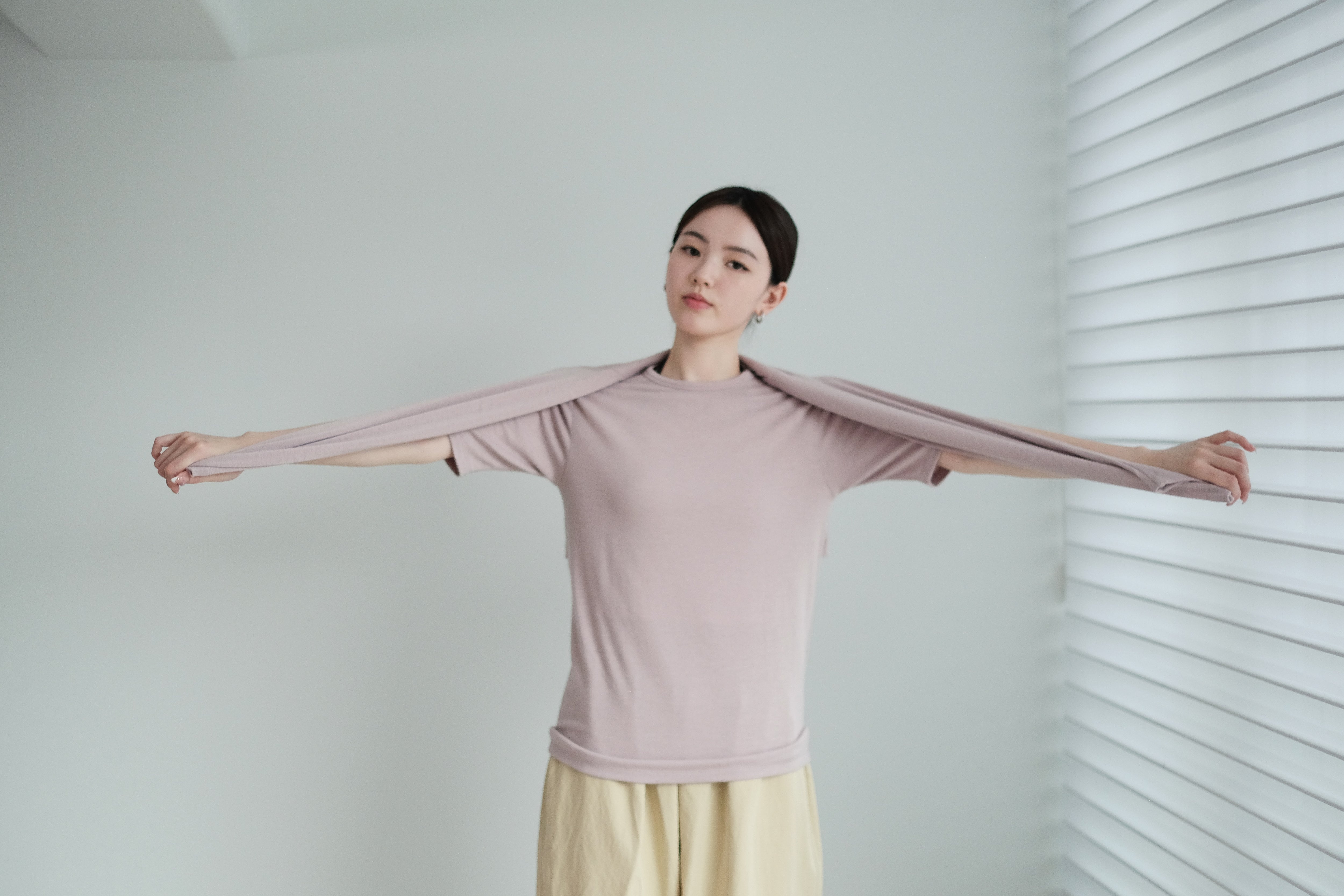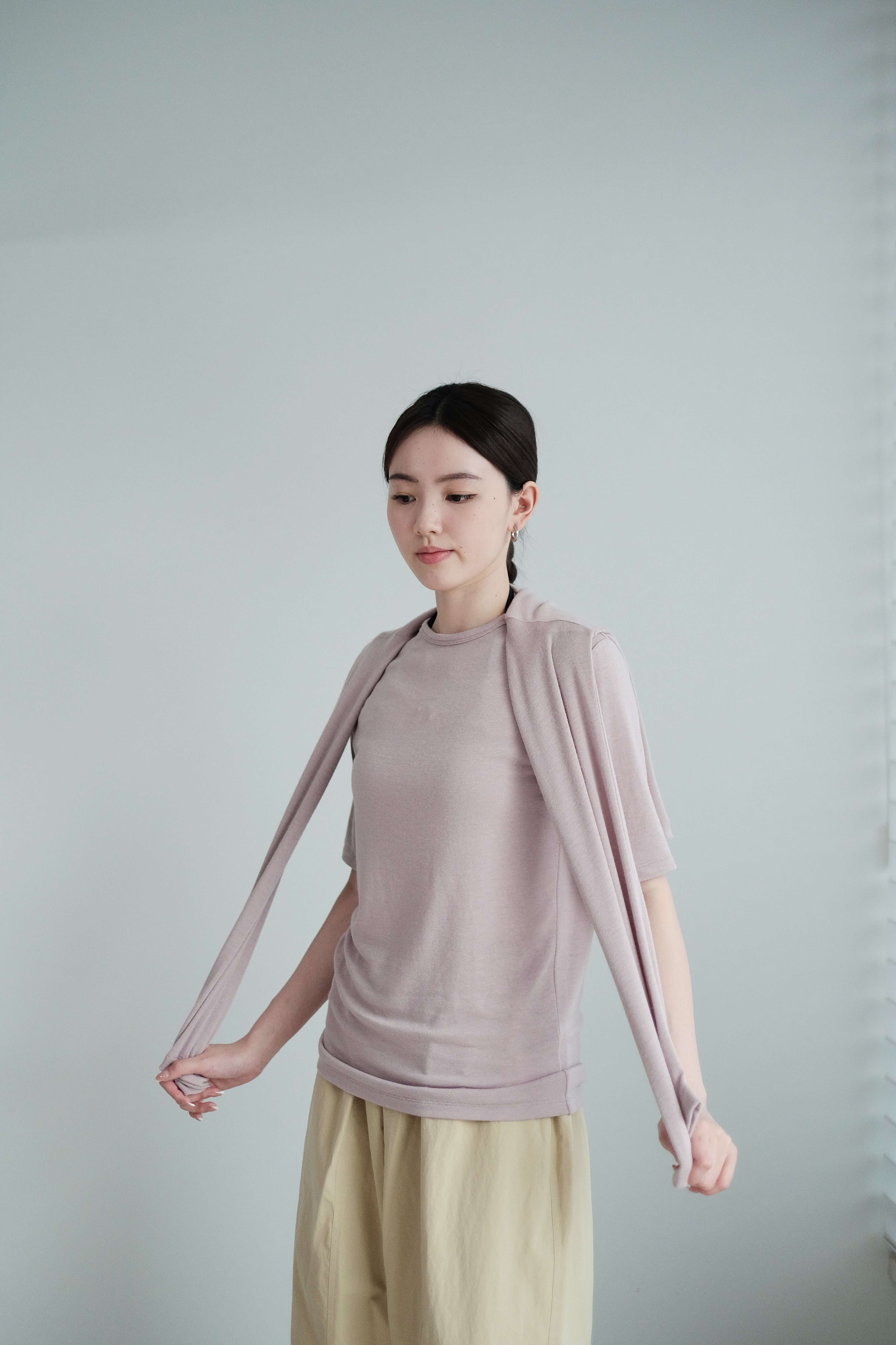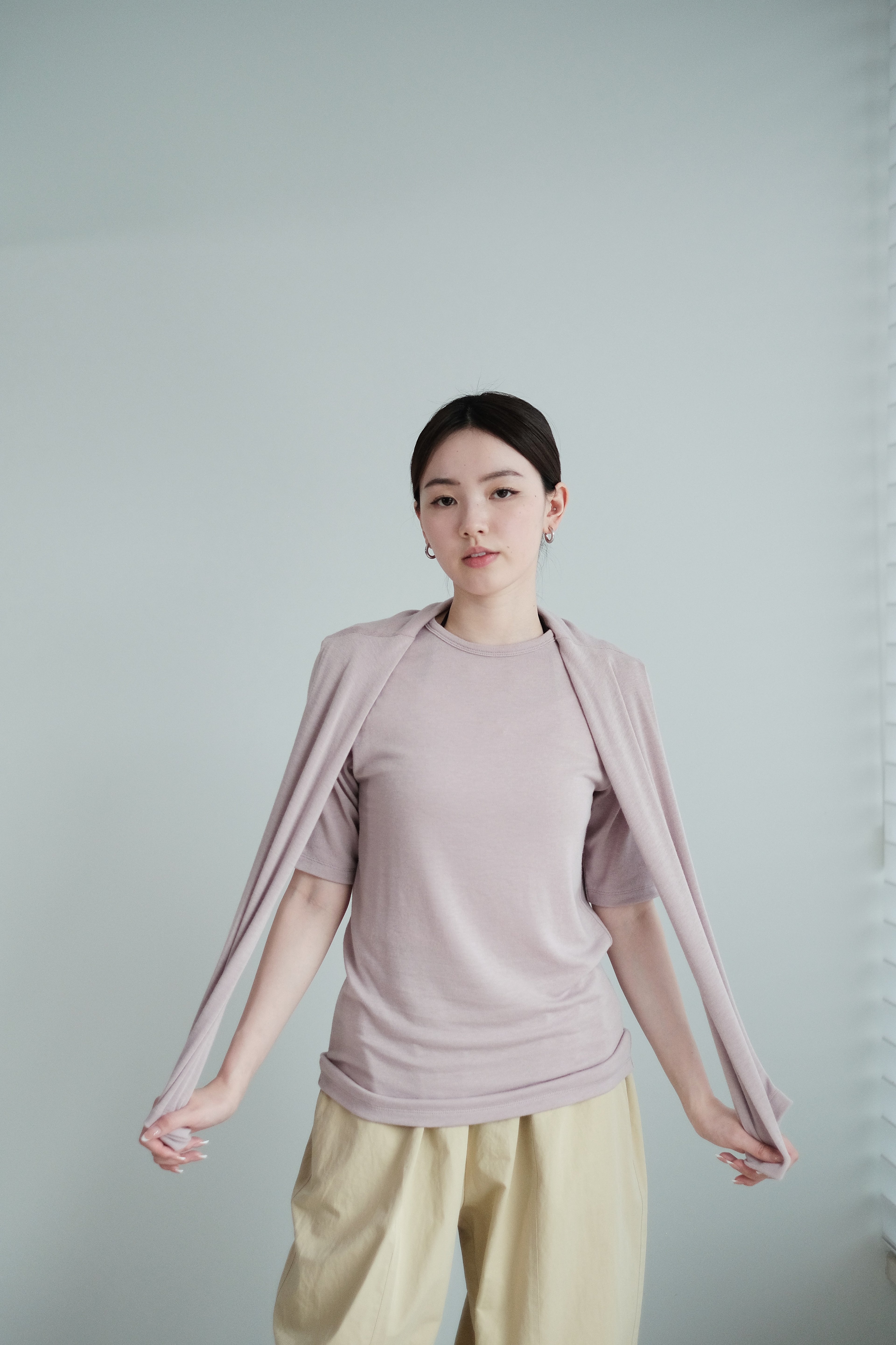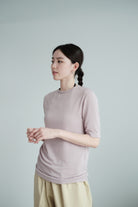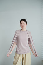 這是一件質地絲滑柔軟的上衣,以Rayon混合Spandex製成,舒適貼身但不束縛。微微帶光澤的布料讓整體更顯質感,穿起來既涼爽又顯瘦,特別適合夏天單穿,或當作打底層次搭配。袖長恰好遮住手臂線條,配搭闊腿褲或A-line裙都能營造俐落感。