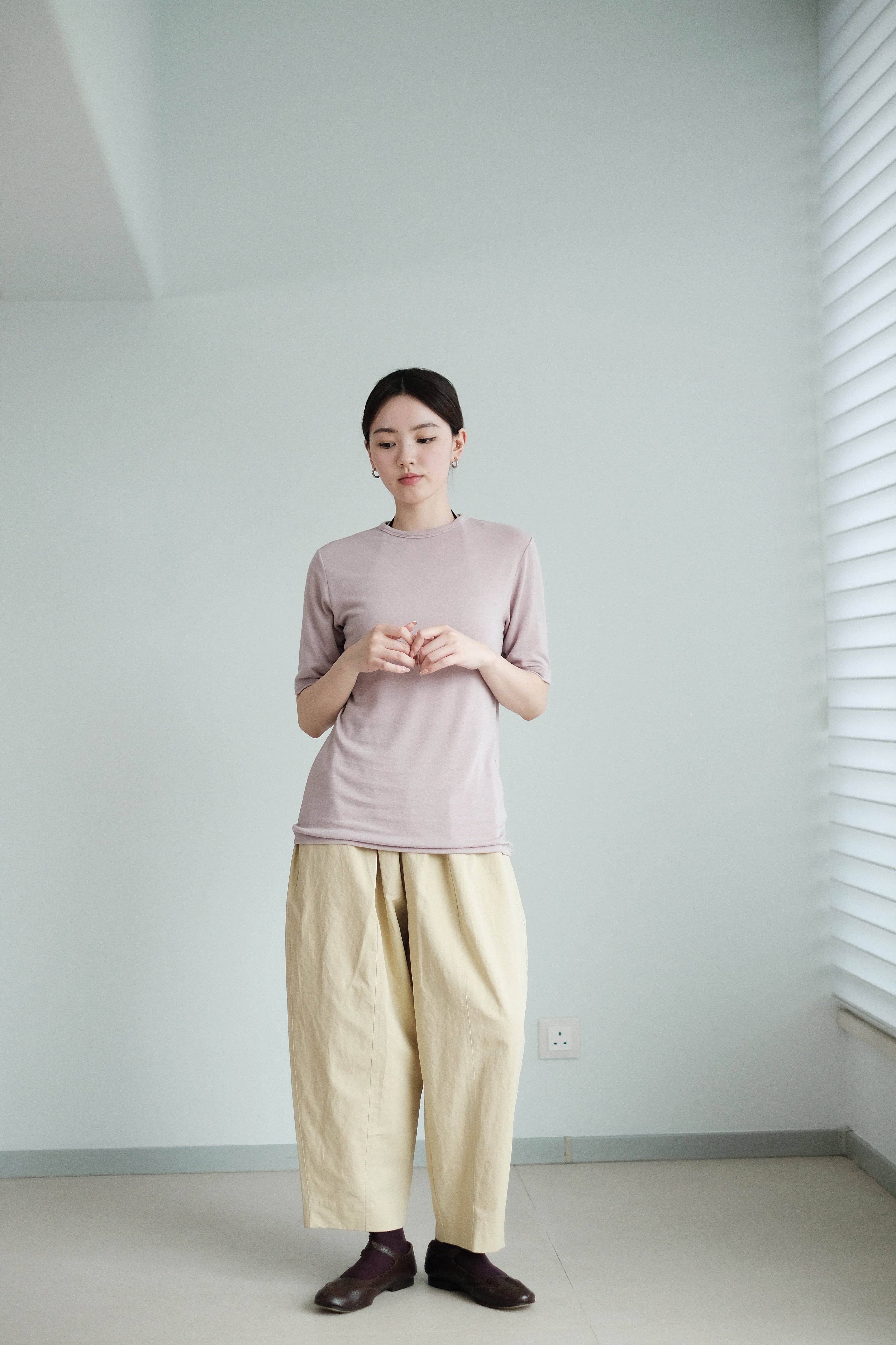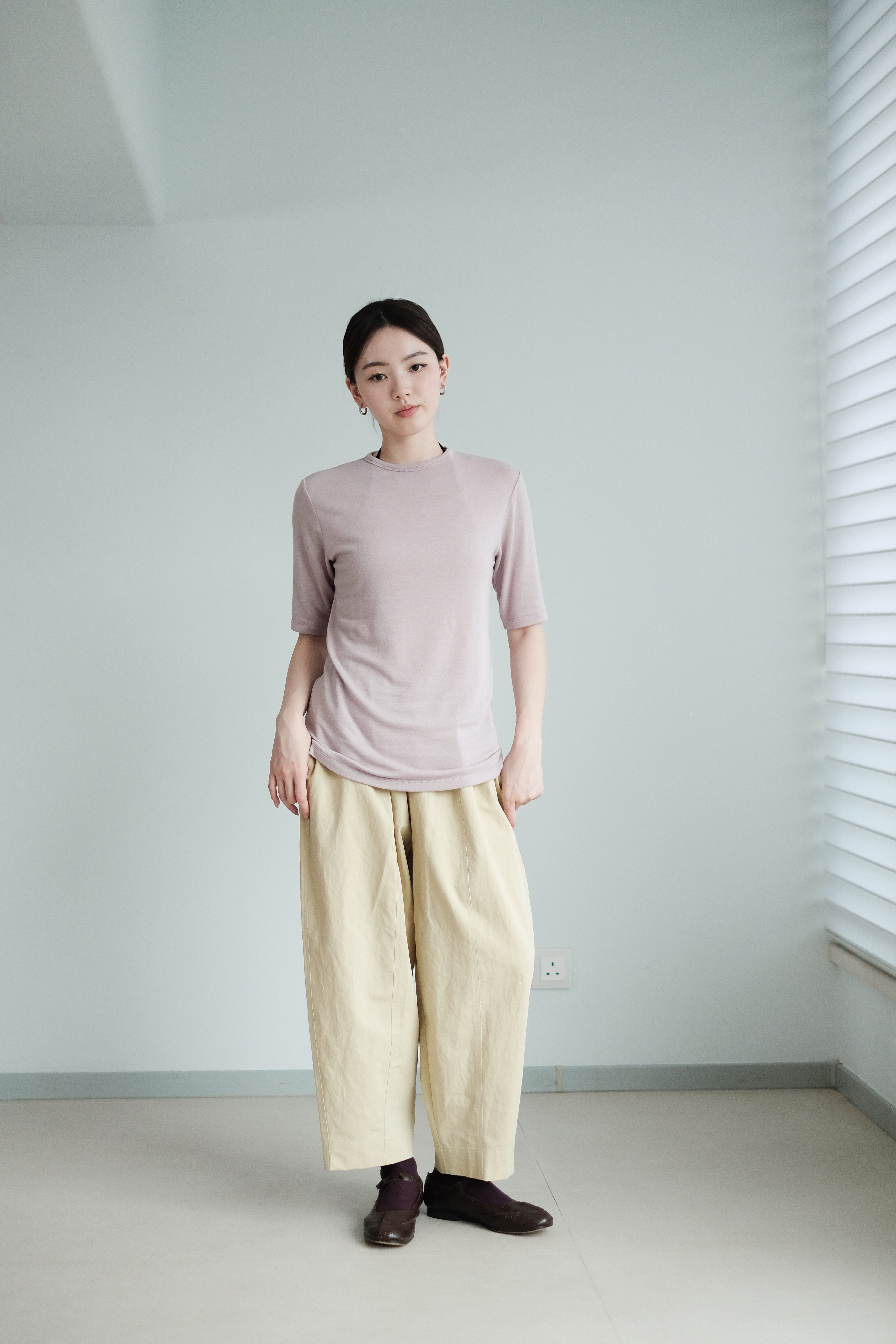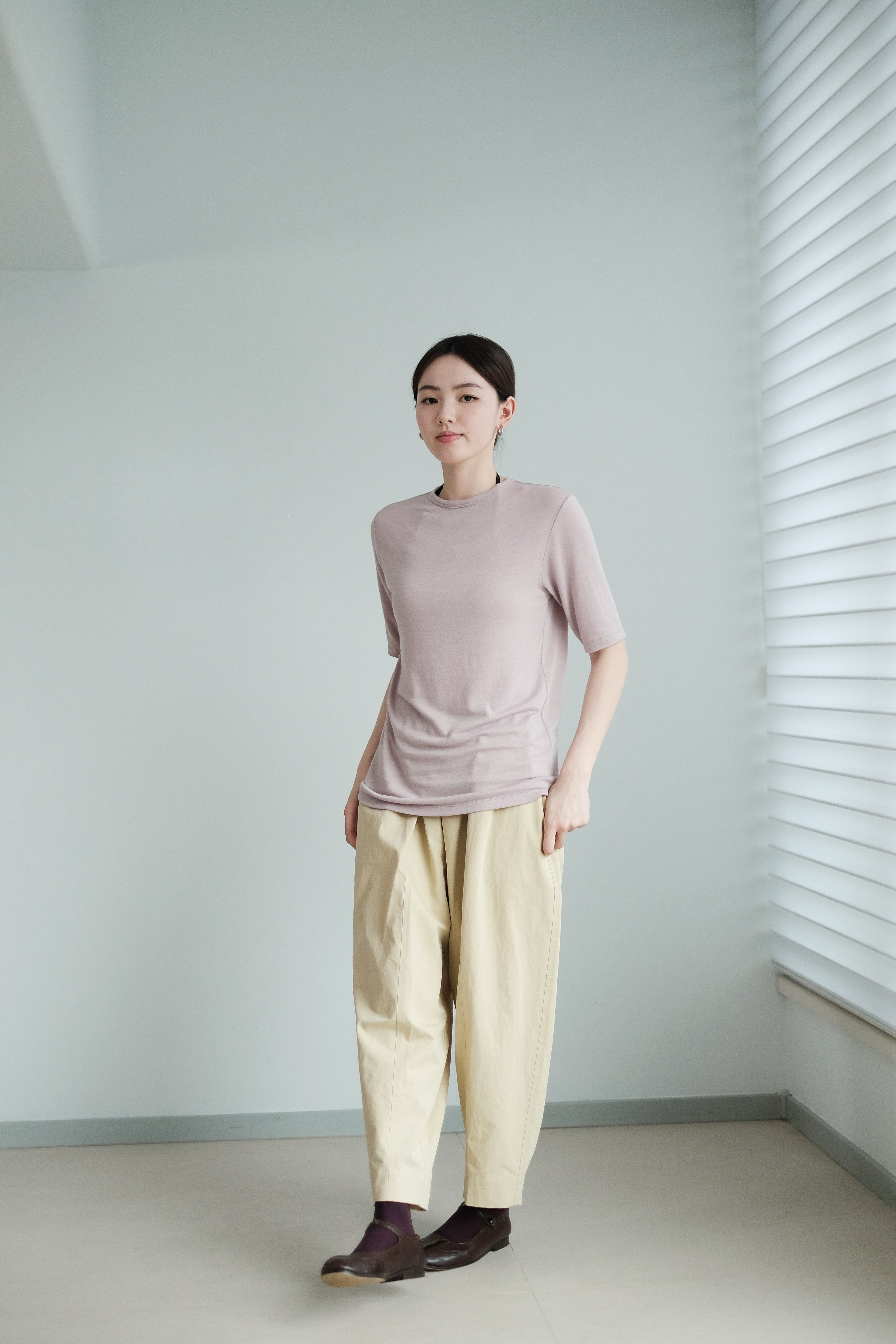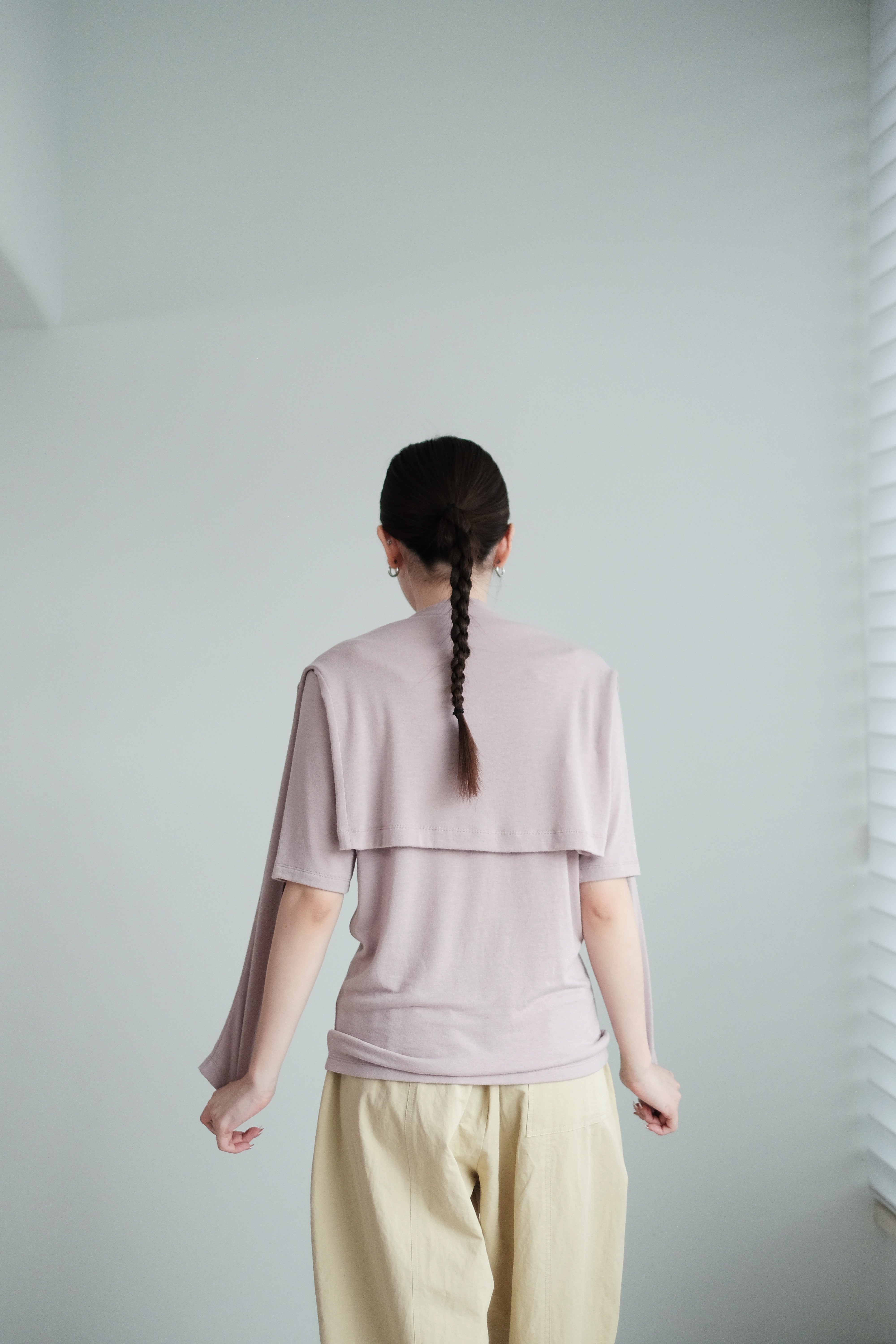 這是一件質地絲滑柔軟的上衣,以Rayon混合Spandex製成,舒適貼身但不束縛。微微帶光澤的布料讓整體更顯質感,穿起來既涼爽又顯瘦,特別適合夏天單穿,或當作打底層次搭配。袖長恰好遮住手臂線條,配搭闊腿褲或A-line裙都能營造俐落感。