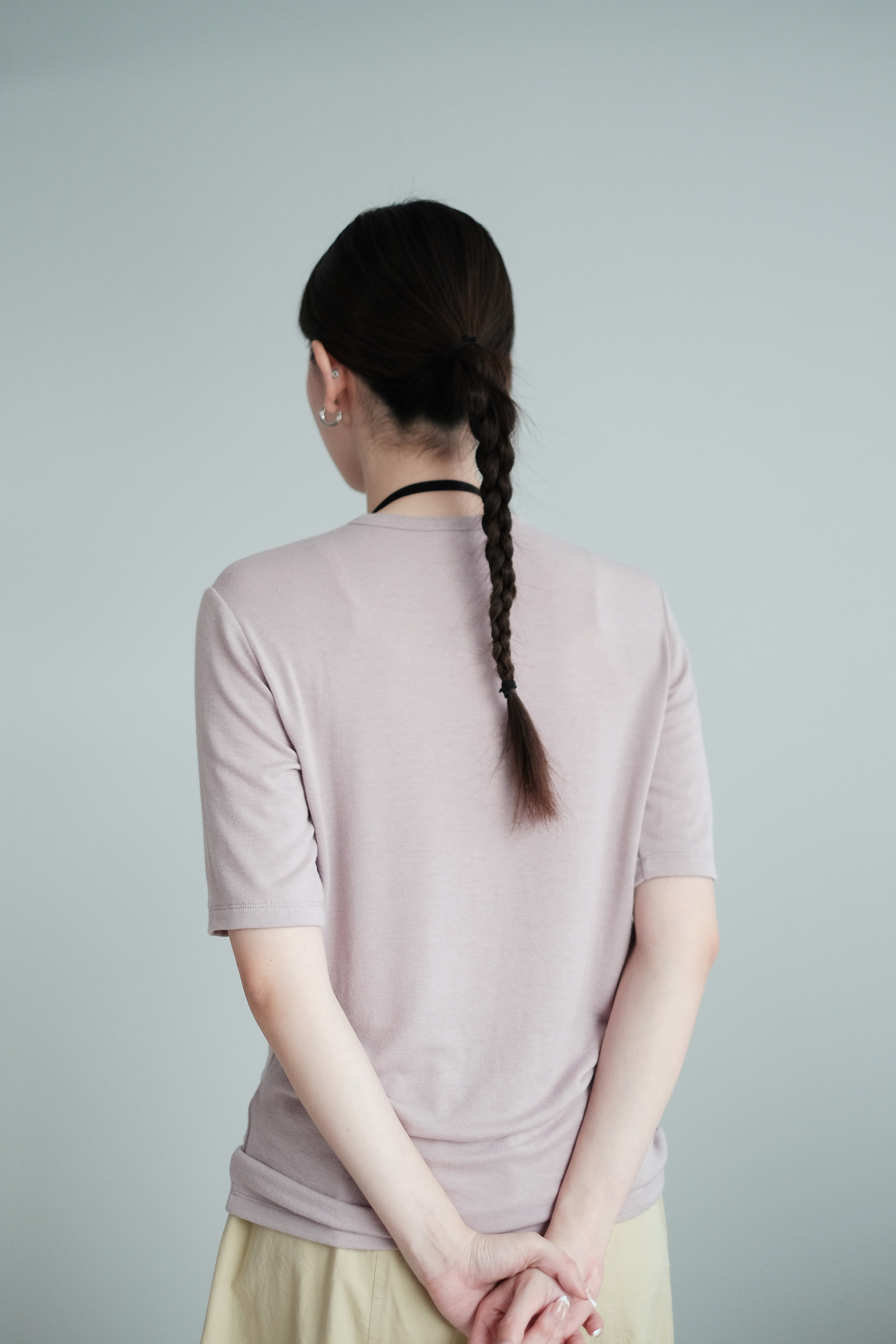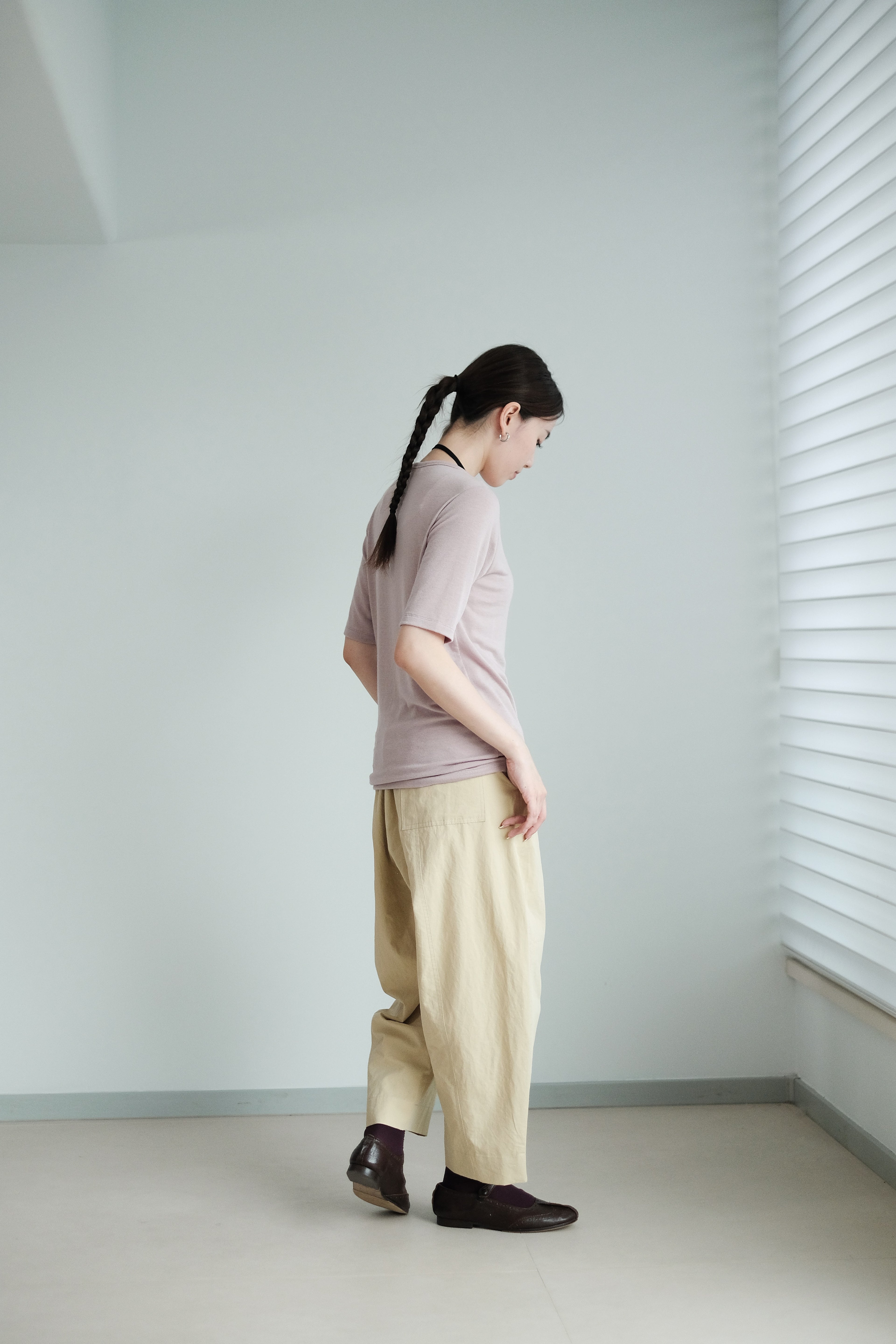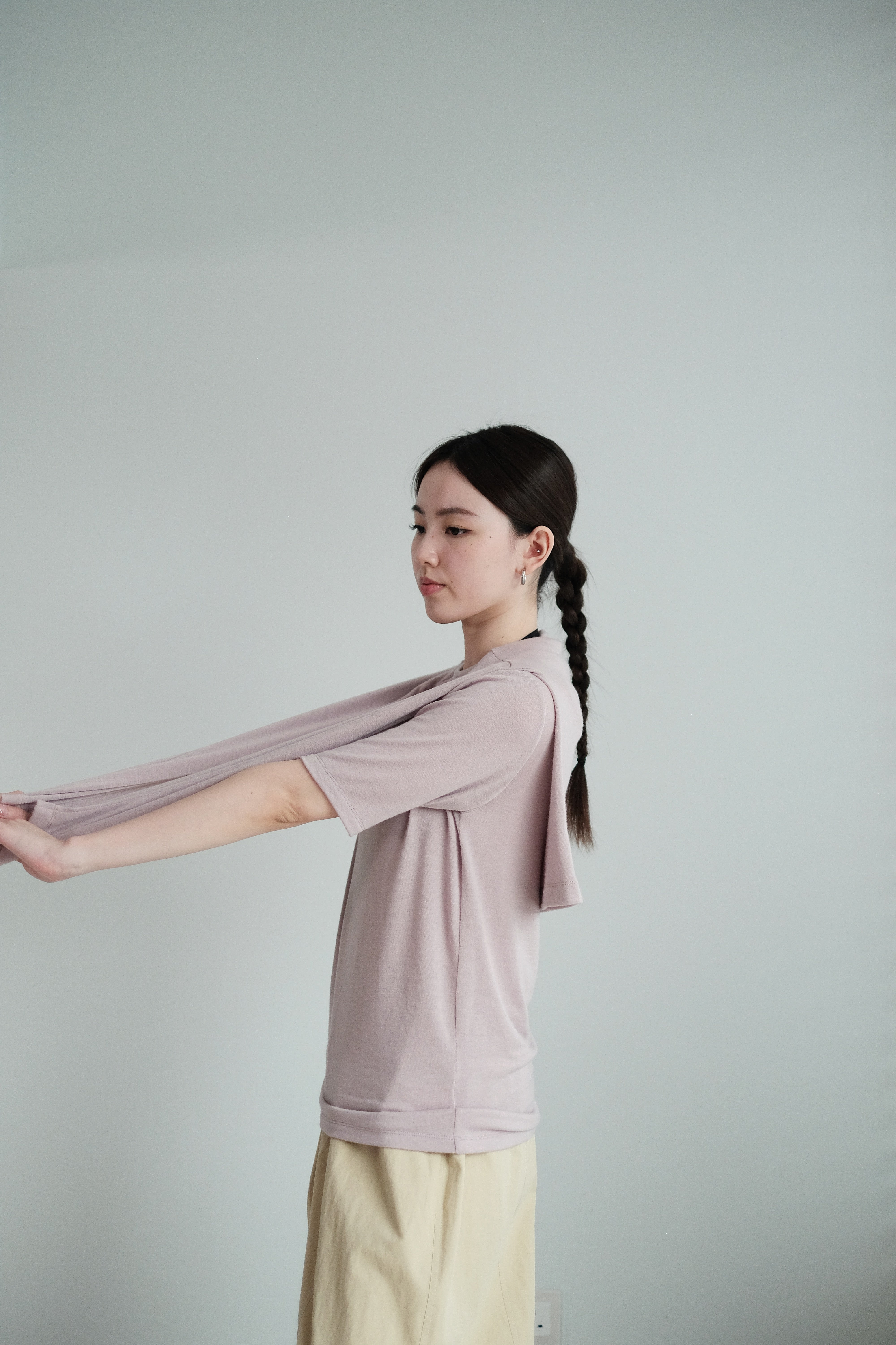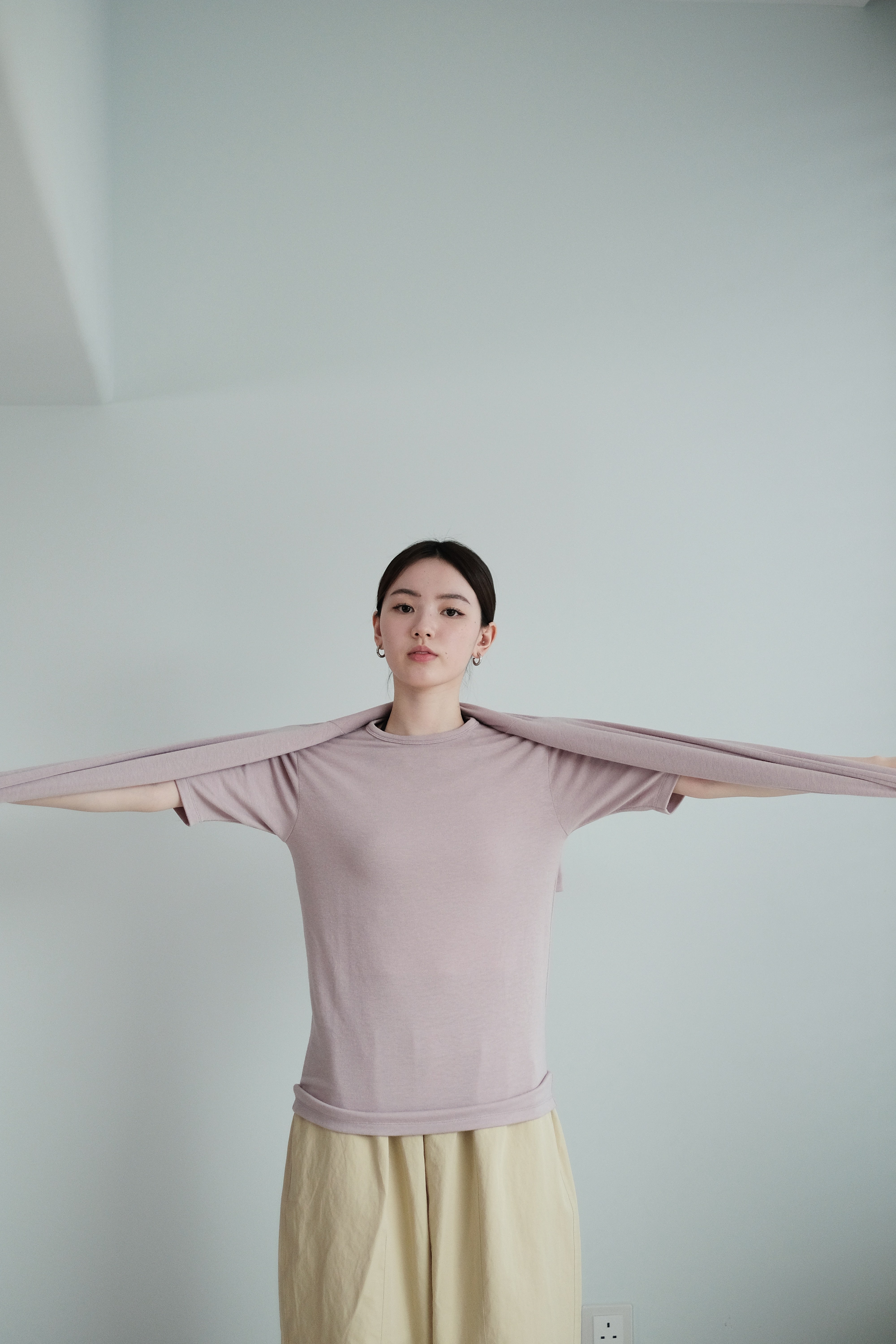 這是一件質地絲滑柔軟的上衣,以Rayon混合Spandex製成,舒適貼身但不束縛。微微帶光澤的布料讓整體更顯質感,穿起來既涼爽又顯瘦,特別適合夏天單穿,或當作打底層次搭配。袖長恰好遮住手臂線條,配搭闊腿褲或A-line裙都能營造俐落感。