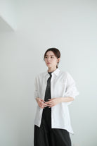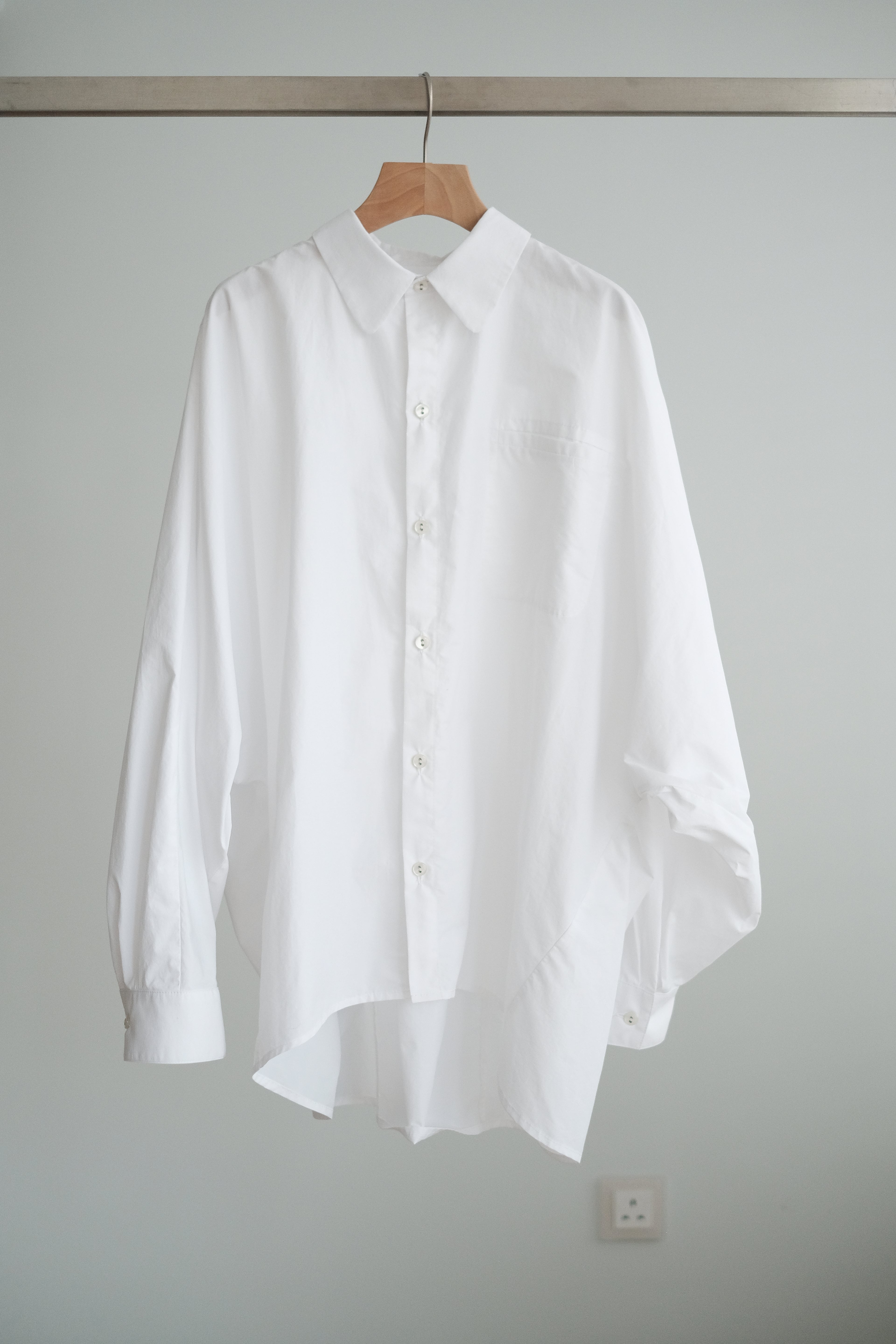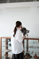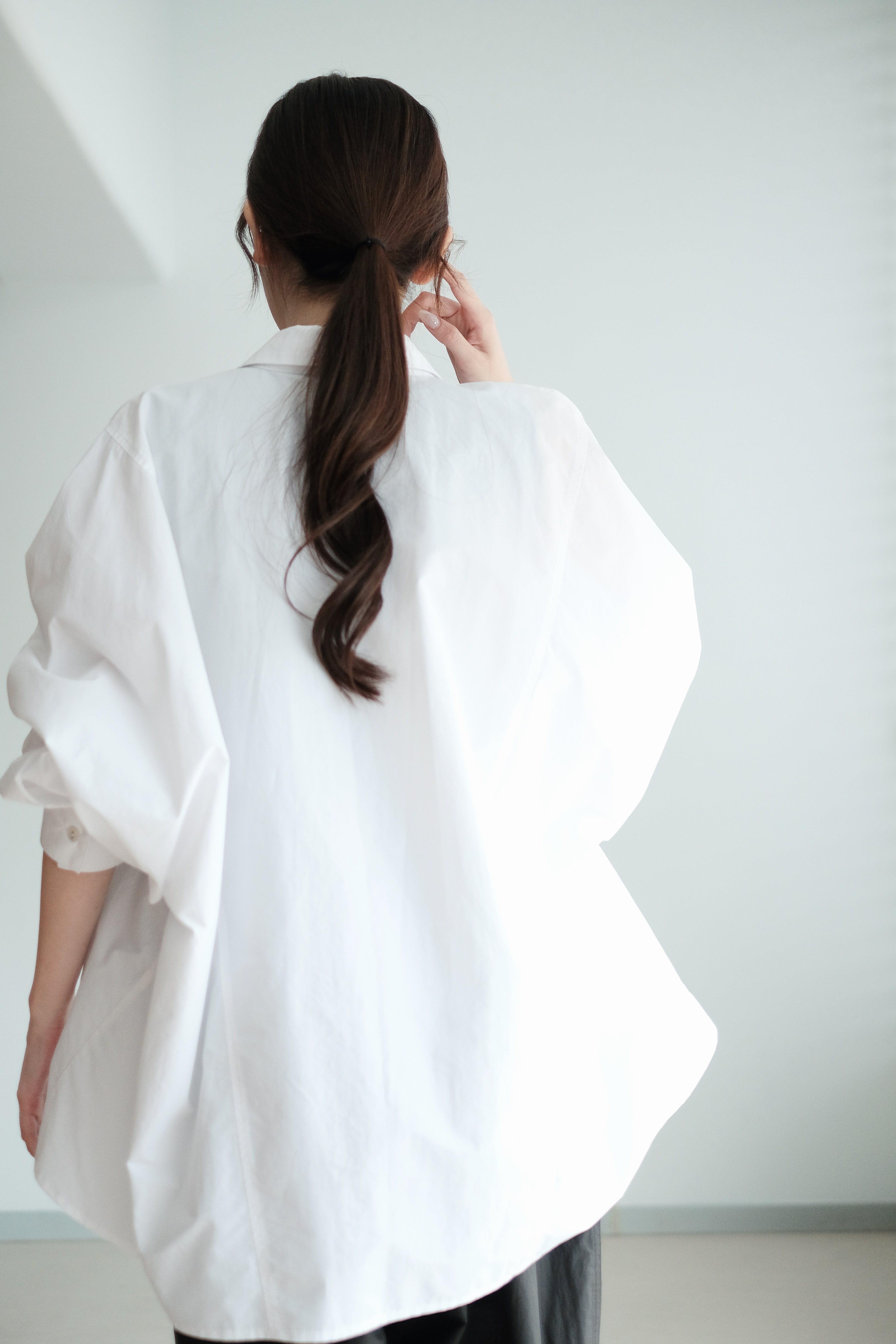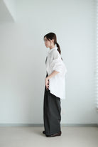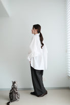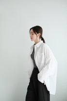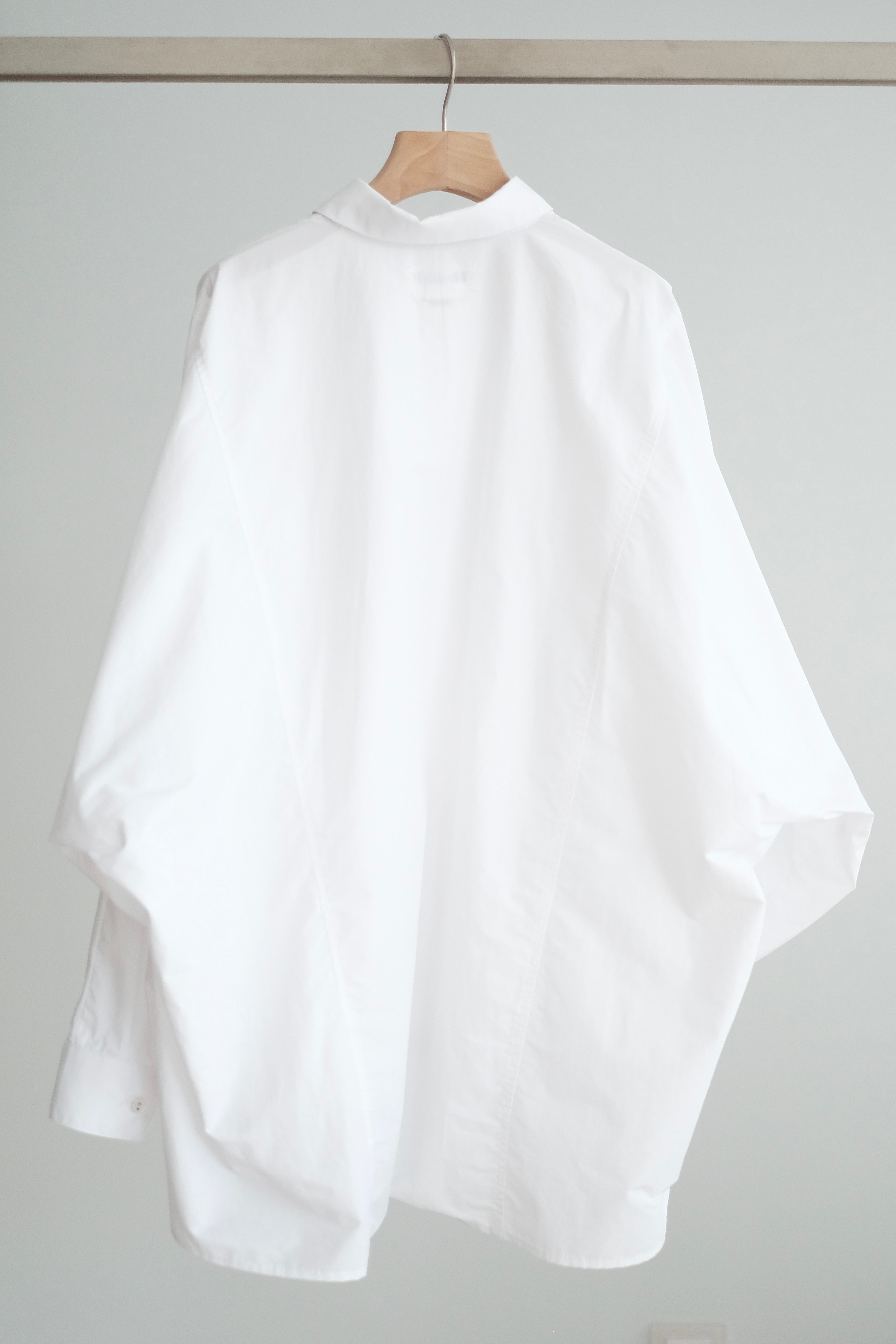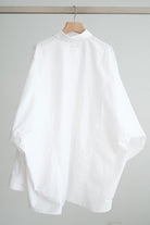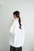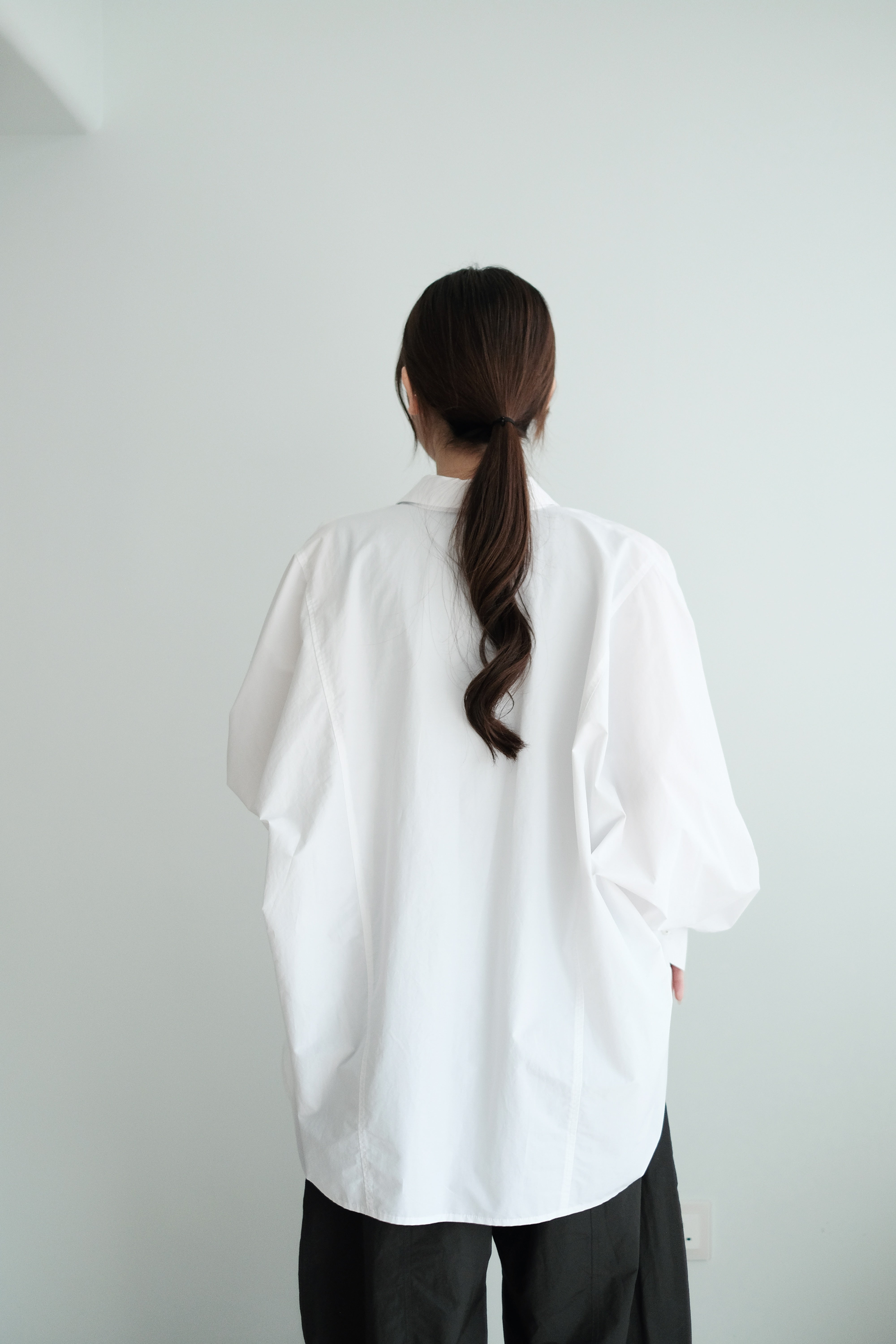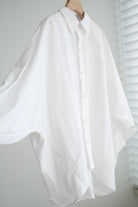 This white shirt features a batwing cut with extra room at the underarms, creating a voluminous and airy silhouette. Made from crisp 100% cotton, the back is shaped with panel seams for added structure, while the pleated cuffs enhance its dimensional form. Designed with a generous oversized fit — it’s roomy enough to be boyfriend-shared, yet still holds a clean and refined outline.