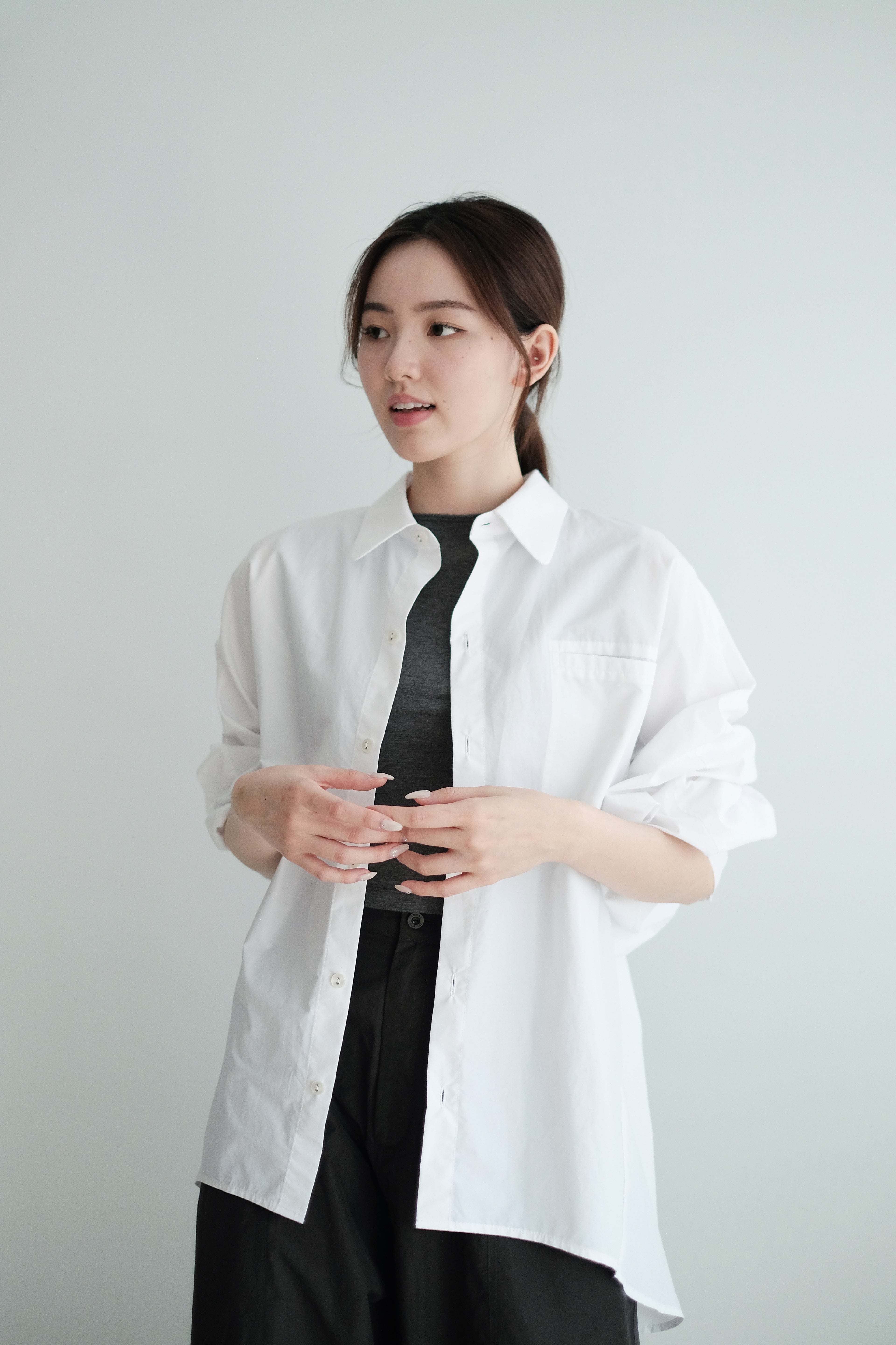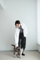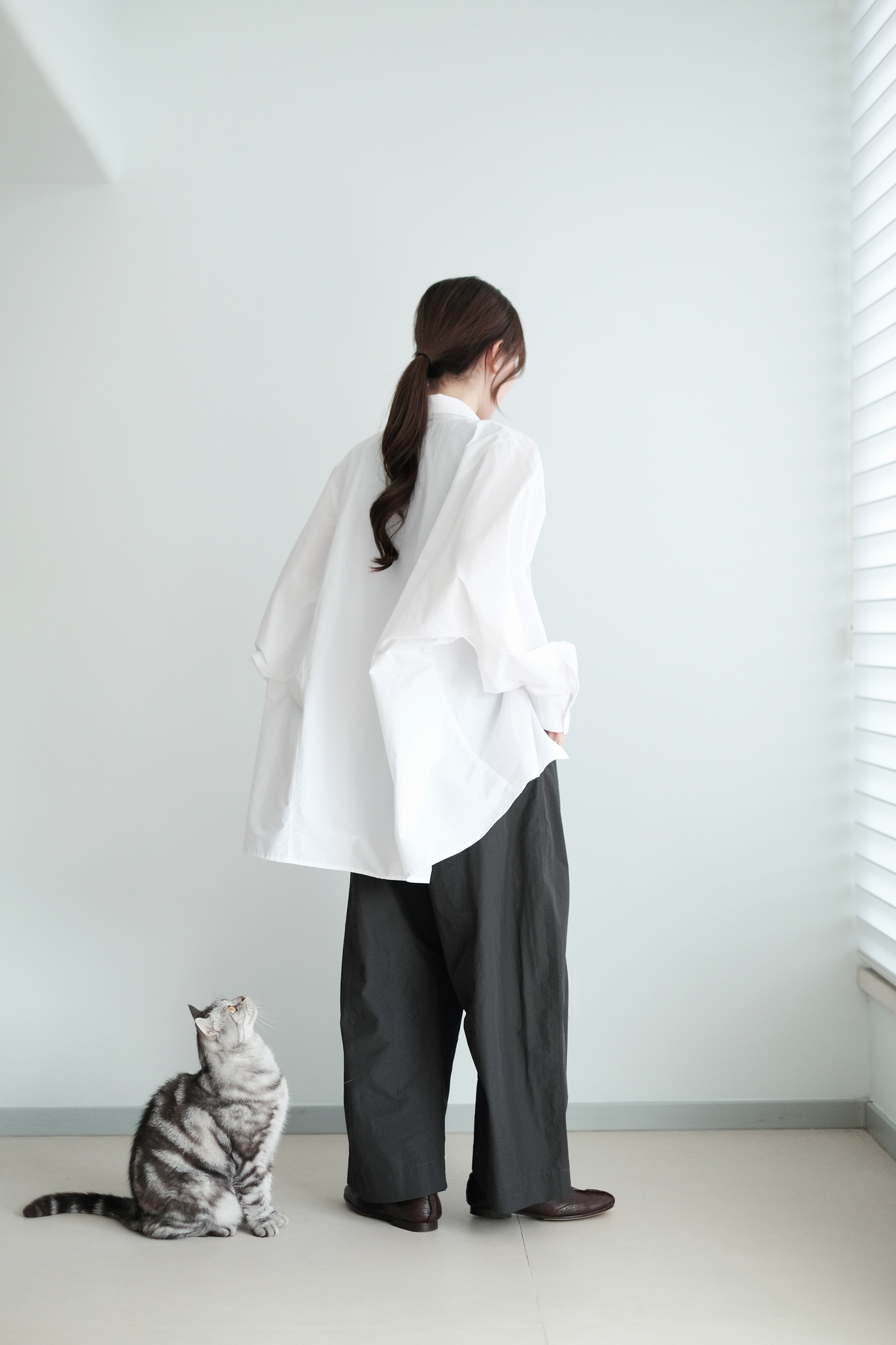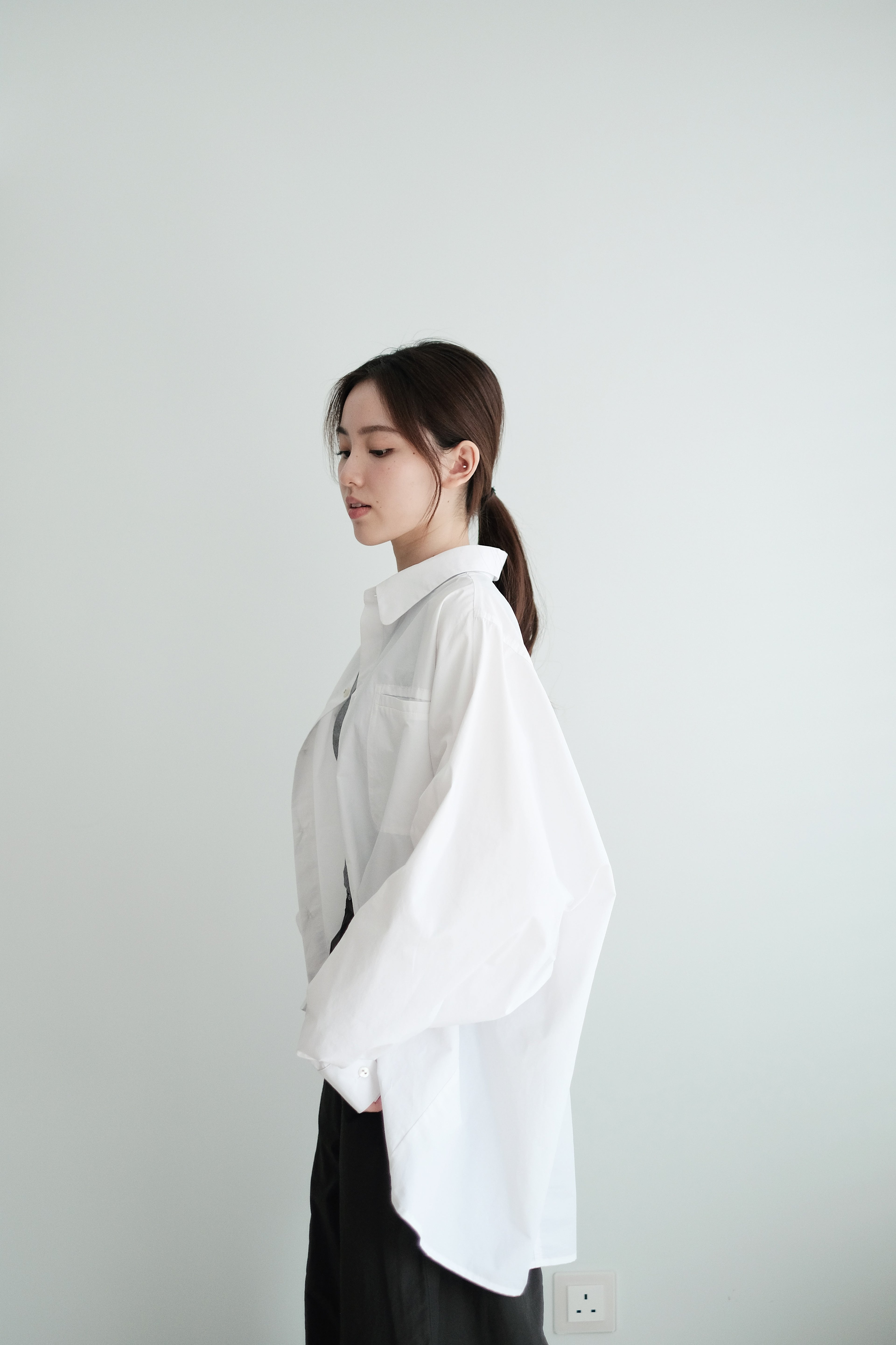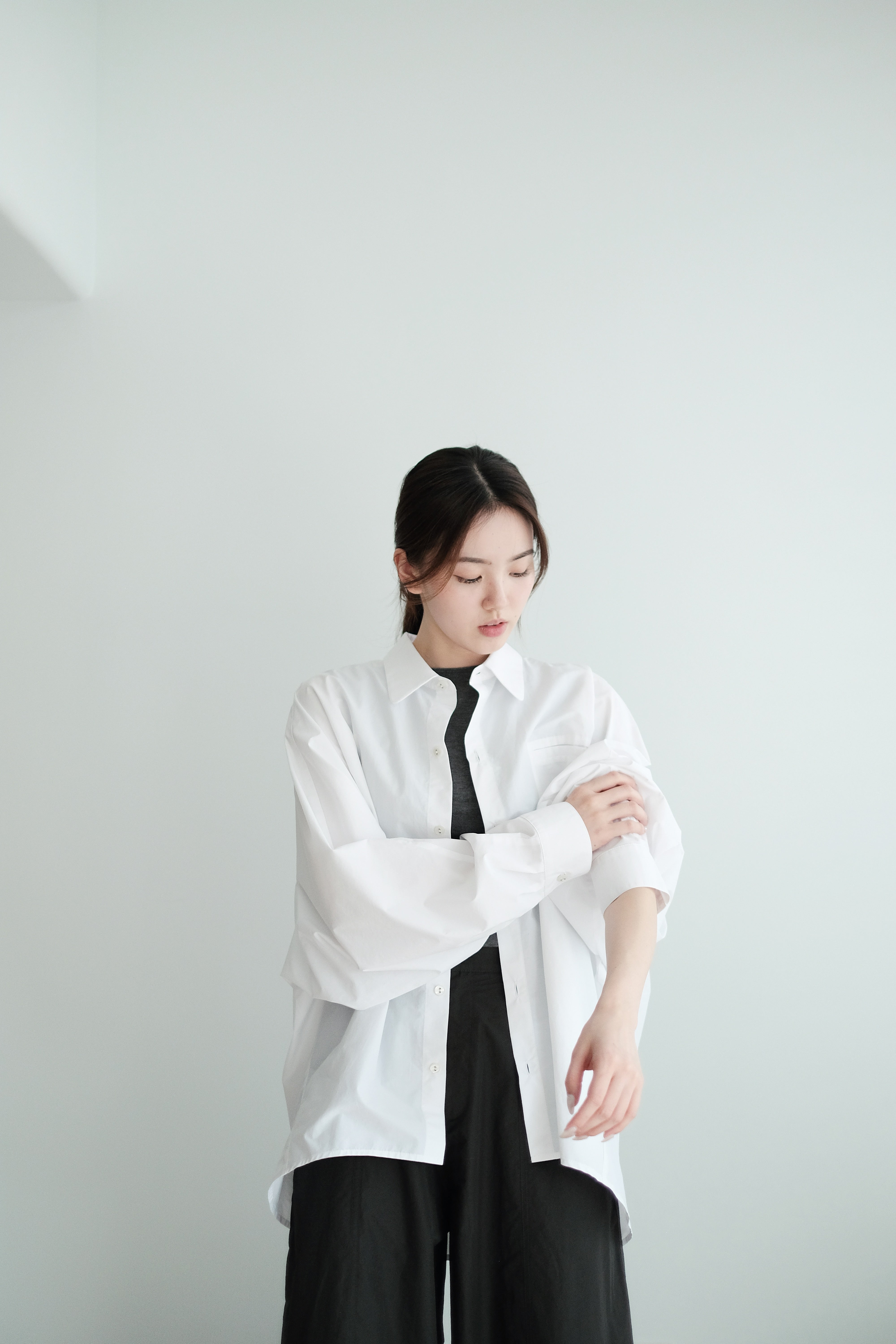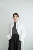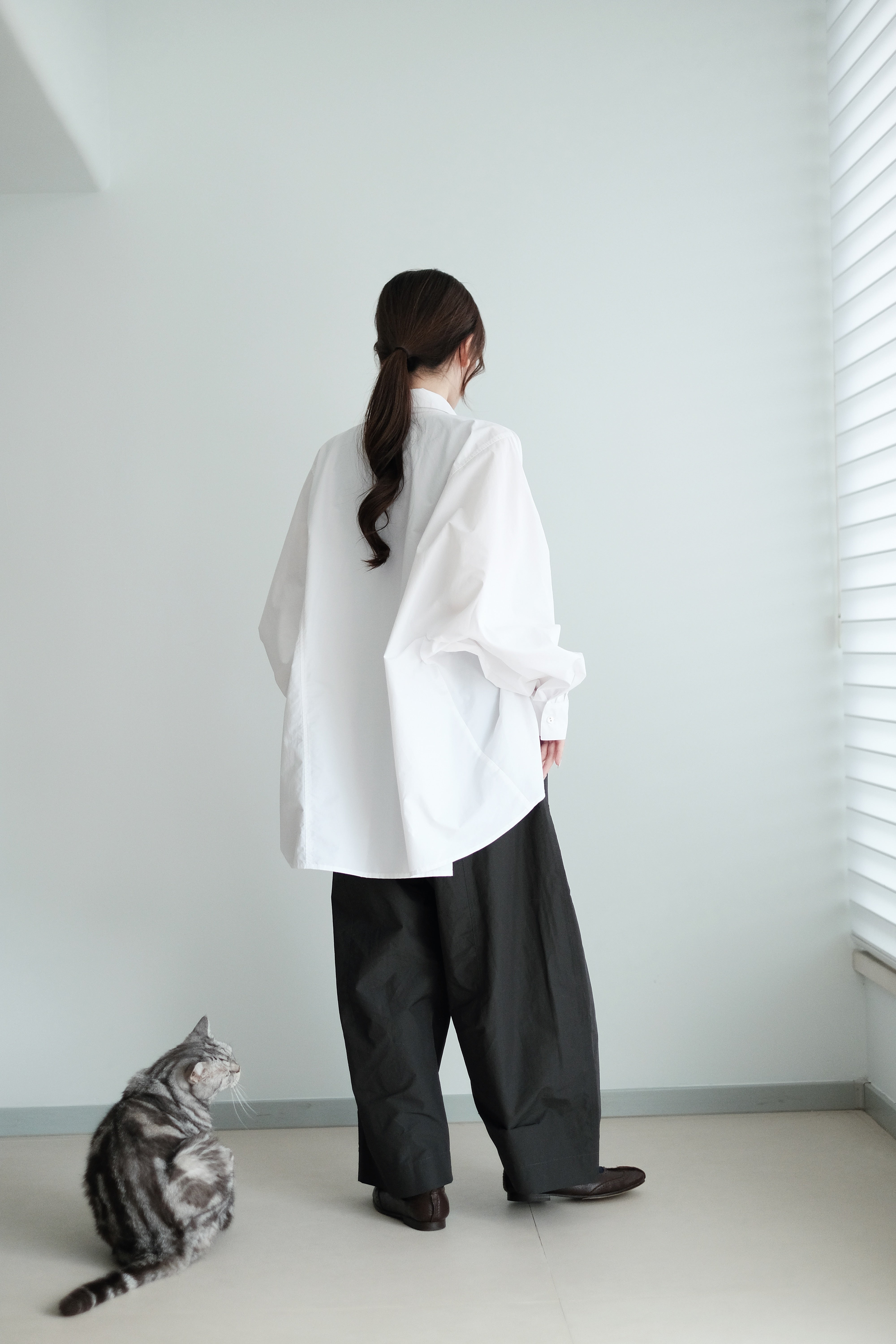 This white shirt features a batwing cut with extra room at the underarms, creating a voluminous and airy silhouette. Made from crisp 100% cotton, the back is shaped with panel seams for added structure, while the pleated cuffs enhance its dimensional form. Designed with a generous oversized fit — it’s roomy enough to be boyfriend-shared, yet still holds a clean and refined outline.