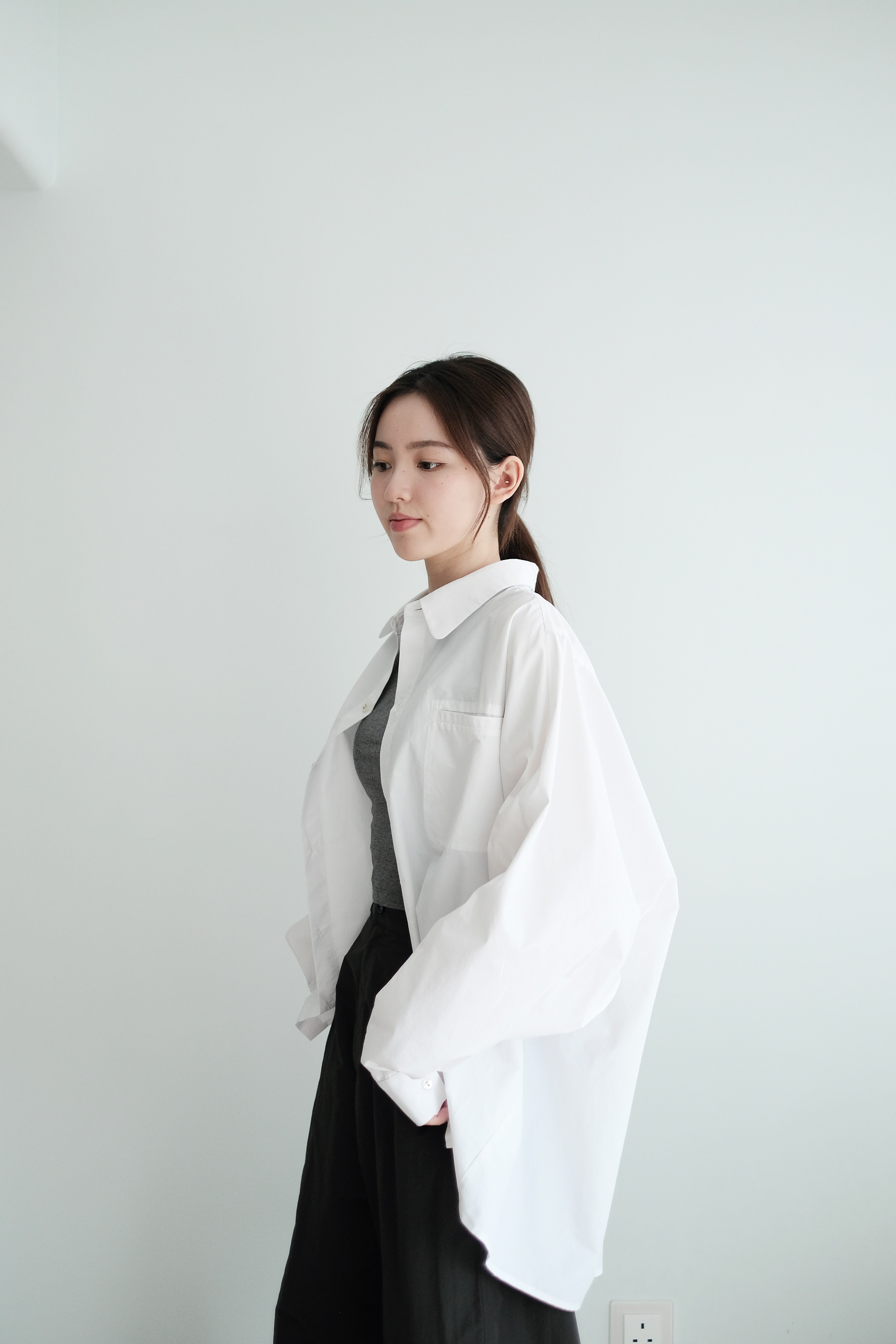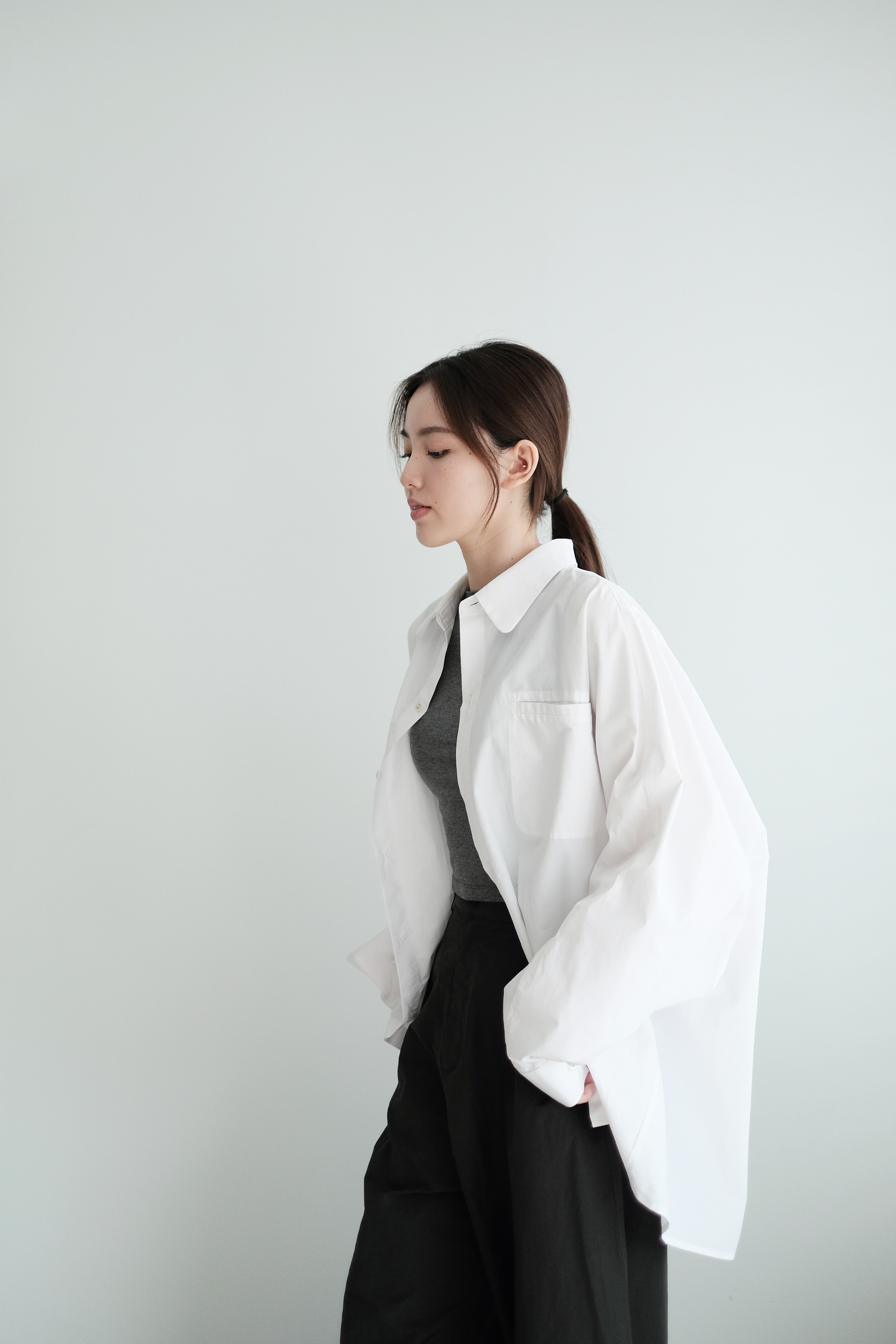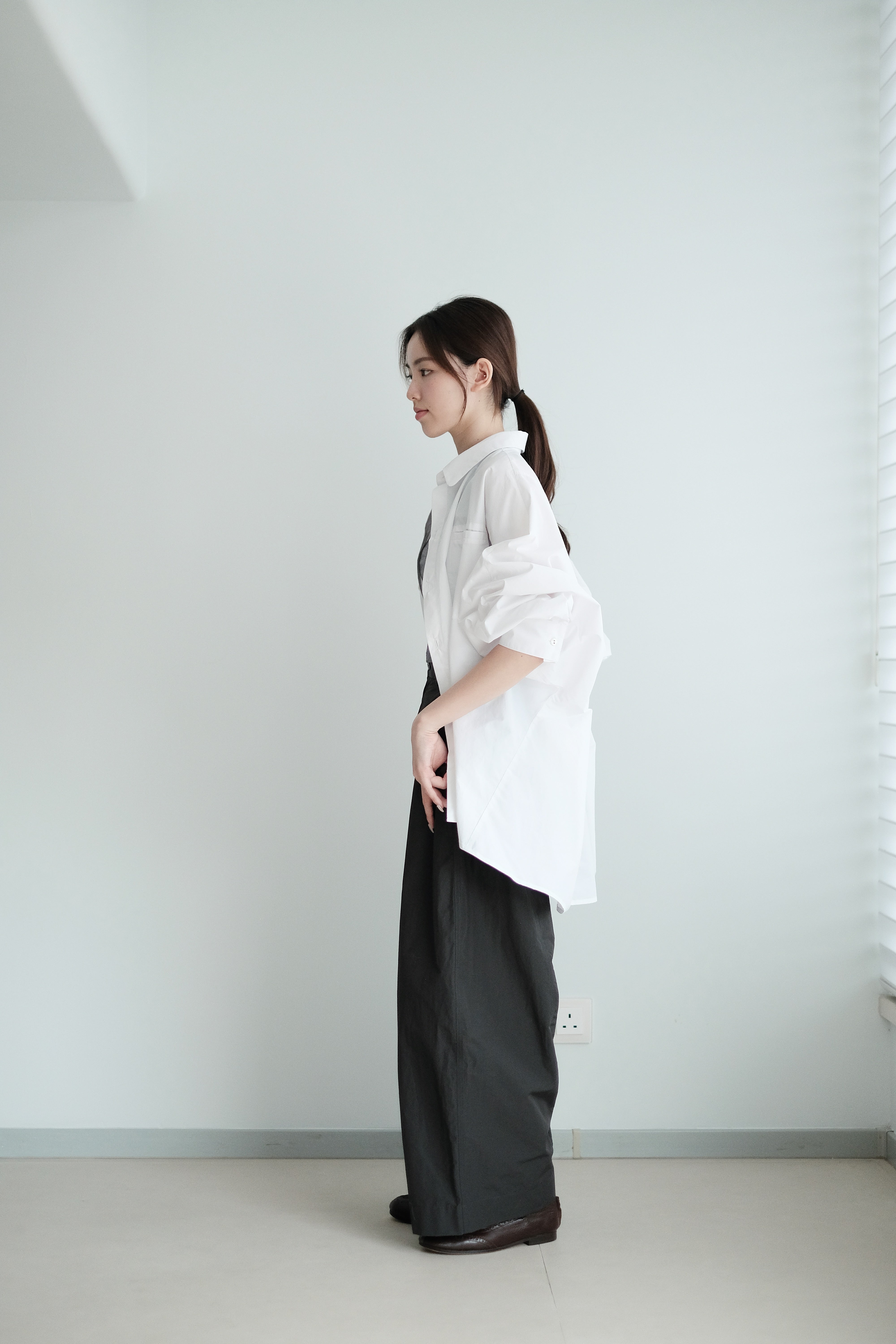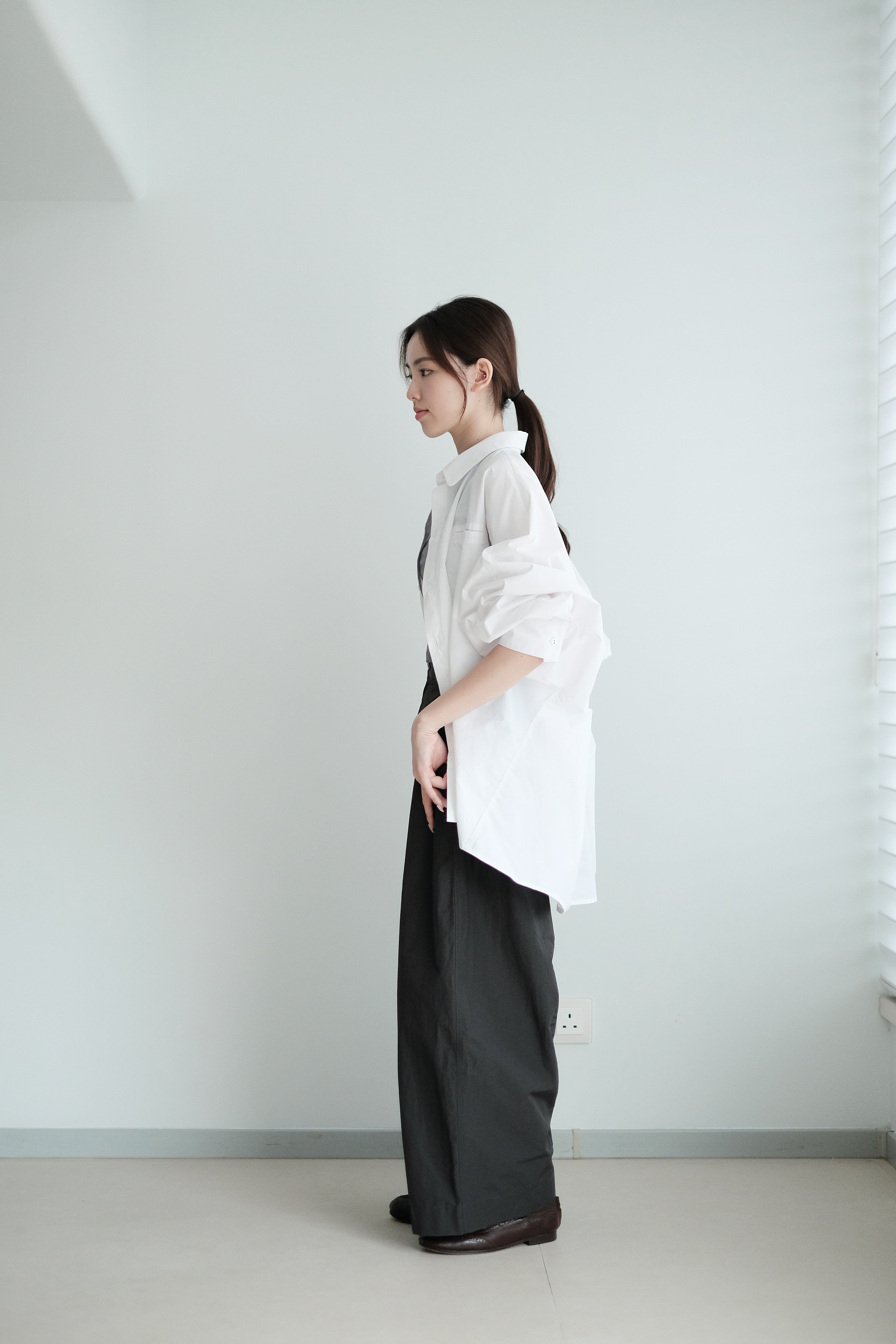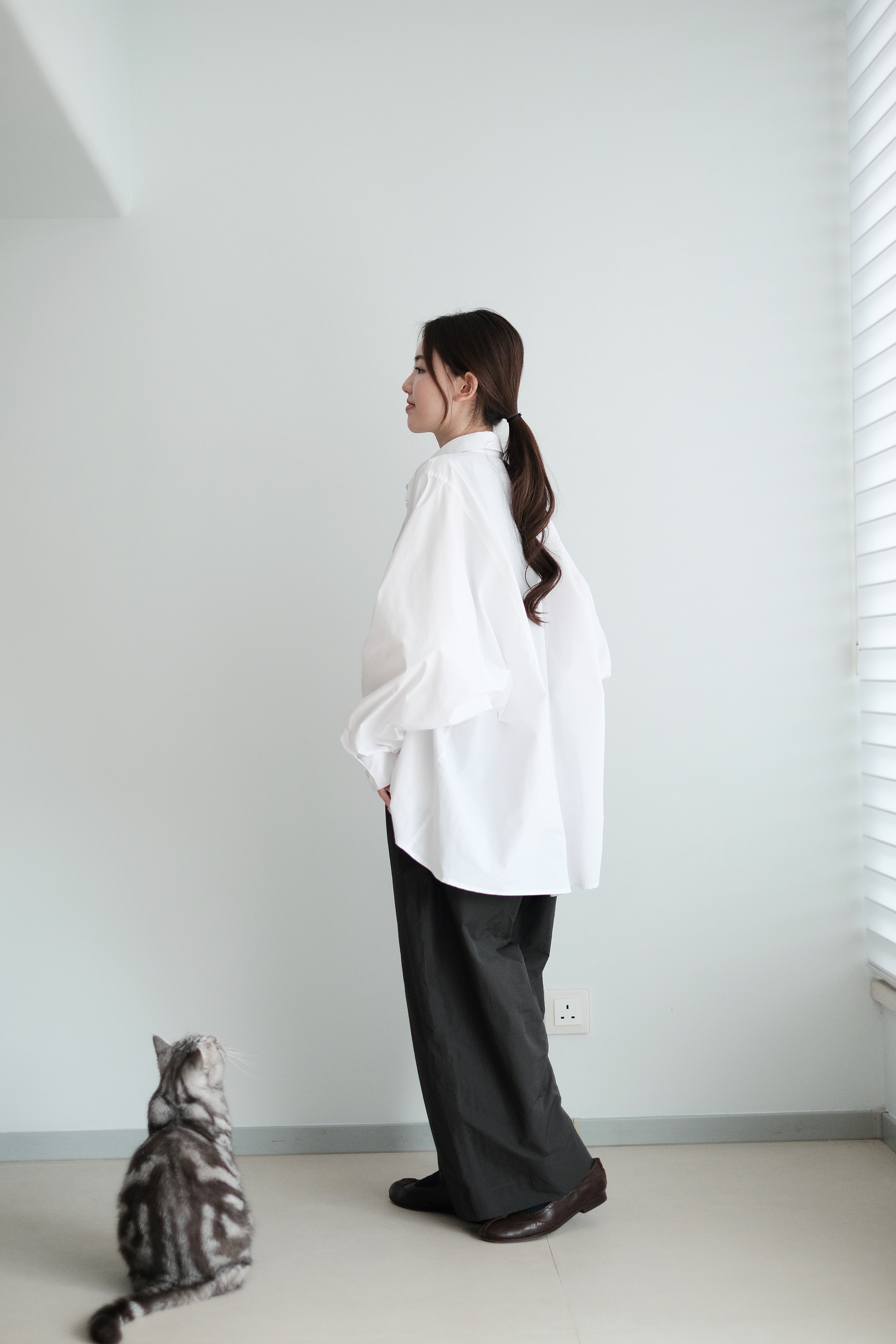 這件白襯衫採用蝙蝠袖剪裁,腋下位置特意放寬,整體寬鬆有空氣感,穿上後自然垂墜。面料選用挺身純棉,後背加入剪接線增加立體度,袖口打褶設計讓版型更有份量。是那種連男朋友也能輕鬆駕馭的 over-size 襯衫,鬆身卻不失結構感。