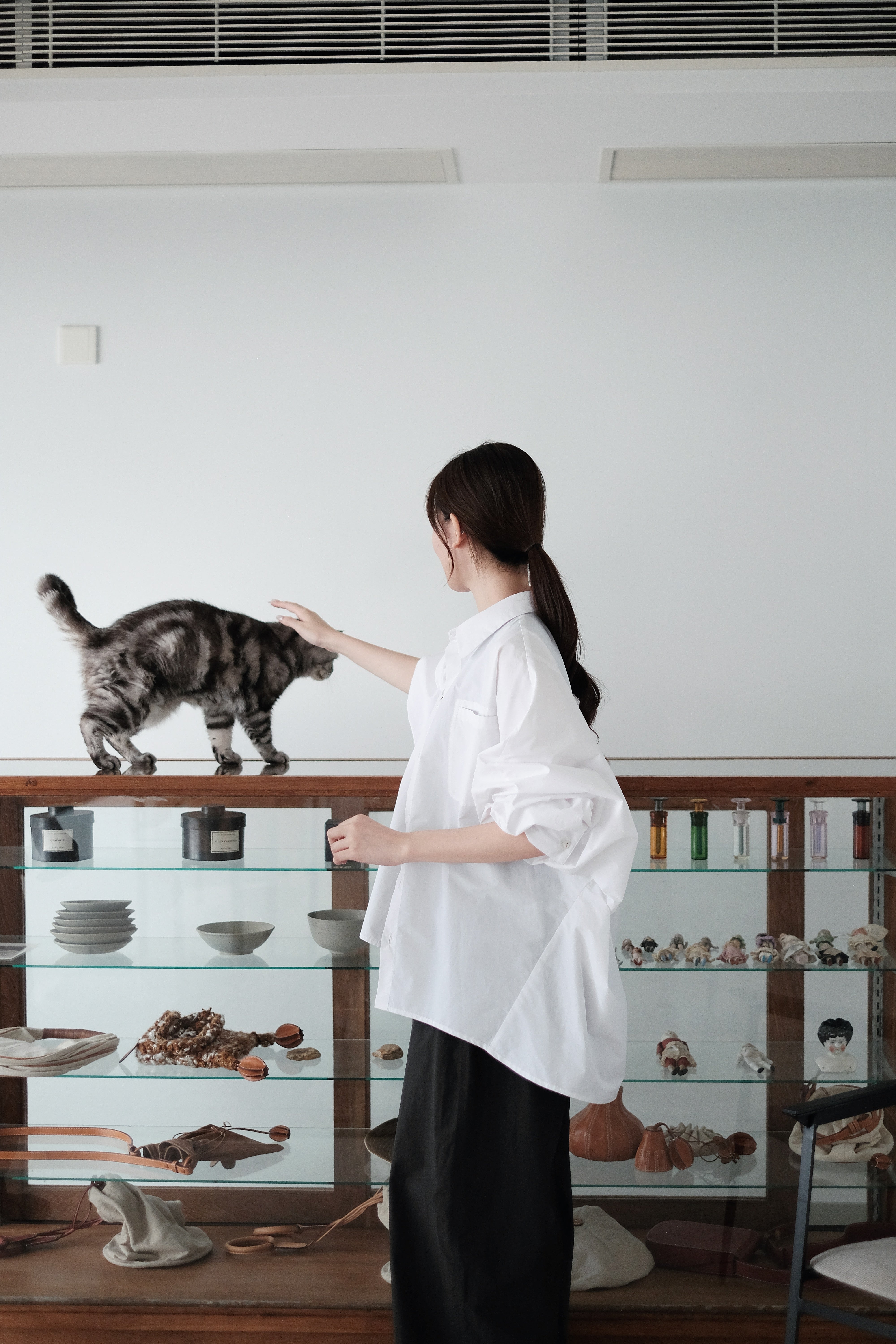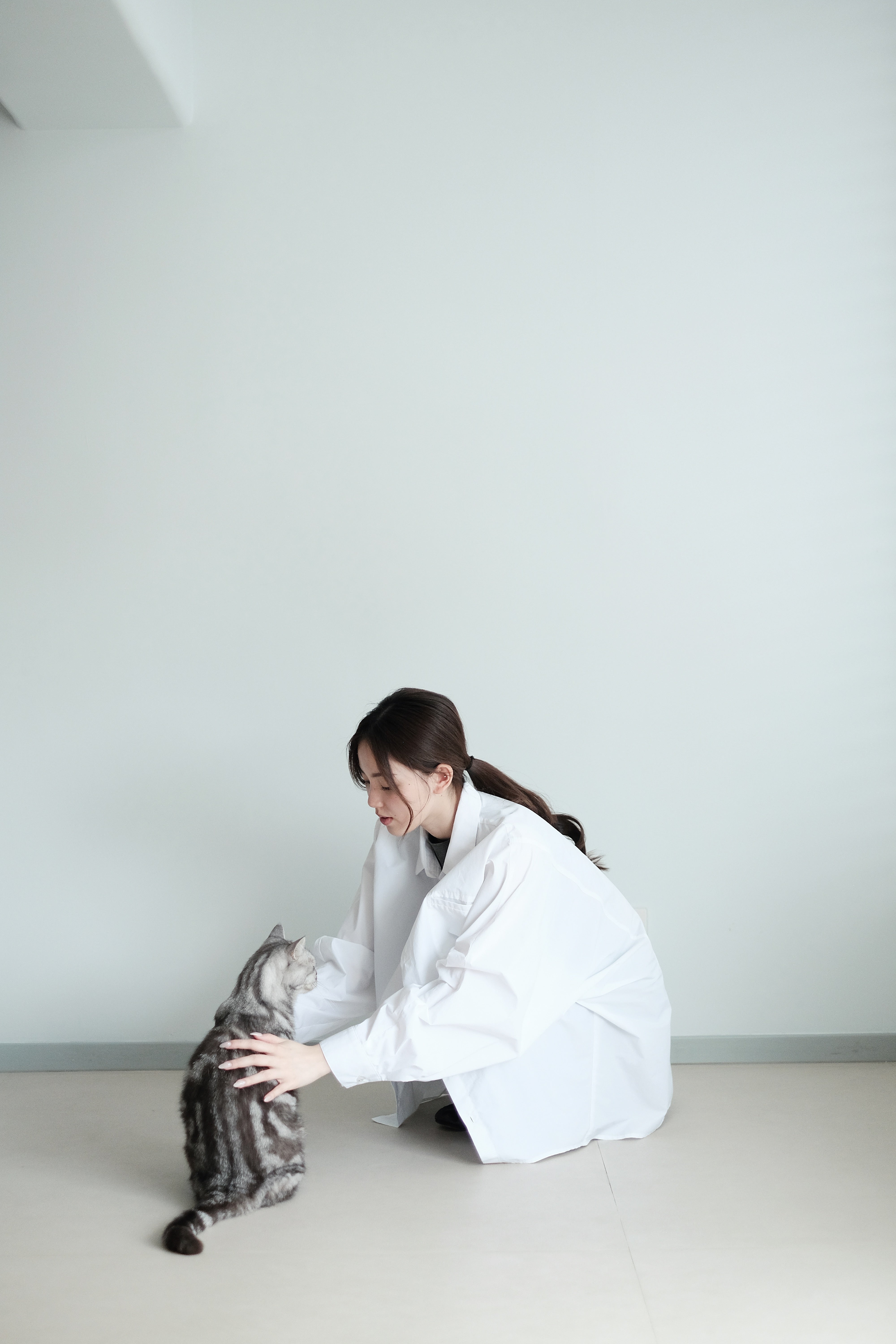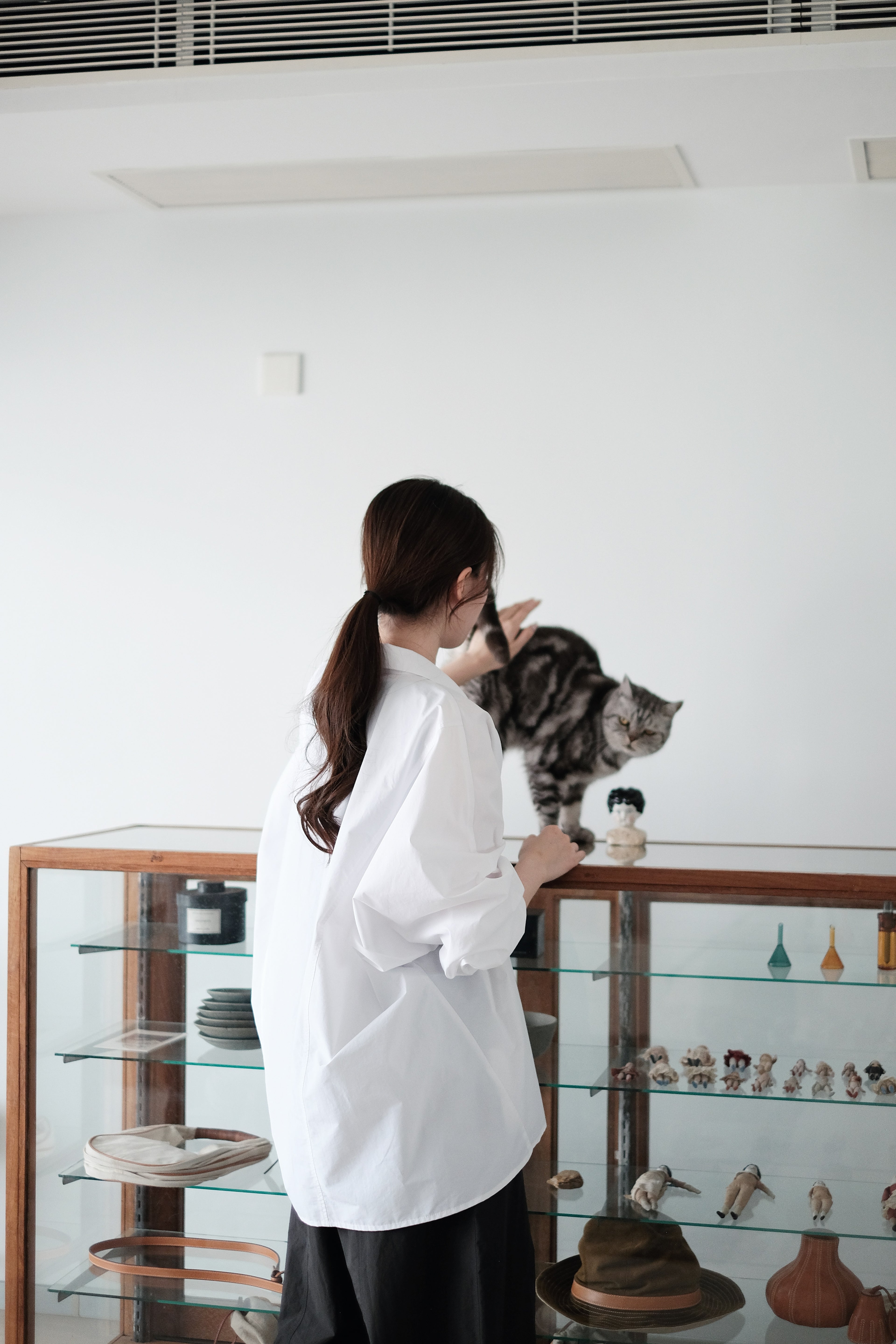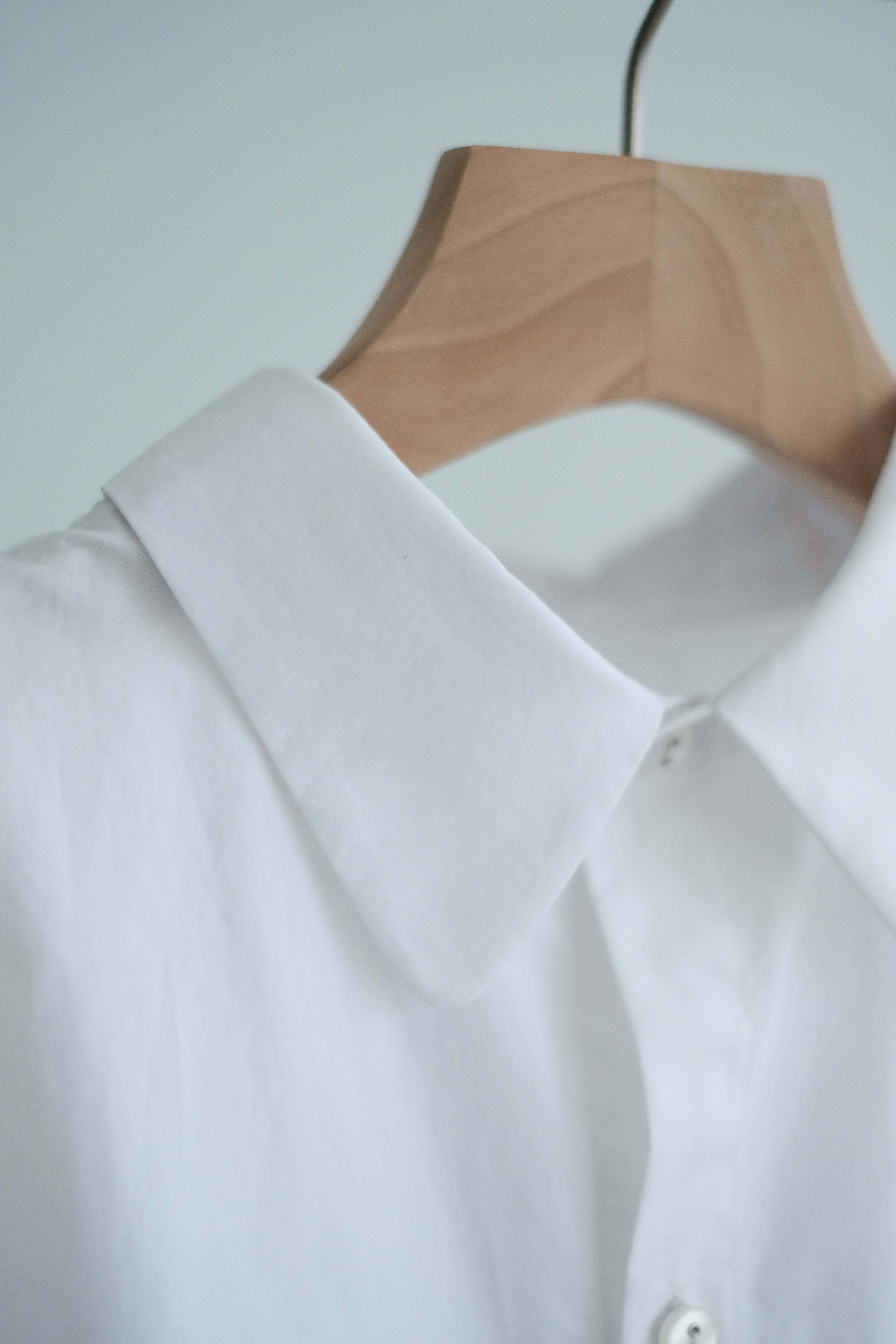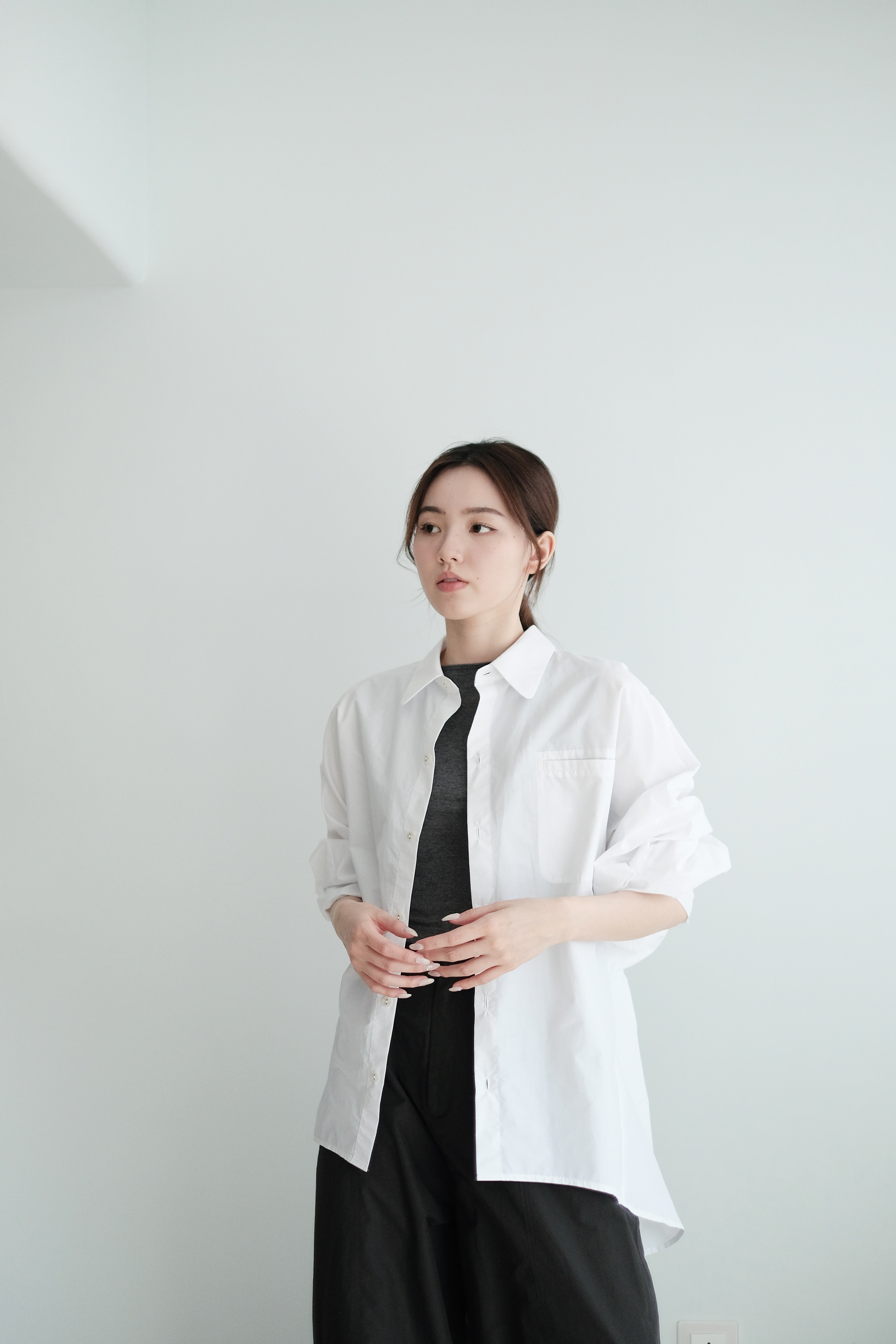 這件白襯衫採用蝙蝠袖剪裁,腋下位置特意放寬,整體寬鬆有空氣感,穿上後自然垂墜。面料選用挺身純棉,後背加入剪接線增加立體度,袖口打褶設計讓版型更有份量。是那種連男朋友也能輕鬆駕馭的 over-size 襯衫,鬆身卻不失結構感。