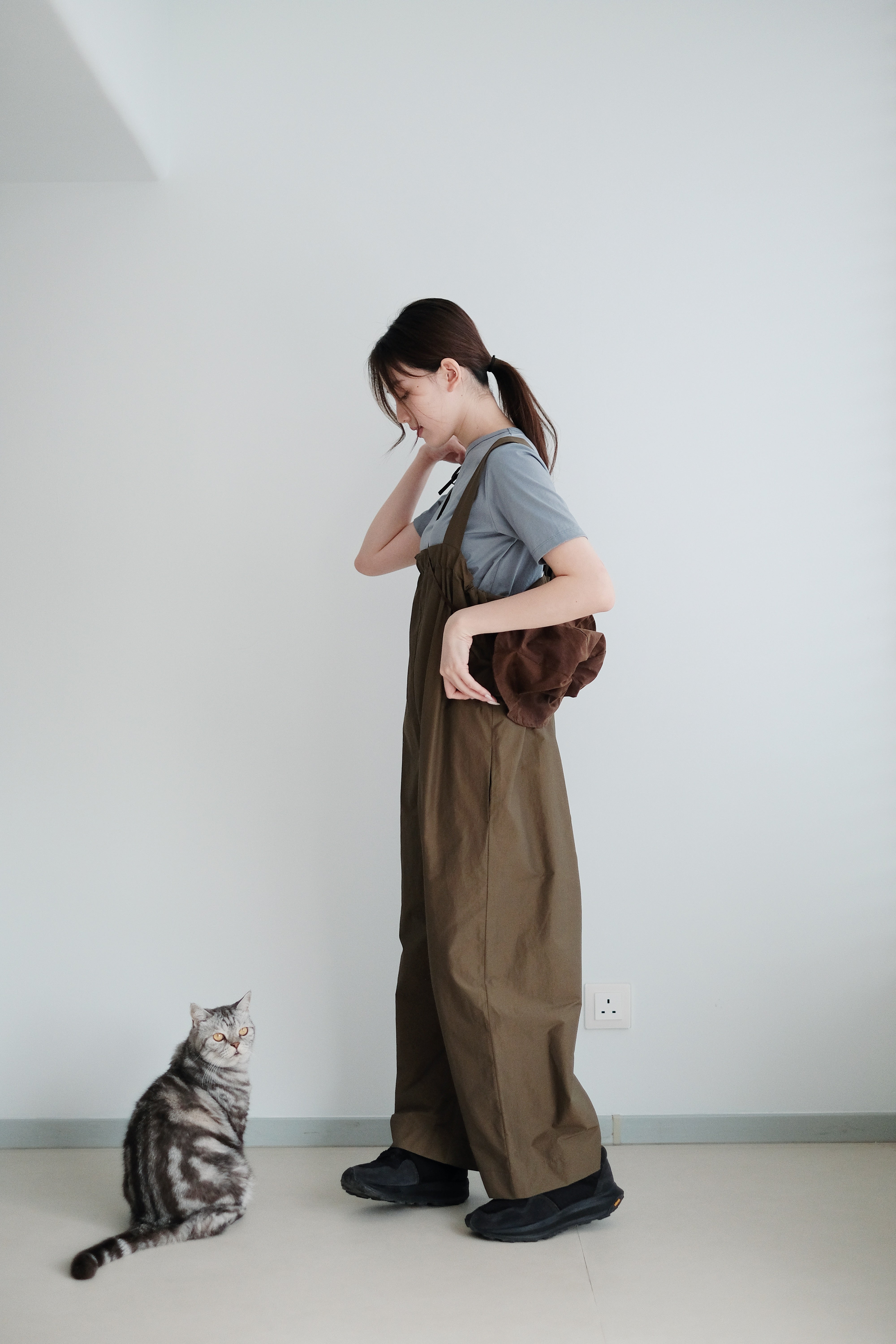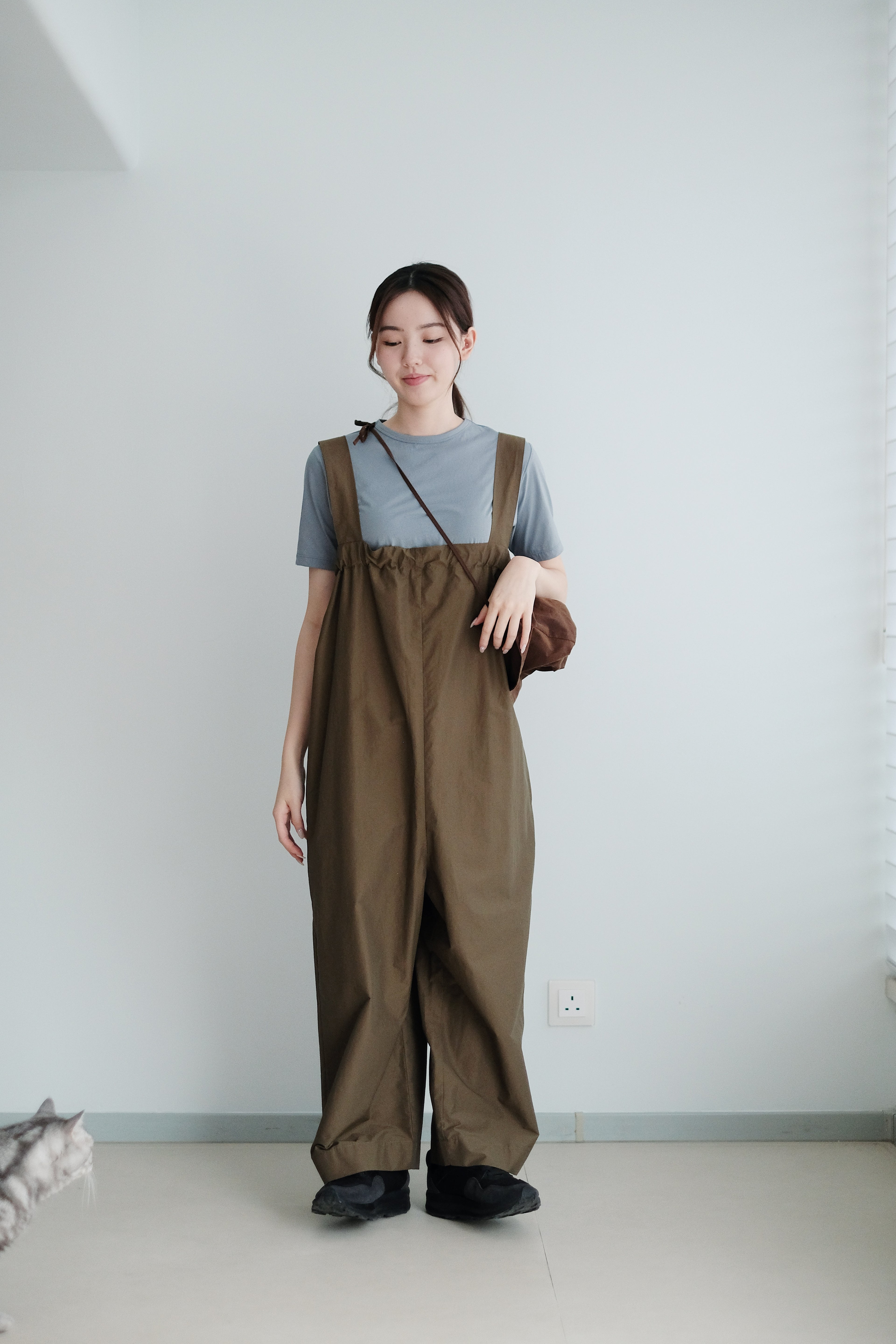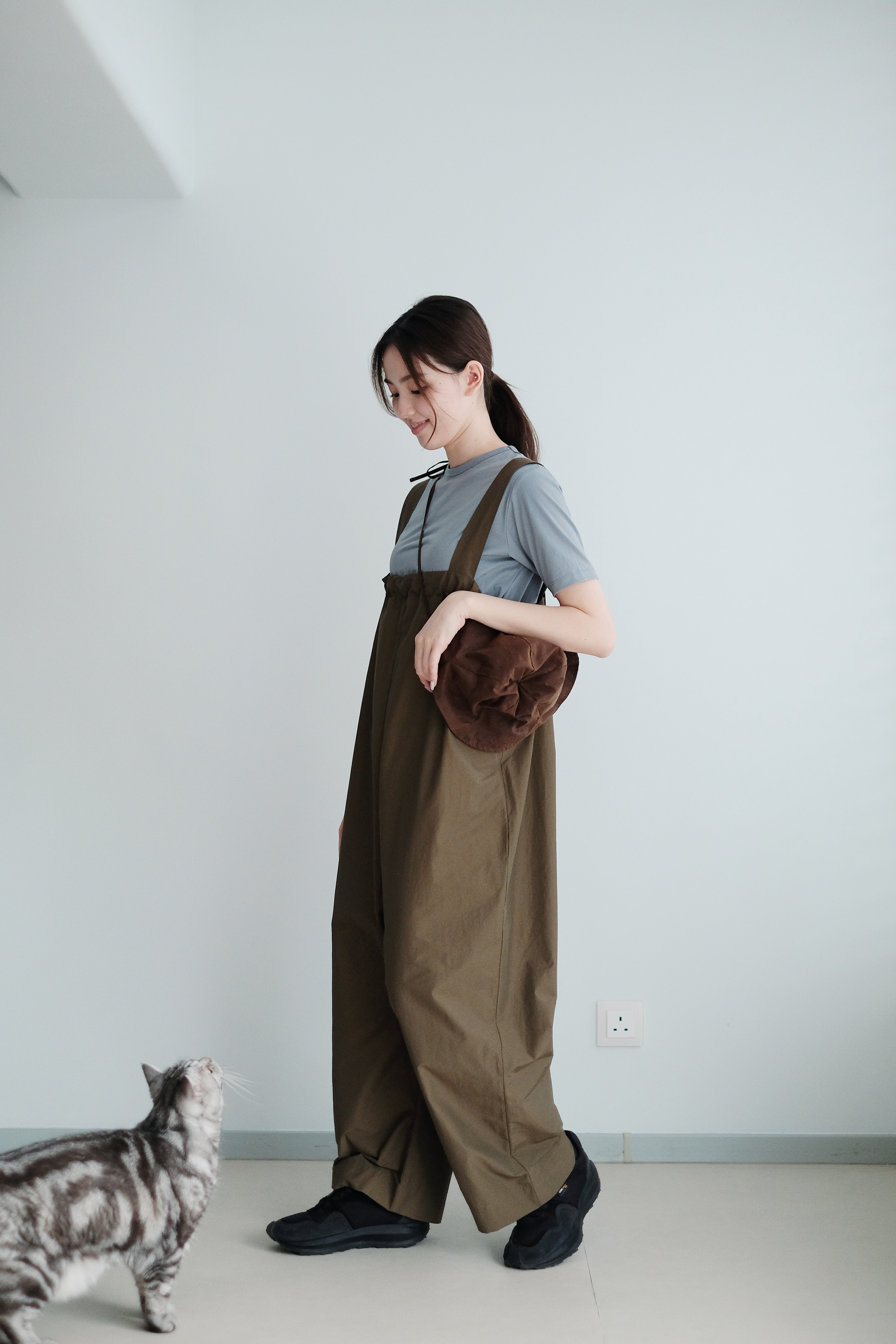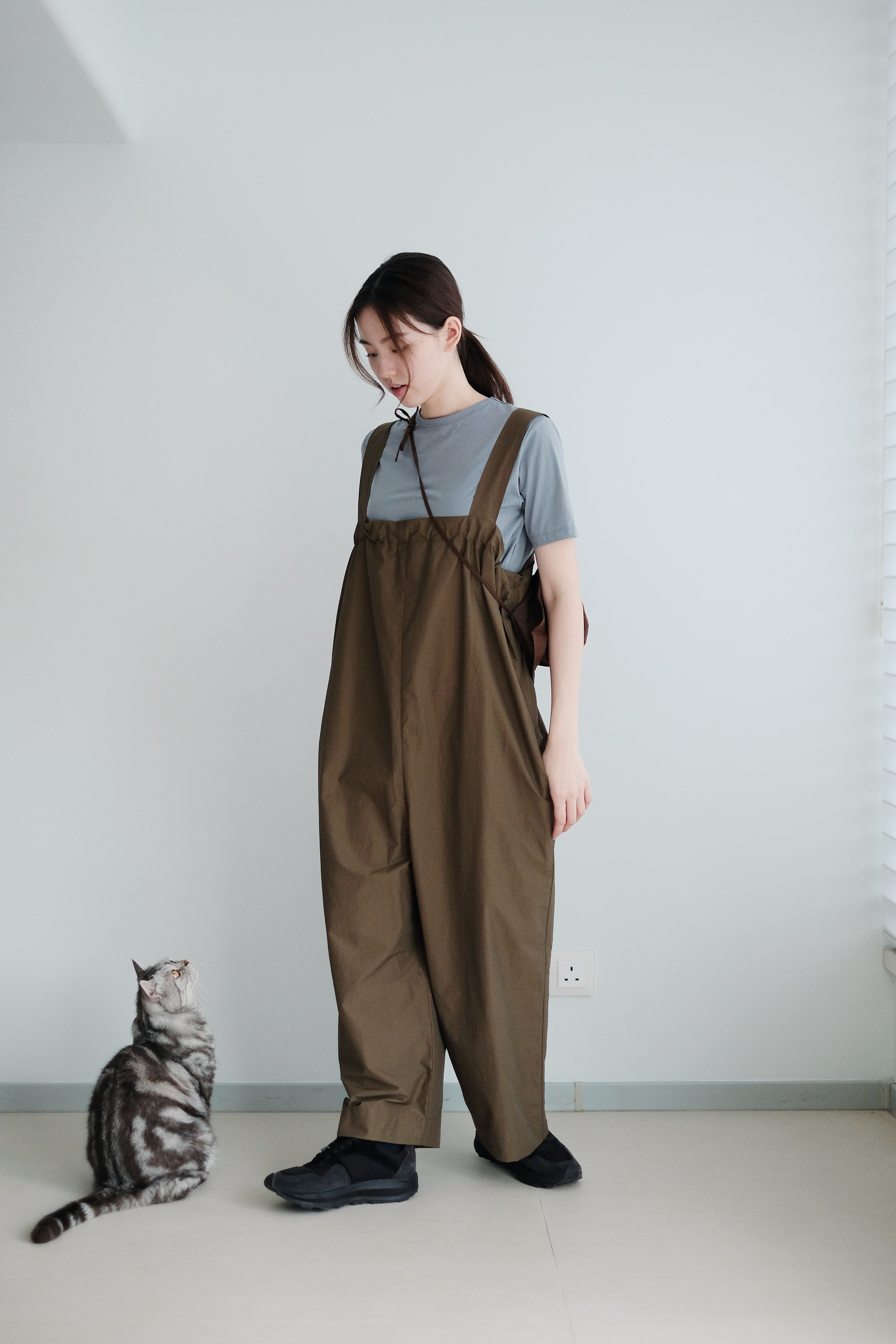這款吊帶連身褲以 nylon 與 cotton 混紡布料製成,質地挺身之餘又保留一定柔軟度,帶出自然垂墜感。設計寬鬆,背面以抽繩綁結收腰,方便調節鬆緊,營造出隨性慵懶的廓形。兩側設有口袋,實用又加分。大地橄欖綠調沉靜內斂,低調中見個性,無論單穿或內搭都充滿造型感。