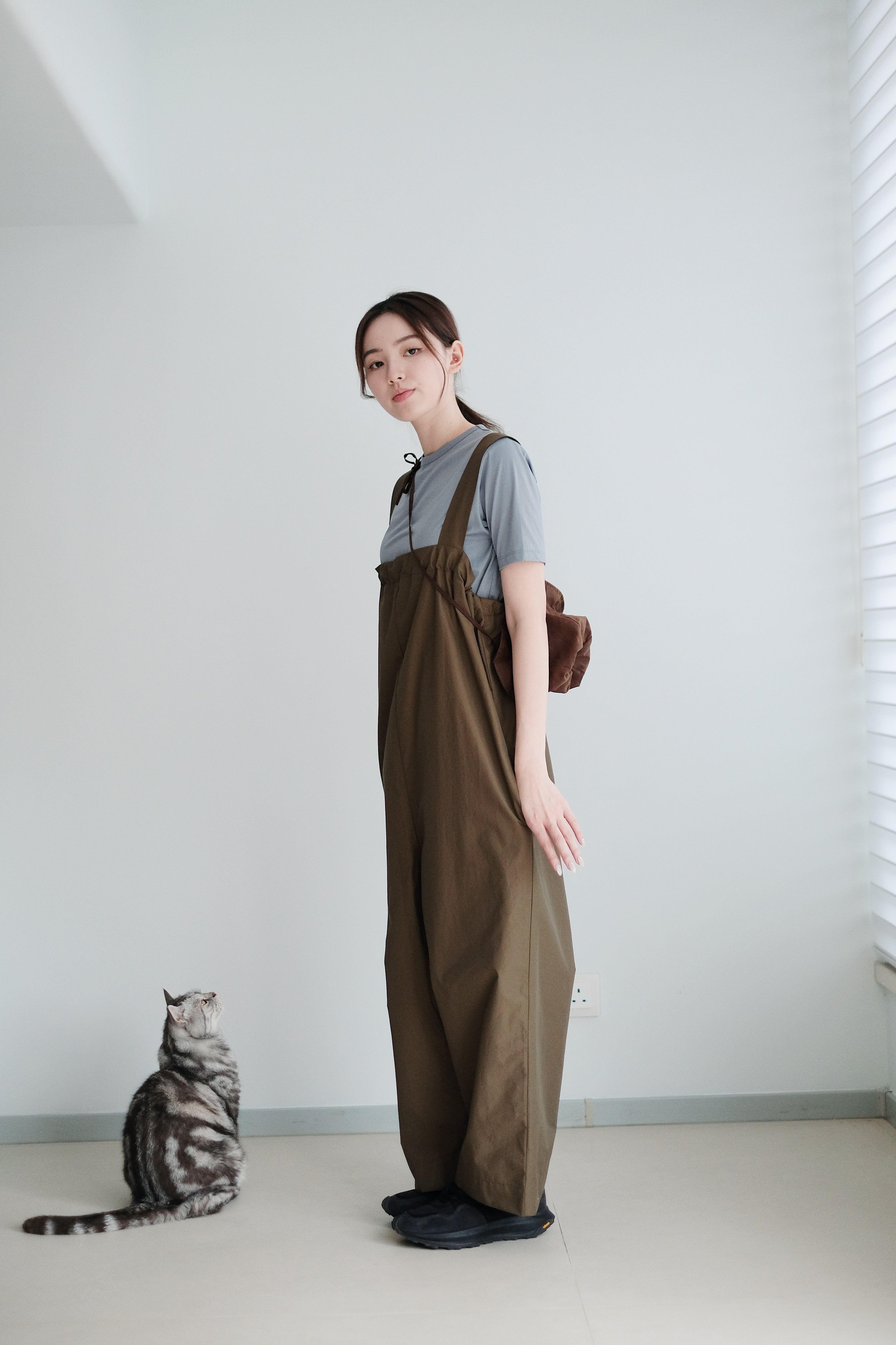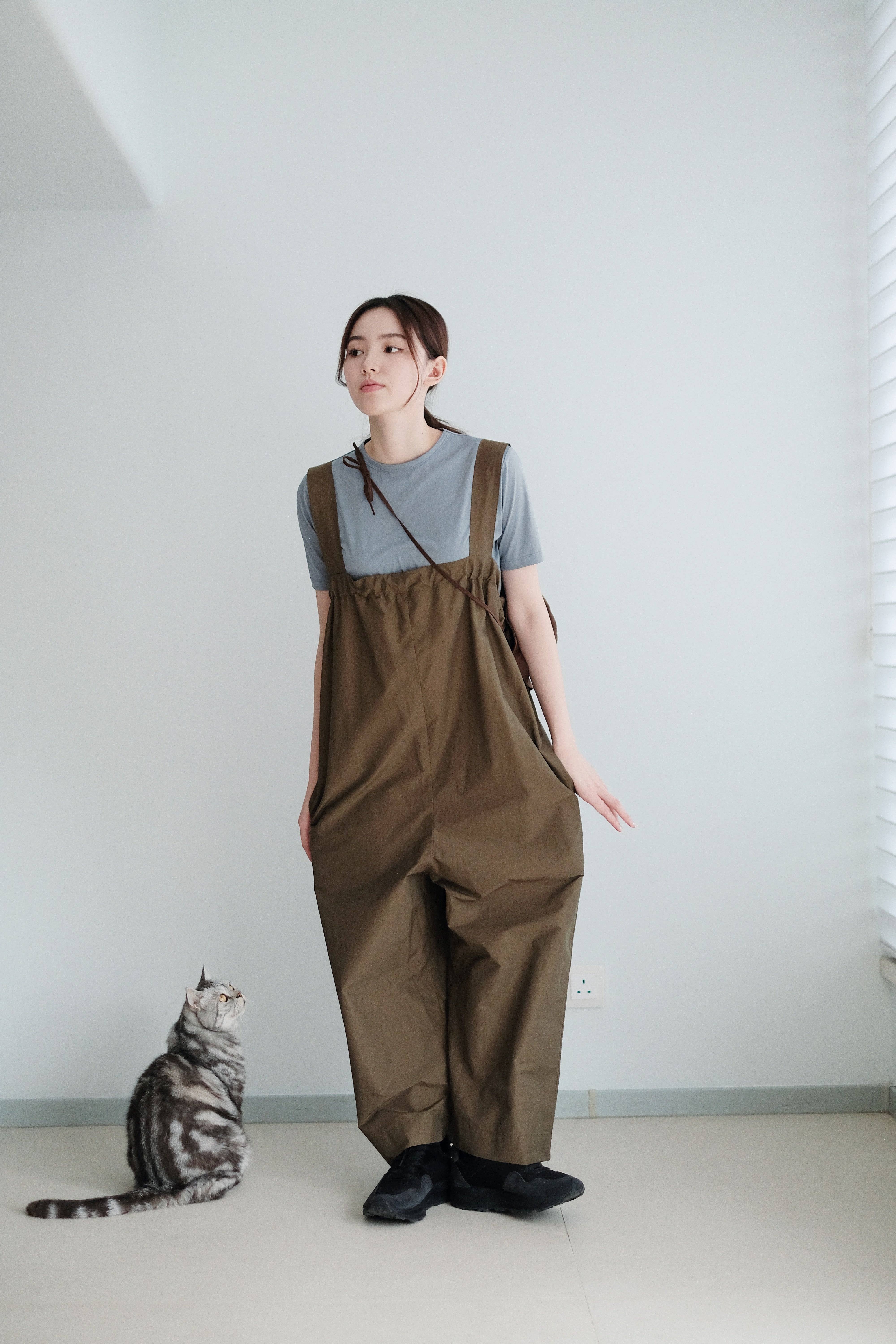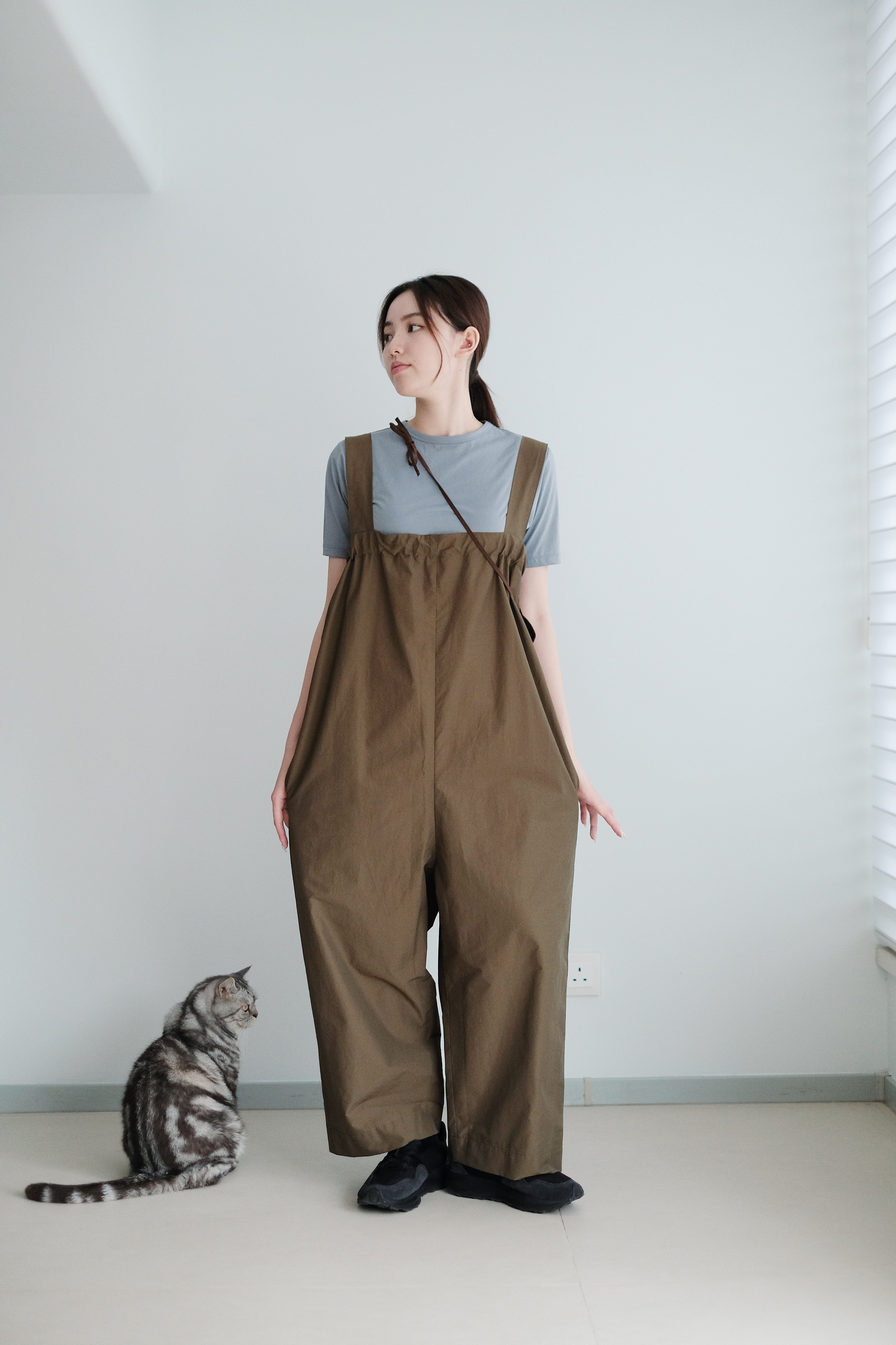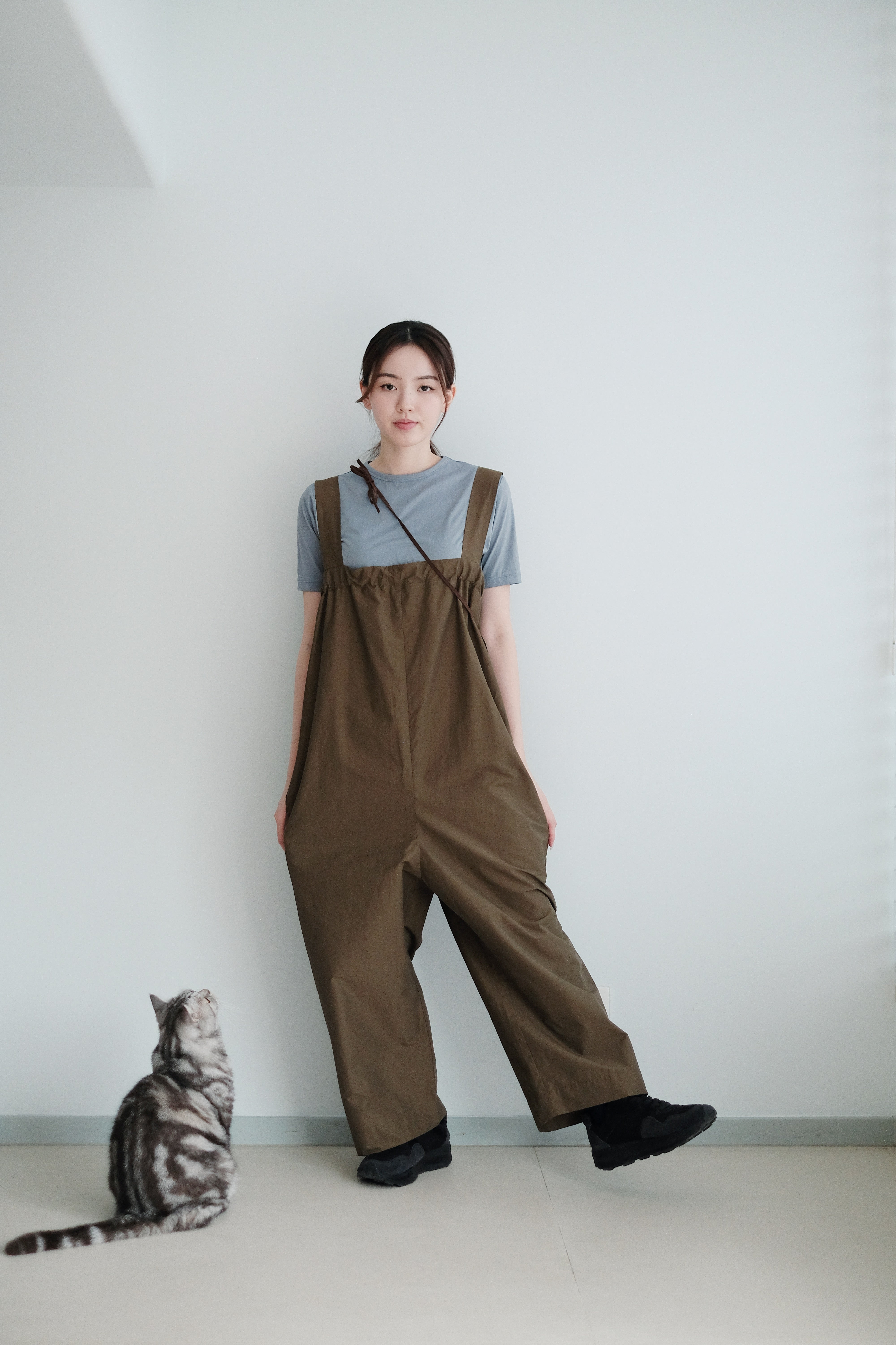 This pair of overalls is crafted from a nylon-cotton blended fabric that balances structure with softness. The relaxed, roomy silhouette is refined with a drawstring tie at the back for an adjustable fit. Side pockets add practical flair, while the deep olive tone lends a grounded, quiet confidence. Wear it layered or on its own—effortlessly cool either way.