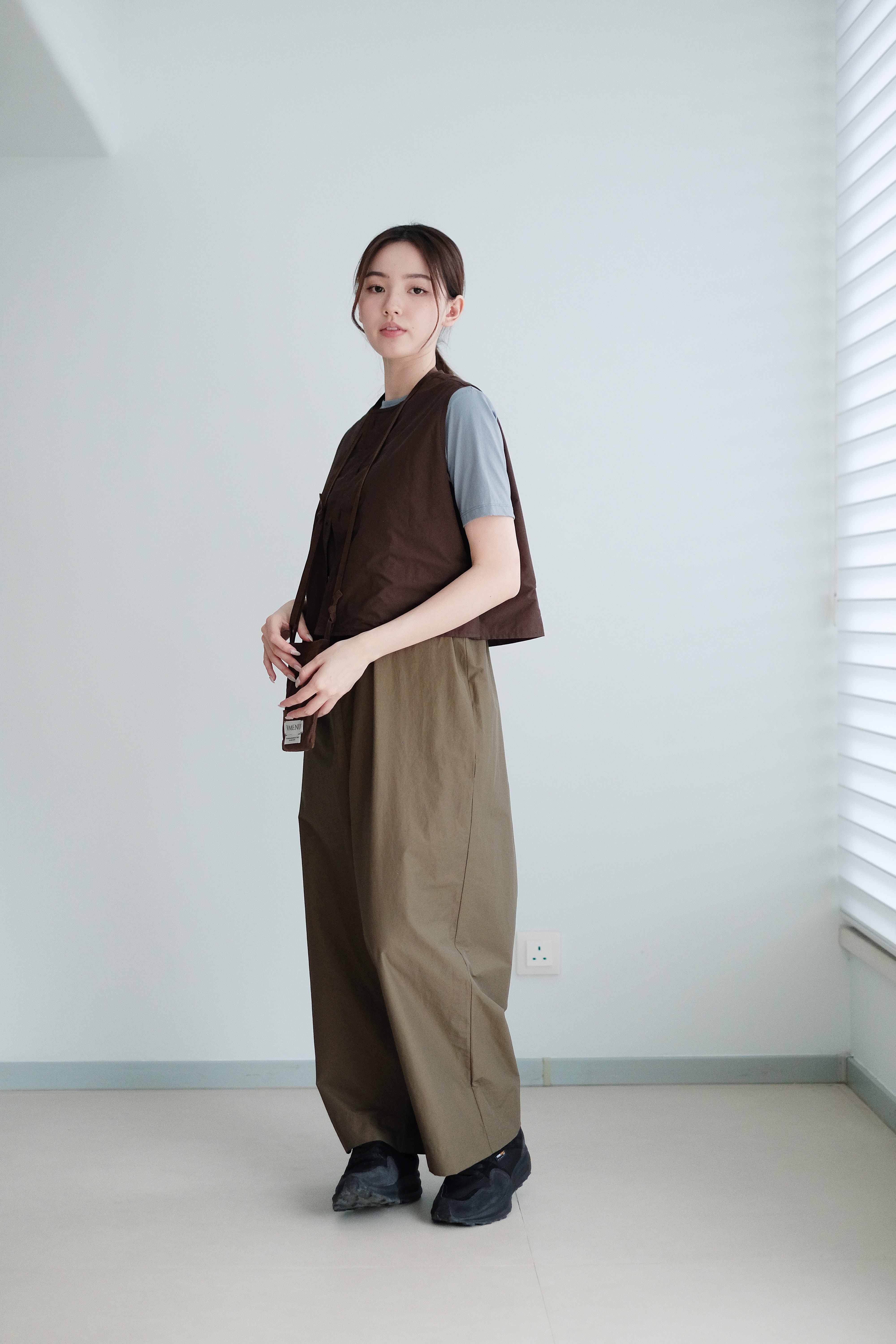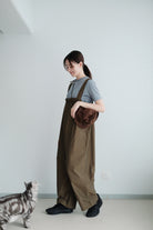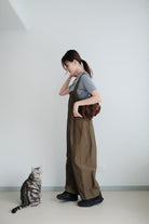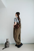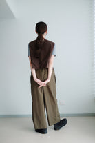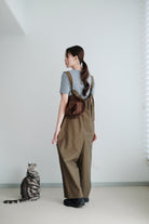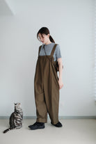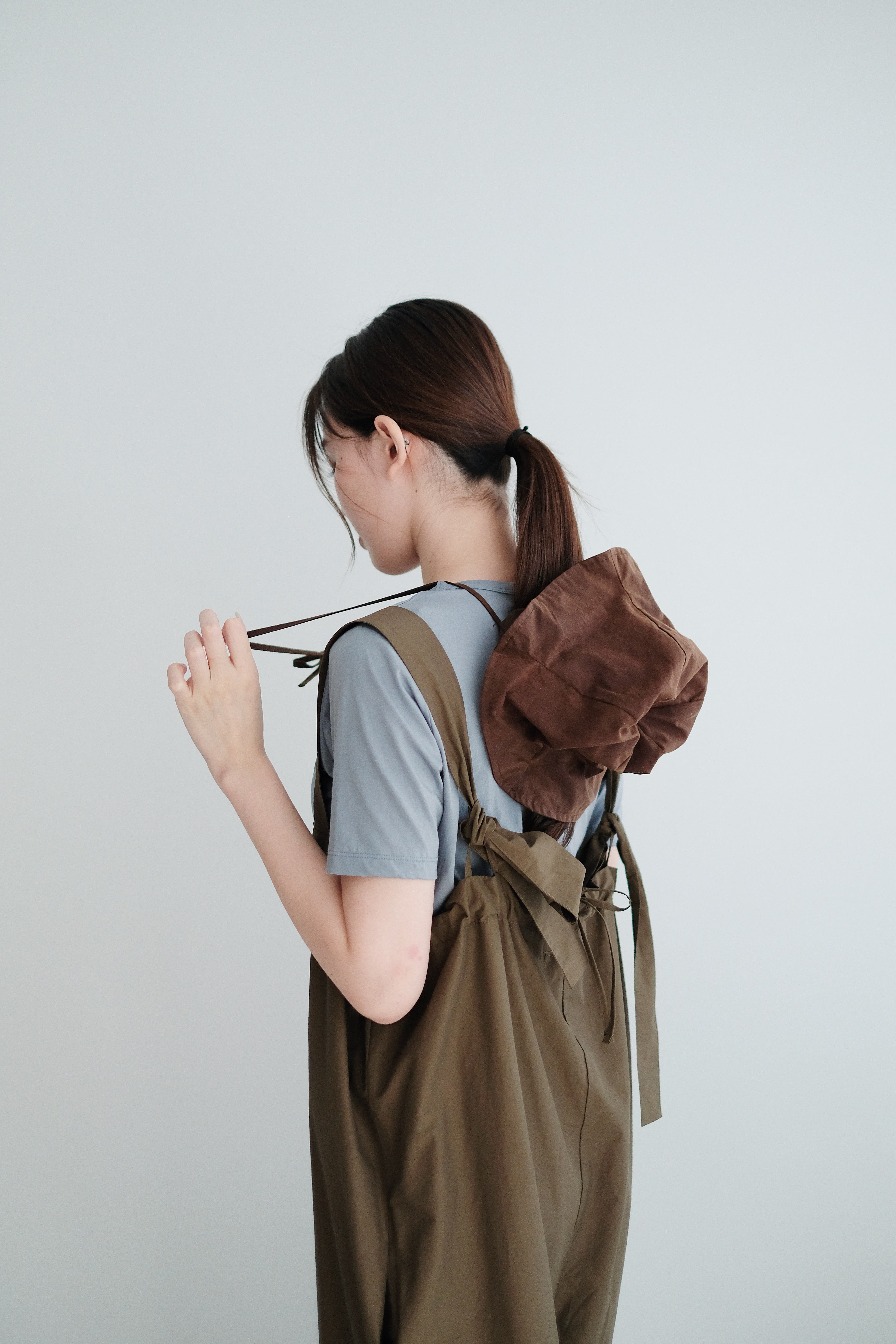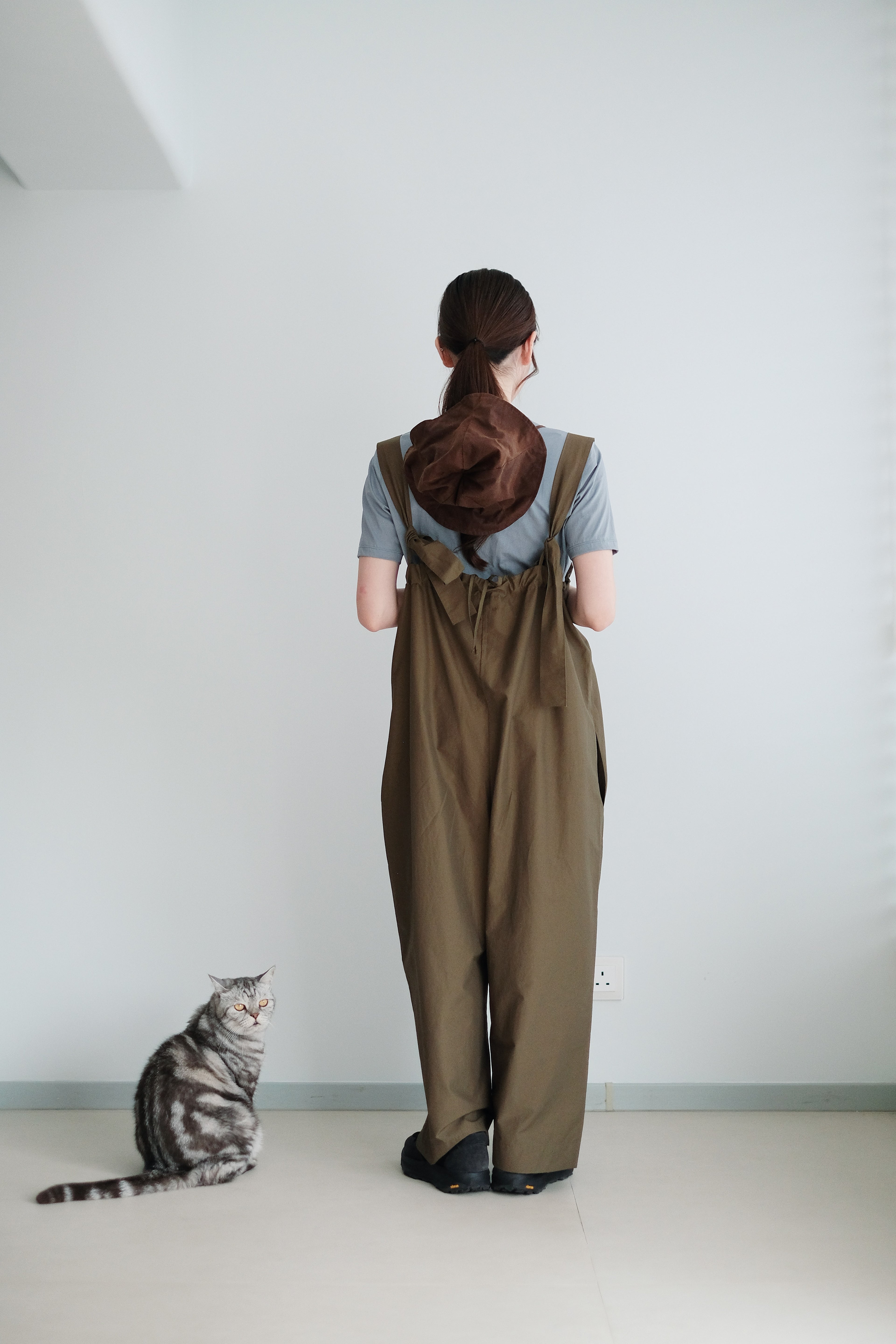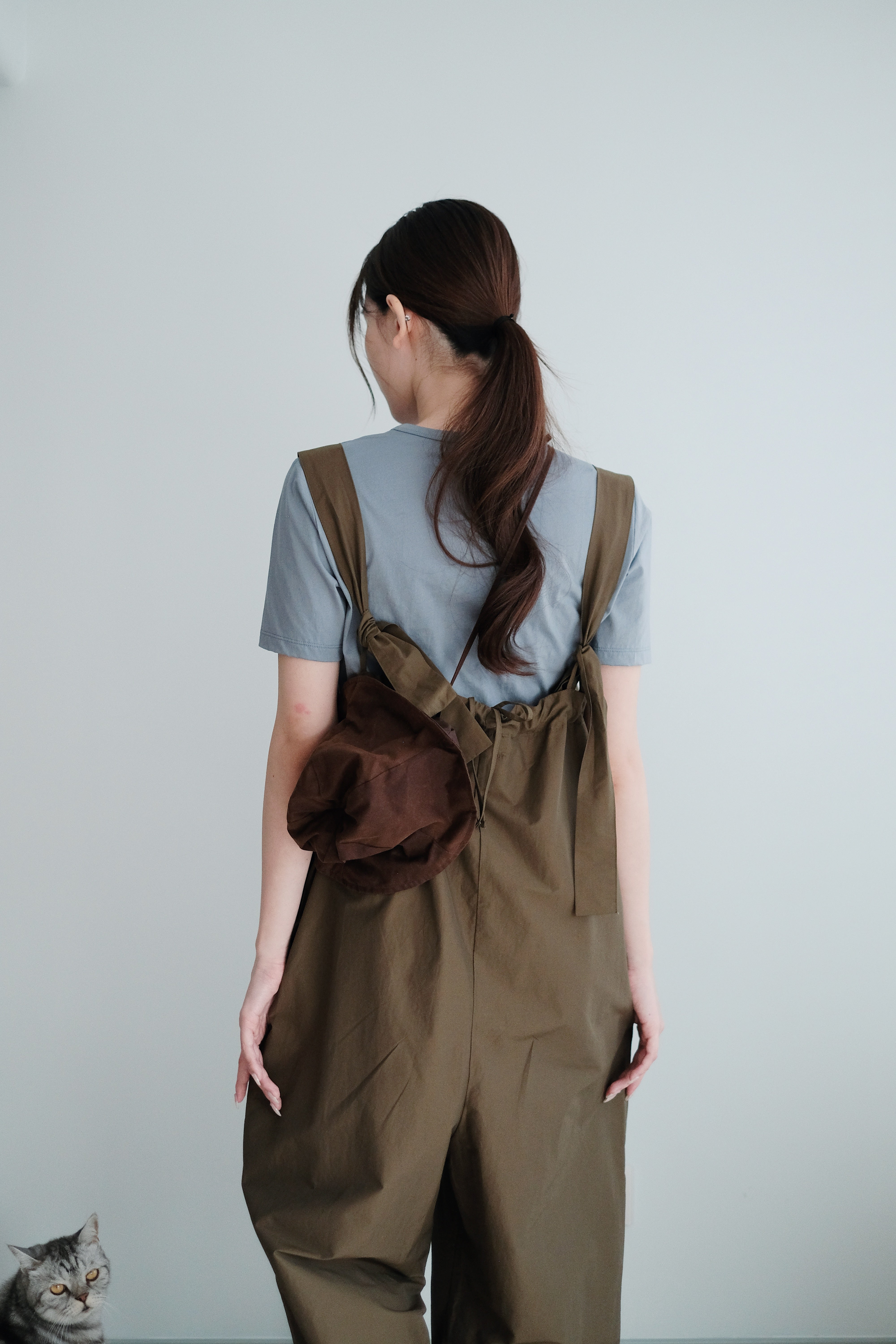 This pair of overalls is crafted from a nylon-cotton blended fabric that balances structure with softness. The relaxed, roomy silhouette is refined with a drawstring tie at the back for an adjustable fit. Side pockets add practical flair, while the deep olive tone lends a grounded, quiet confidence. Wear it layered or on its own—effortlessly cool either way.