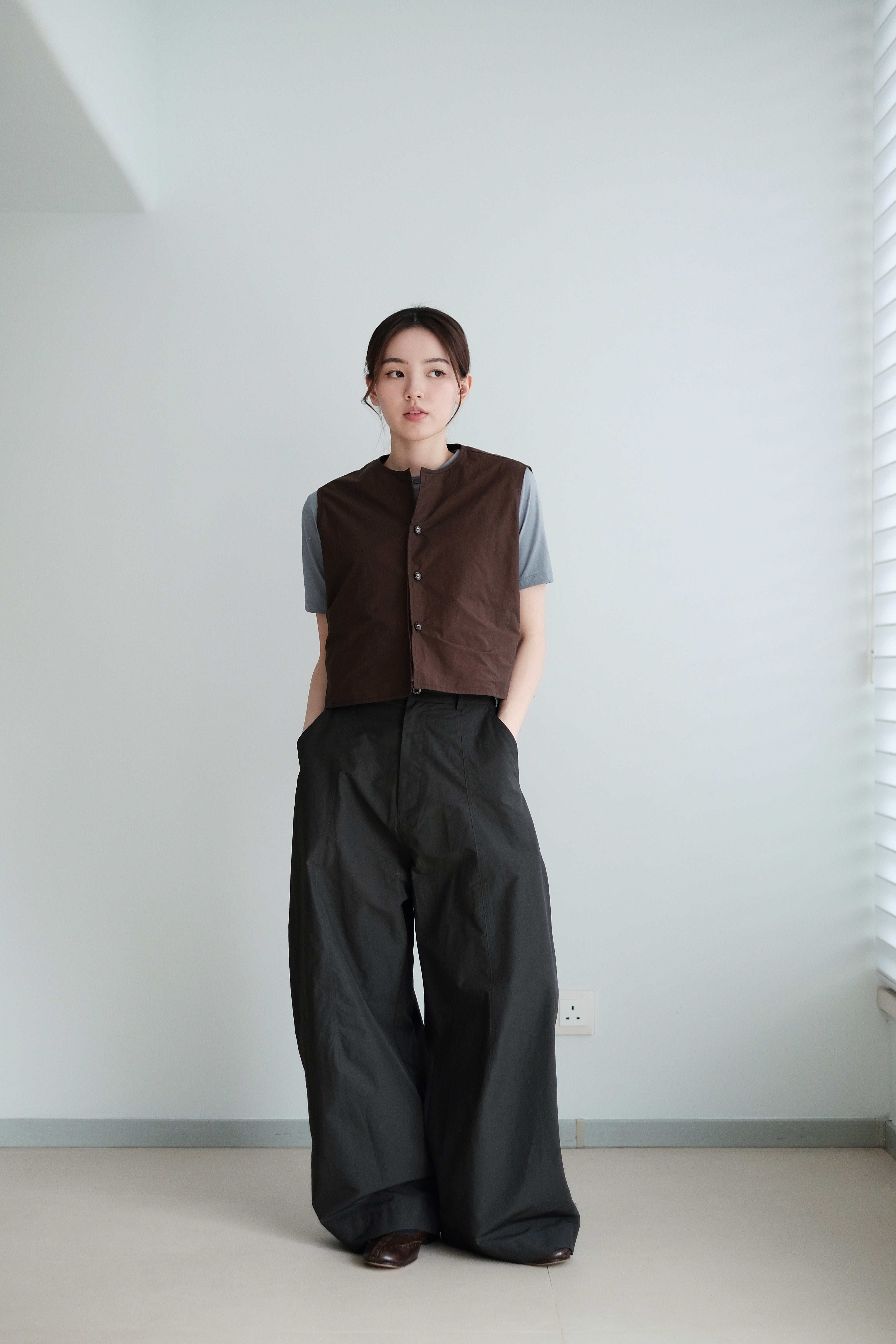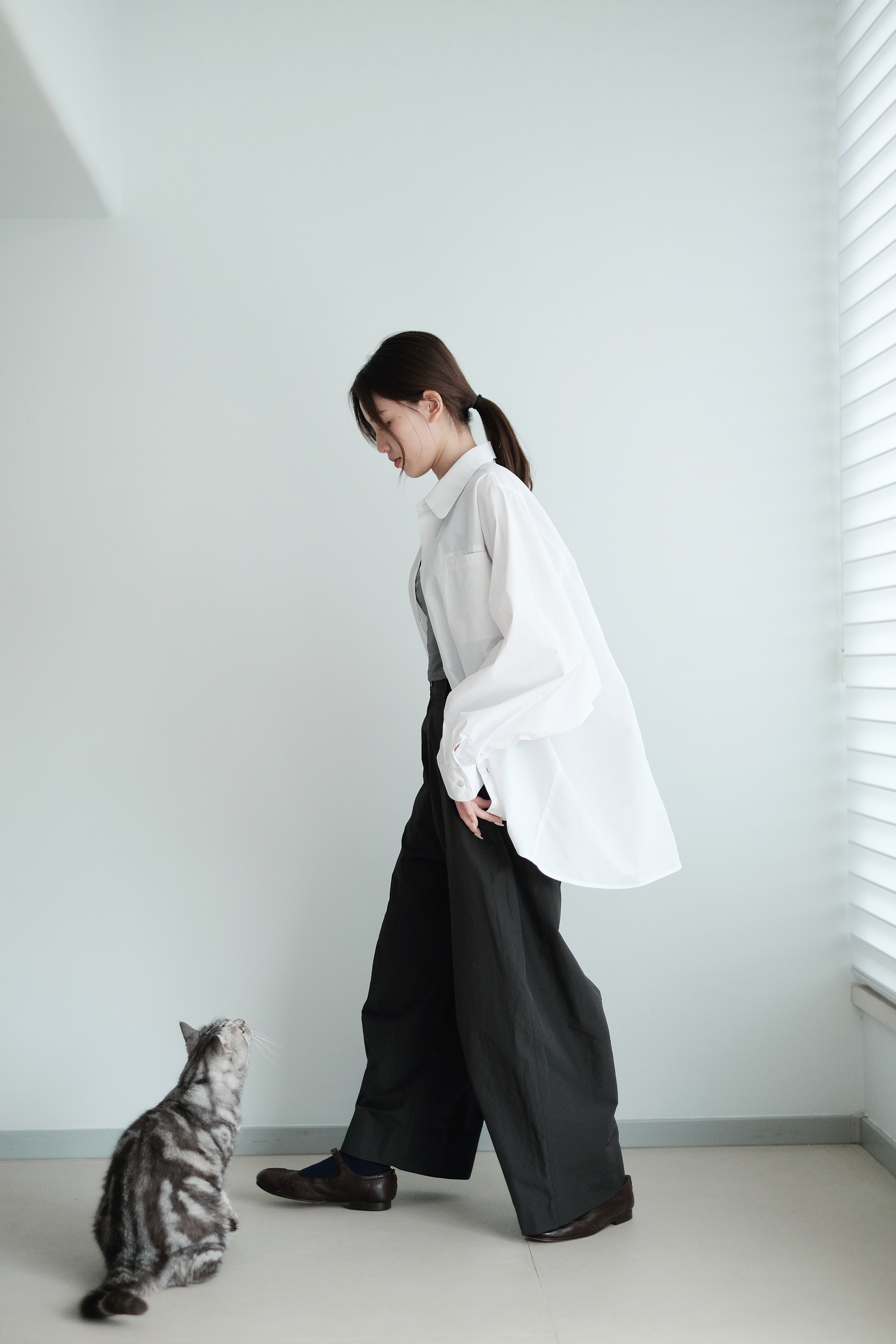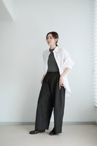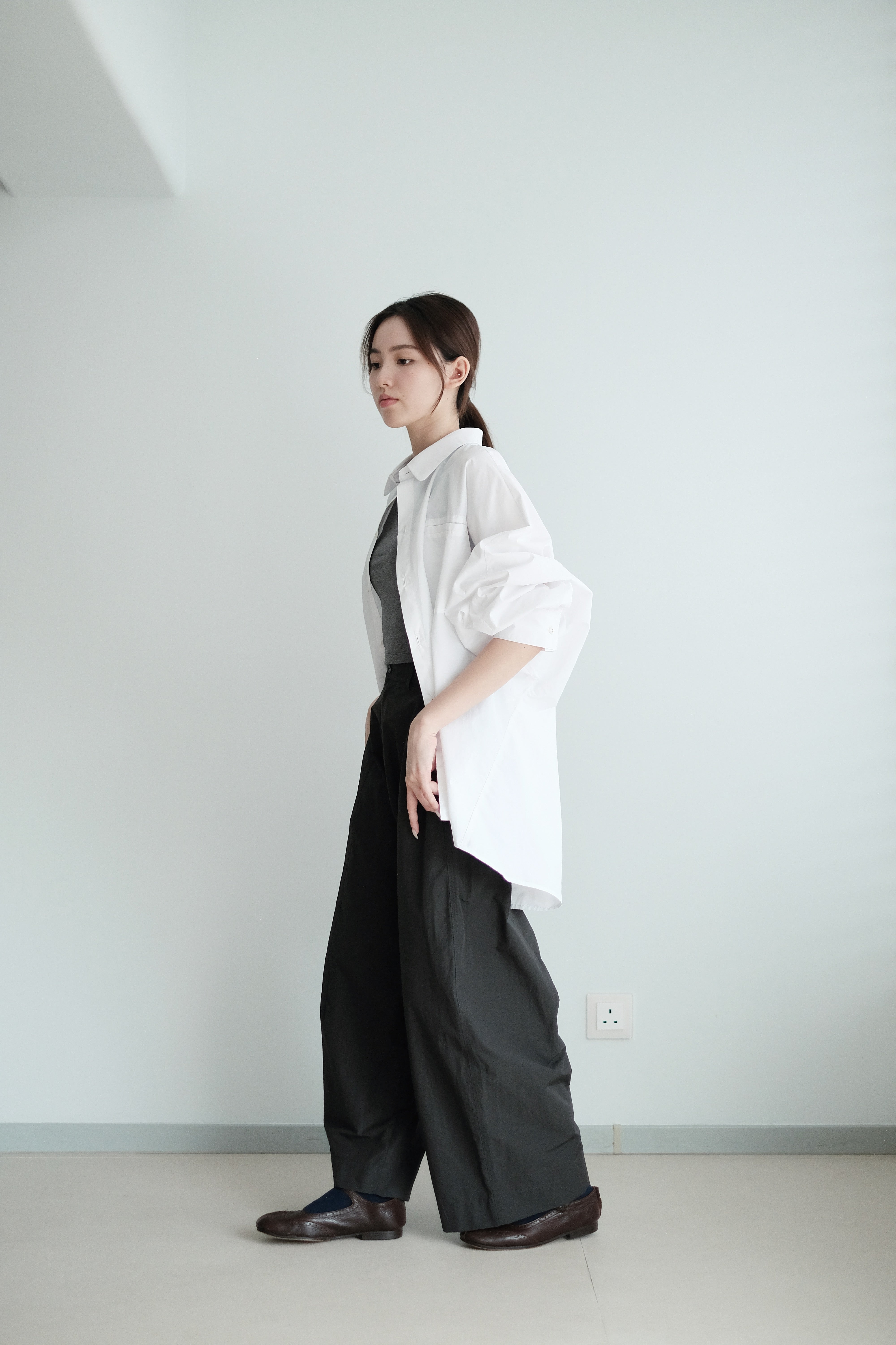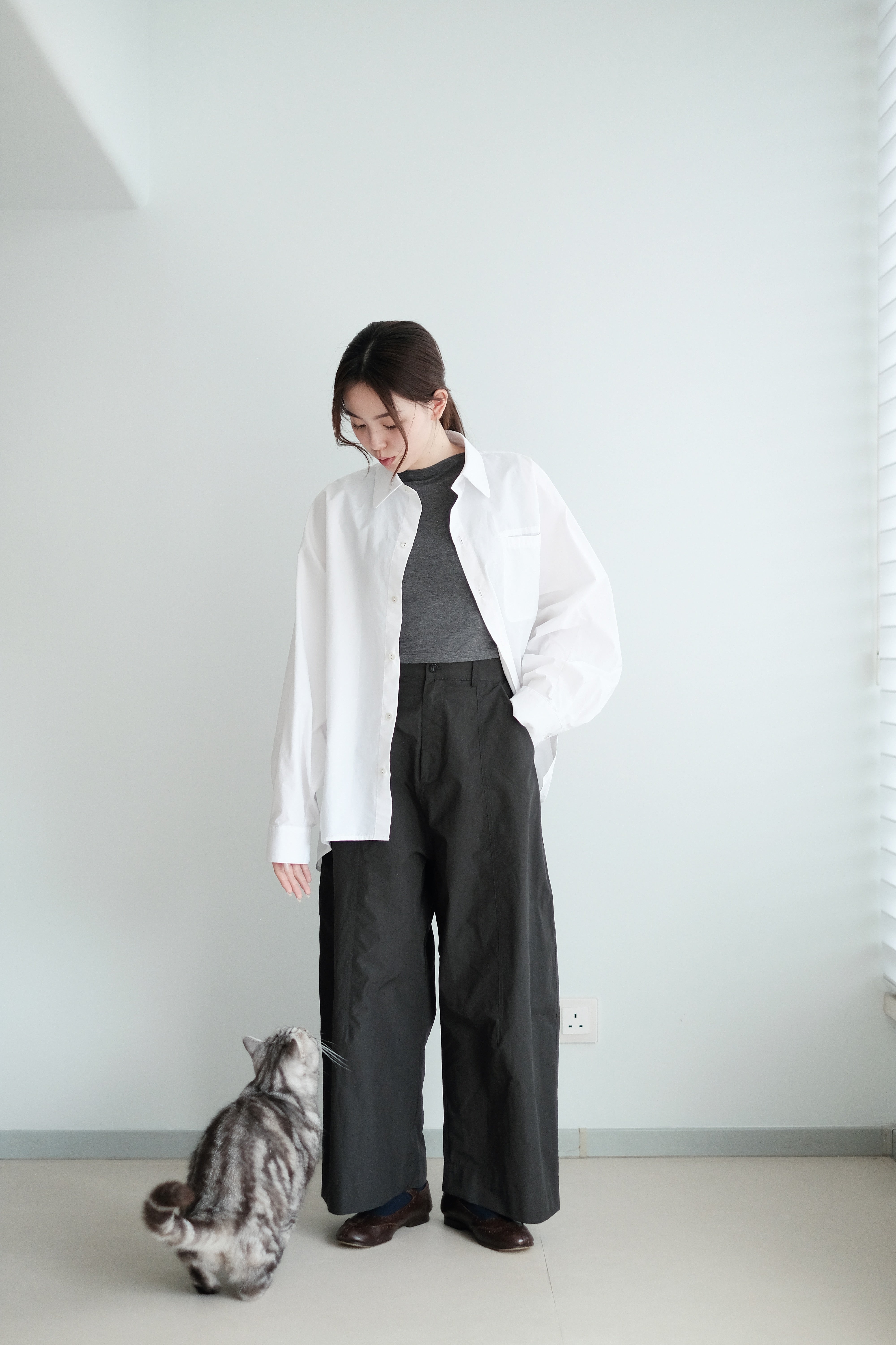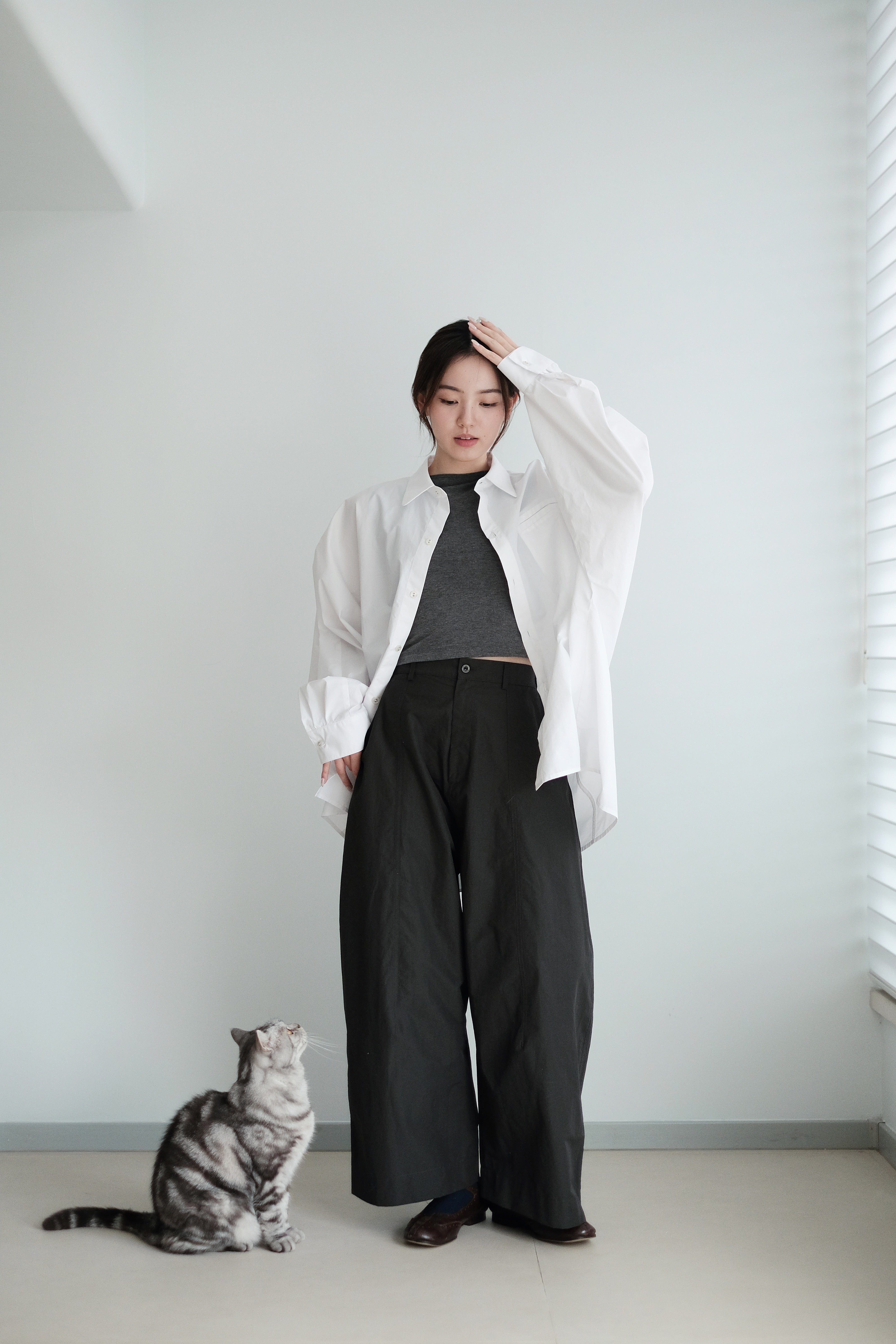 These pants feature an ultra-wide silhouette with a clean, structured cut that creates beautiful volume and movement as you walk. The high-waisted design elongates the legs, while the crisp yet lightweight fabric gives off a utilitarian, almost military-inspired feel. It’s a versatile piece that pairs effortlessly with both shirts and tees, blending style with everyday ease.