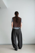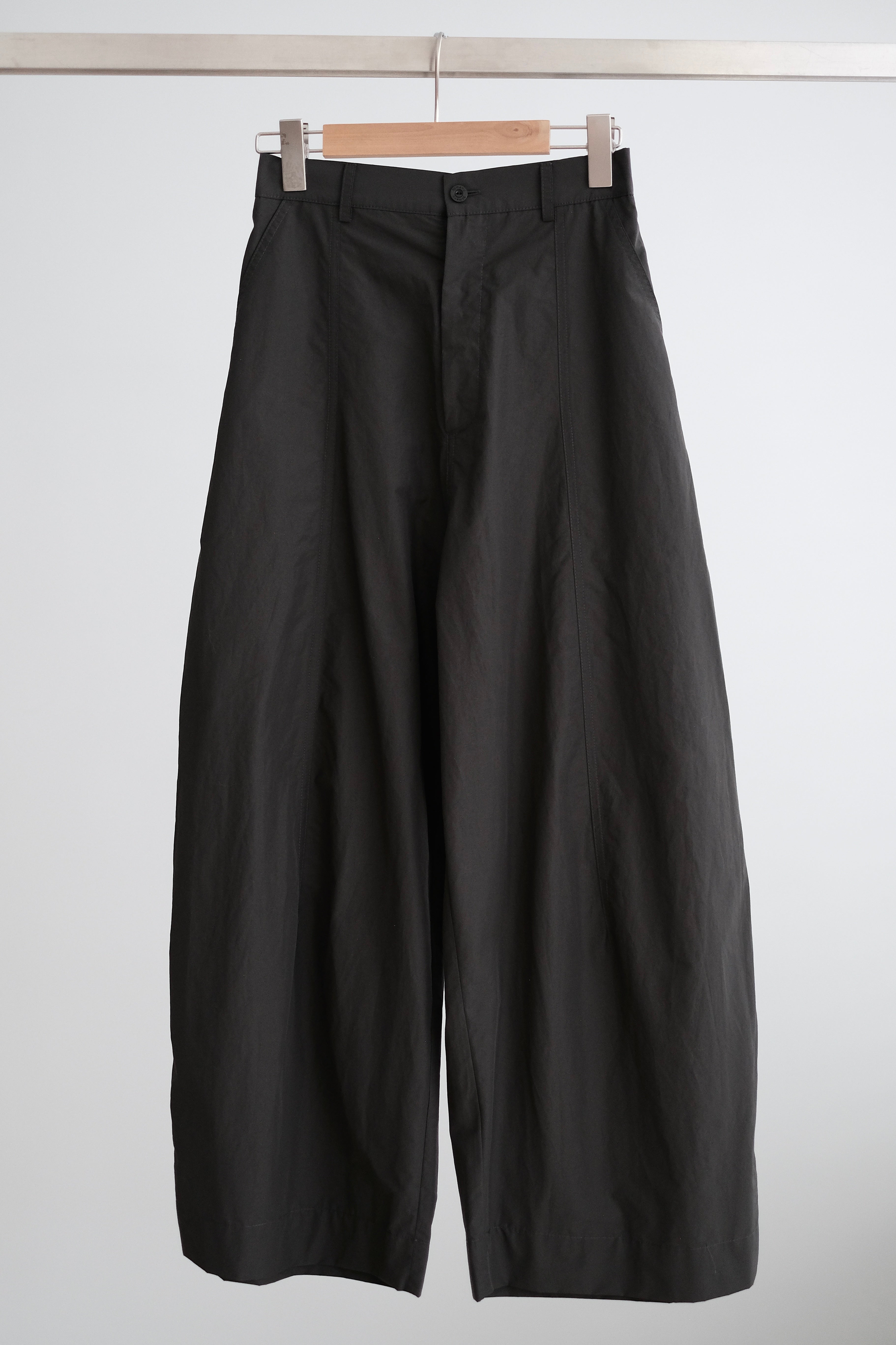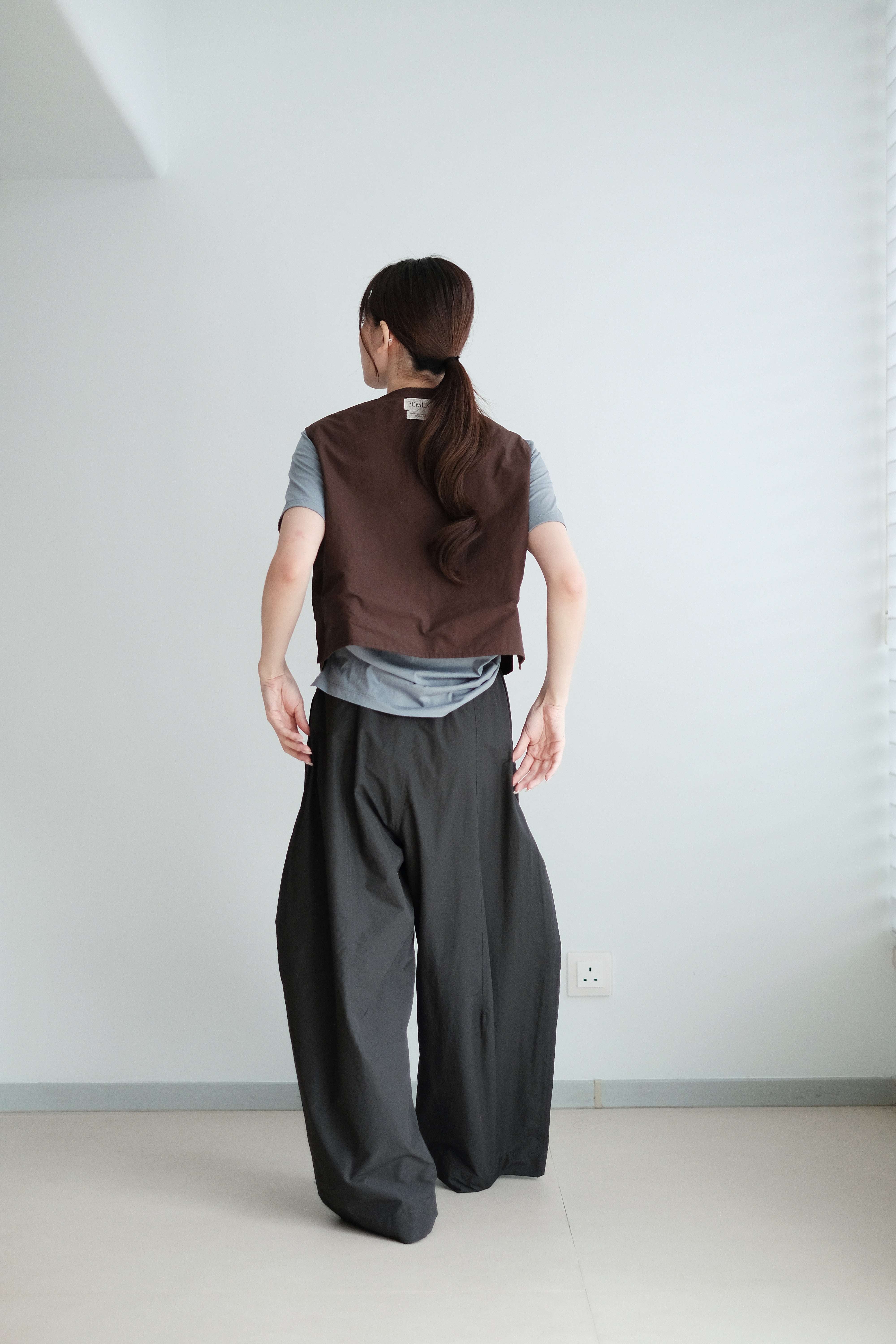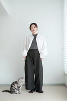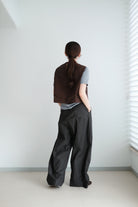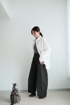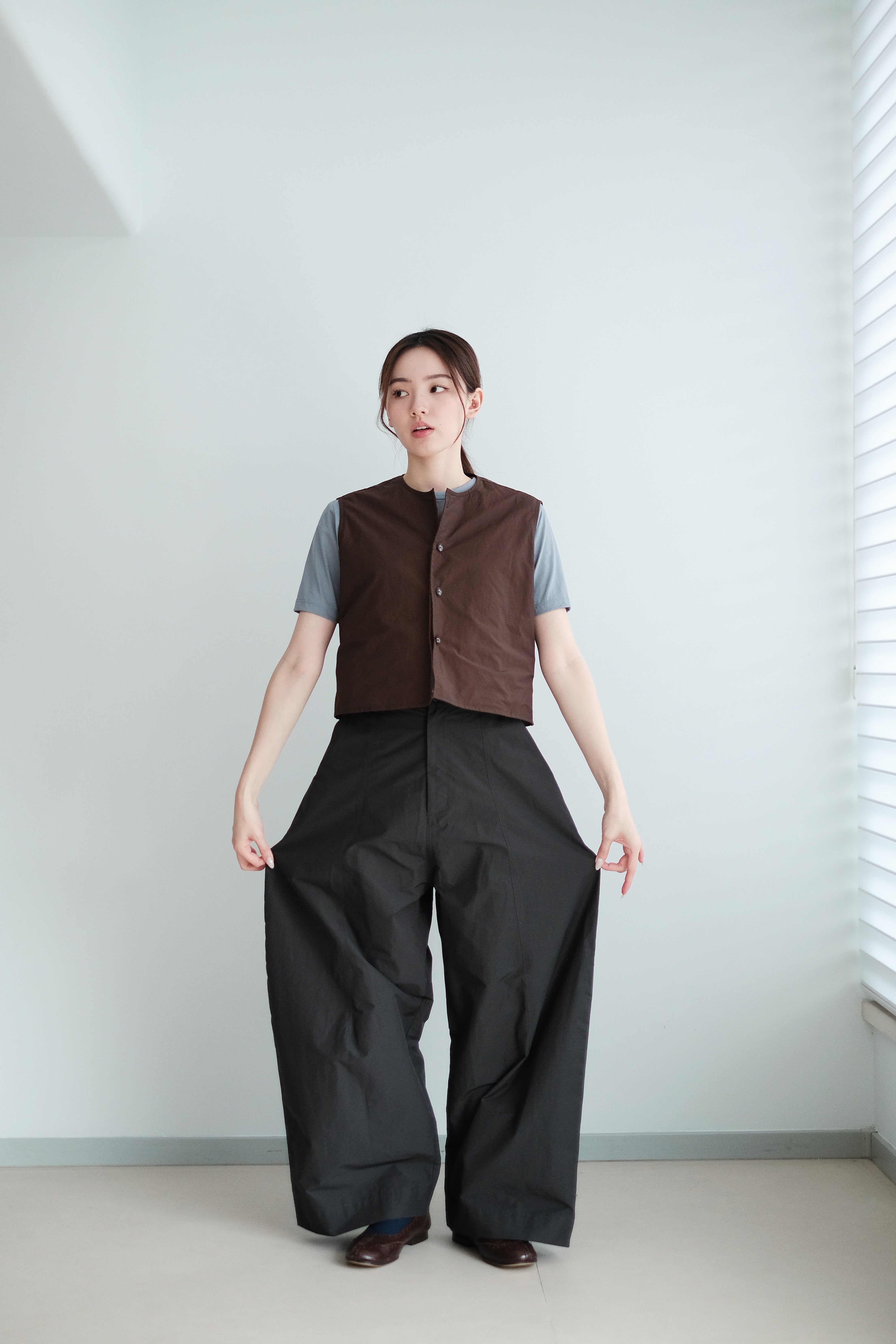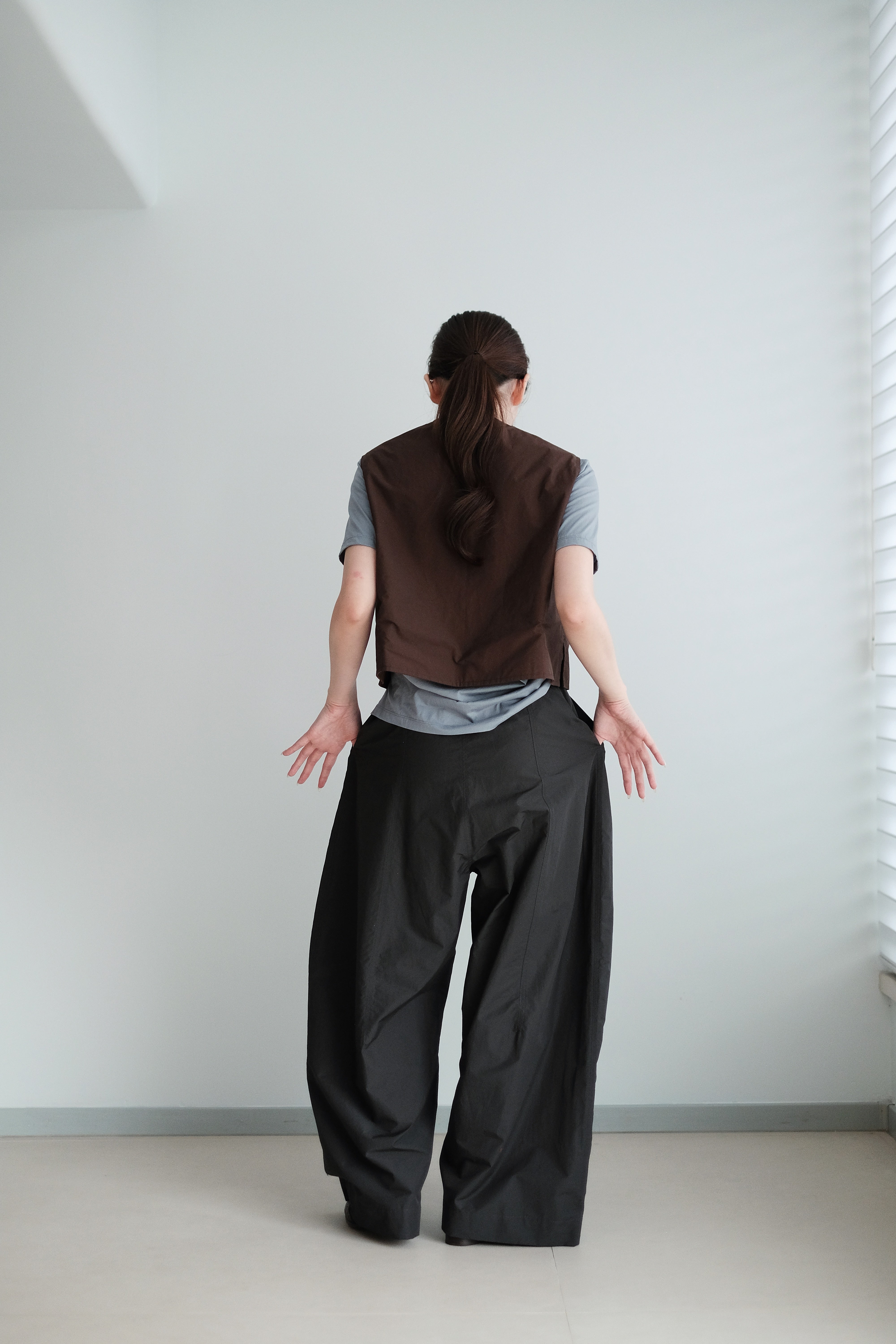 These pants feature an ultra-wide silhouette with a clean, structured cut that creates beautiful volume and movement as you walk. The high-waisted design elongates the legs, while the crisp yet lightweight fabric gives off a utilitarian, almost military-inspired feel. It’s a versatile piece that pairs effortlessly with both shirts and tees, blending style with everyday ease.