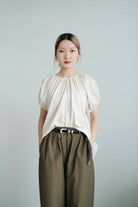 Crisp and lightweight wide-leg trousers crafted from a cotton-blend fabric with a slight sheen. Featuring a high-rise fit, elasticated waistband and belt loops, this pair is designed for comfort and versatility. The structured wide-leg silhouette makes it easy to pair with basic tees, shirts, or vests for a clean, effortless look.