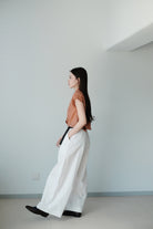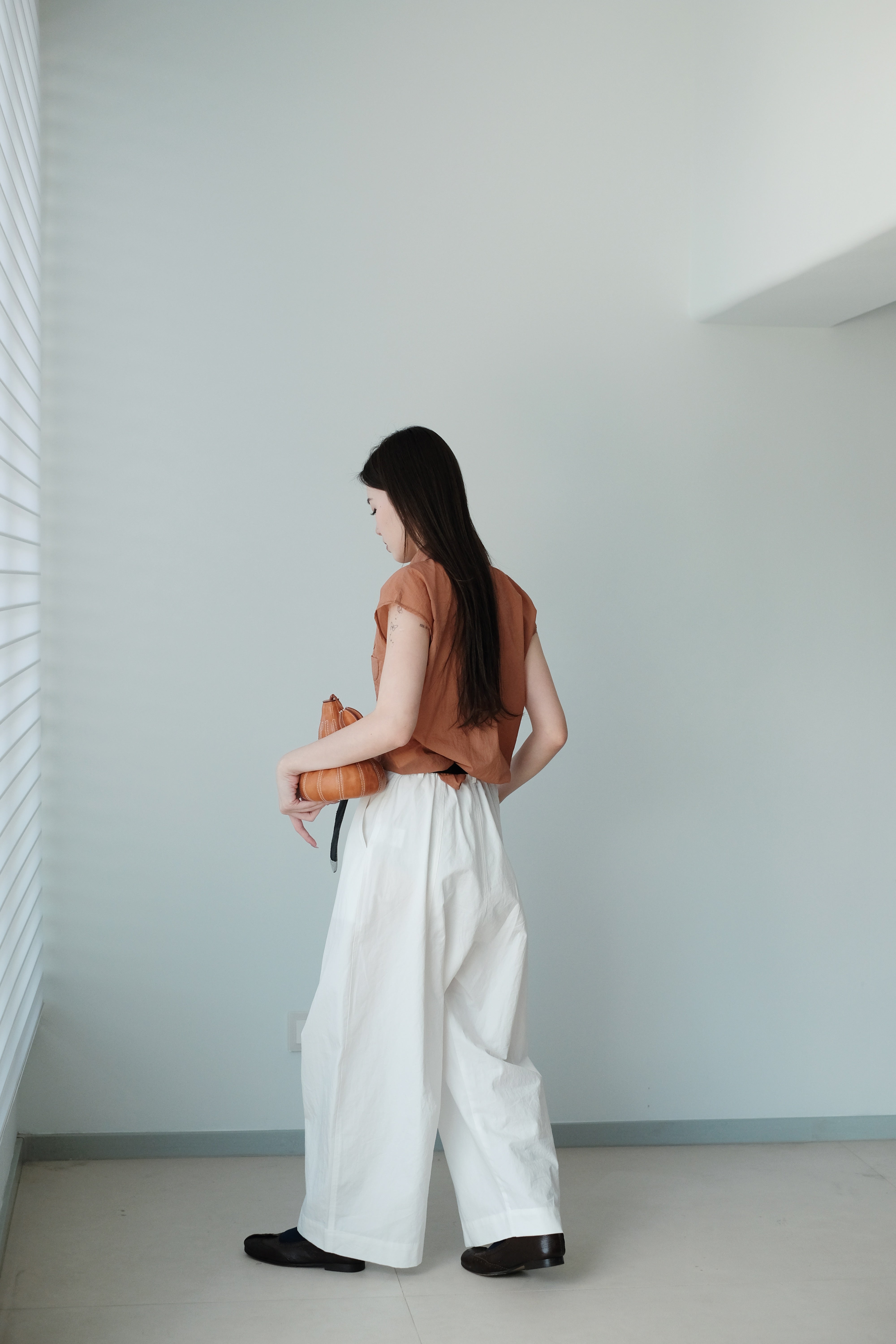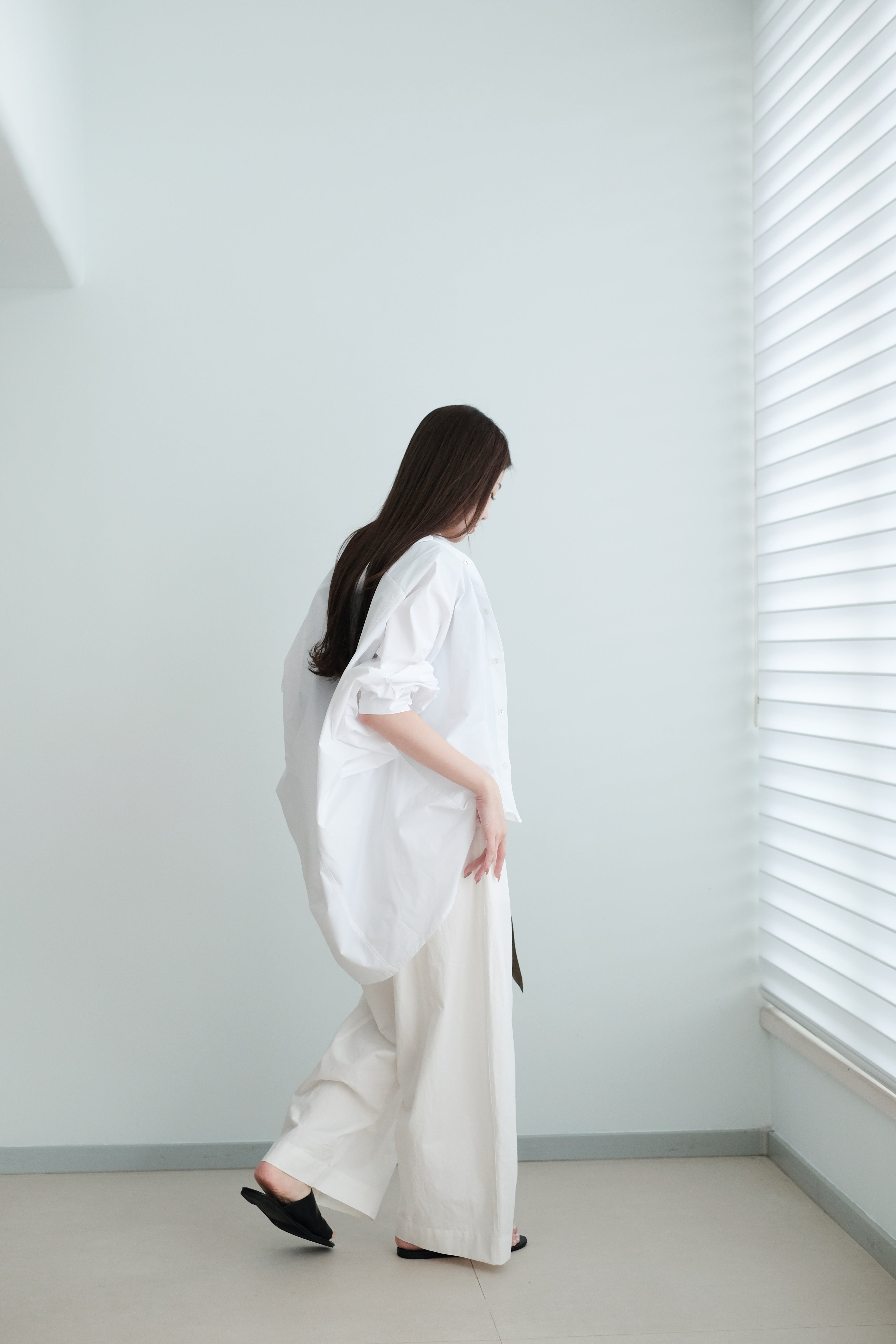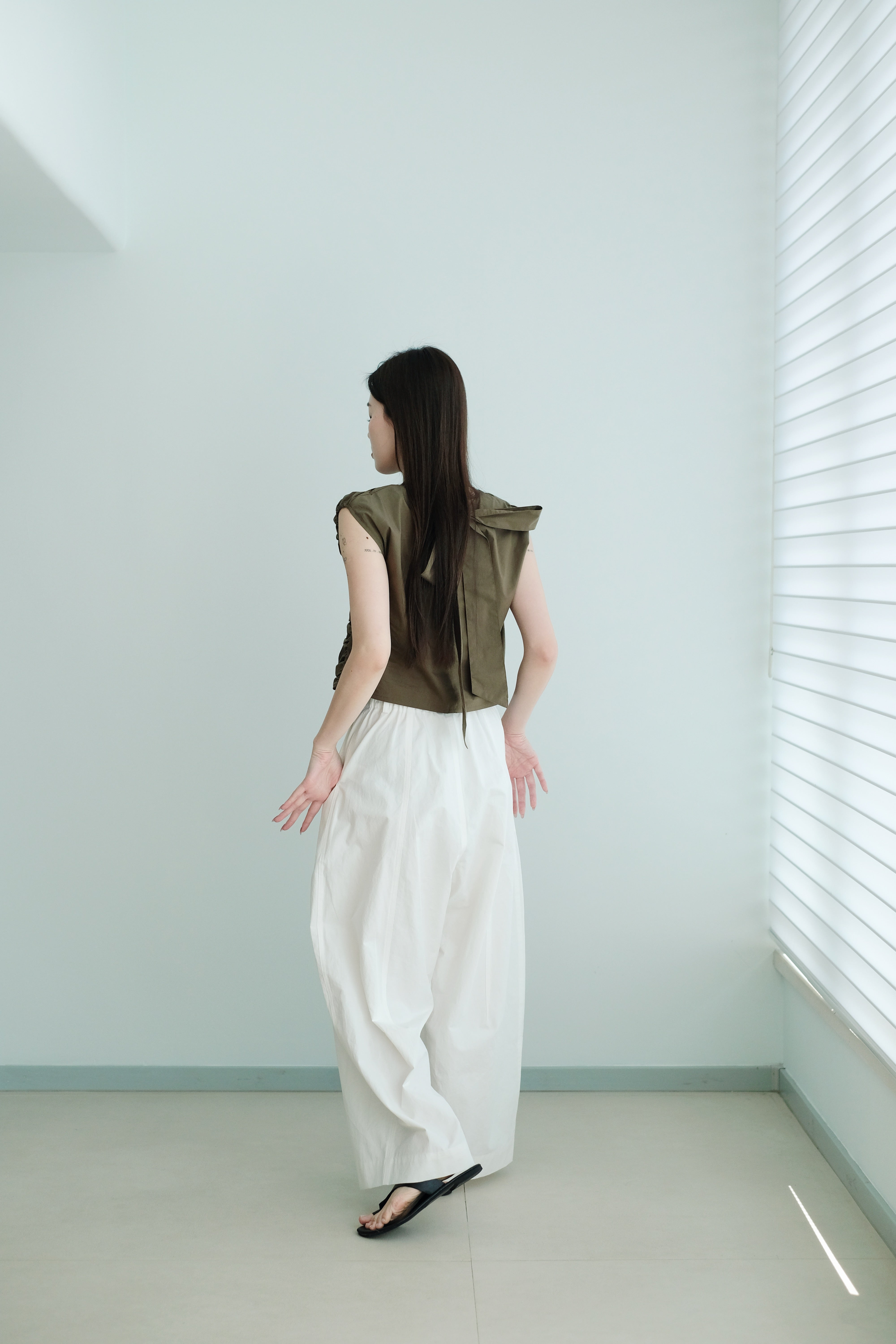 These pants feature an ultra-wide silhouette with a clean, structured cut that creates beautiful volume and movement as you walk. The high-waisted design elongates the legs, while the crisp yet lightweight fabric gives off a utilitarian, almost military-inspired feel. It’s a versatile piece that pairs effortlessly with both shirts and tees, blending style with everyday ease.