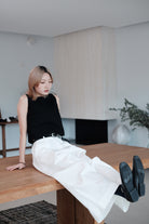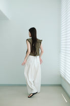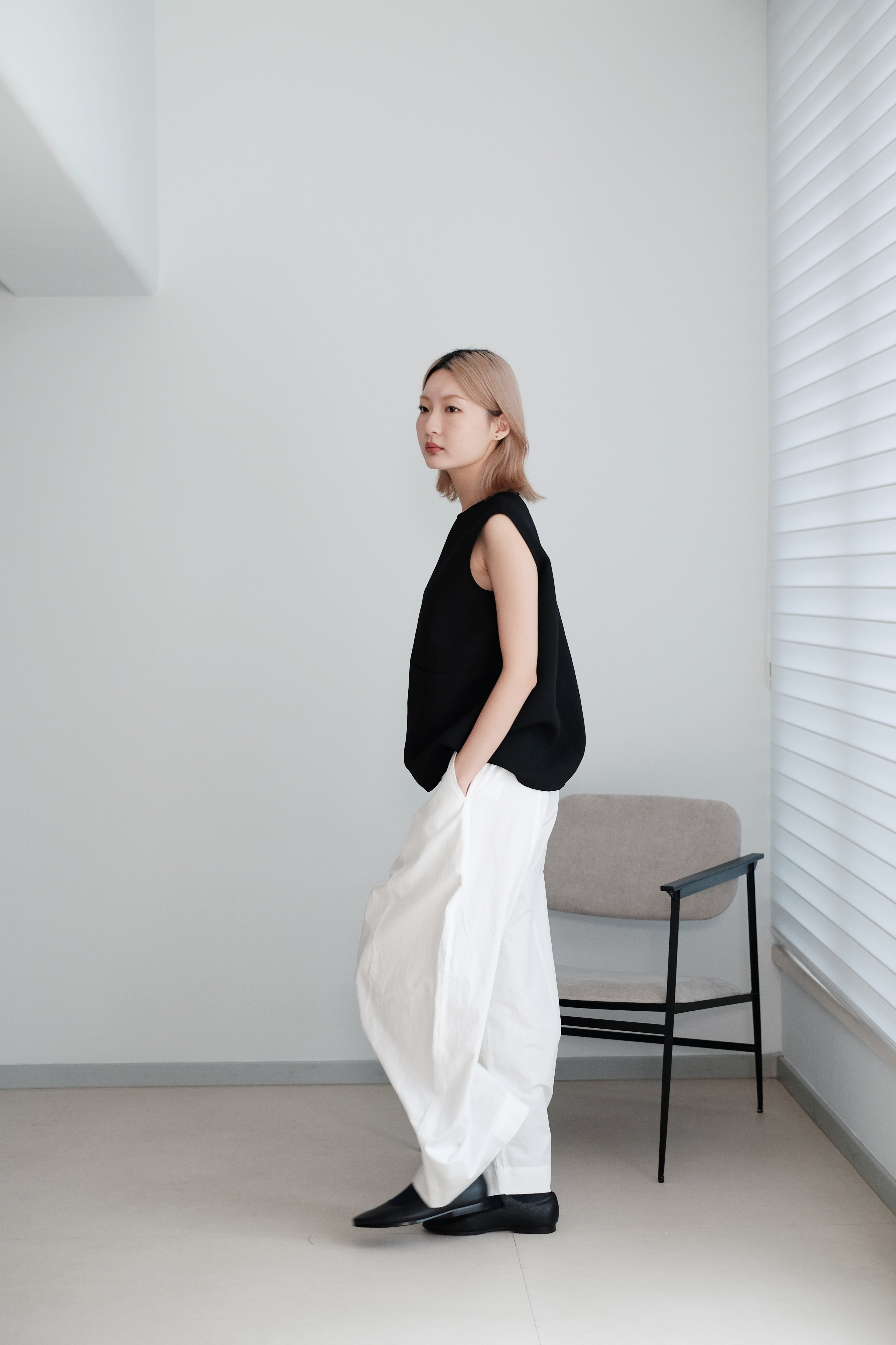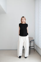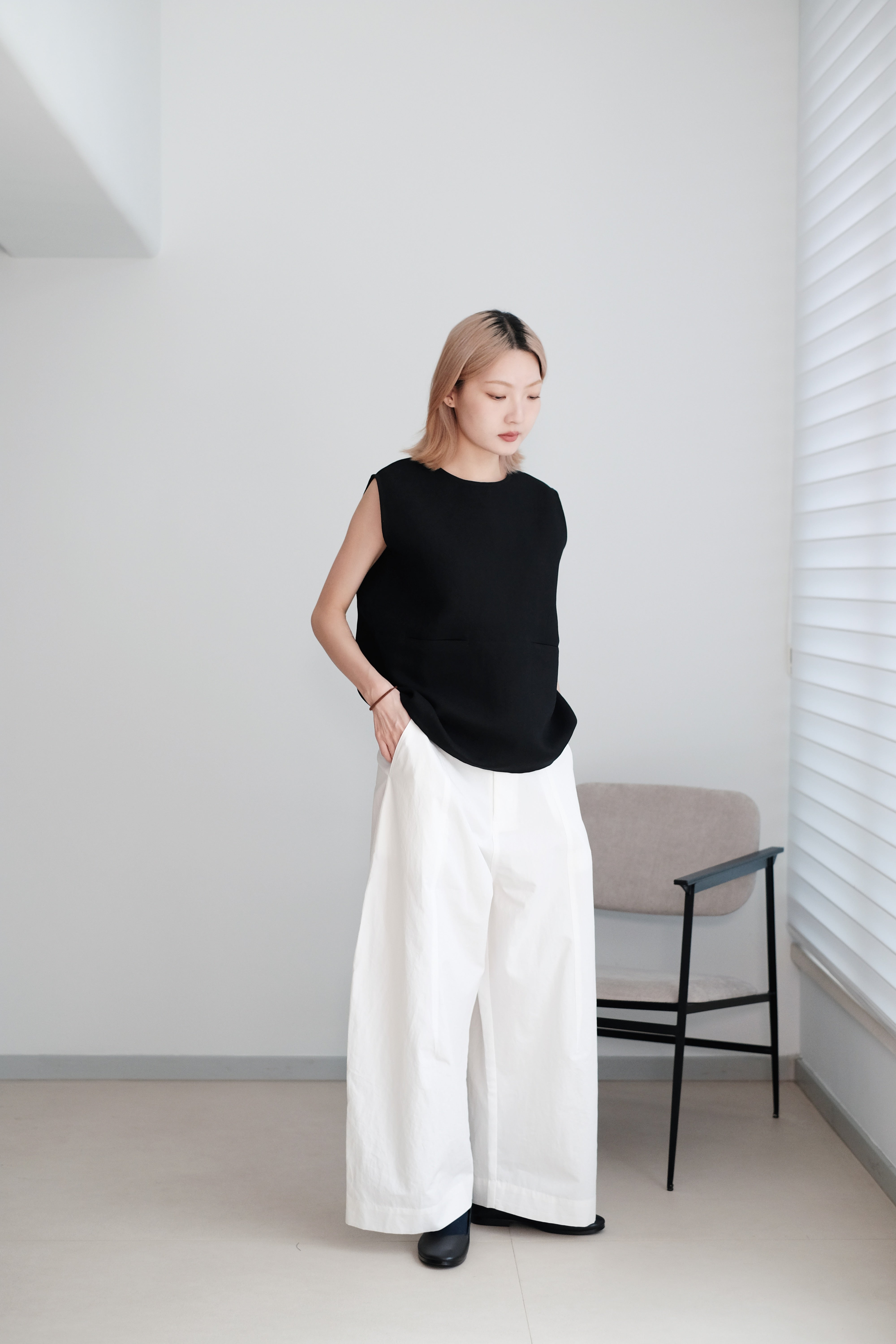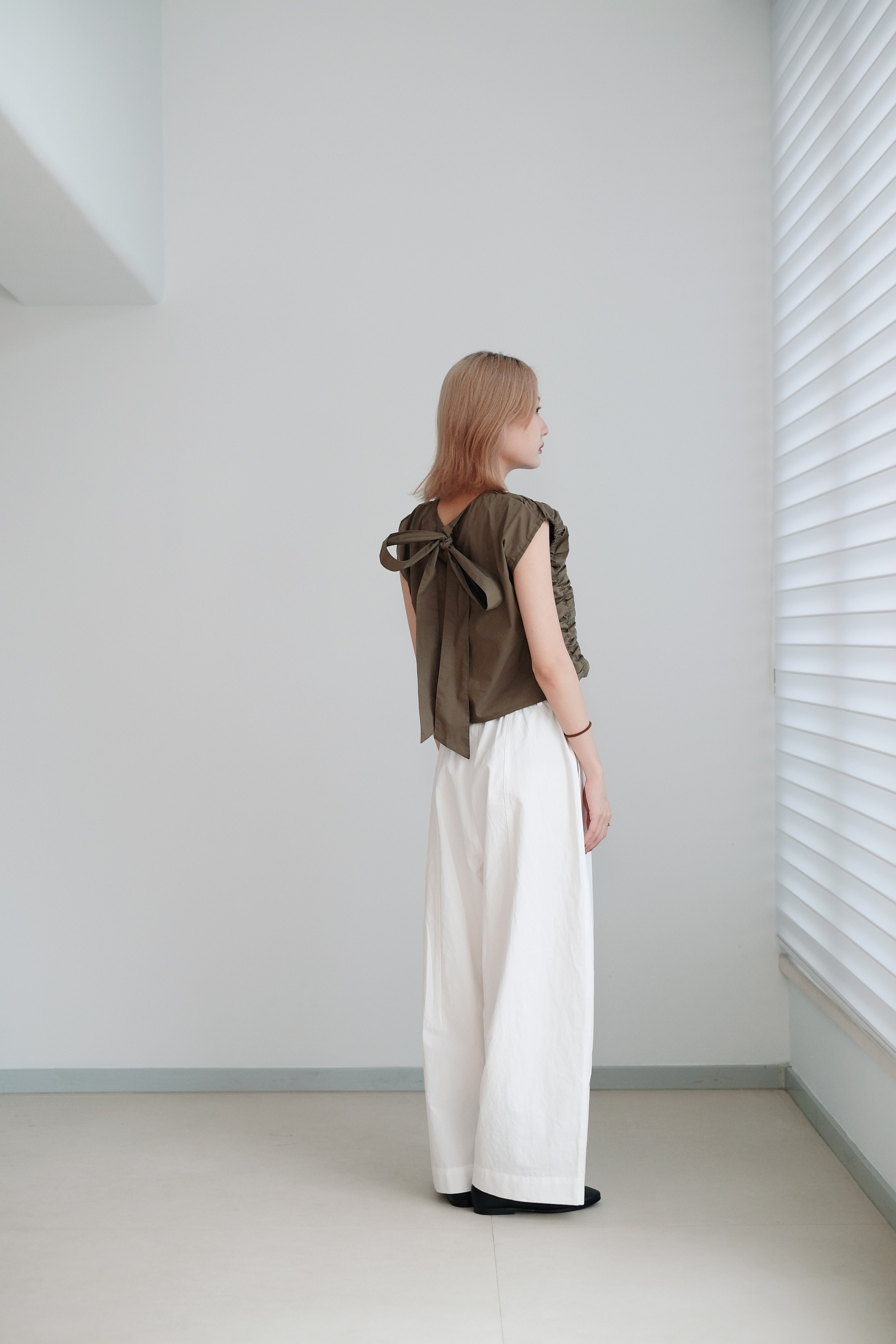 These pants feature an ultra-wide silhouette with a clean, structured cut that creates beautiful volume and movement as you walk. The high-waisted design elongates the legs, while the crisp yet lightweight fabric gives off a utilitarian, almost military-inspired feel. It’s a versatile piece that pairs effortlessly with both shirts and tees, blending style with everyday ease.