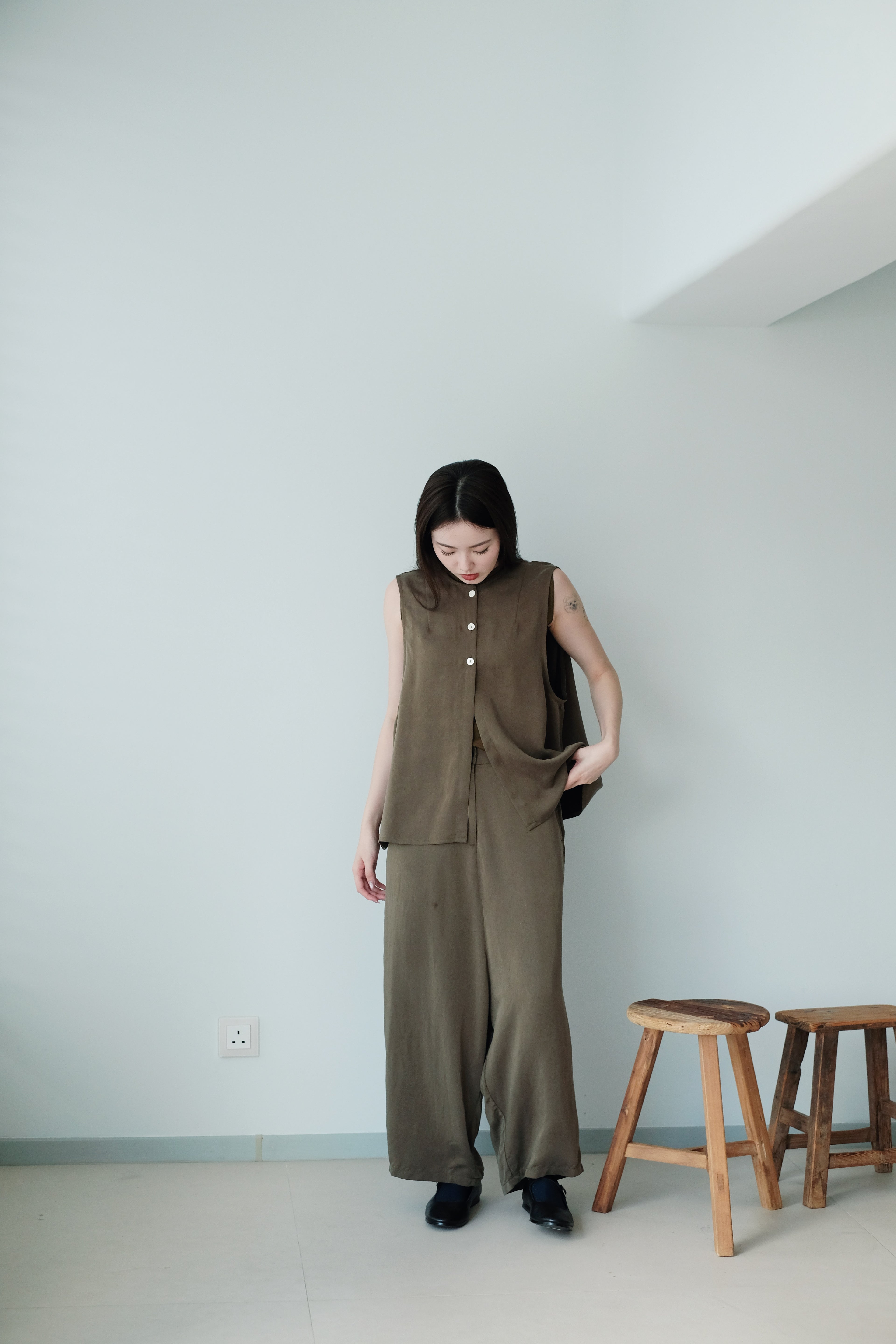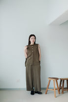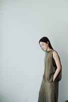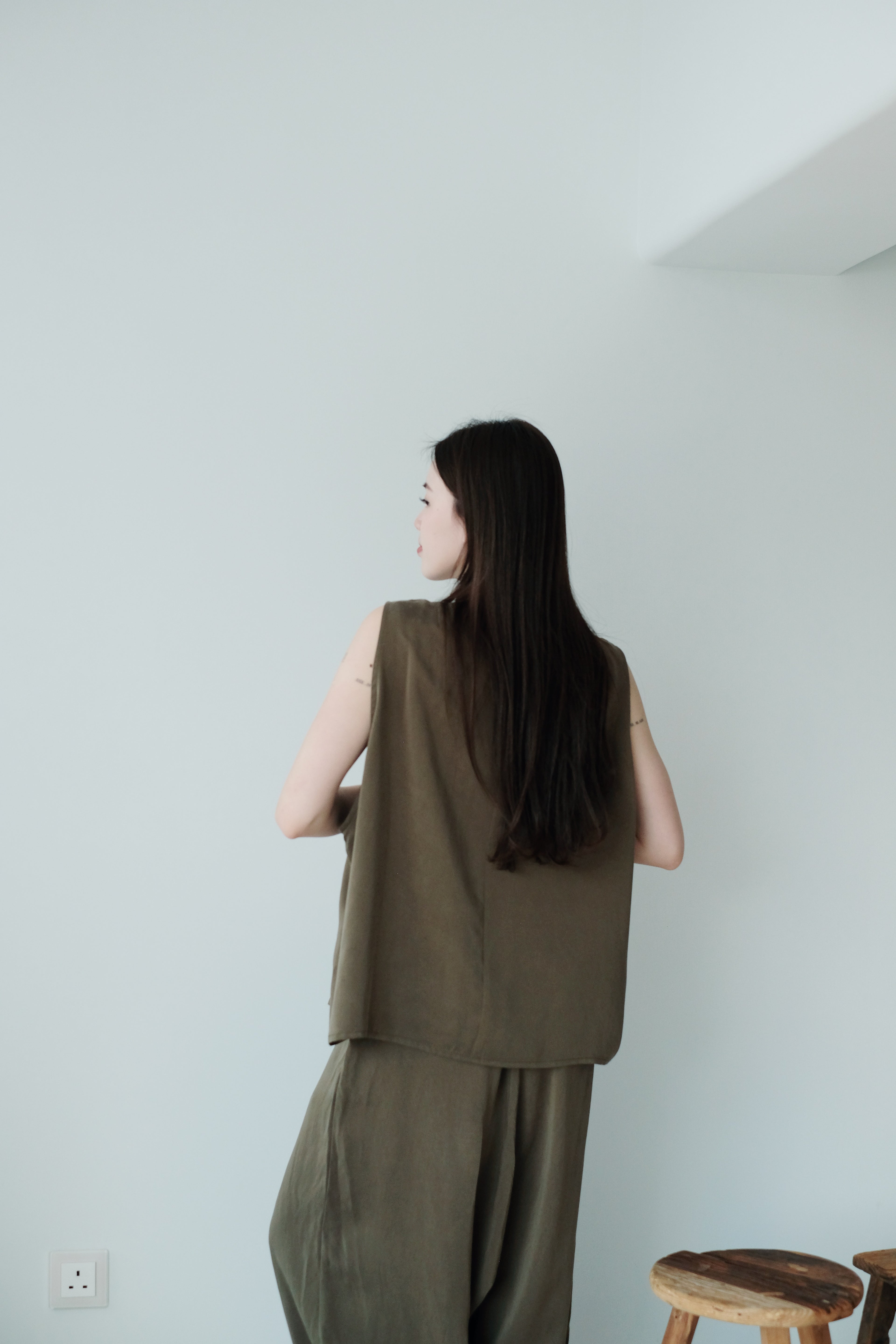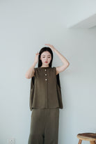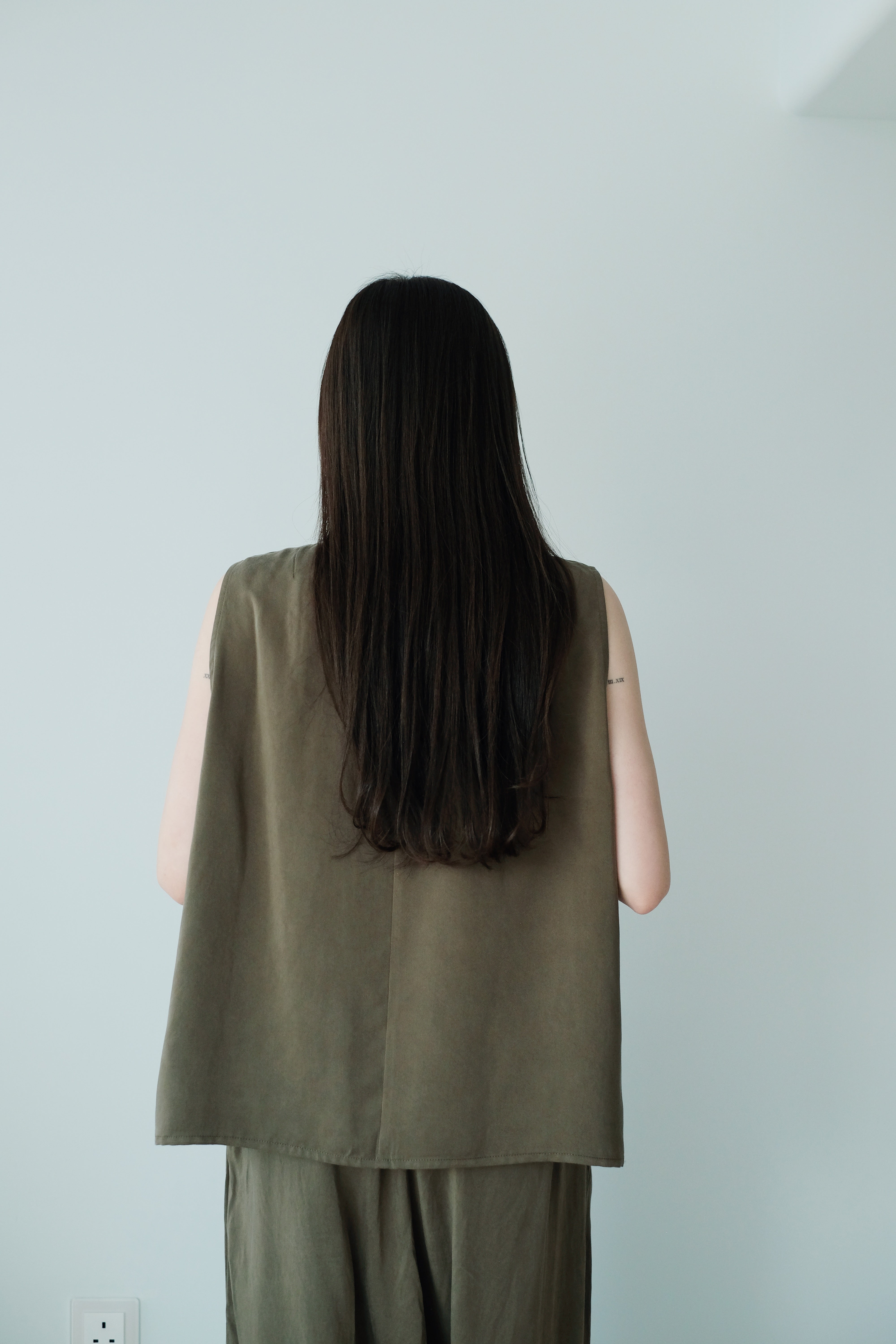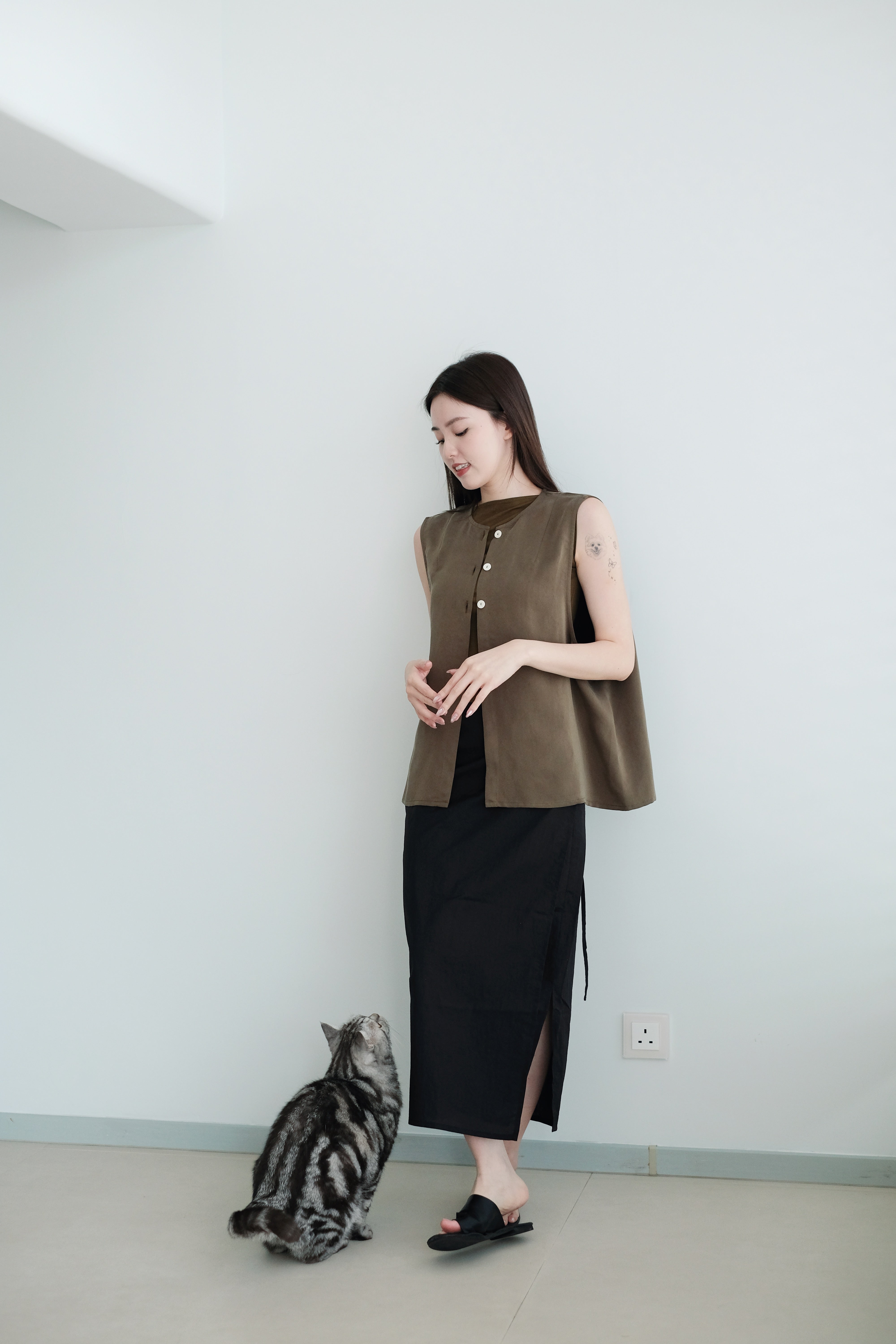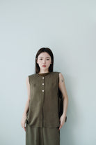 A refined sleeveless top in a forest green. Featuring a structured cut and front button detail, it works beautifully as a standalone piece or layered over light blouses and dresses.