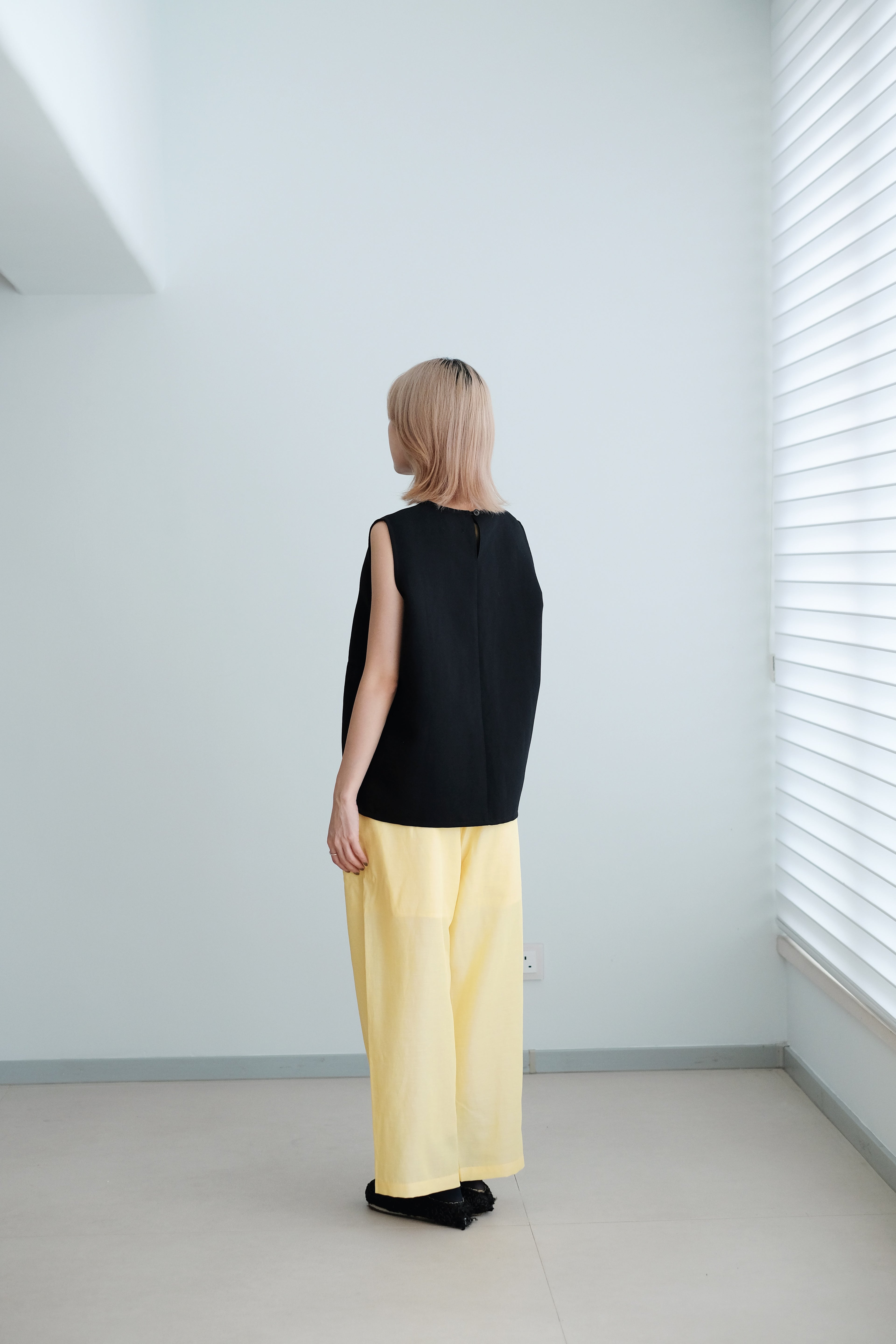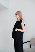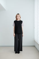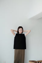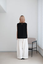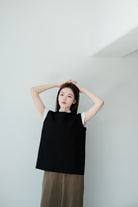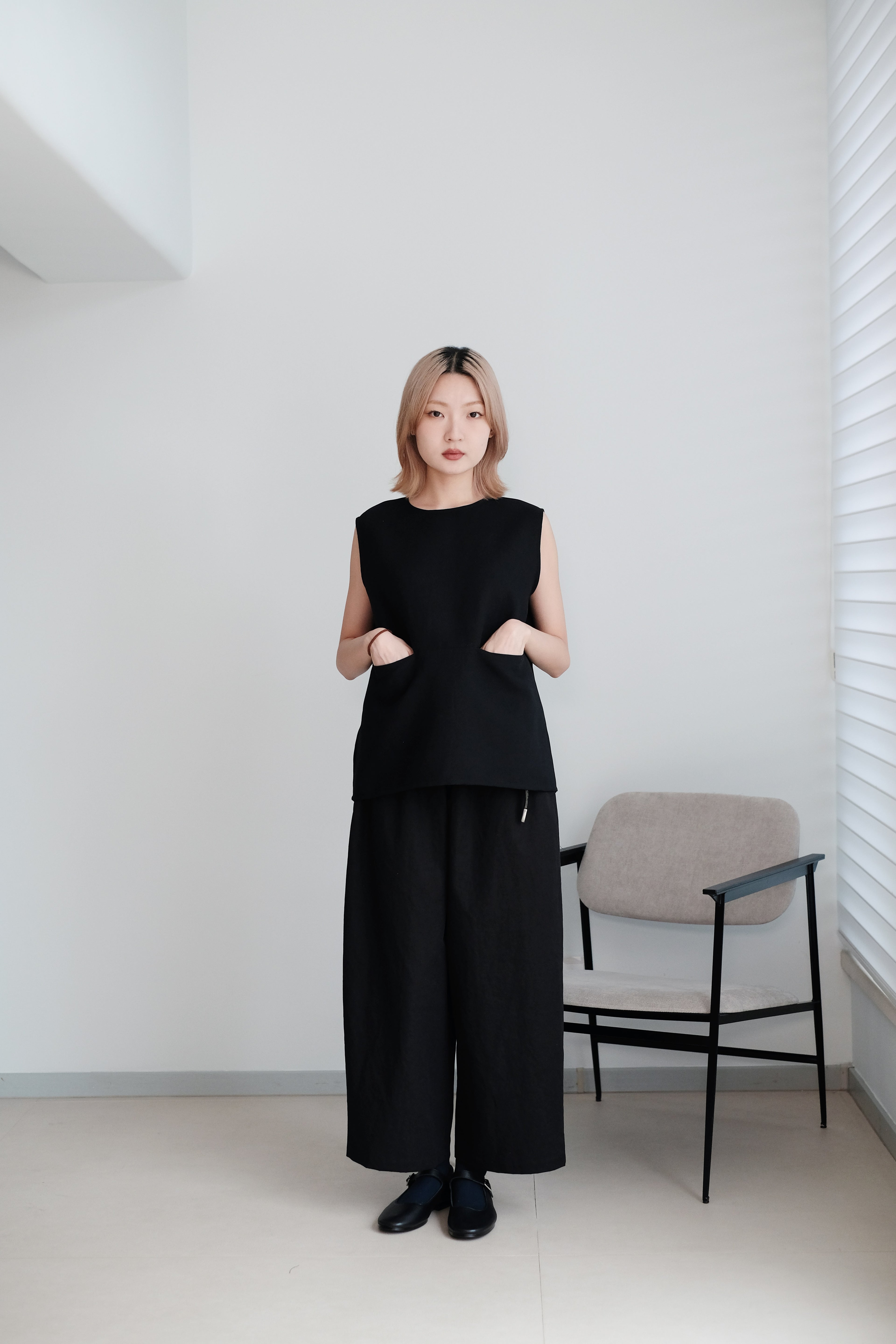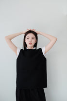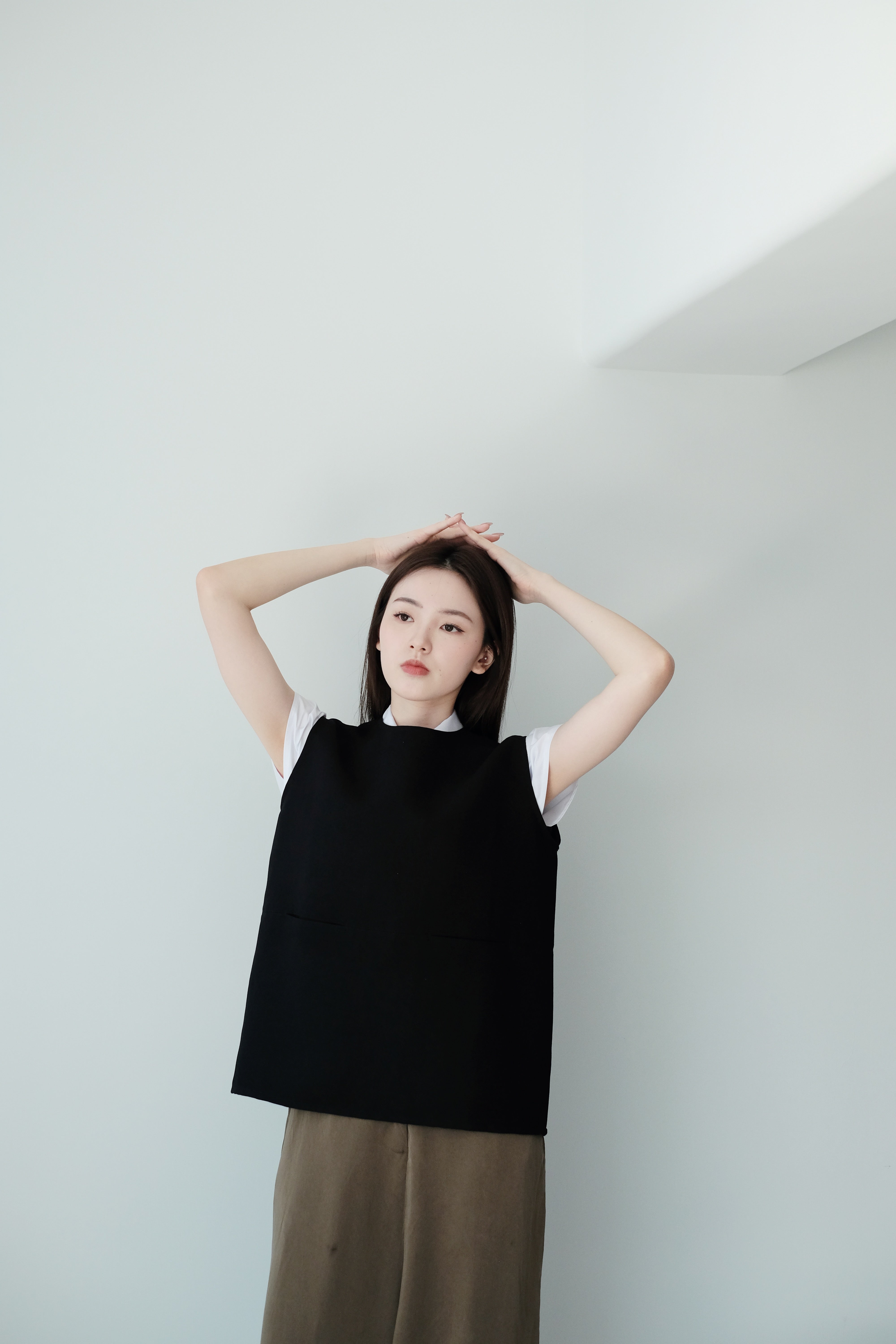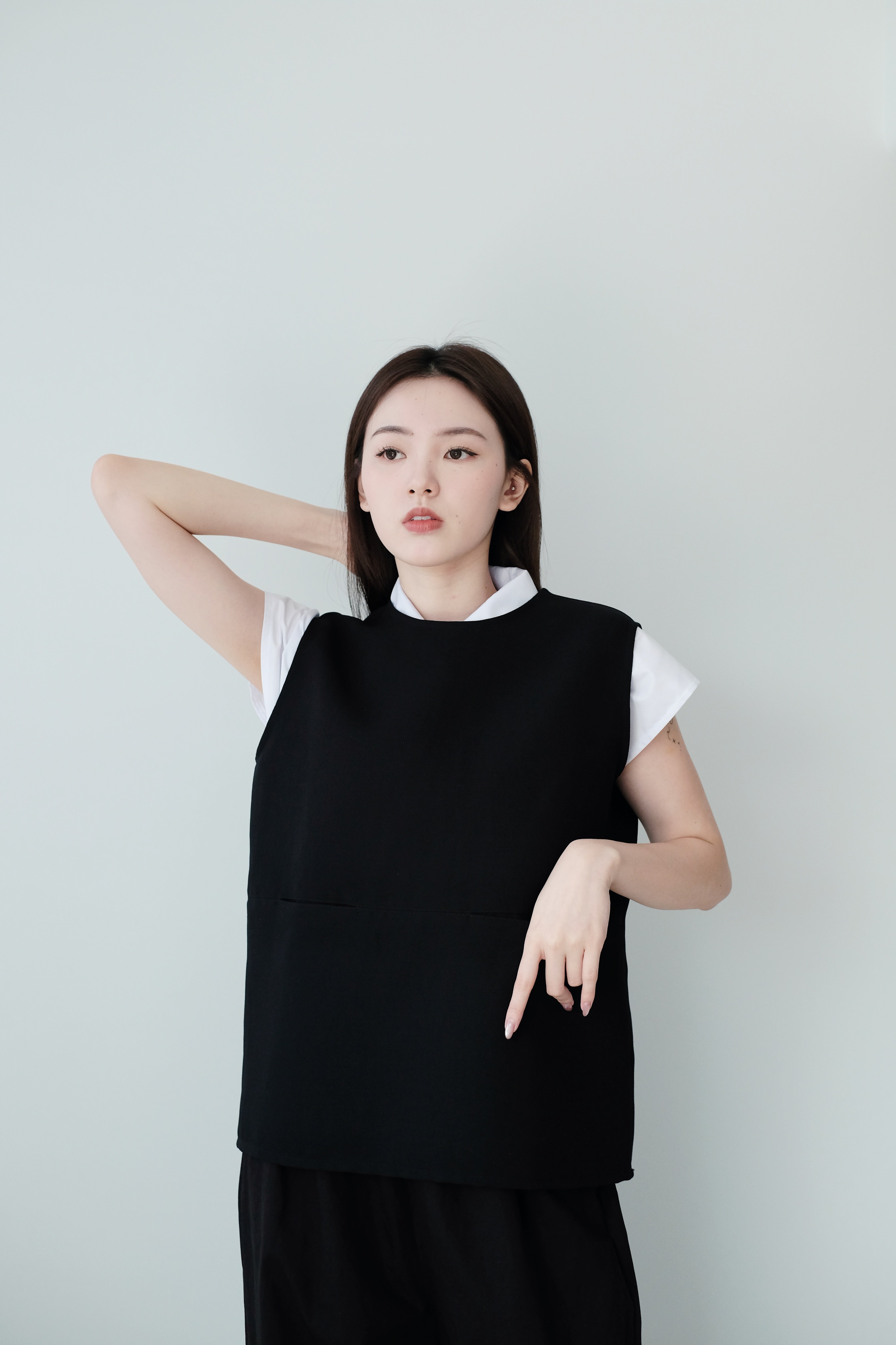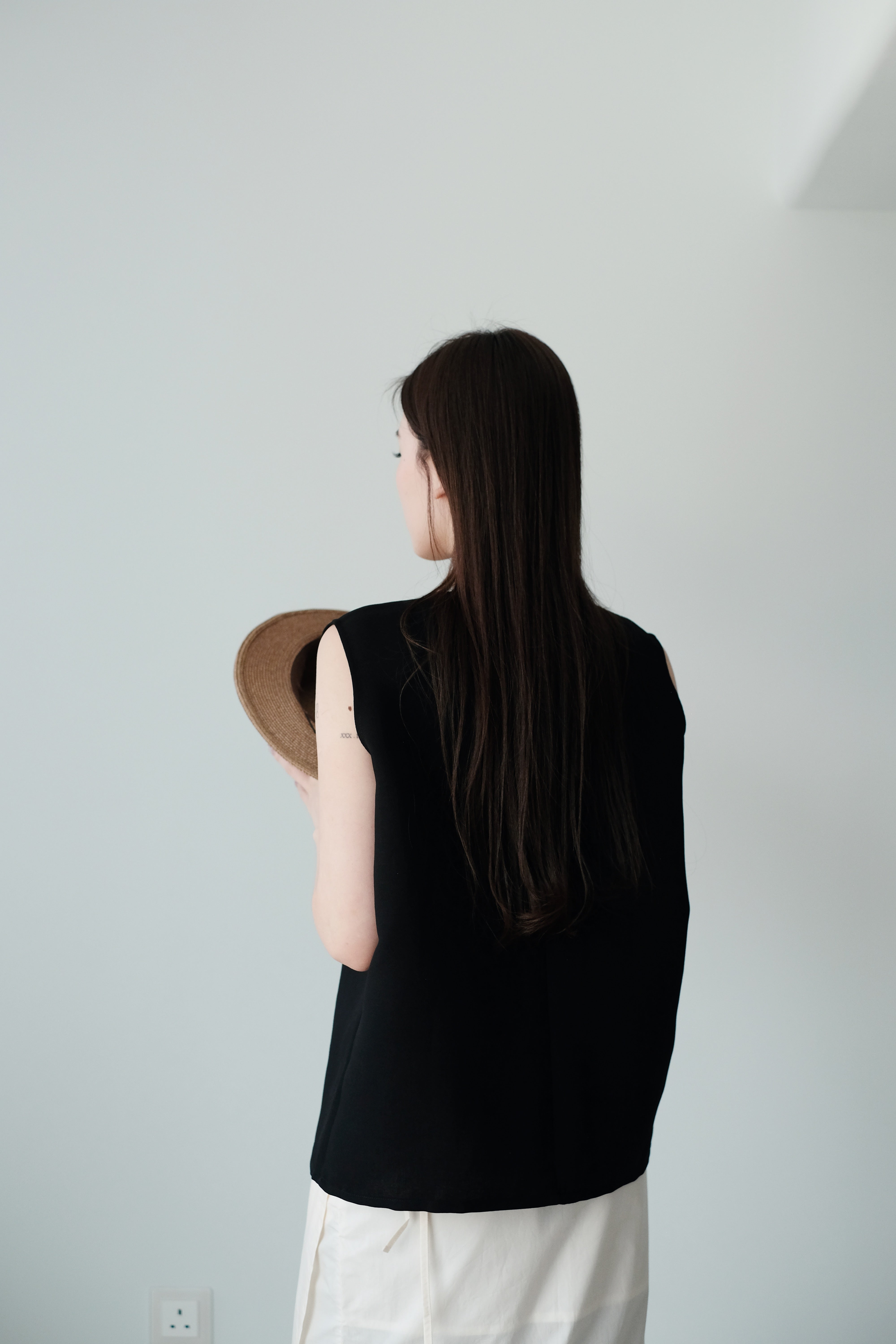 This black sleeveless top features a clean, structured cut with a round neckline. The fabric holds its shape without feeling heavy, keeping the silhouette crisp. Falling just below the waist, it works well on its own or layered, pairing effortlessly with wide-leg pants or skirts for a sharp and modern look.