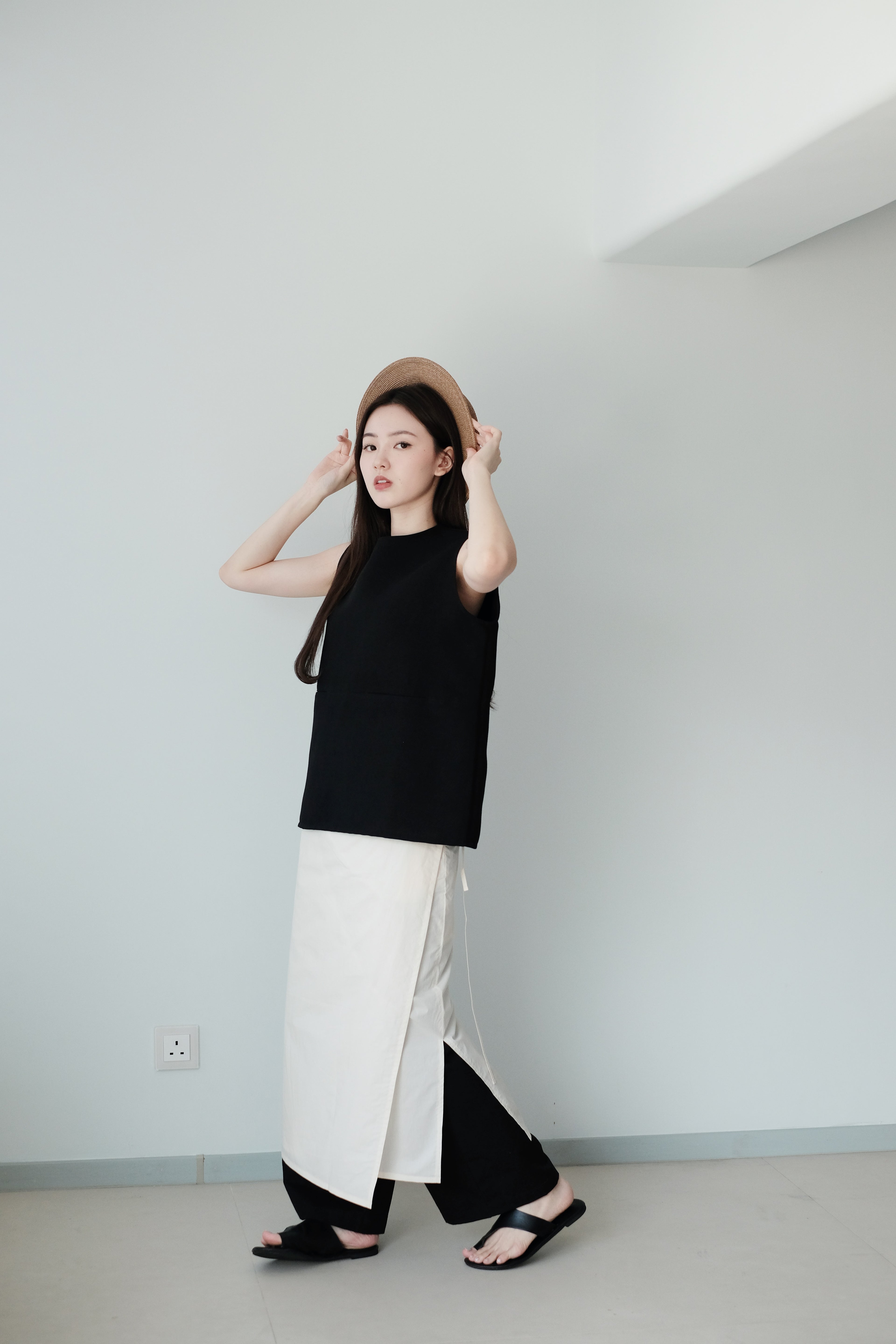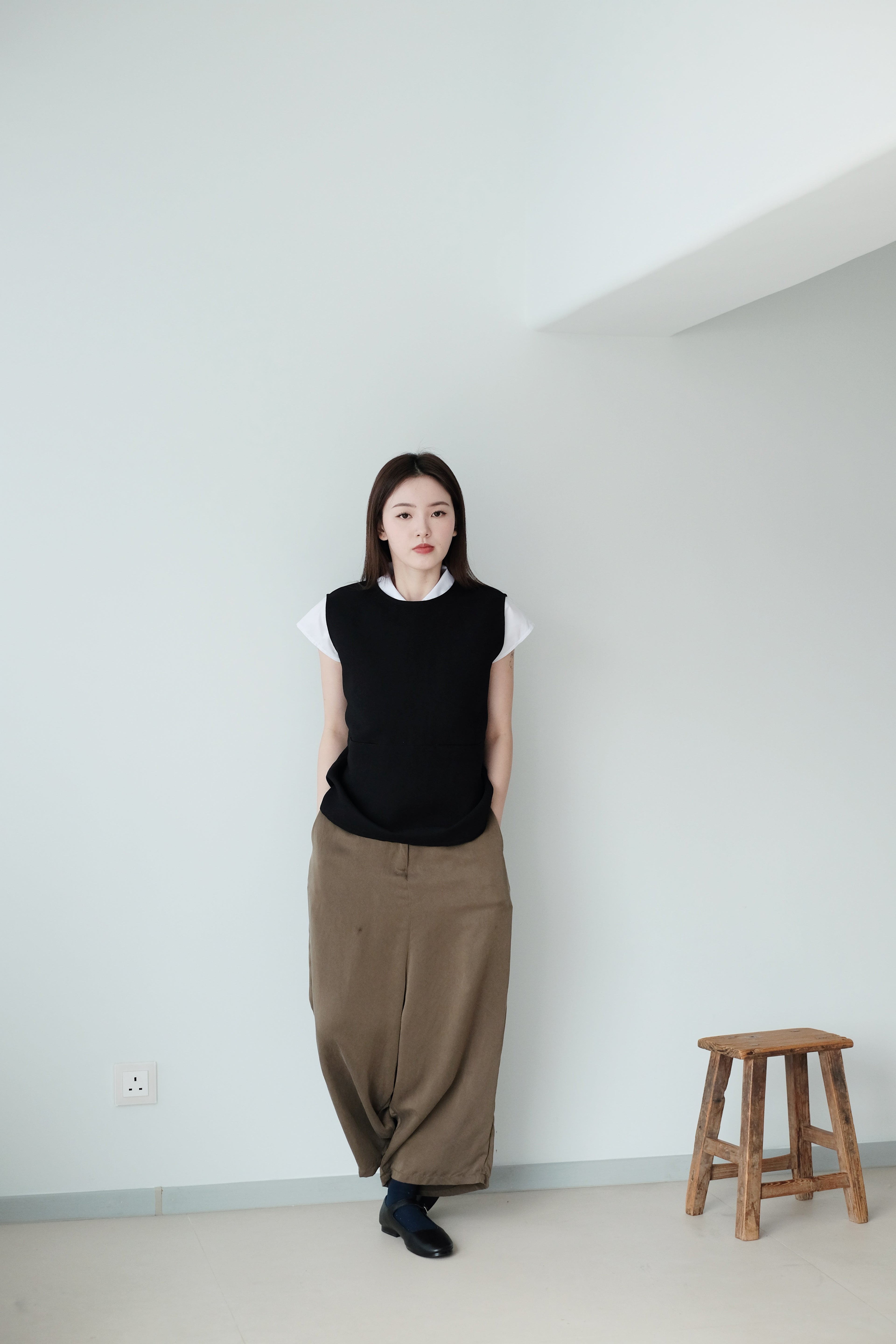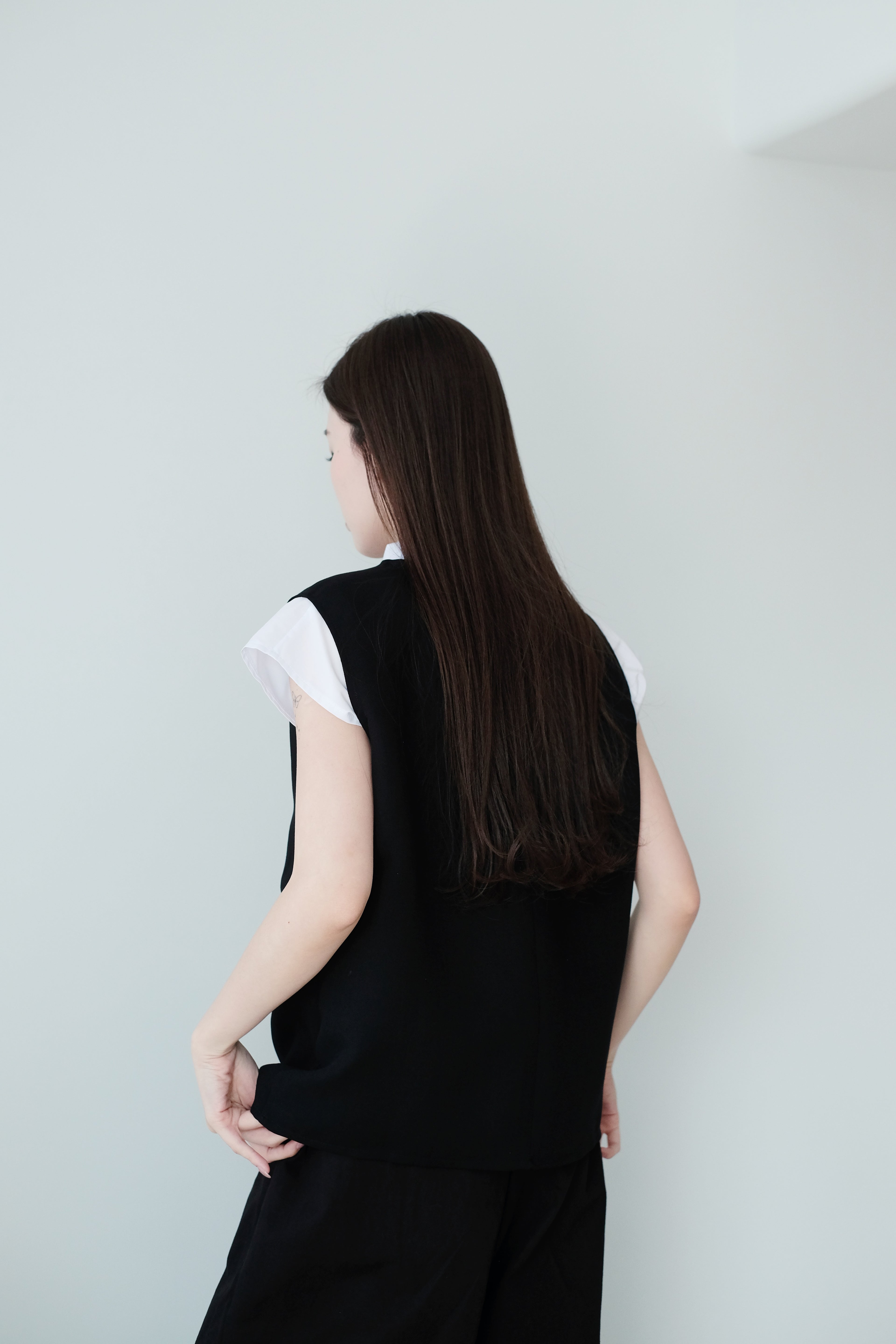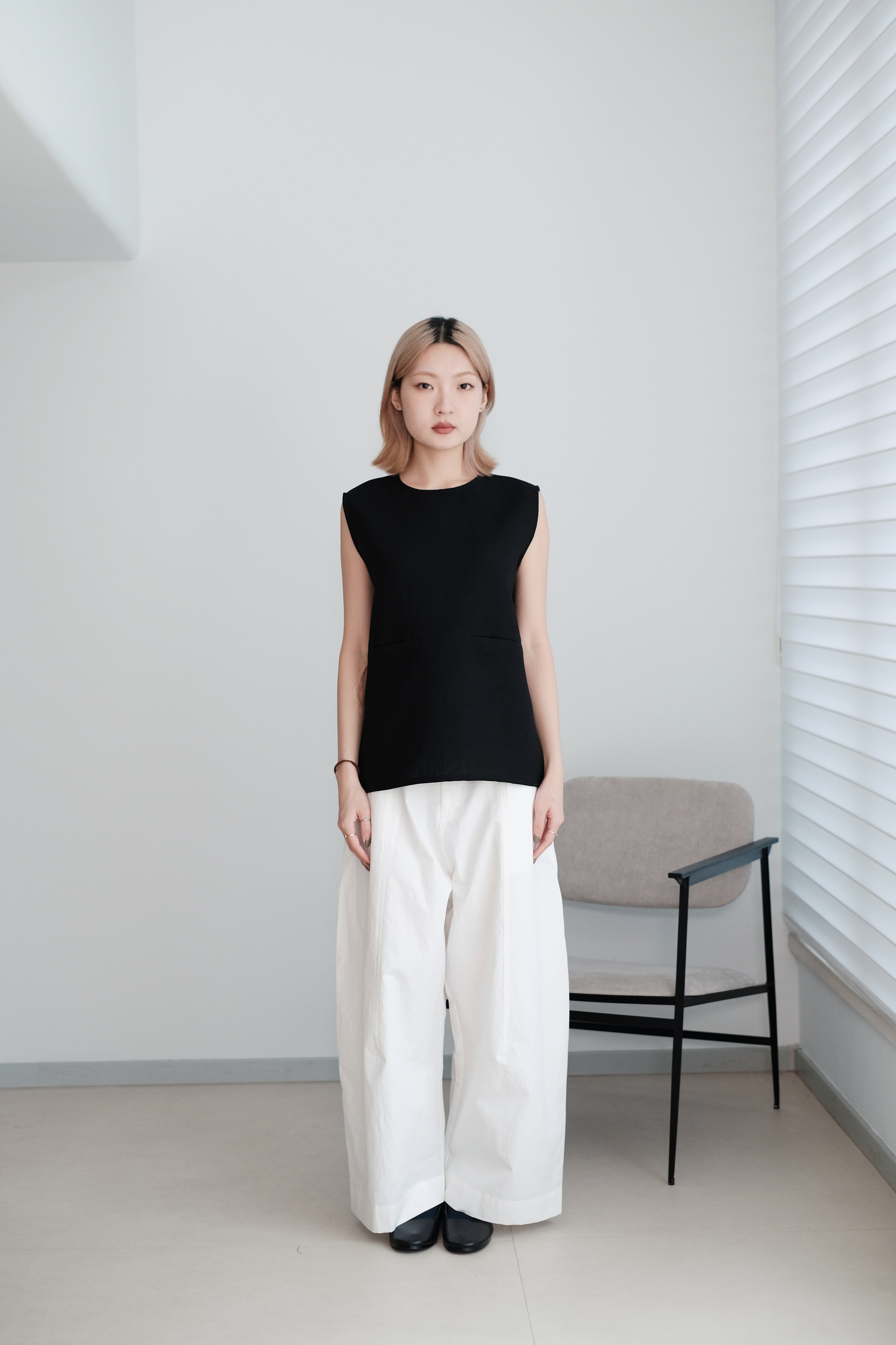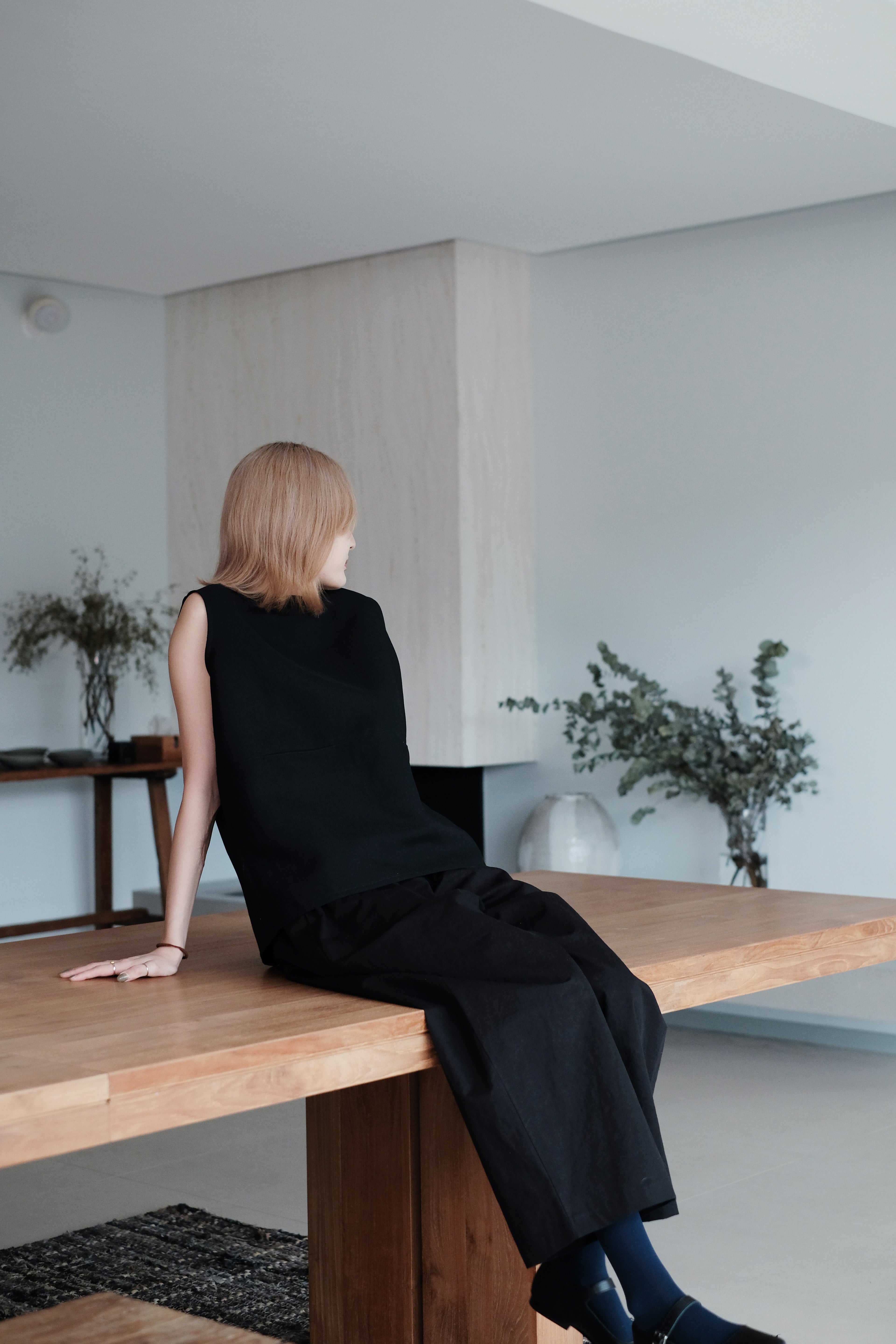 This black sleeveless top features a clean, structured cut with a round neckline. The fabric holds its shape without feeling heavy, keeping the silhouette crisp. Falling just below the waist, it works well on its own or layered, pairing effortlessly with wide-leg pants or skirts for a sharp and modern look.