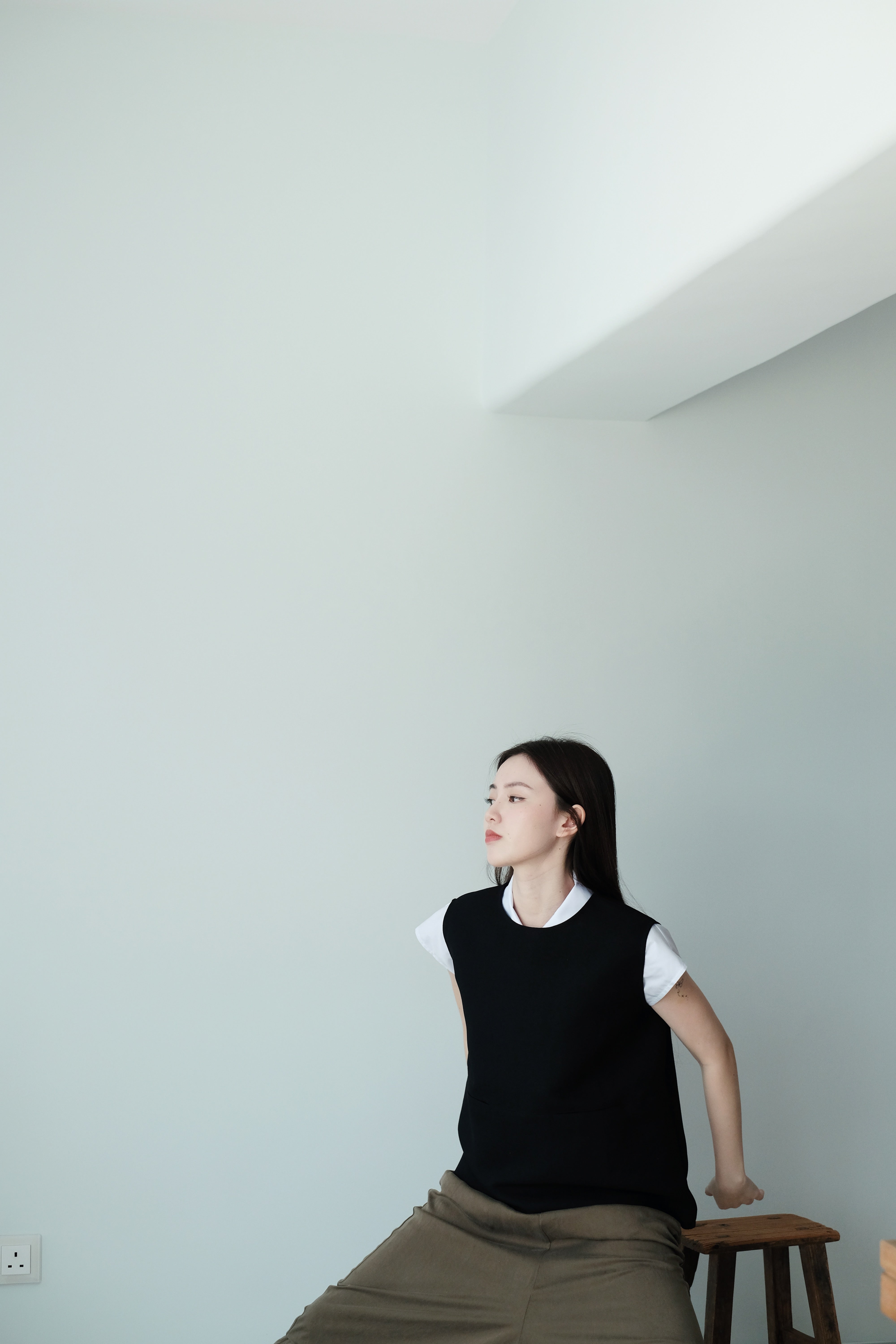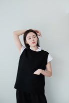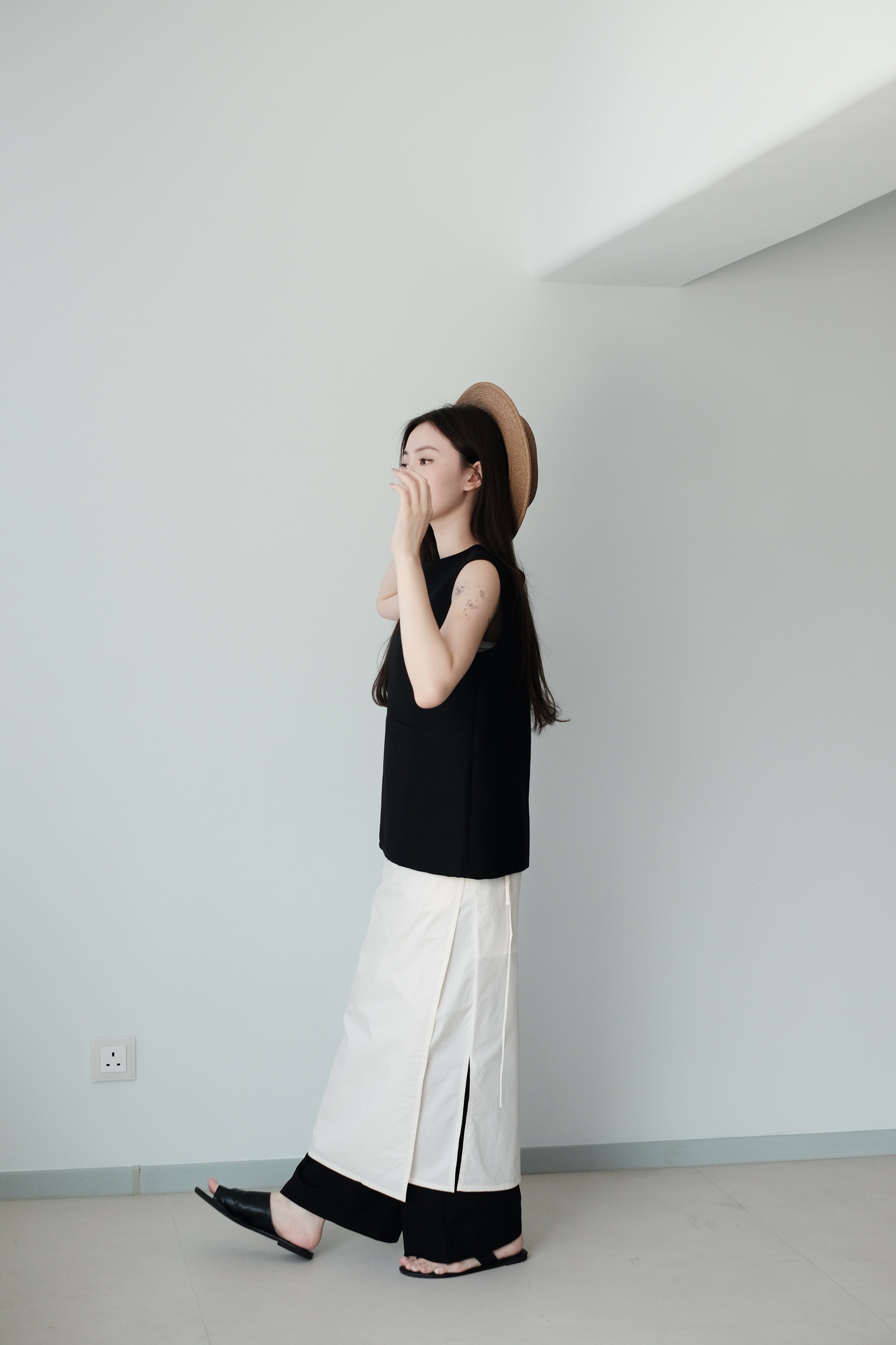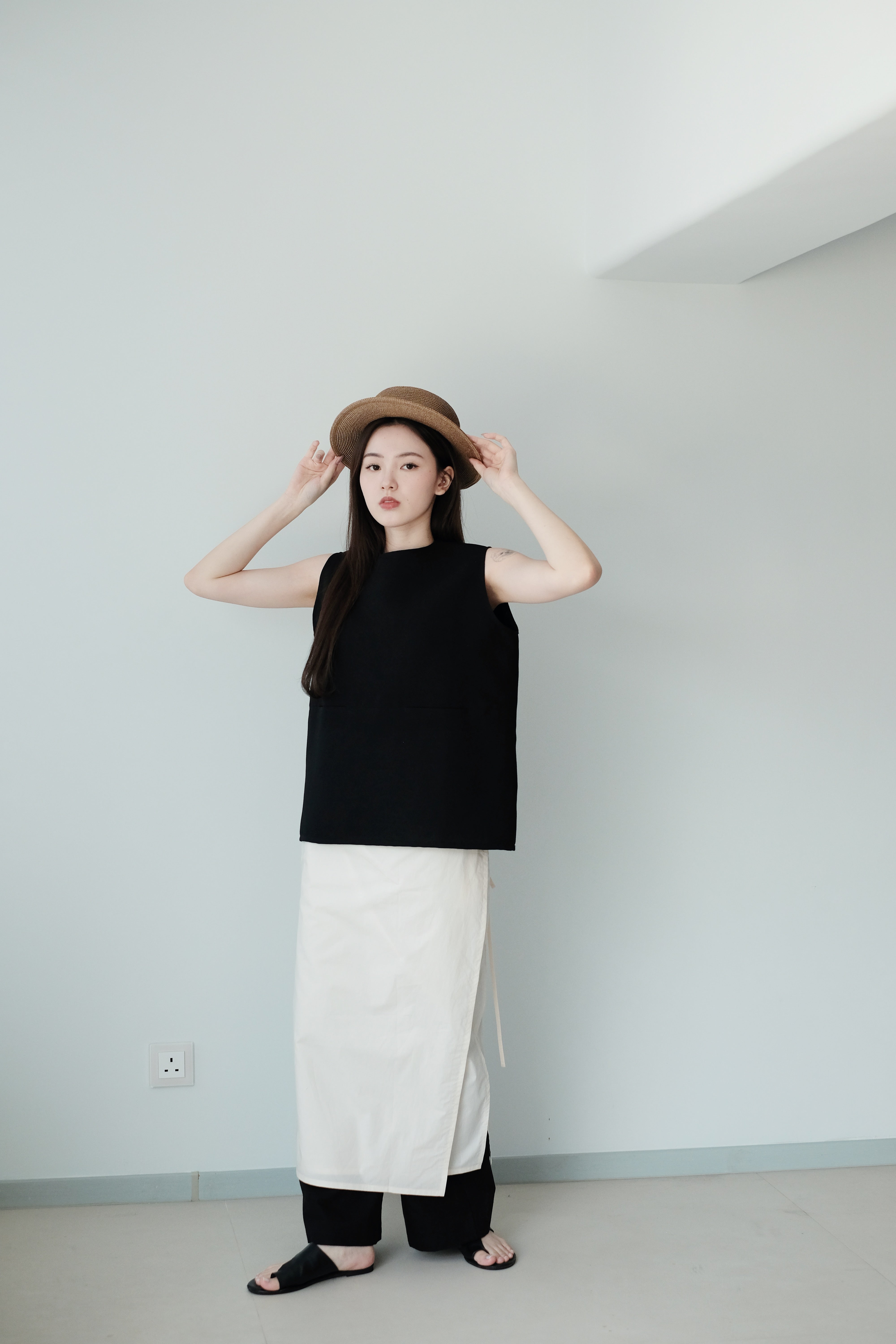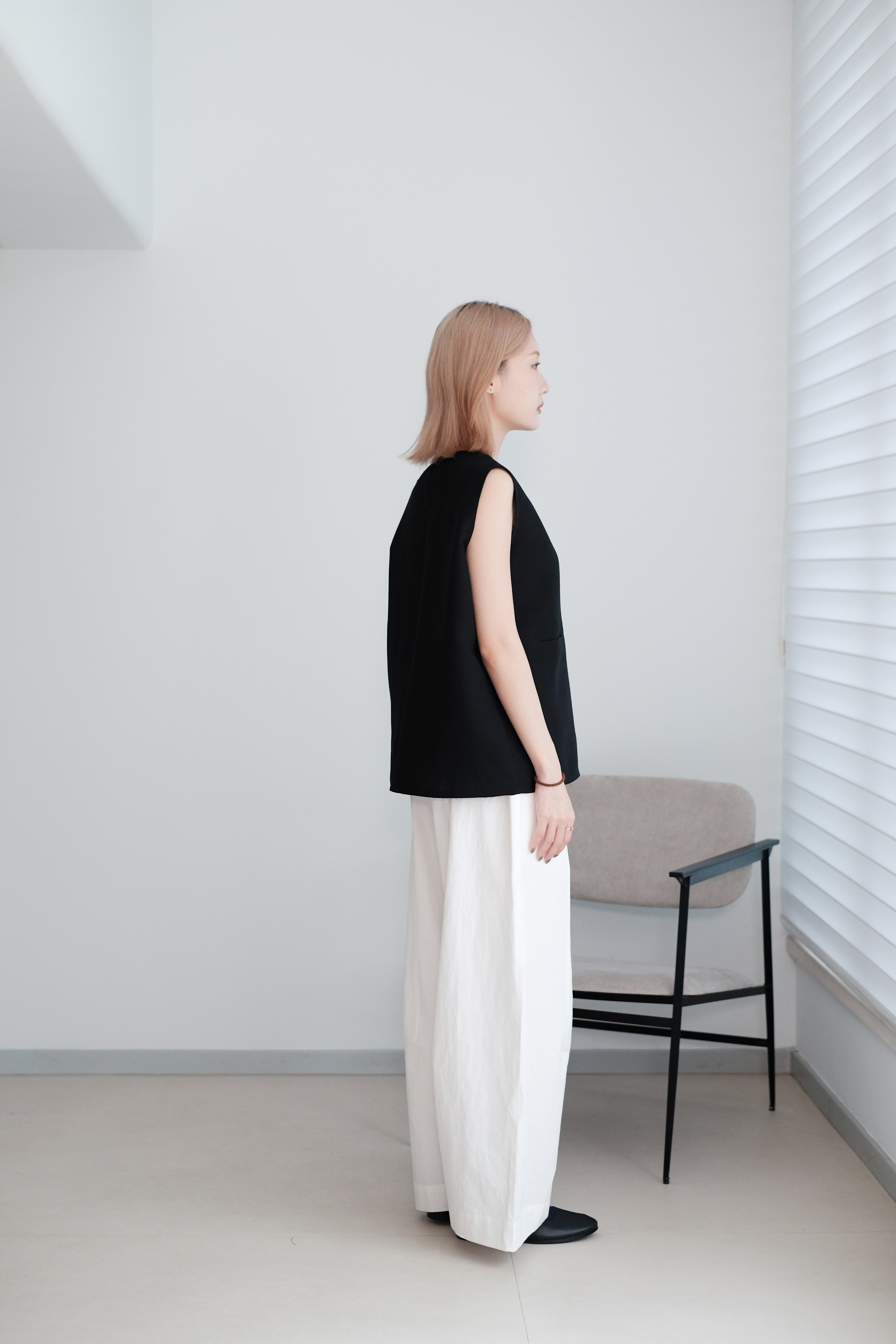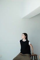 This black sleeveless top features a clean, structured cut with a round neckline. The fabric holds its shape without feeling heavy, keeping the silhouette crisp. Falling just below the waist, it works well on its own or layered, pairing effortlessly with wide-leg pants or skirts for a sharp and modern look.