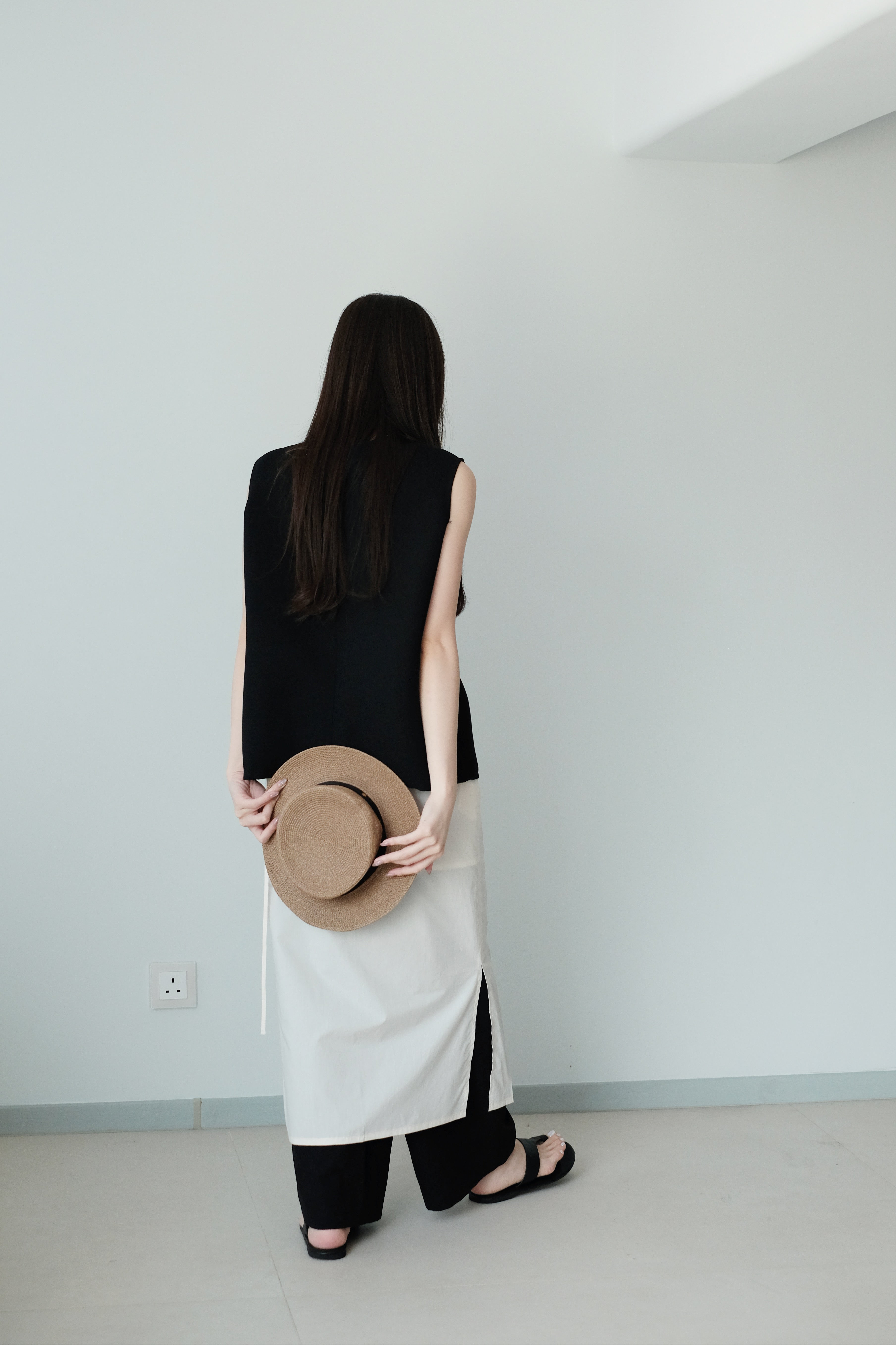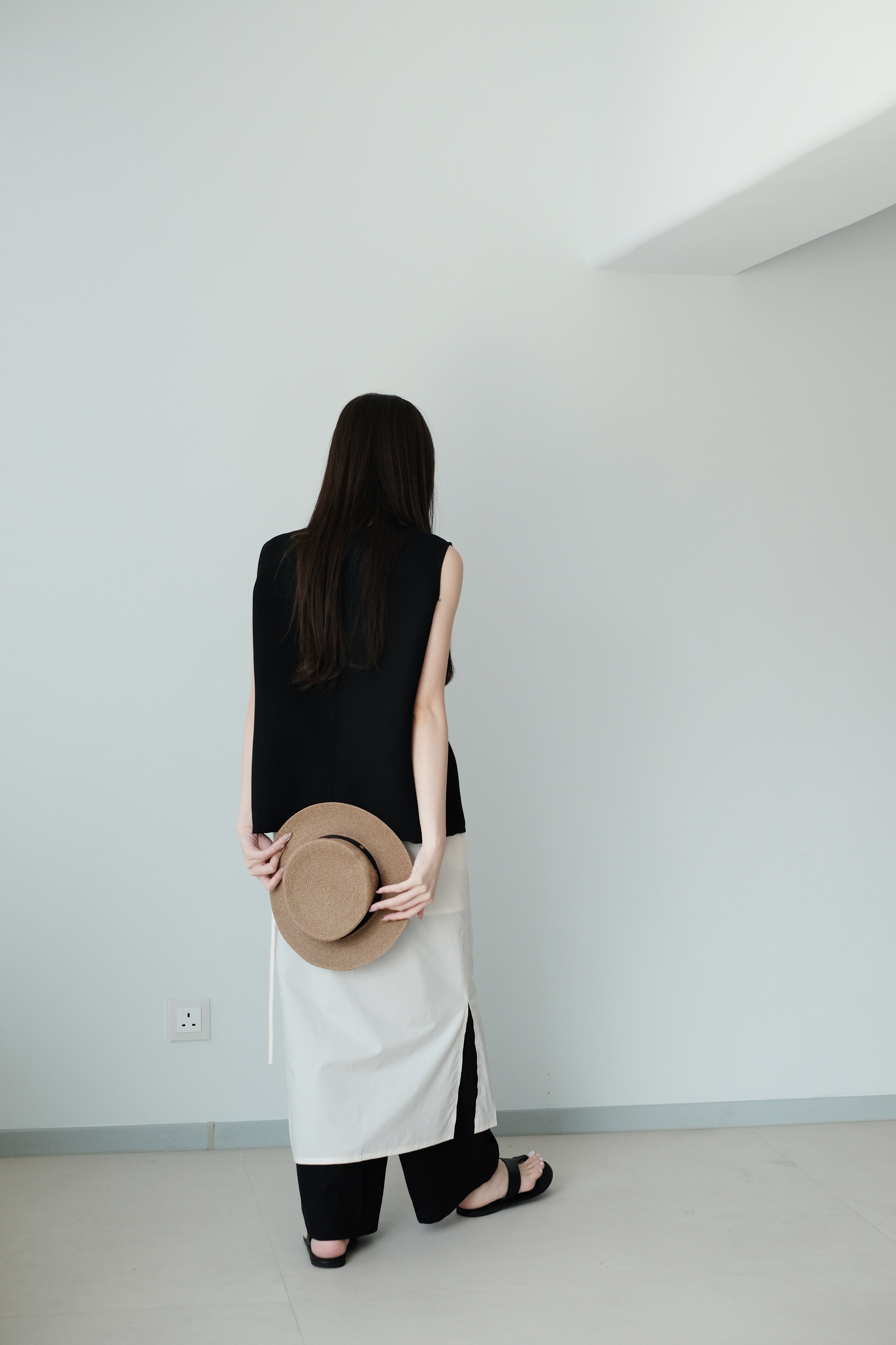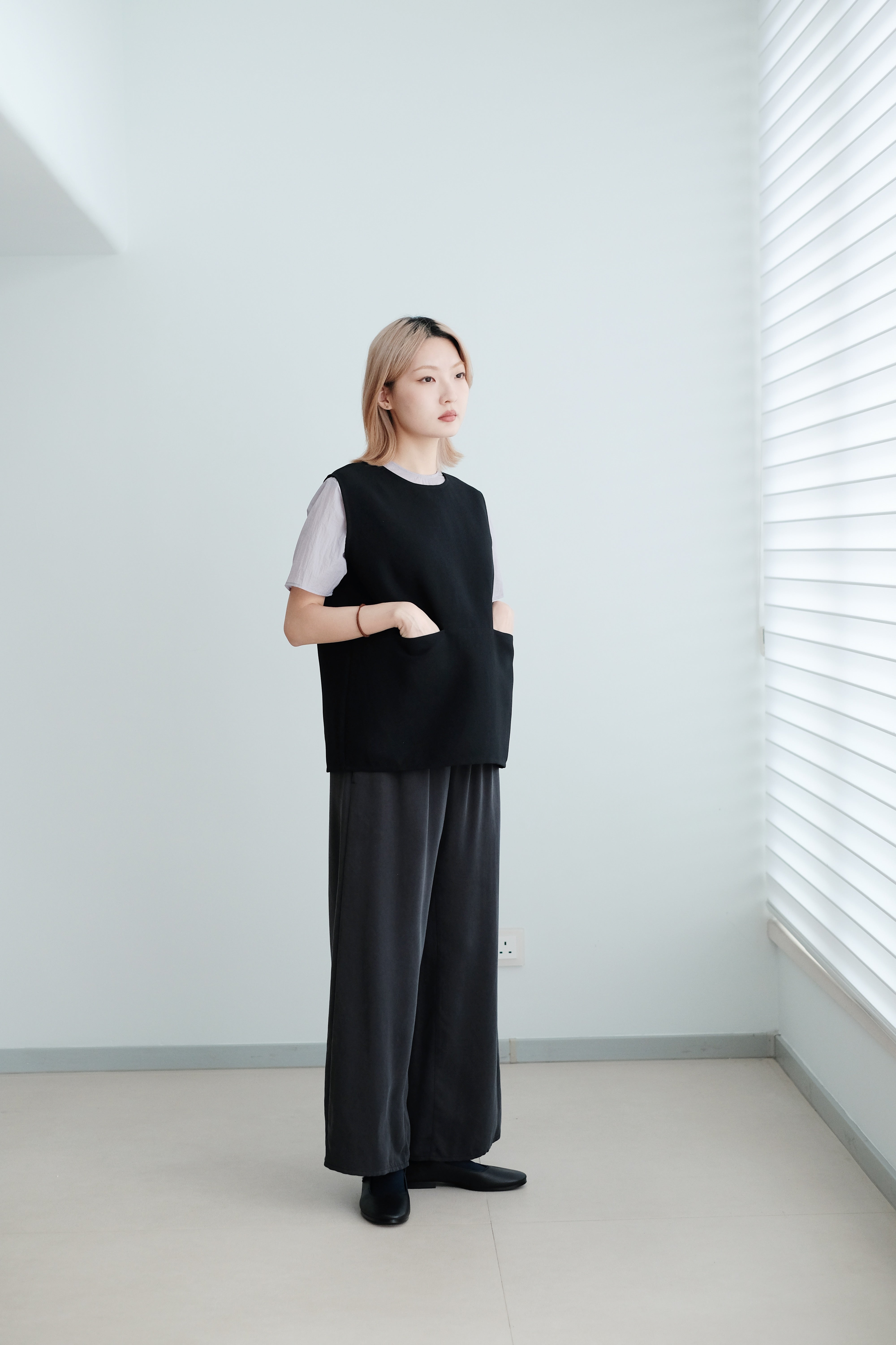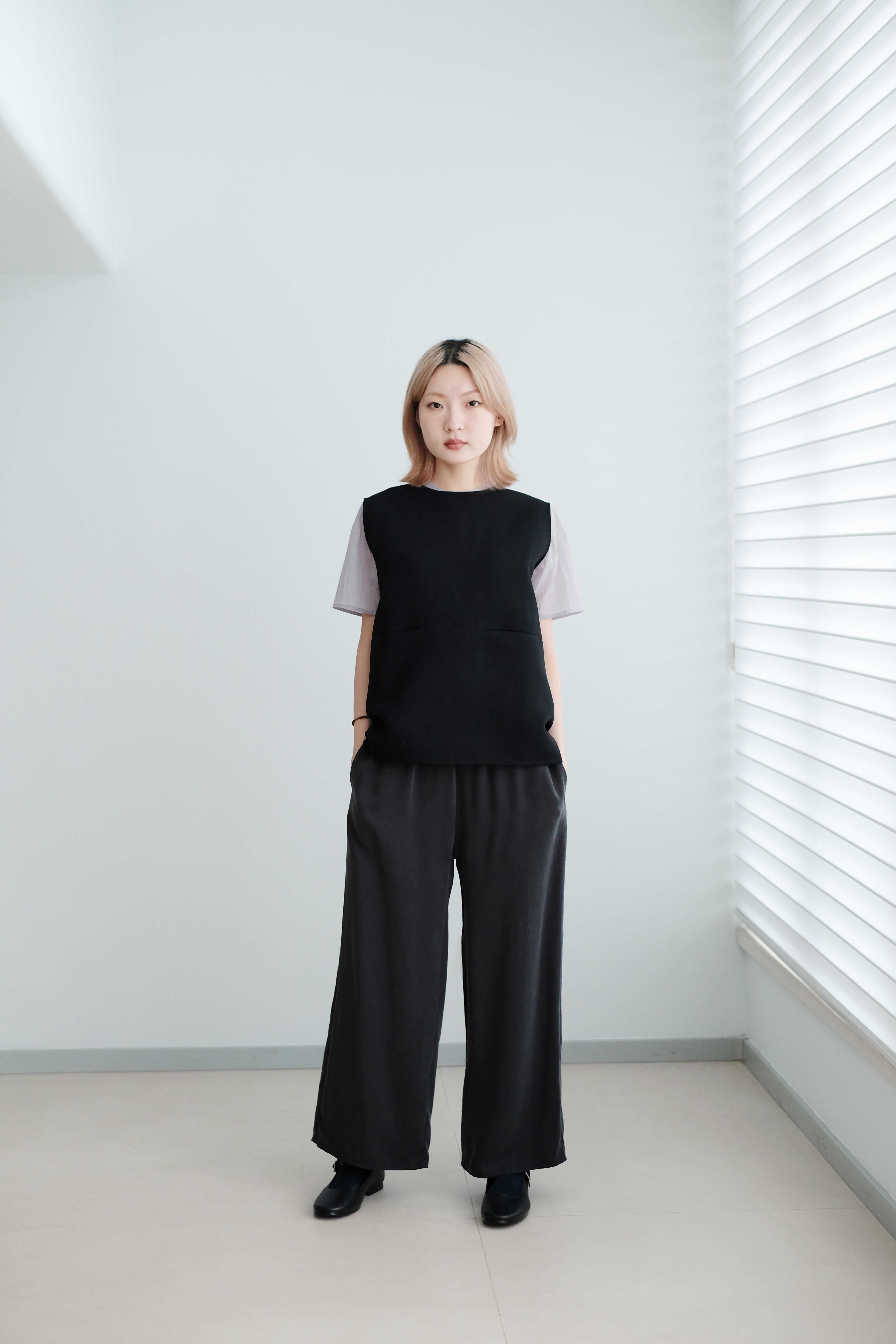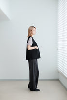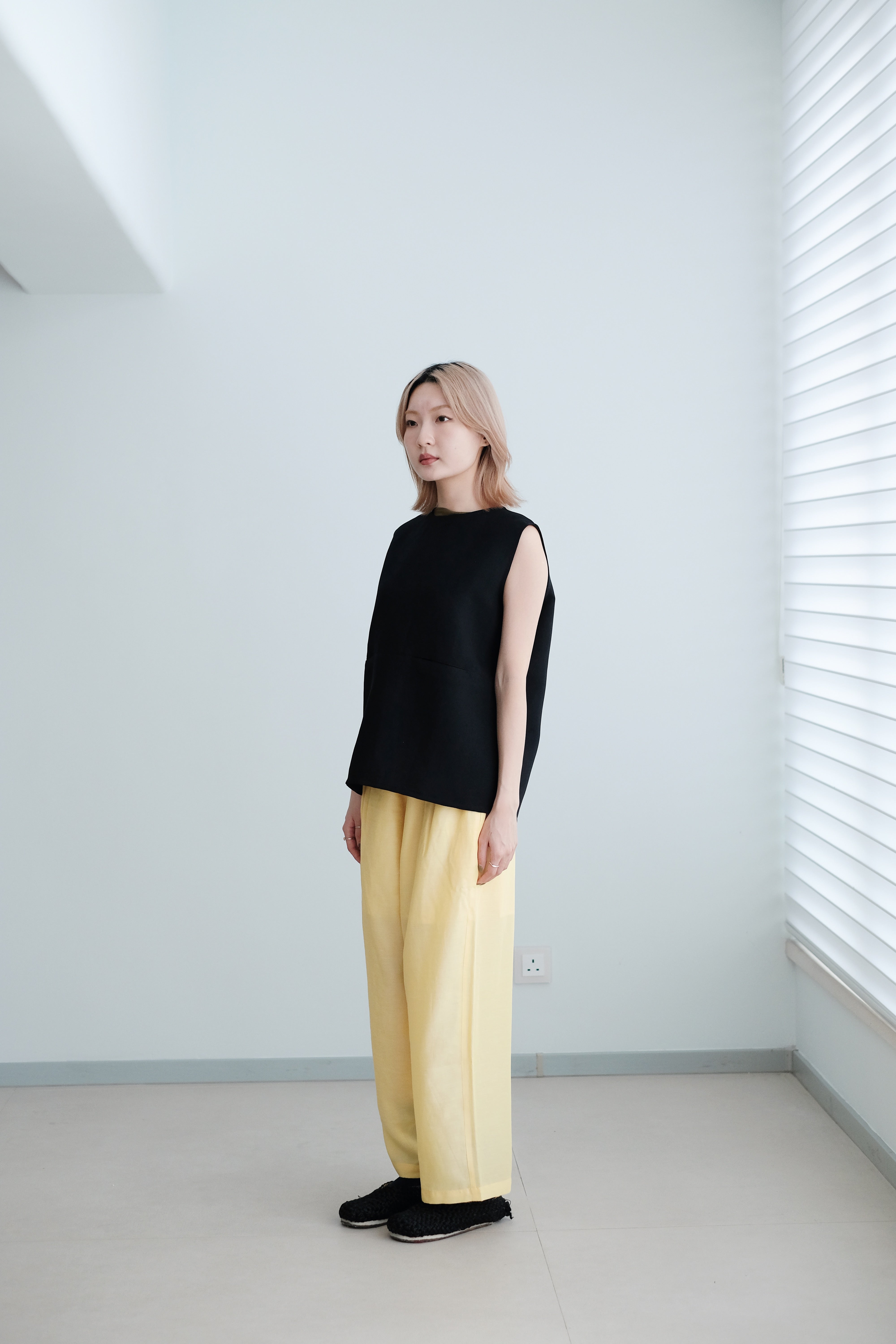 This black sleeveless top features a clean, structured cut with a round neckline. The fabric holds its shape without feeling heavy, keeping the silhouette crisp. Falling just below the waist, it works well on its own or layered, pairing effortlessly with wide-leg pants or skirts for a sharp and modern look.