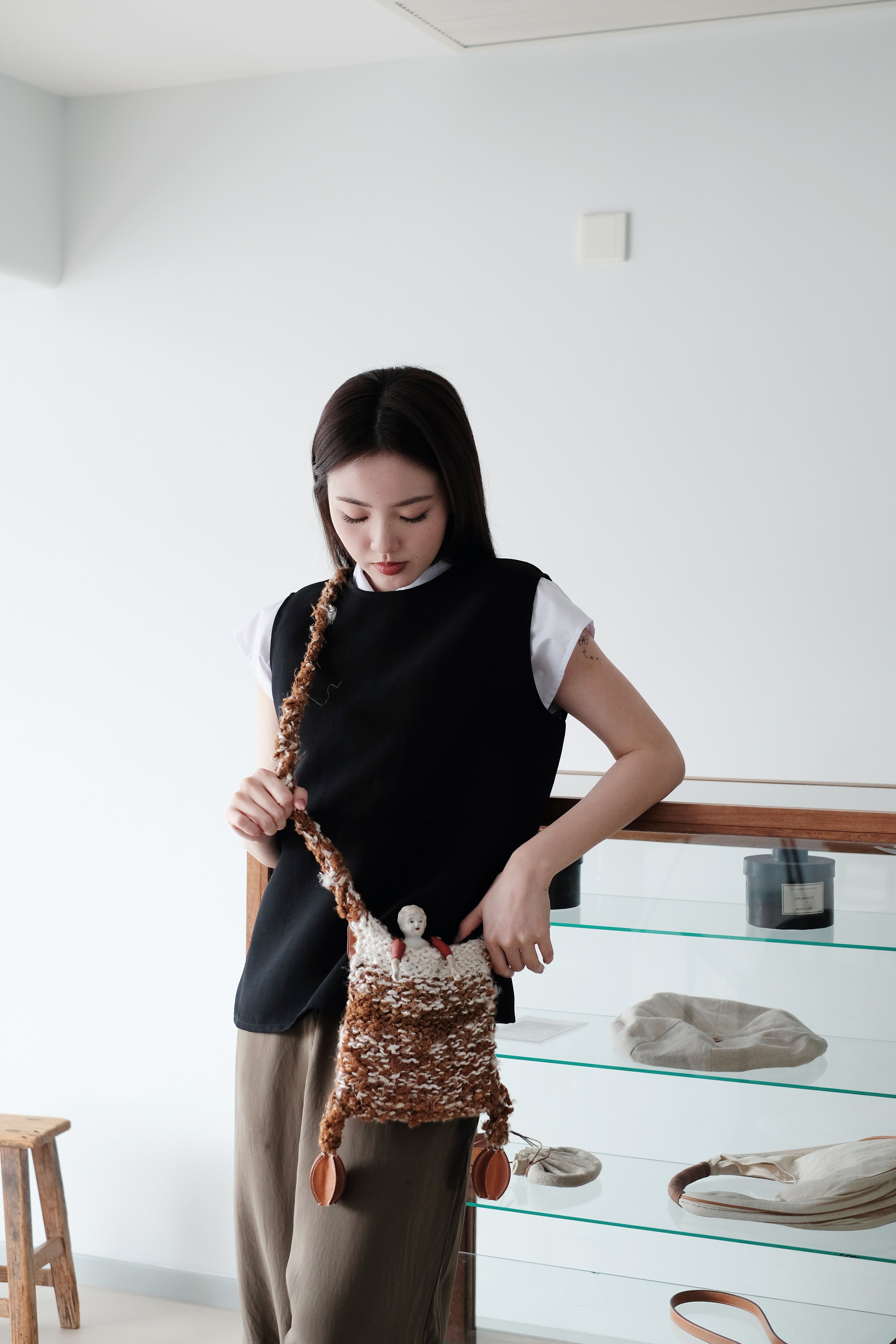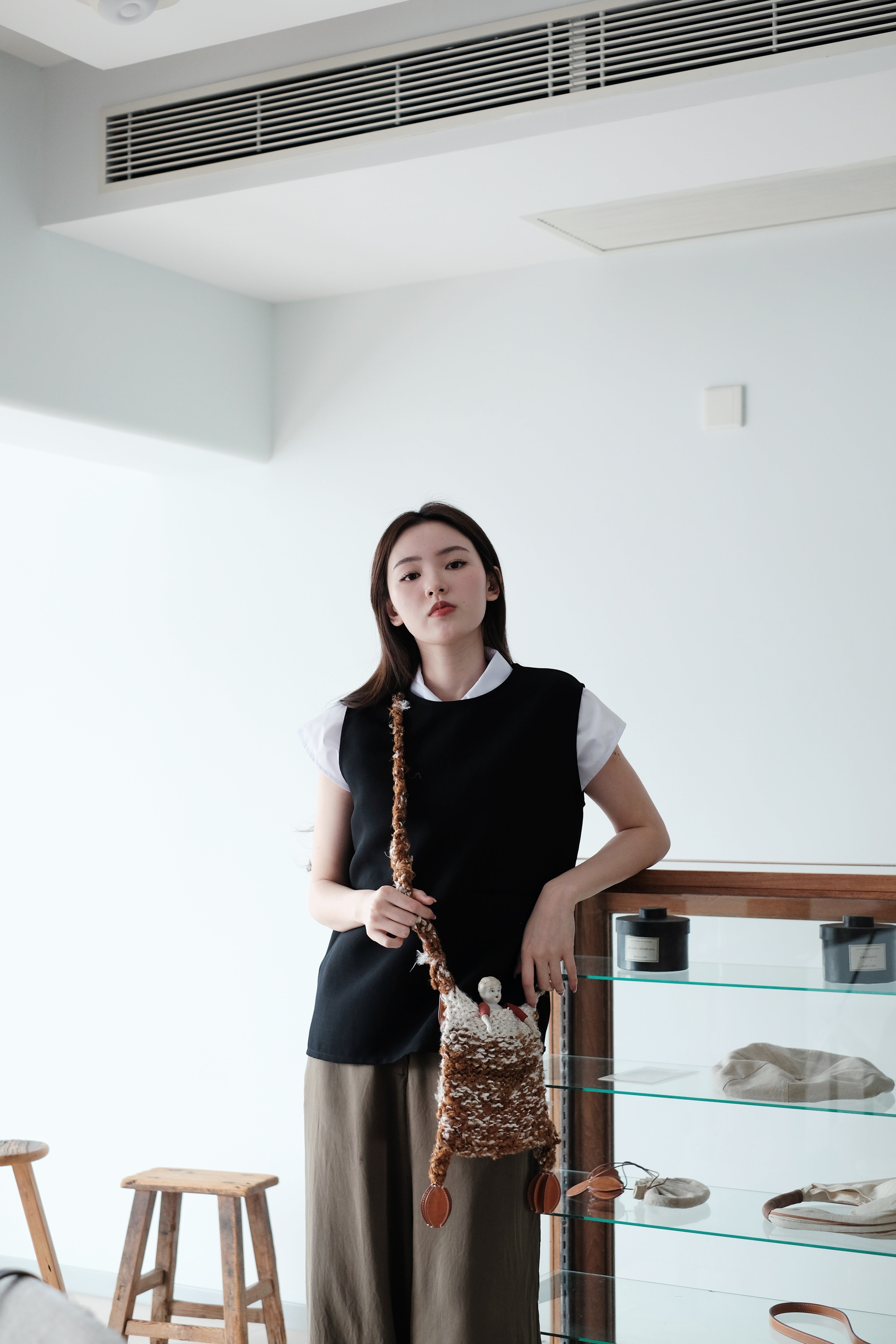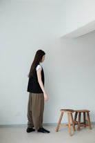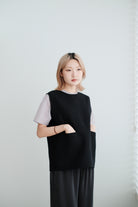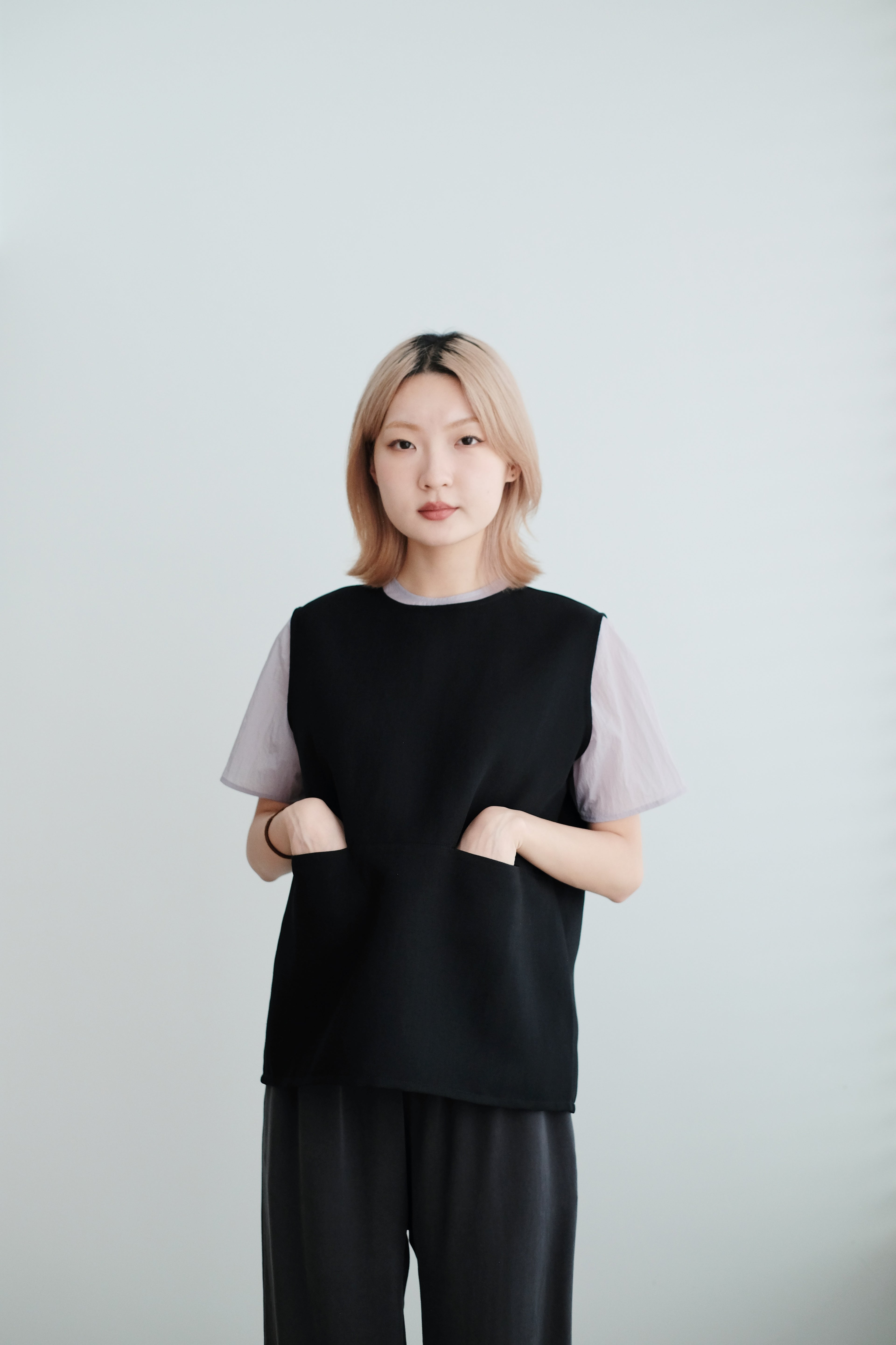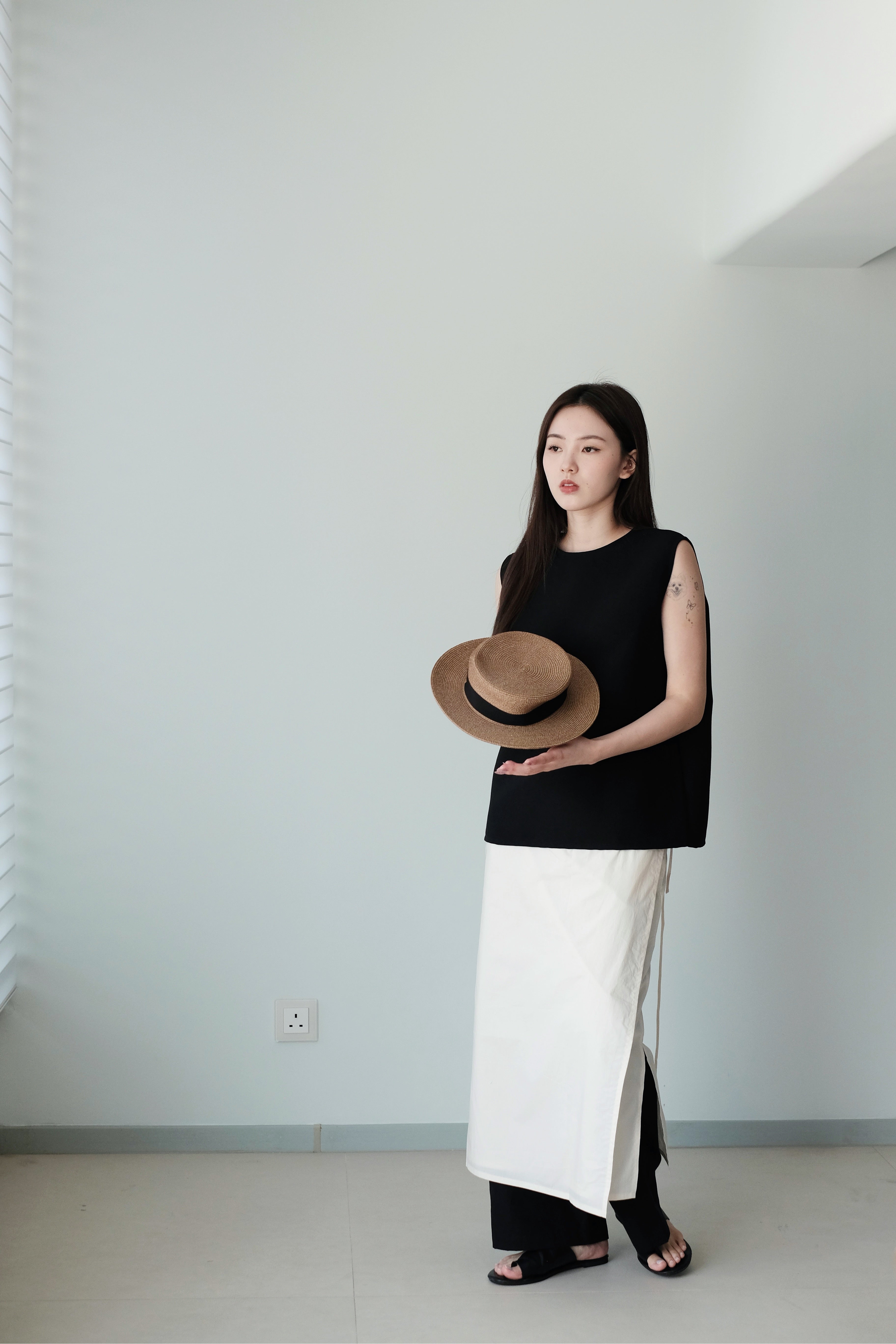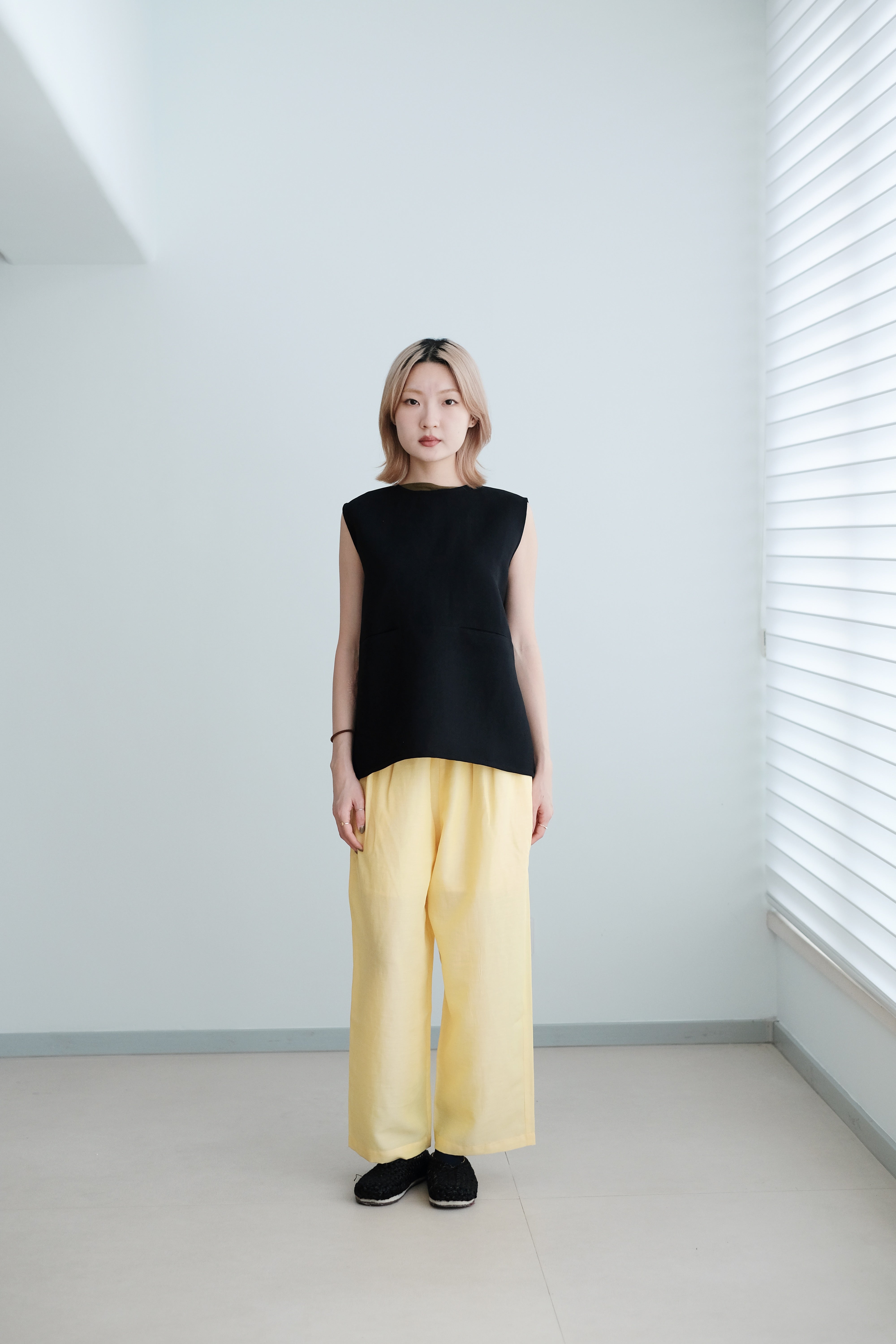 This black sleeveless top features a clean, structured cut with a round neckline. The fabric holds its shape without feeling heavy, keeping the silhouette crisp. Falling just below the waist, it works well on its own or layered, pairing effortlessly with wide-leg pants or skirts for a sharp and modern look.