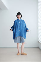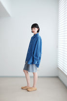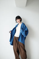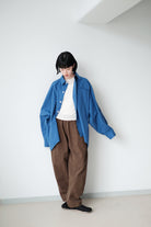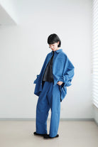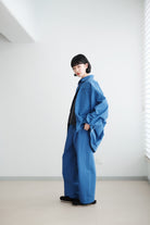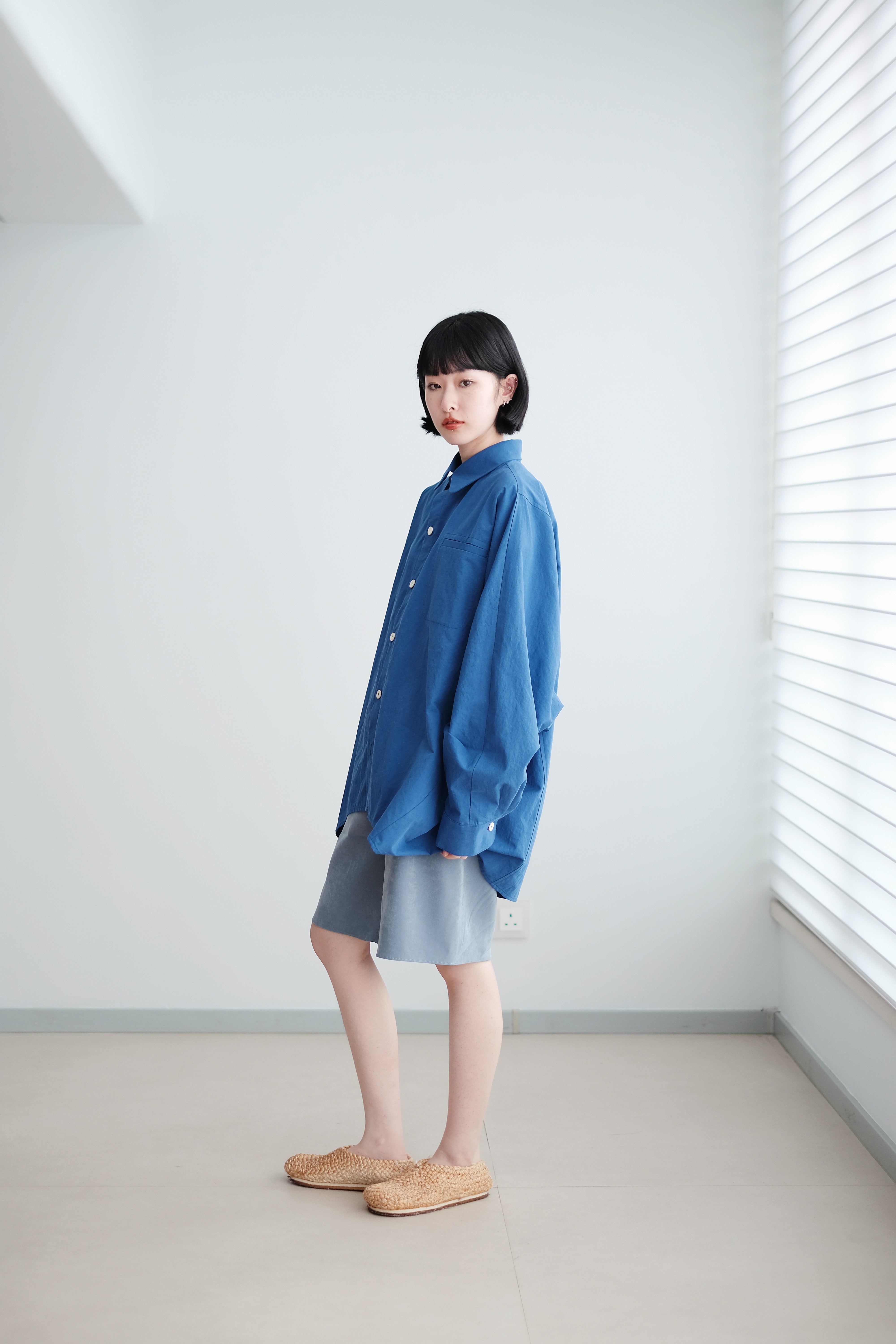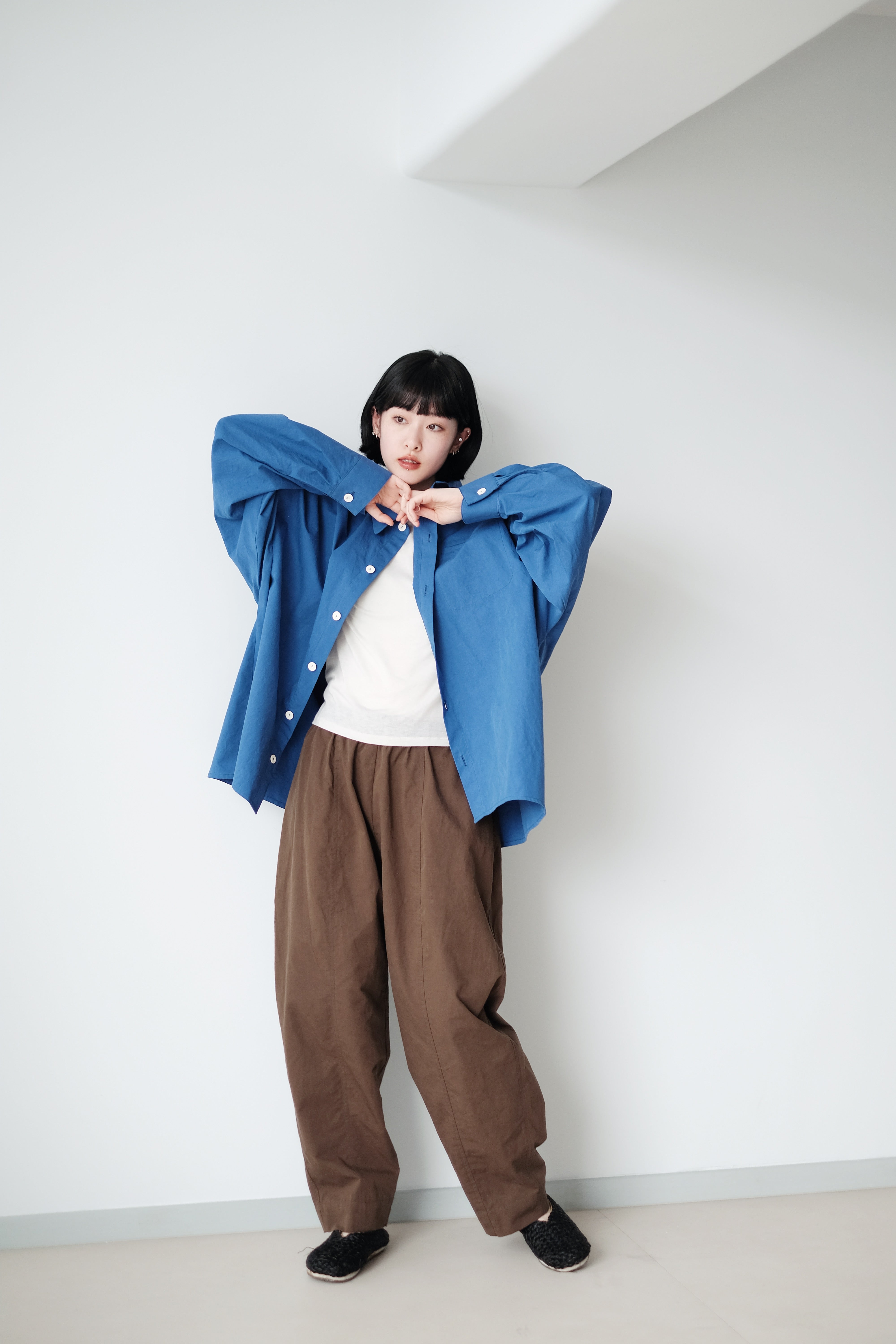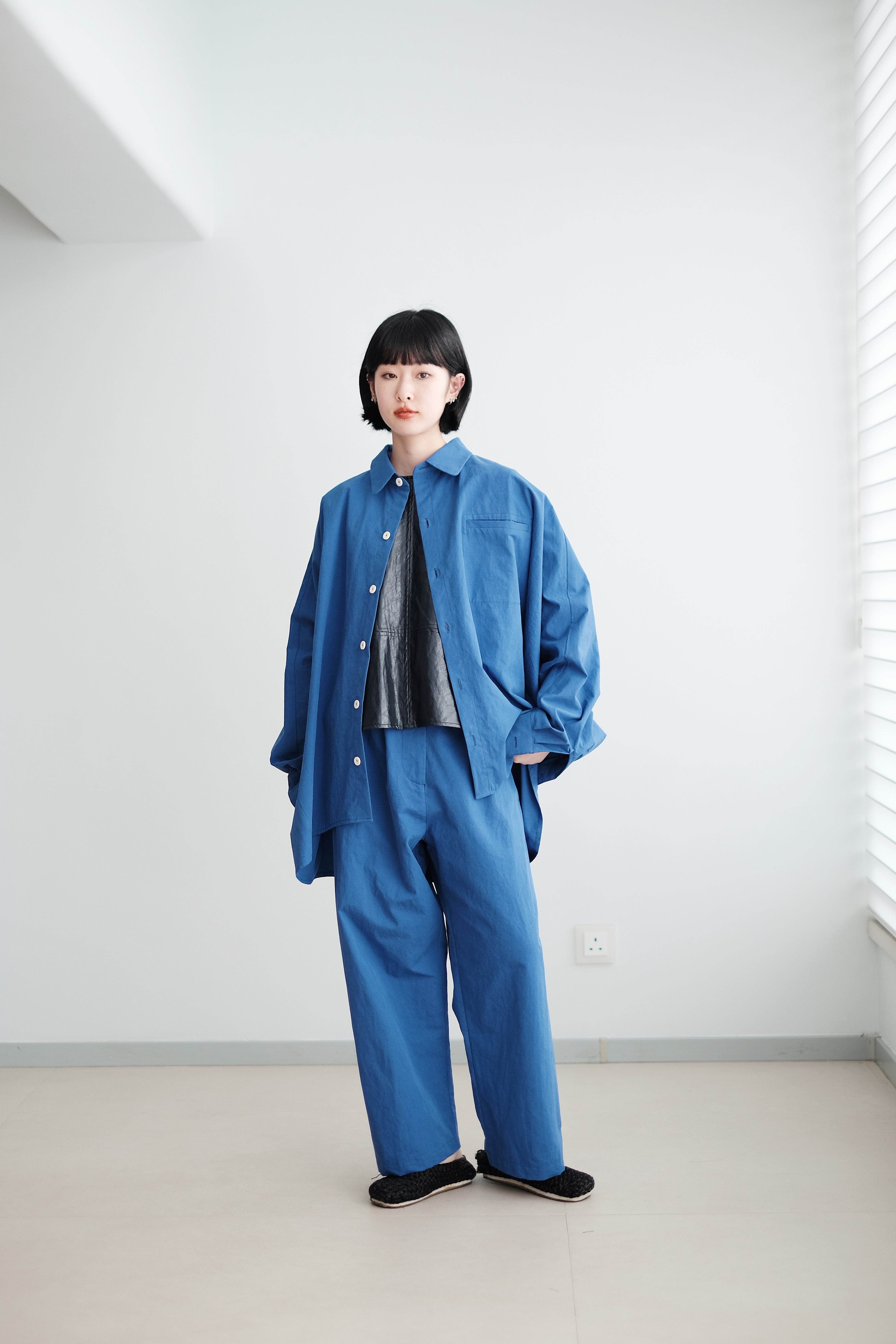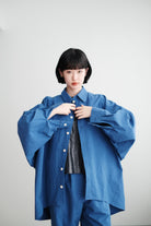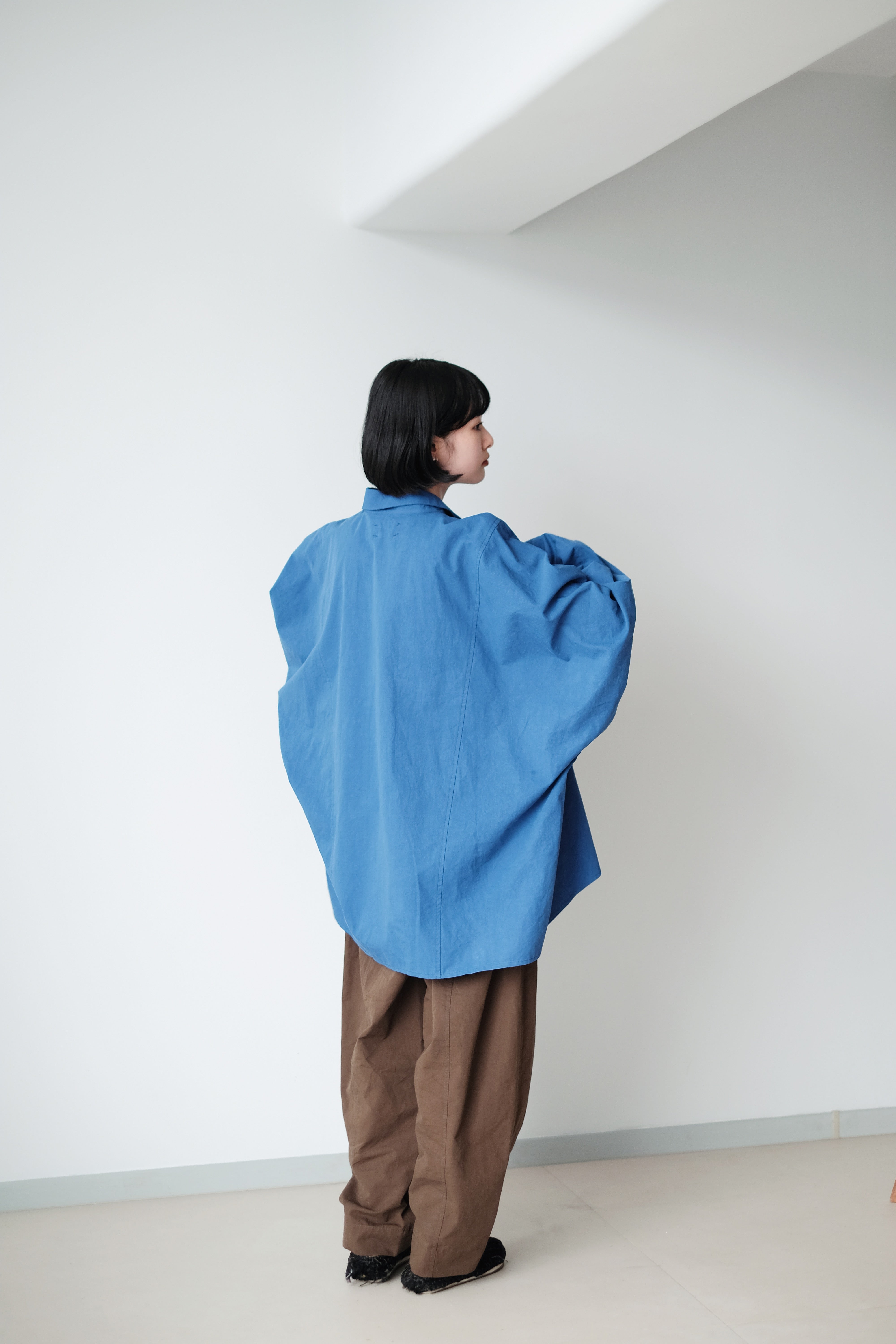 This blue shirt features a batwing cut with extra room at the underarms, creating a voluminous and airy silhouette. Made from crisp 100% cotton, the back is shaped with panel seams for added structure, while the pleated cuffs enhance its dimensional form. Designed with a generous oversized fit — it’s roomy enough to be boyfriend-shared, yet still holds a clean and refined outline.