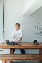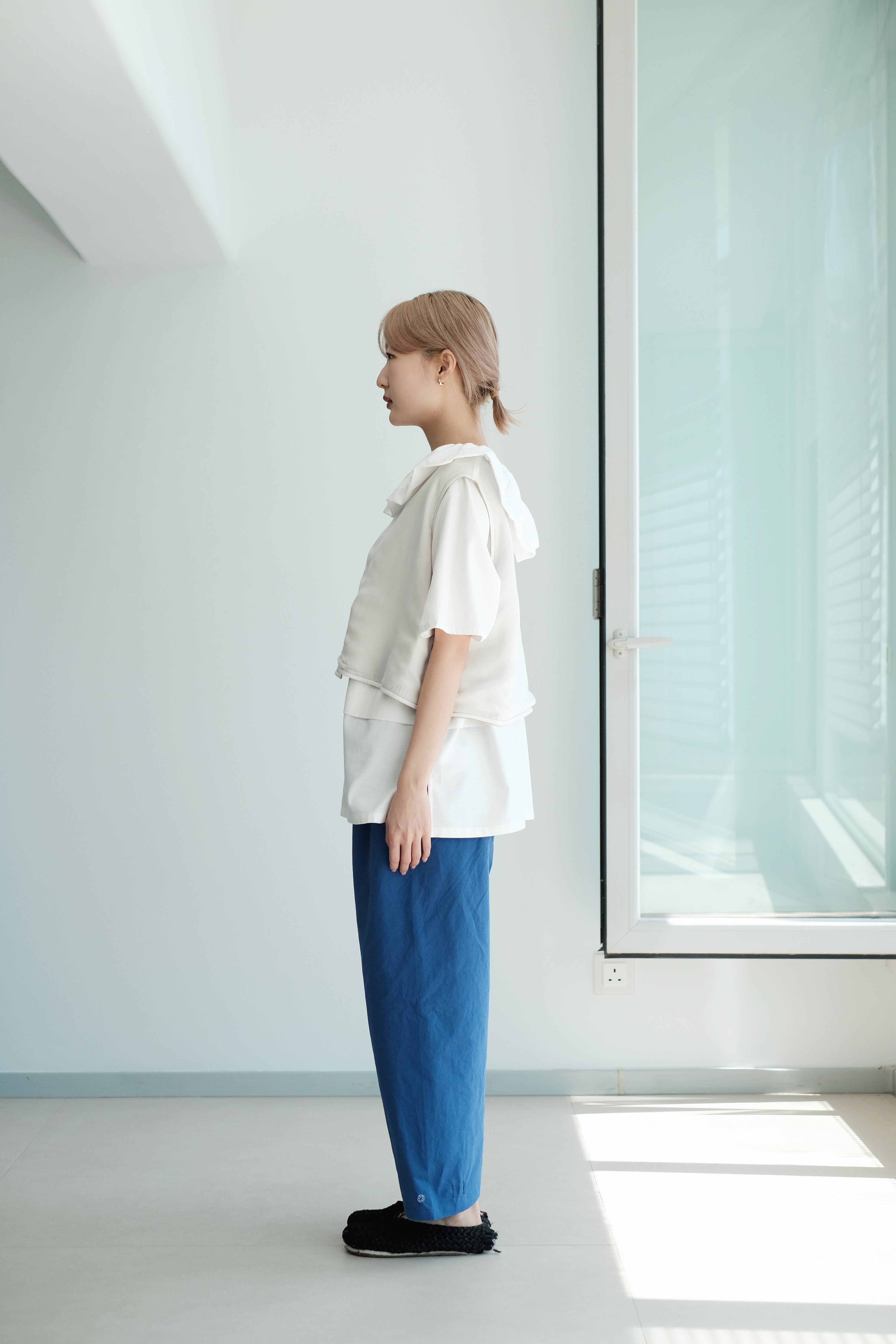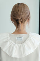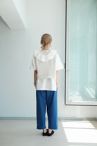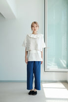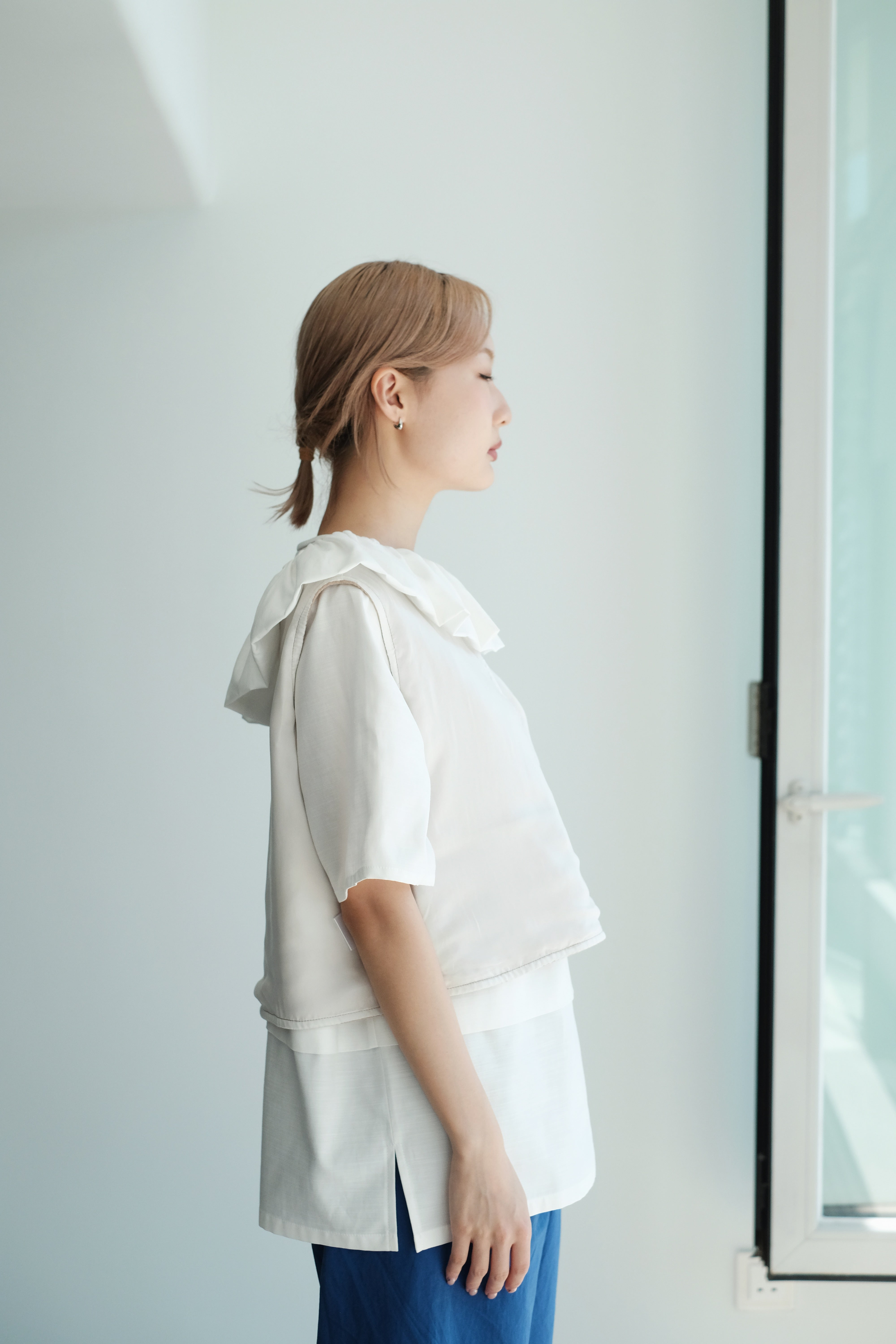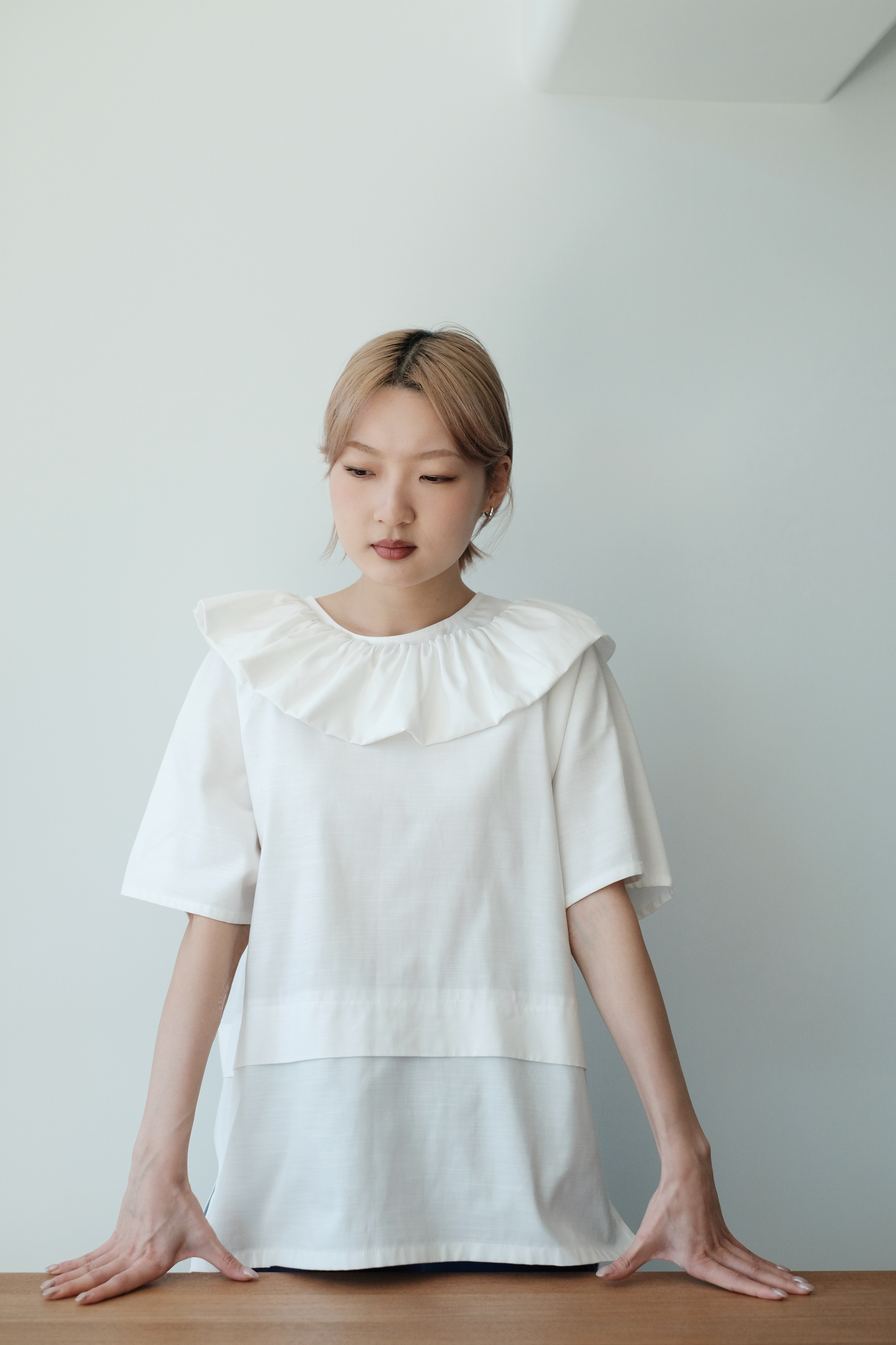 With the collar removed, the top becomes minimal and versatile — calm, understated, and easy to style. Add the ruffle collar back on, and the look transforms instantly into something more expressive and elegant, perfect for occasions when you want a subtle statement.