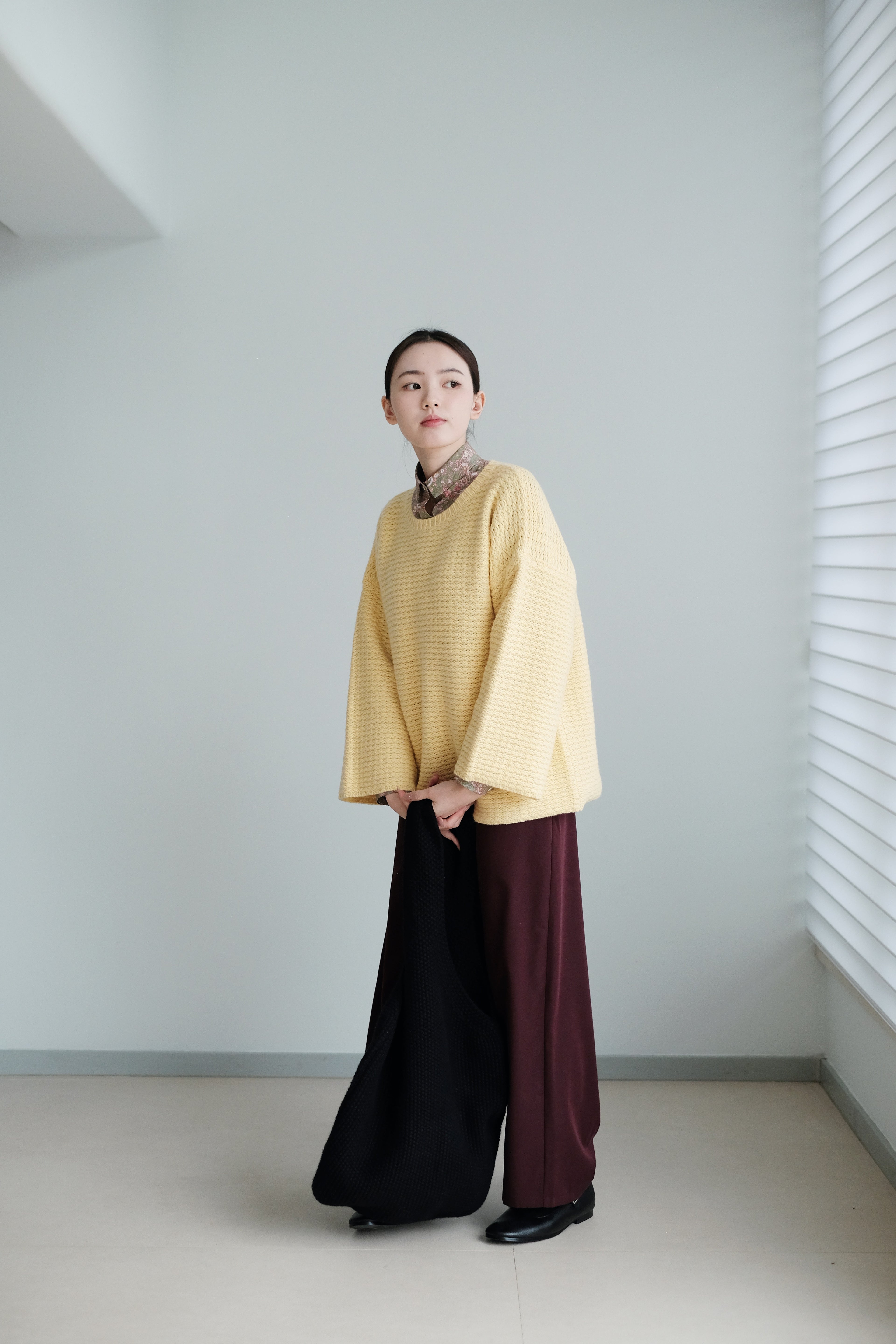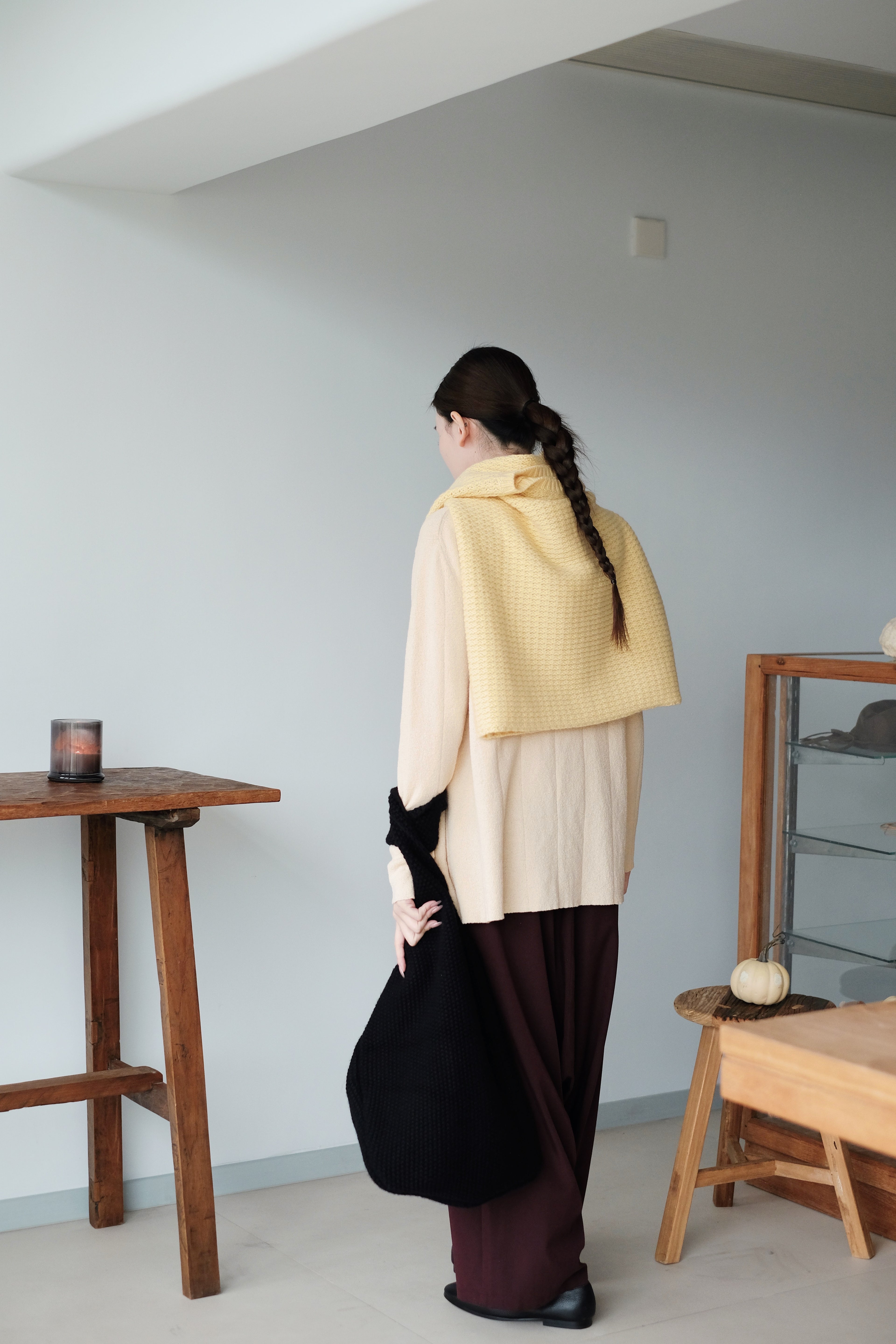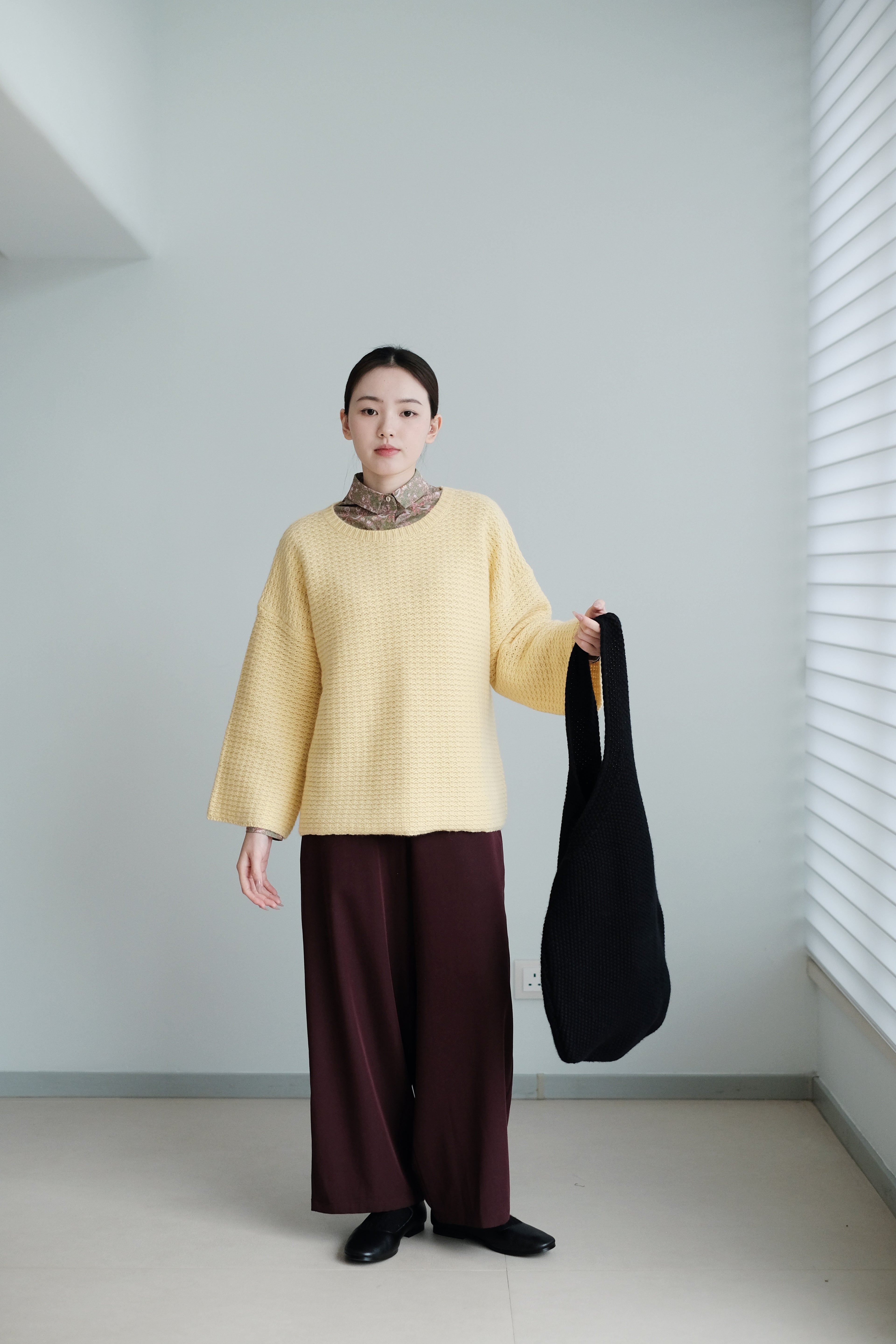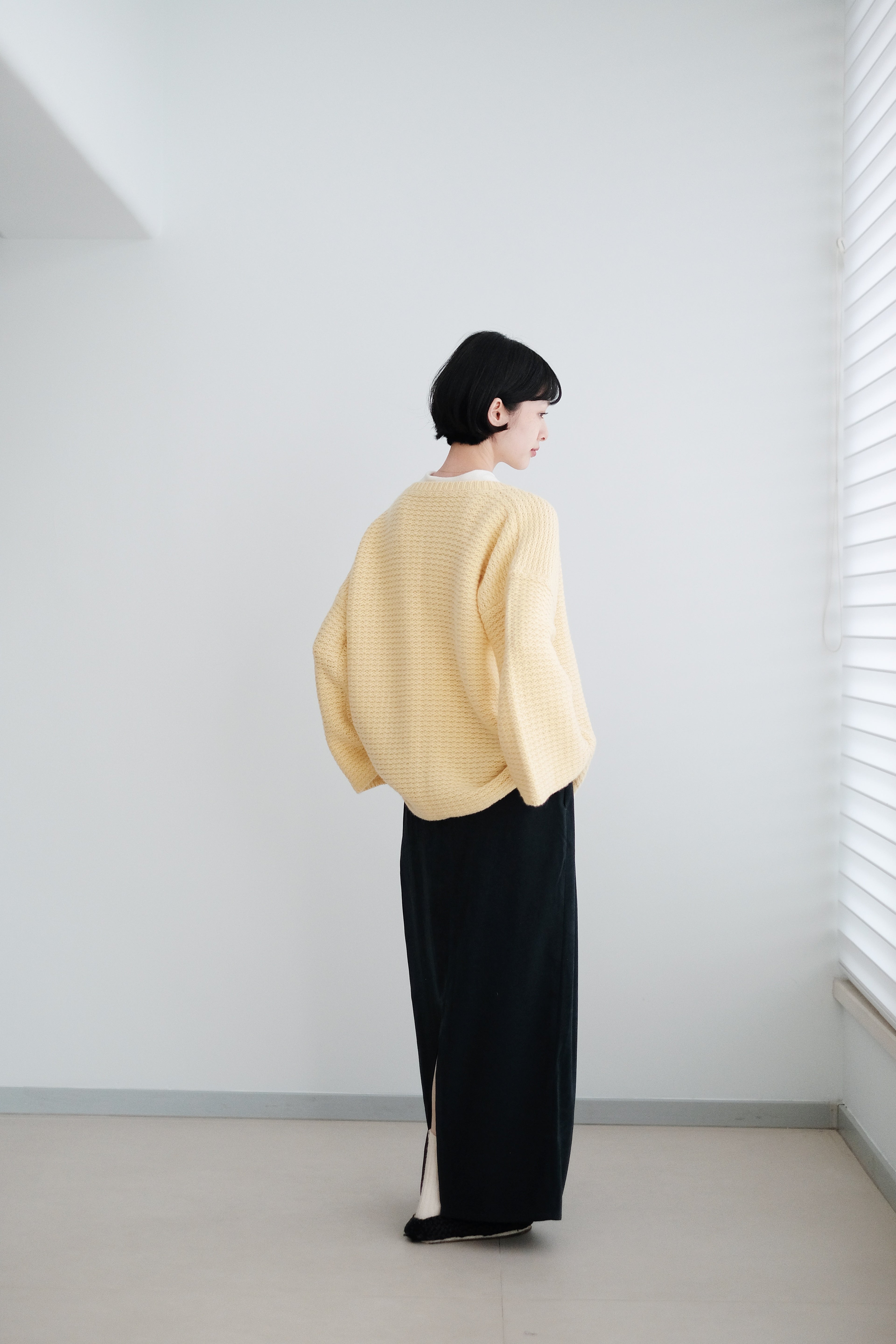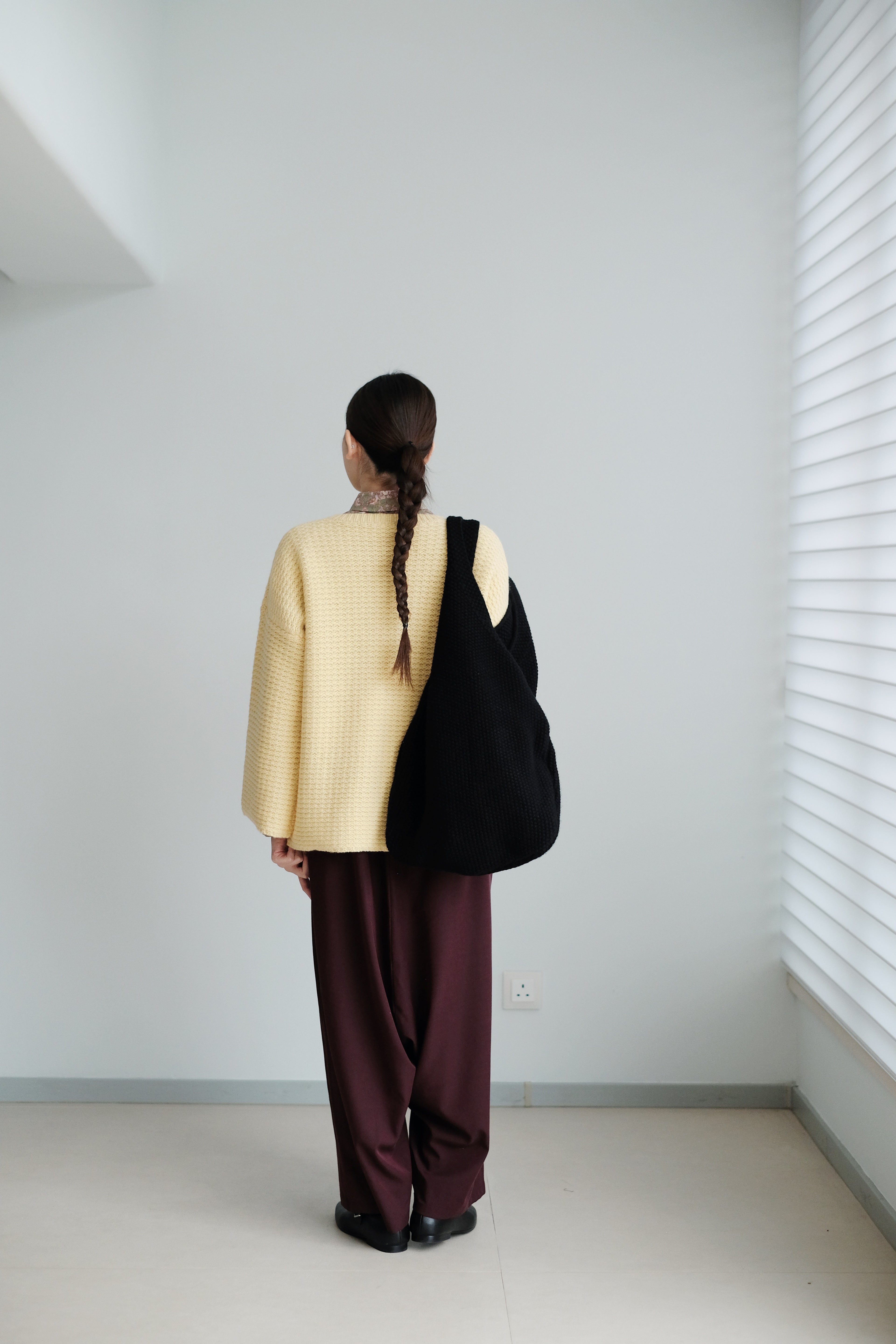 The knit structure adds natural elasticity and a quiet, matte sheen that moves with the light.