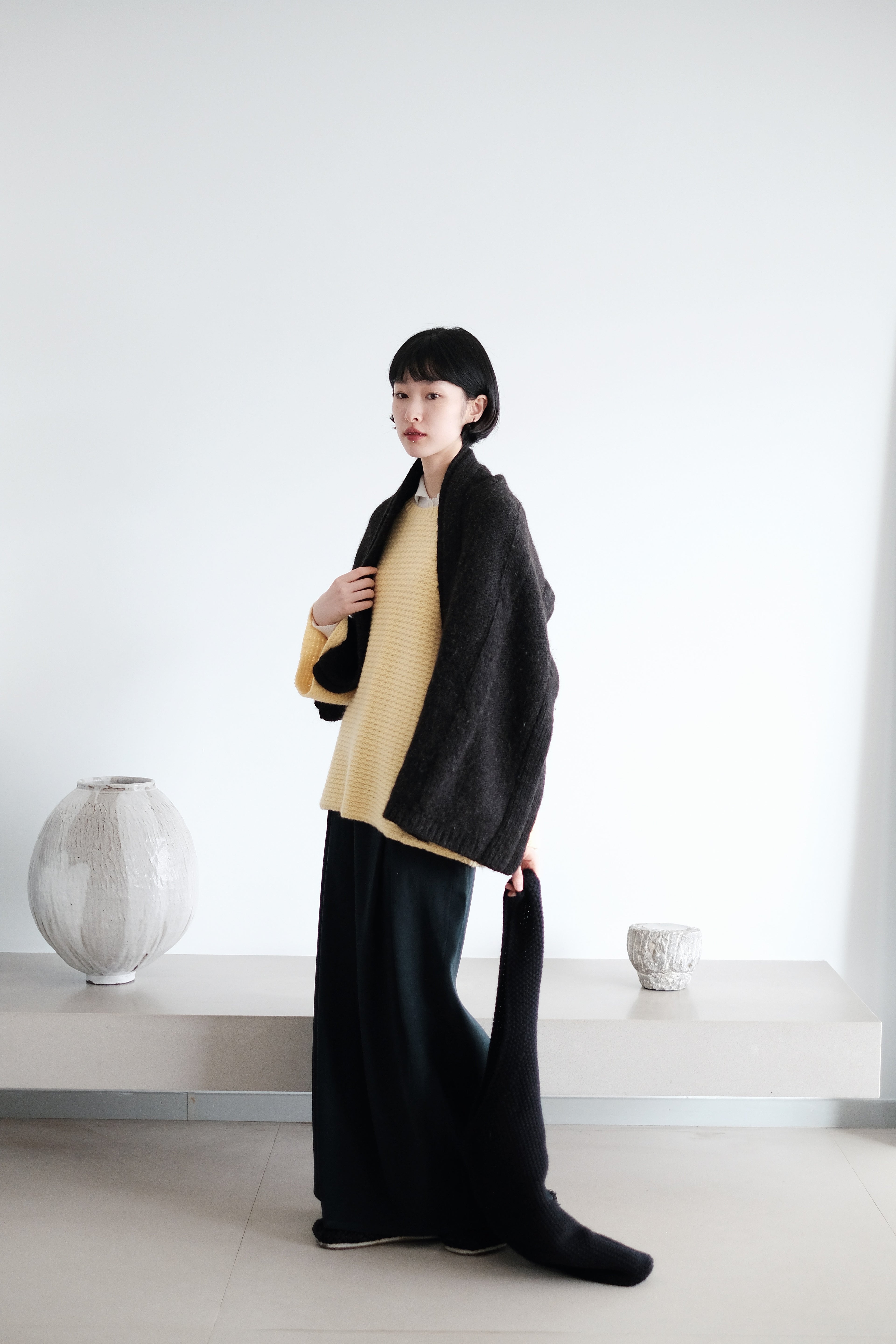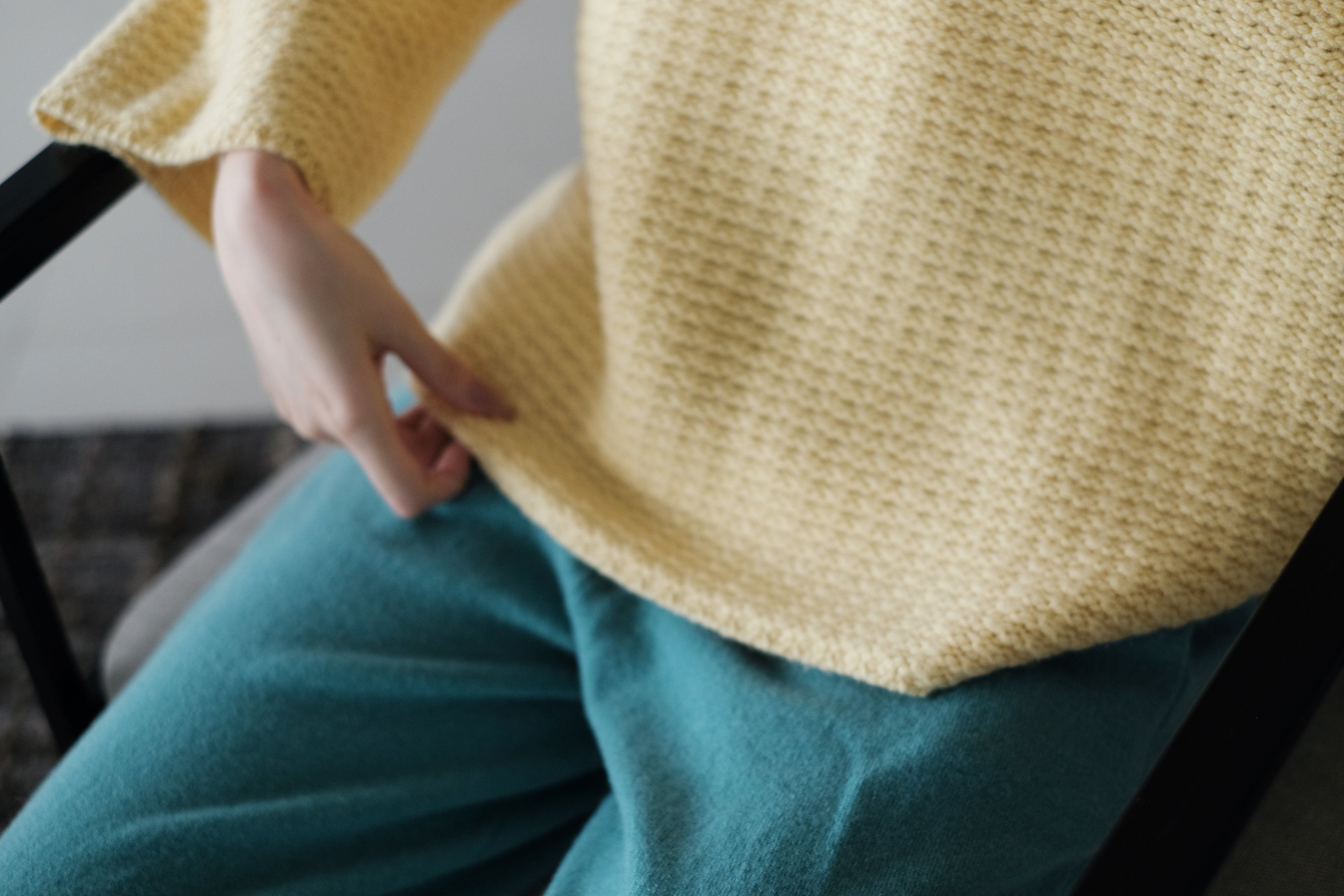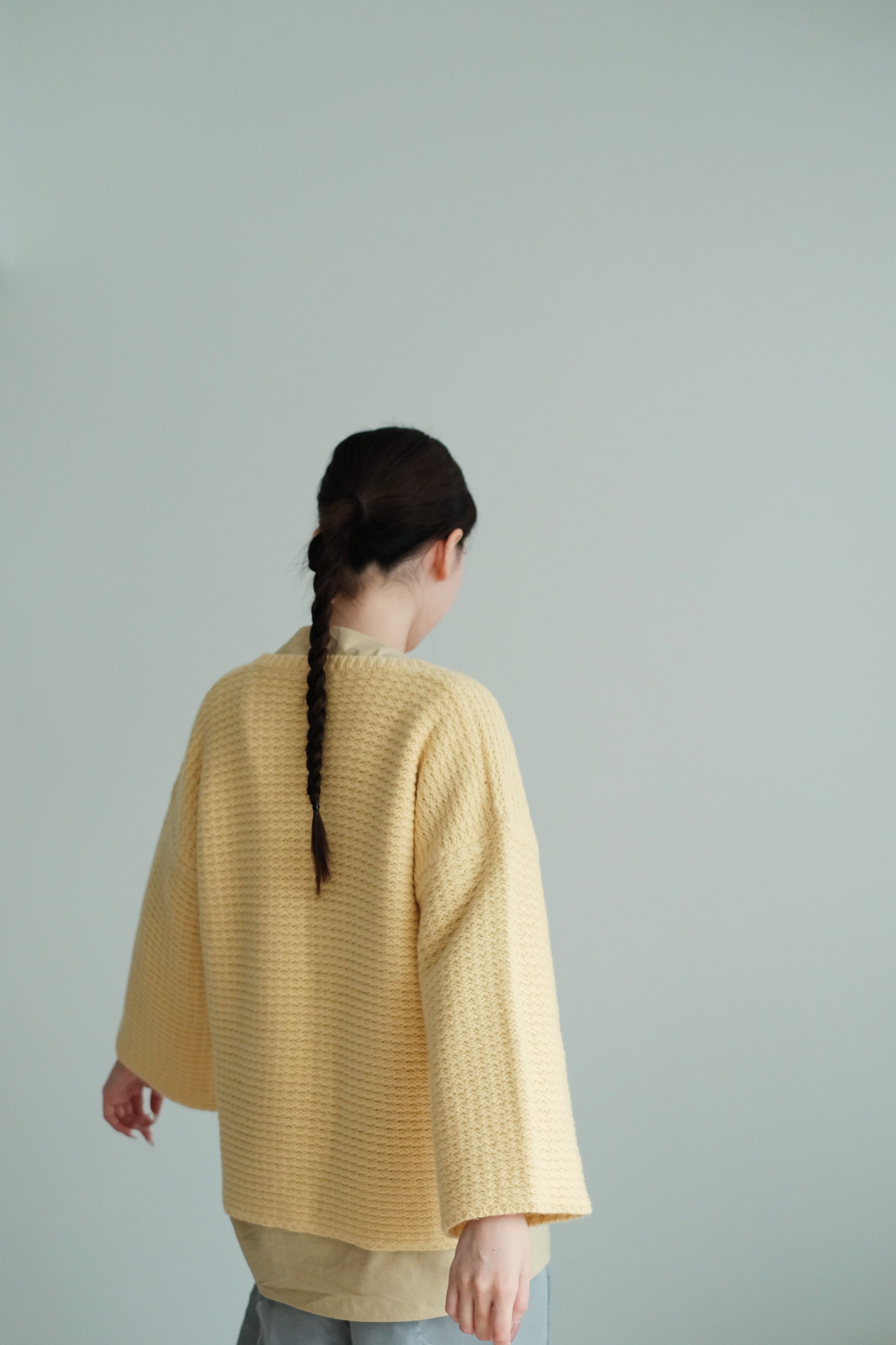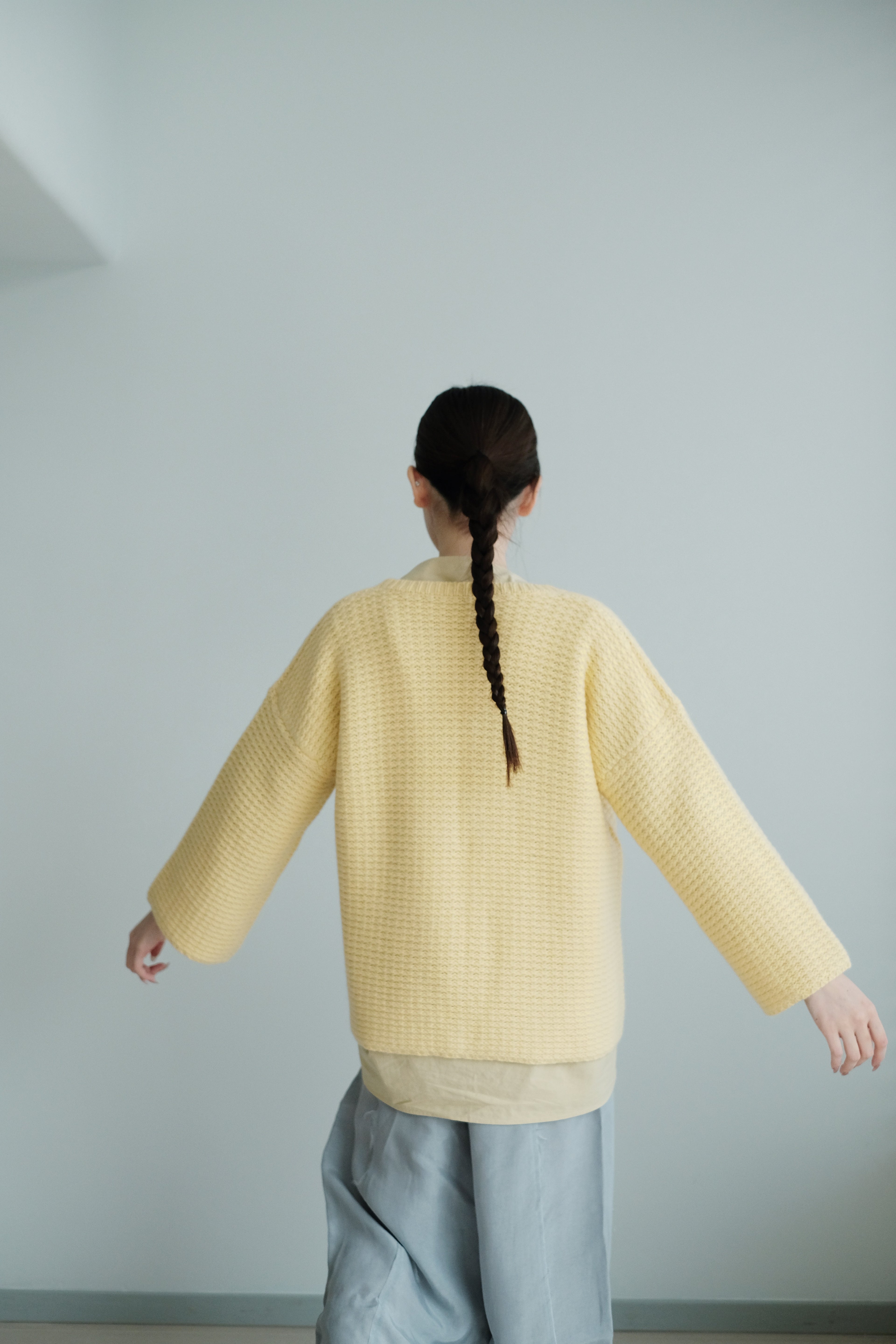The knit structure adds natural elasticity and a quiet, matte sheen that moves with the light.