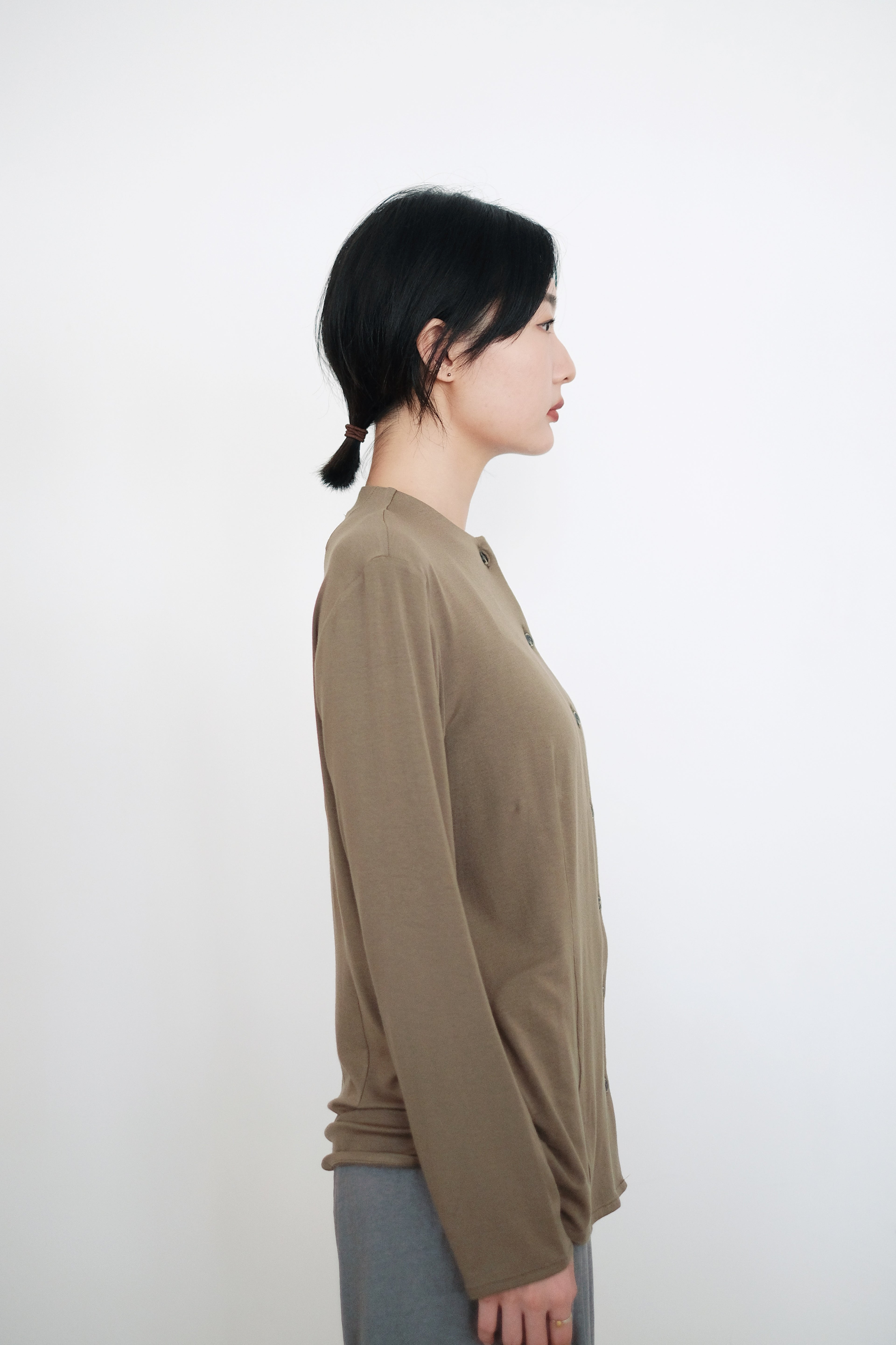 This long-sleeve button-up top features a sleek, minimalist design with a high neckline. The soft, stretchy fabric provides a comfortable fit, making it a versatile piece that can be dressed up or down for various occasions.