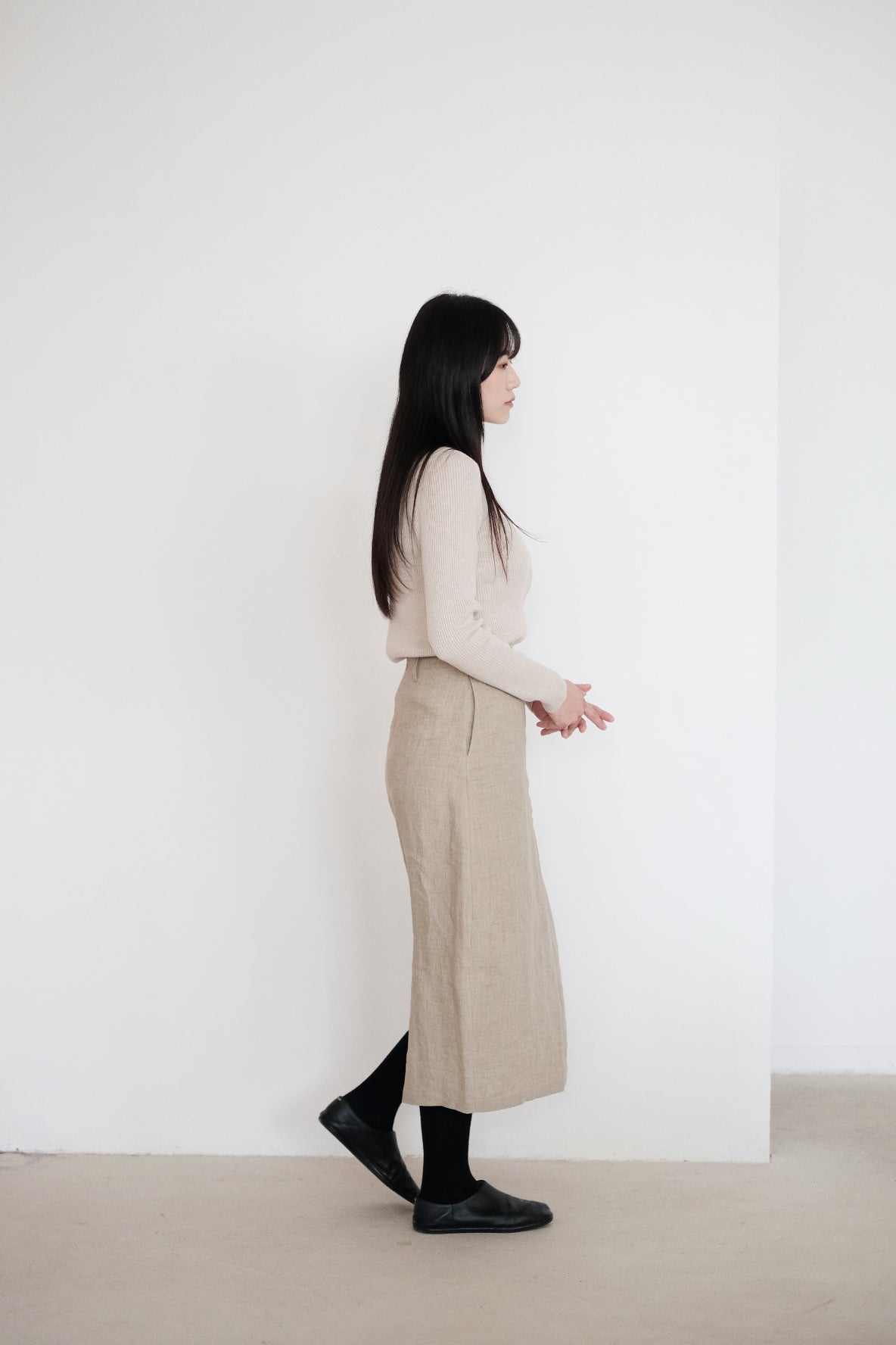 ・Shaped into a slightly arc-shaped cut for a curvy body-shape finish