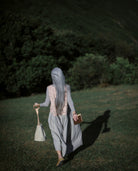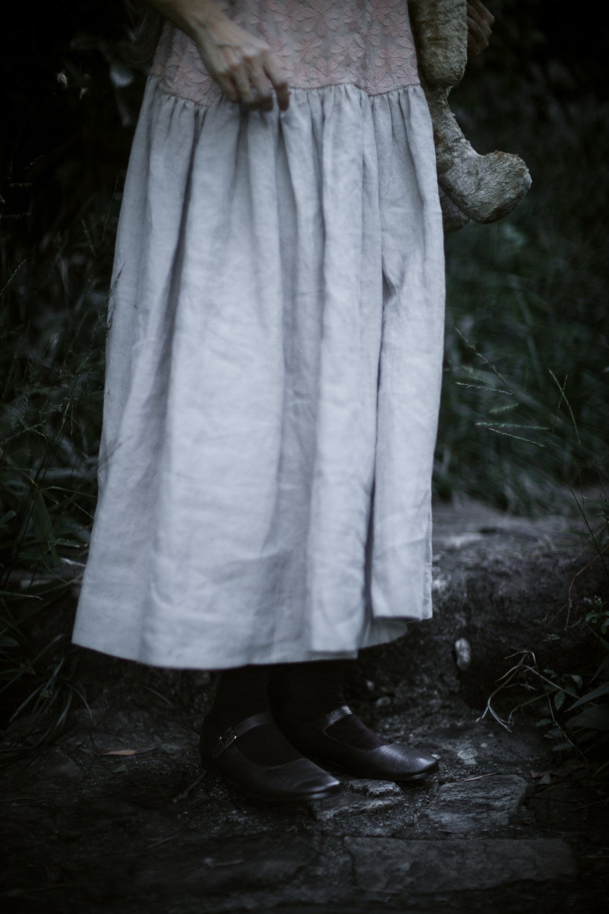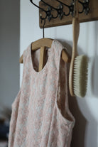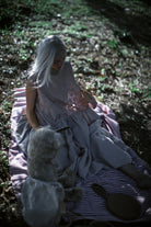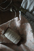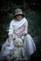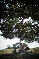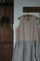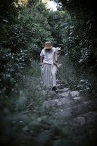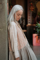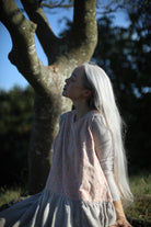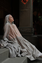 A sheer beige cotton top with delicate blush embroidery wildflower motifs is paired with a beautiful Japanese linen skirt, hand dyed by craftsmen and dried under the sun, pre-washed to create a lovely soft and natural feel, lending an effortless elegance to the dress. A cottage girl’s dream.
